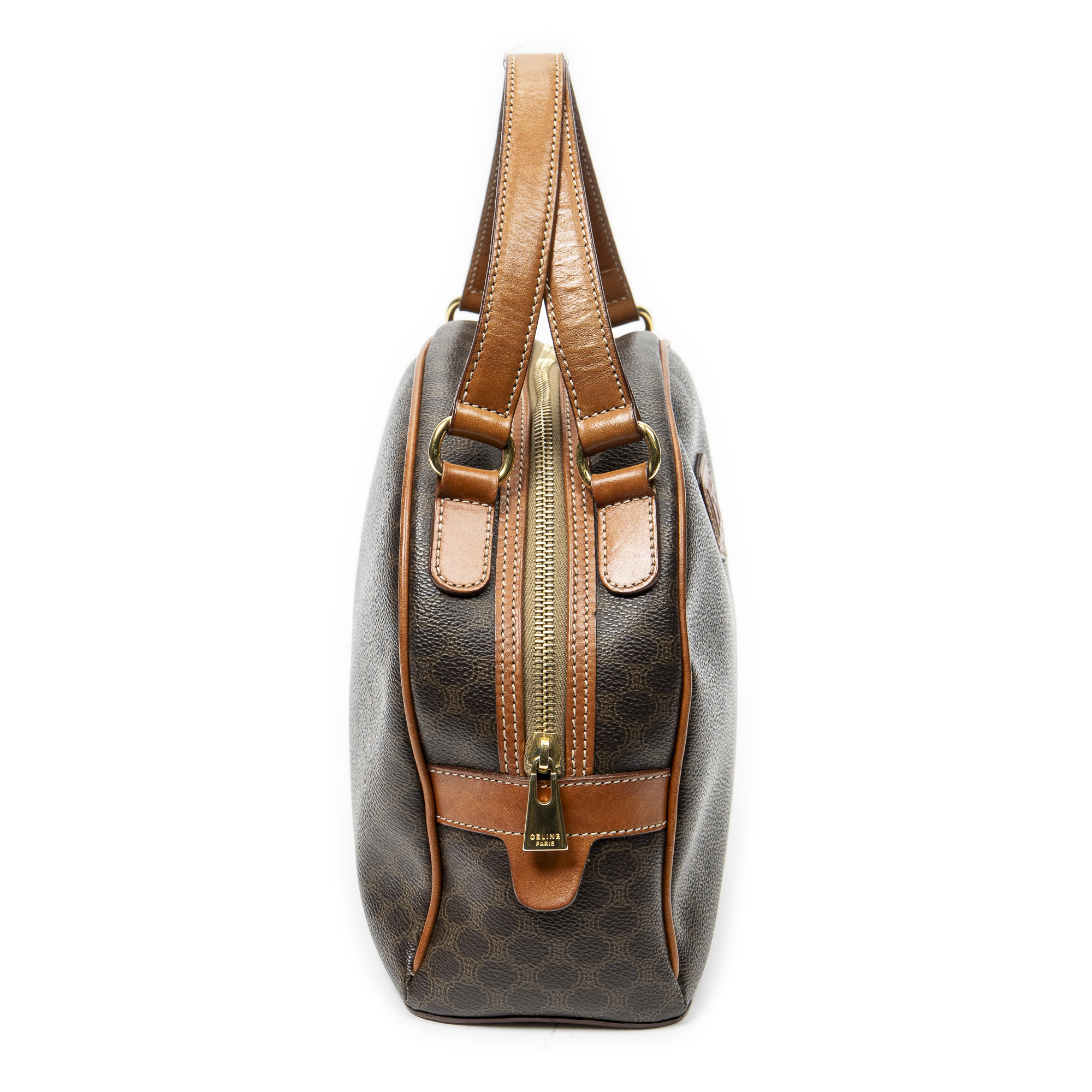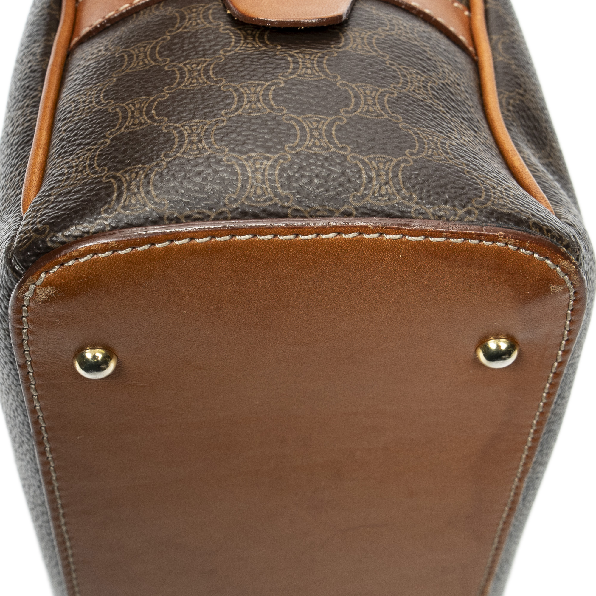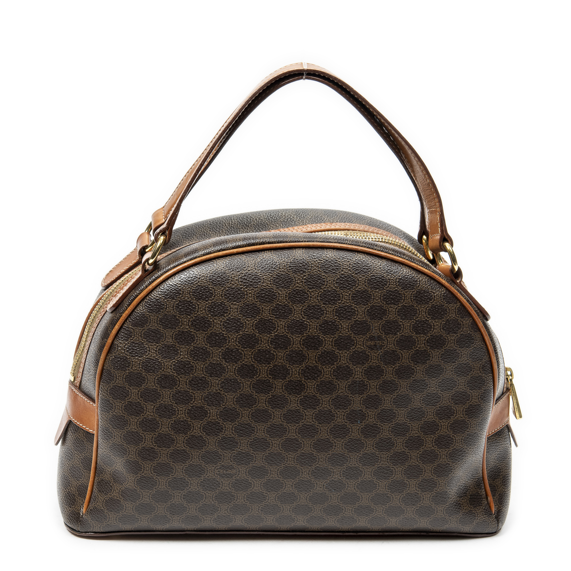 Celine Handbag Dome Top Handle in Brown Macadam Coated Canvas and Gold hardware. The product is in Very Good Condition (AB).