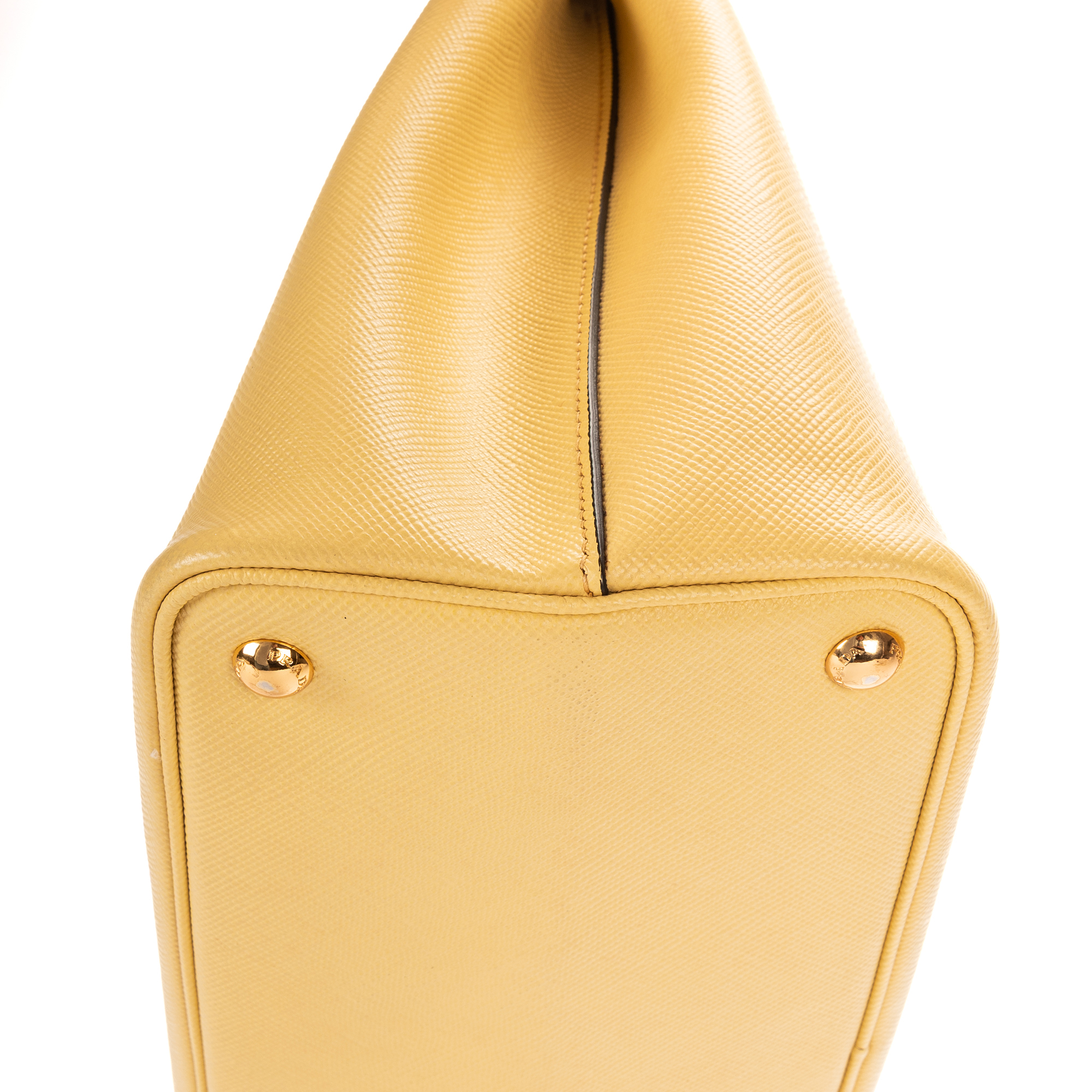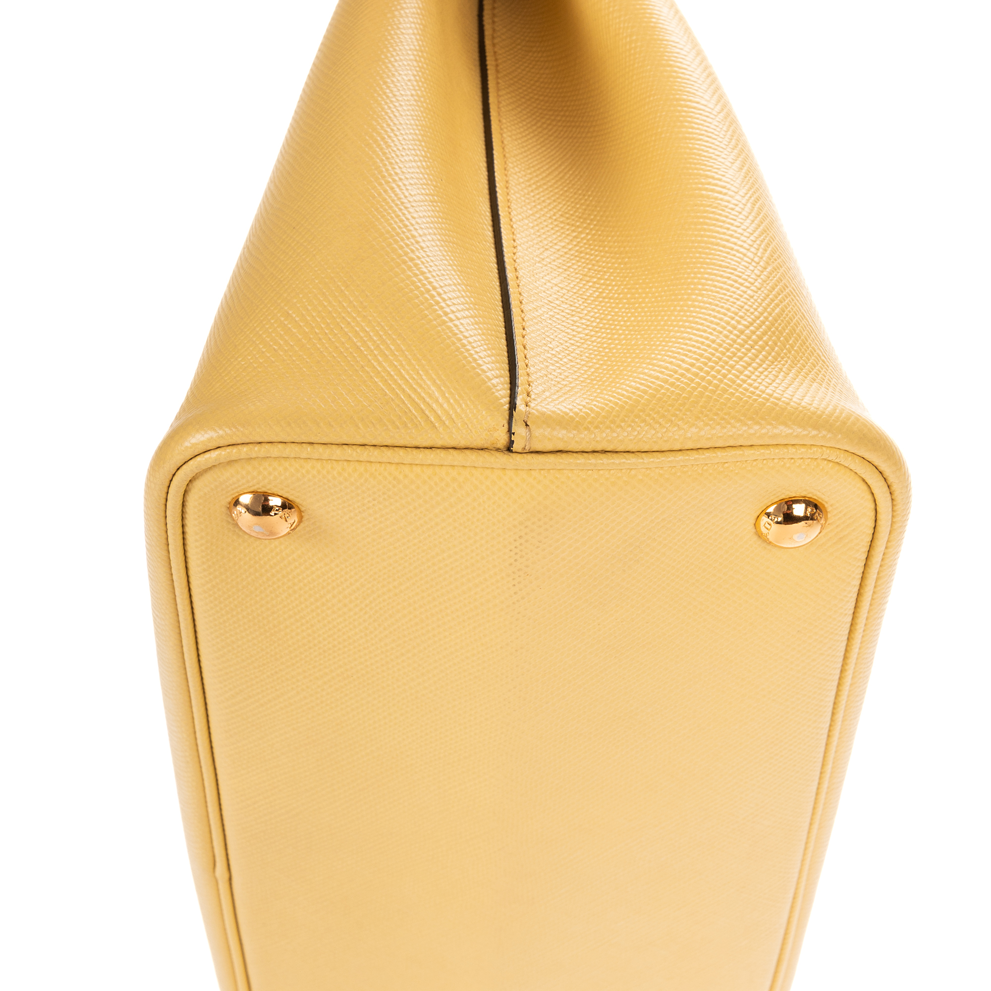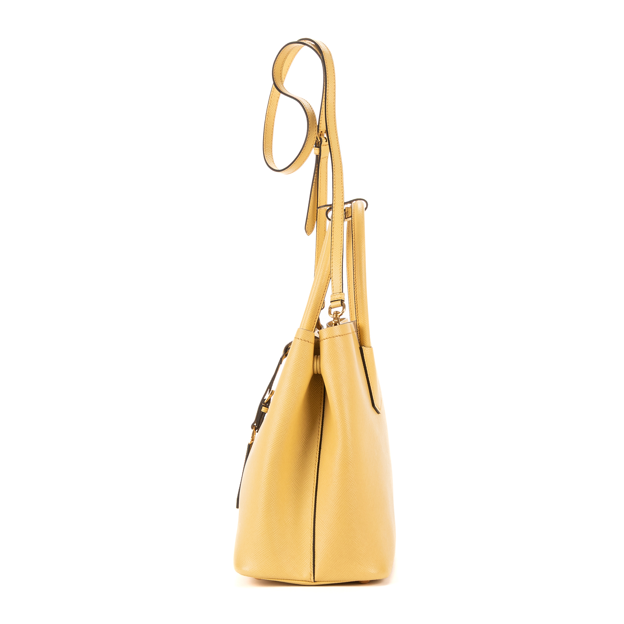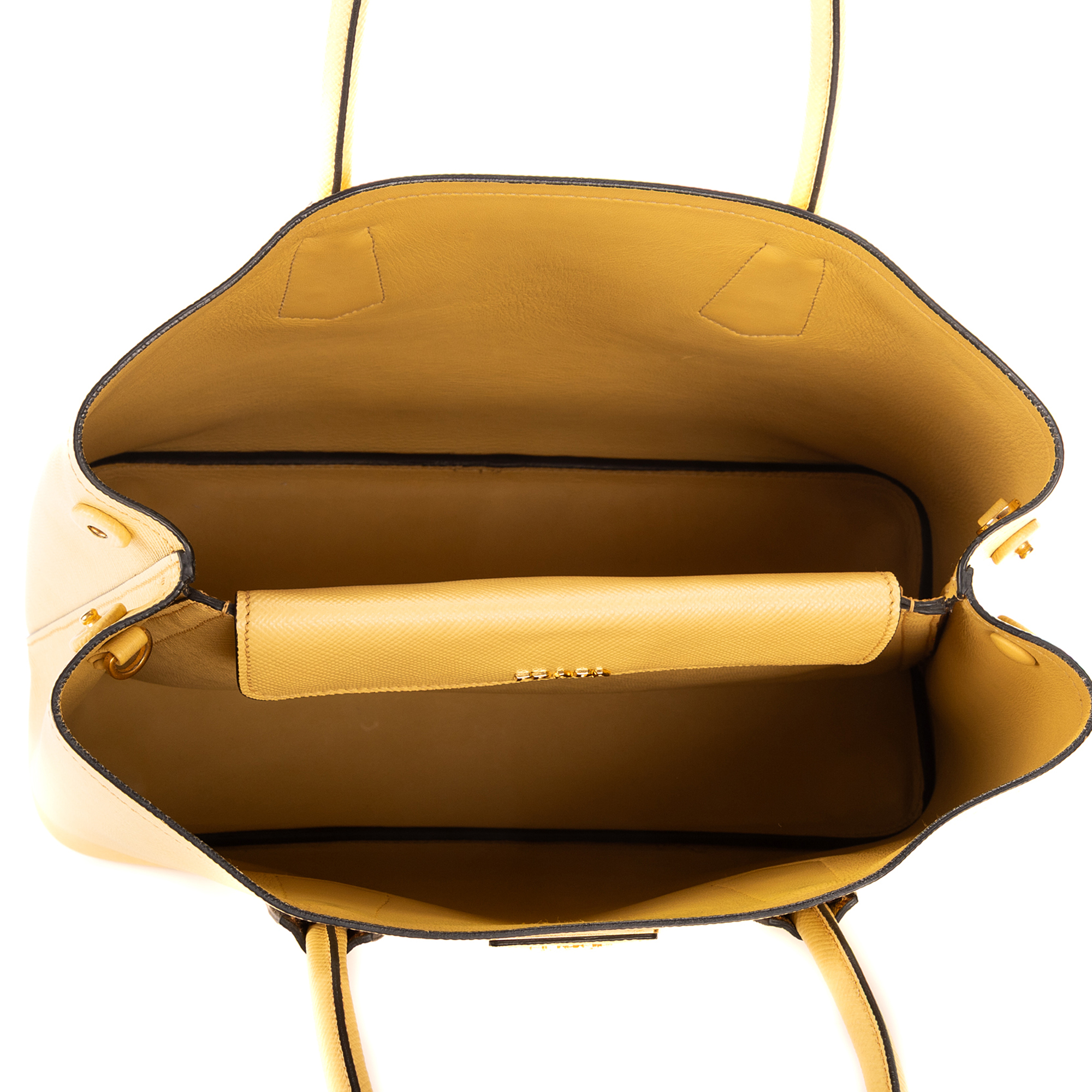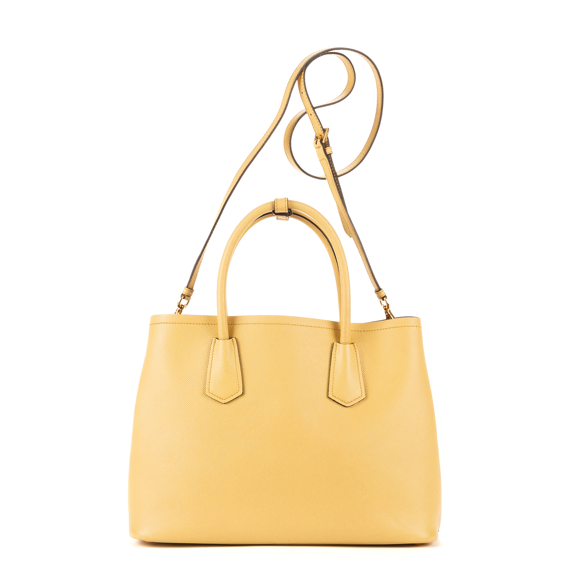 Prada Handbag Double Bag in Light Yellow Saffiano and Gold hardware. The product is in Perfect Condition (AA).