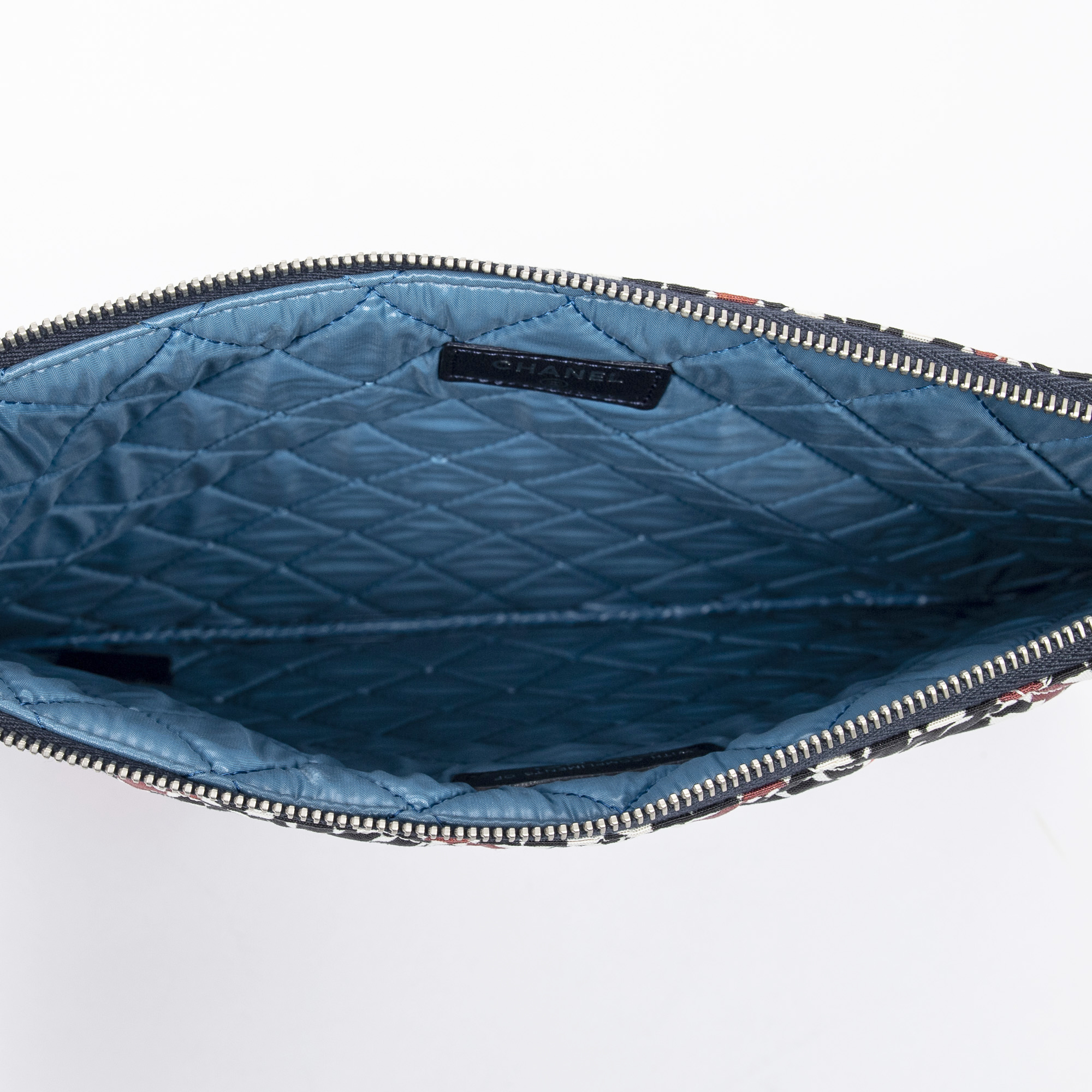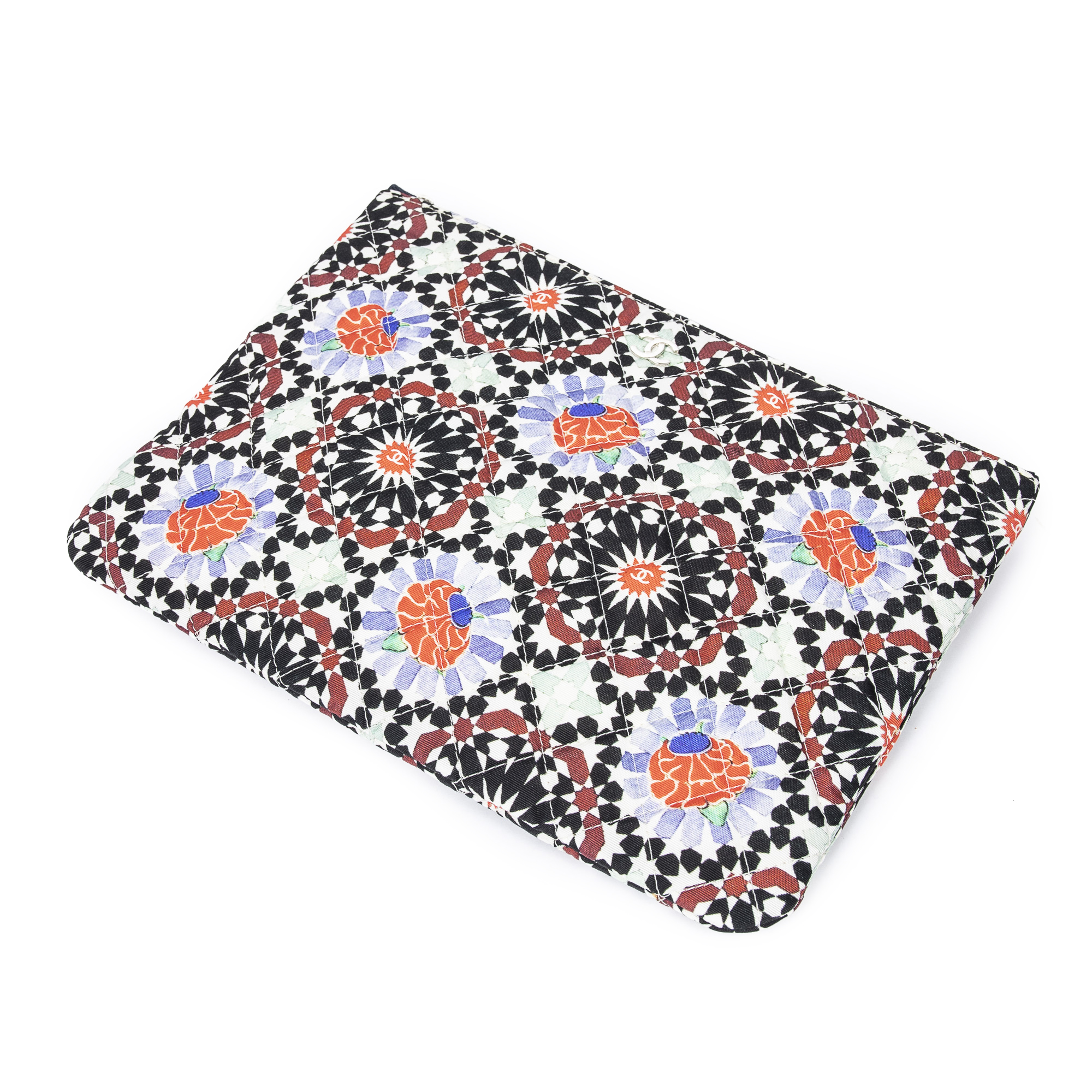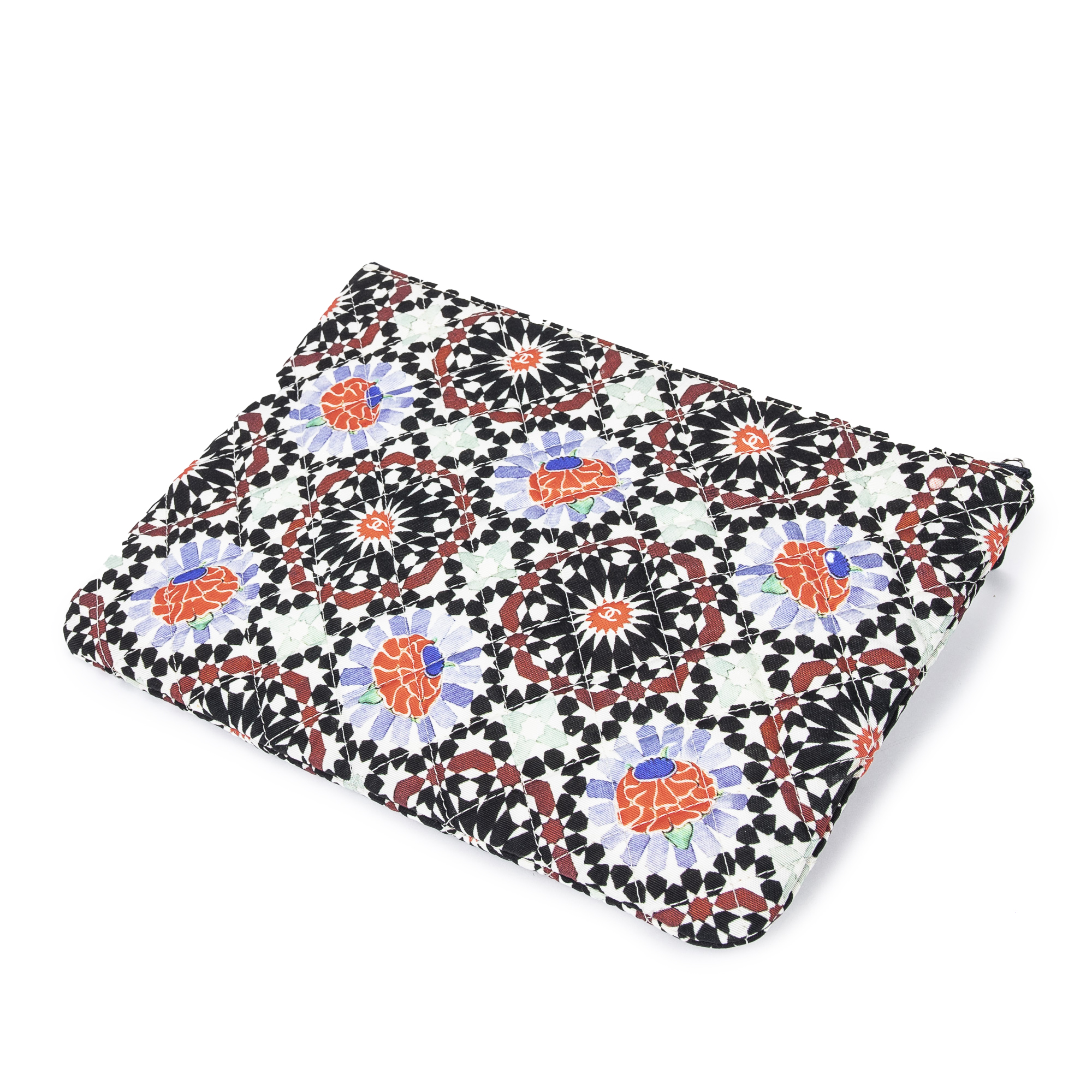 Chanel Handbag Dubai Paris O-Case Zip Pouch in Black/Orange/Blue Multicolor Quilted Printed Canvas and Silver hardware. The product is in Perfect Condition (AA).