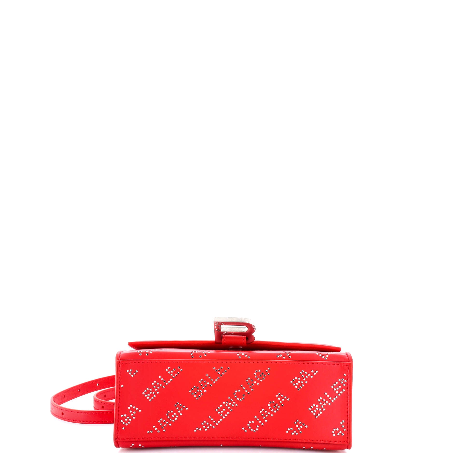 Balenciaga Handbag Hourglass Top Handle XS in Red All Over Logo Crystals Leather and Aged Silver hardware. The product is in Perfect Condition (AA).