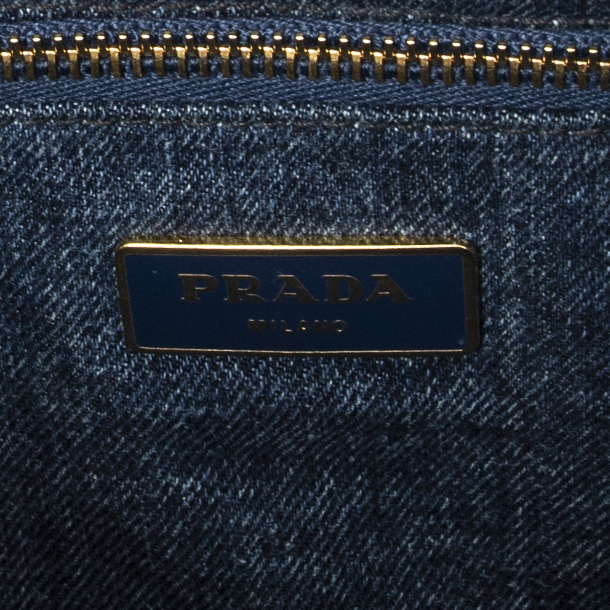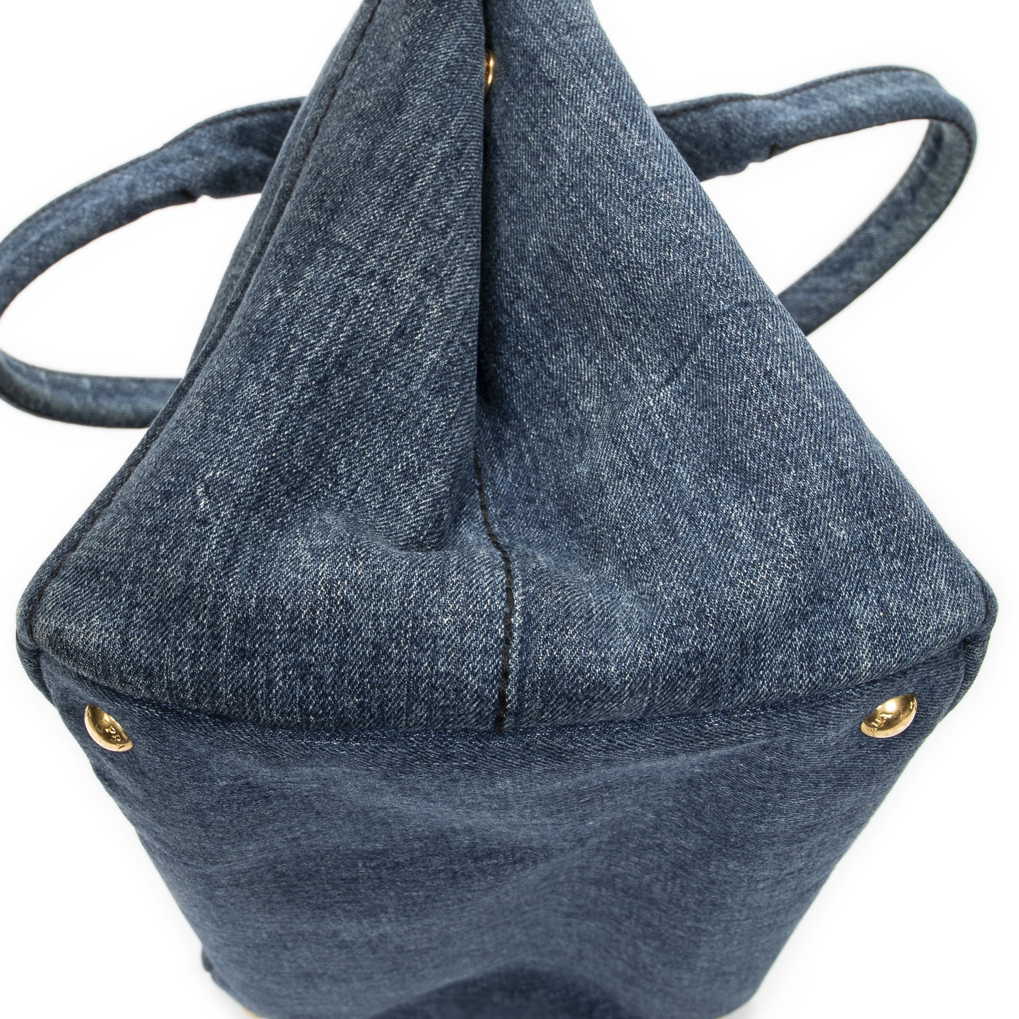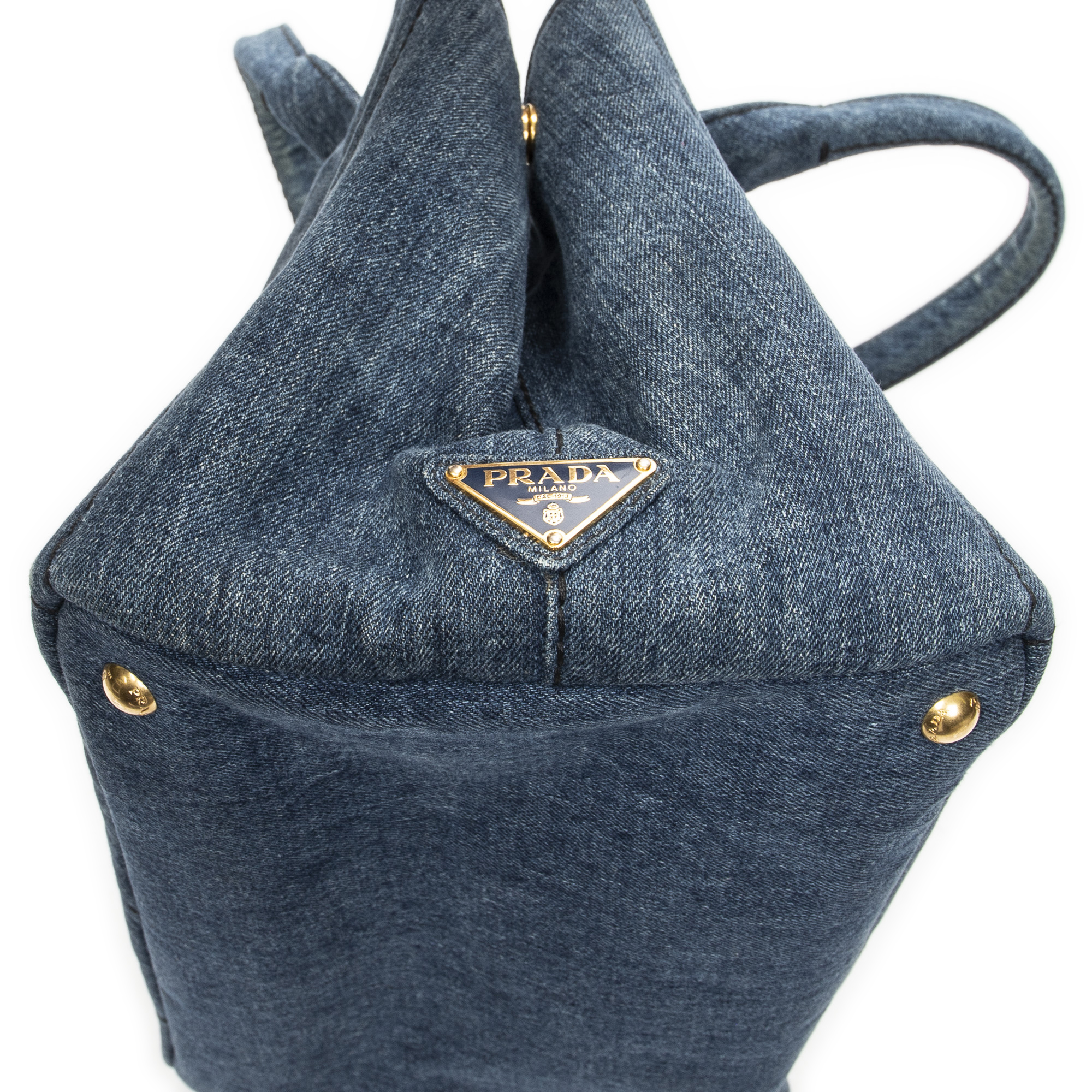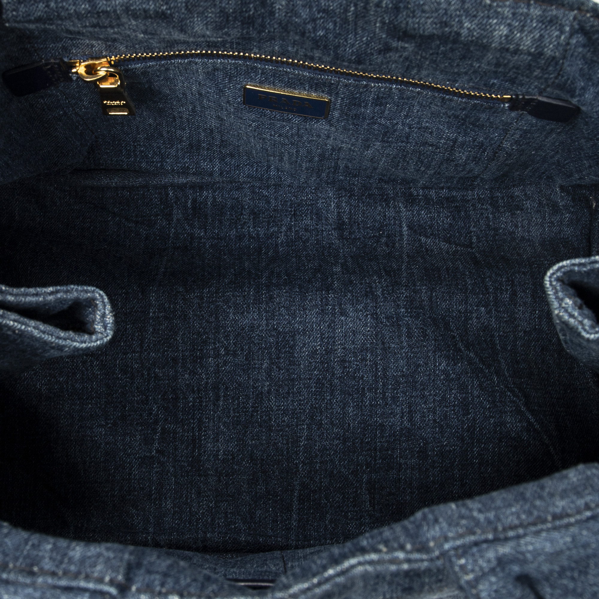 Prada Handbag Medium Canapa Tote in Blue Denim Canapa Denim Canvas and Gold hardware. The product is in Very Good Condition (AB).