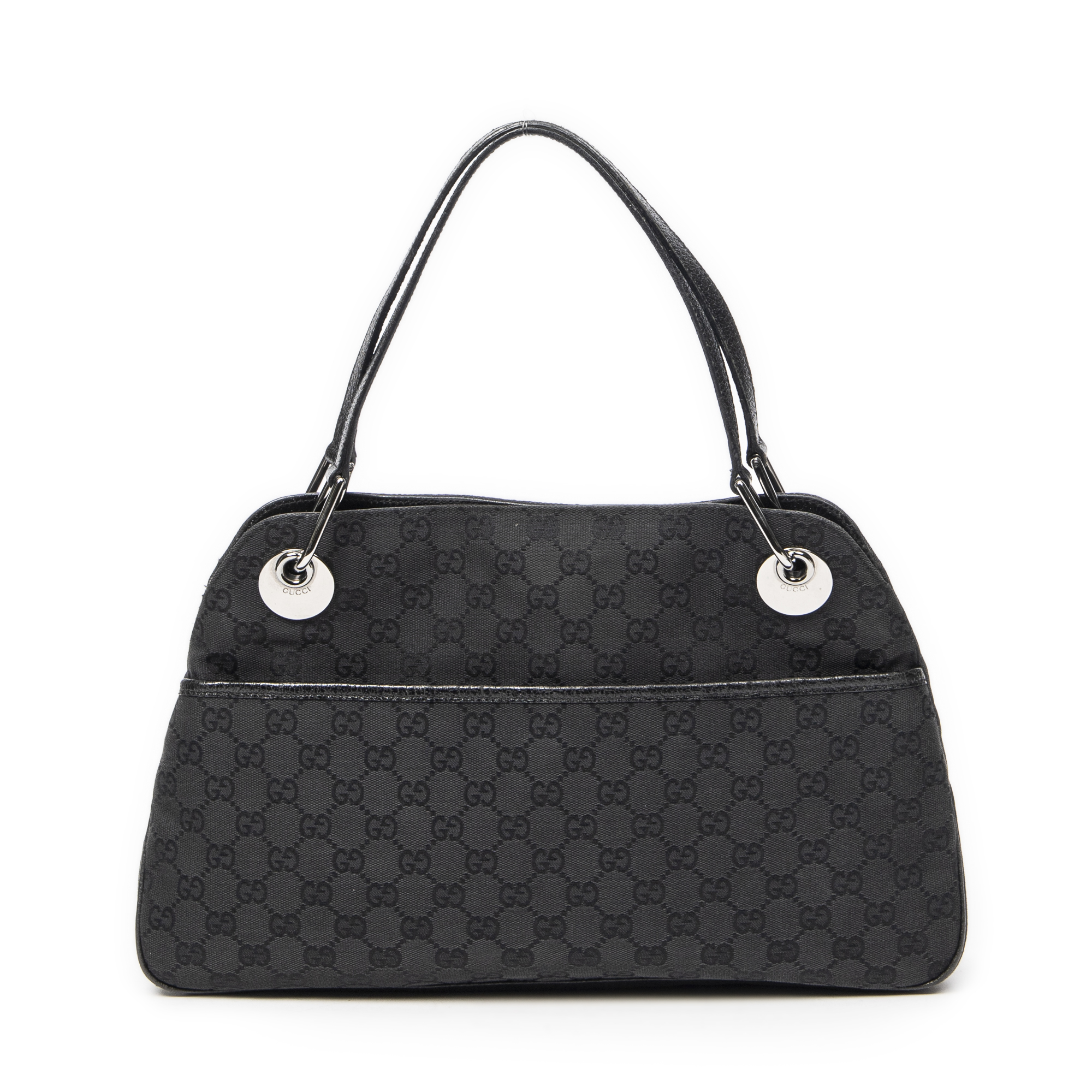 Gucci Handbag Medium Eclipse Tote in Black Monogrammed Canvas and Silver hardware. The product is in Excellent Condition (A).