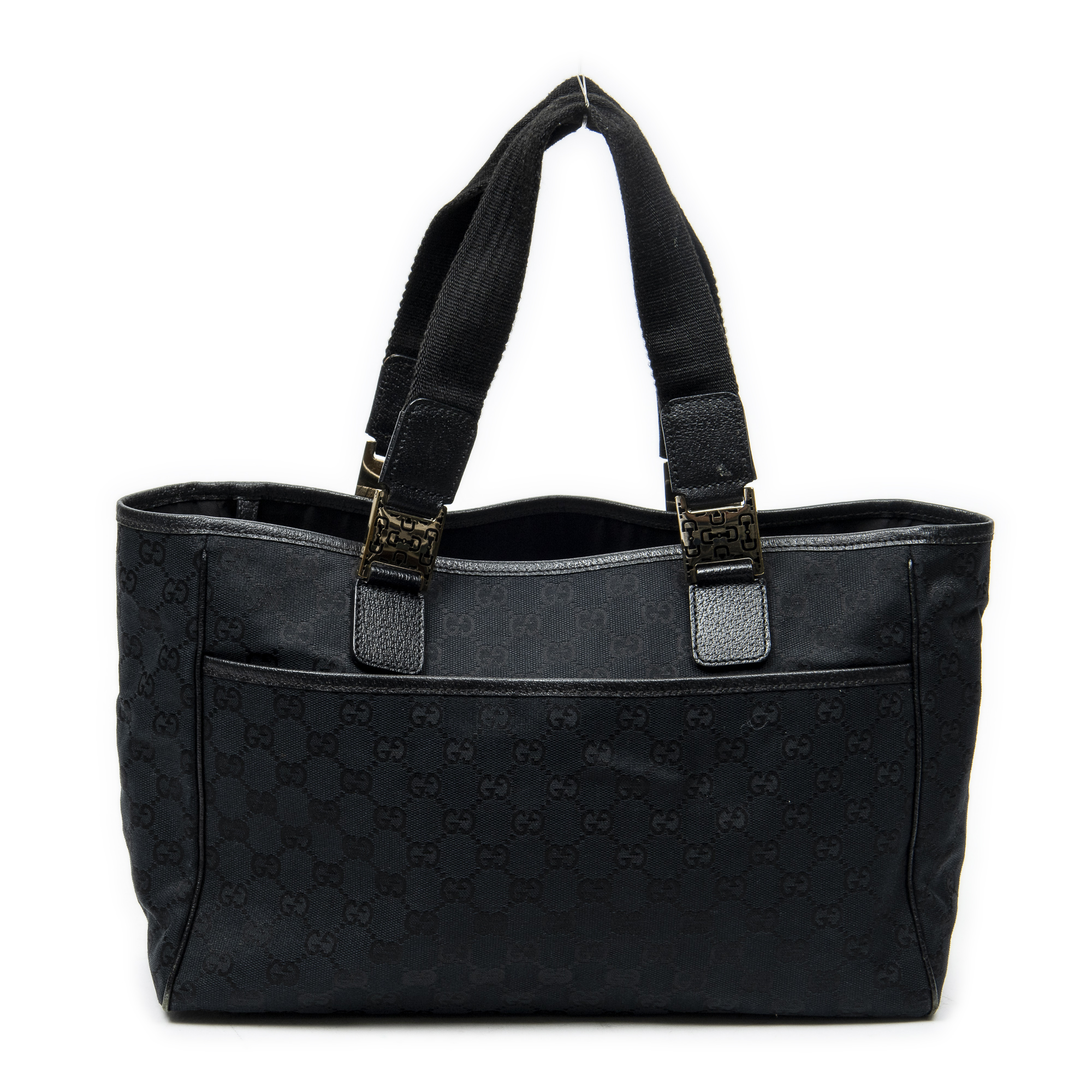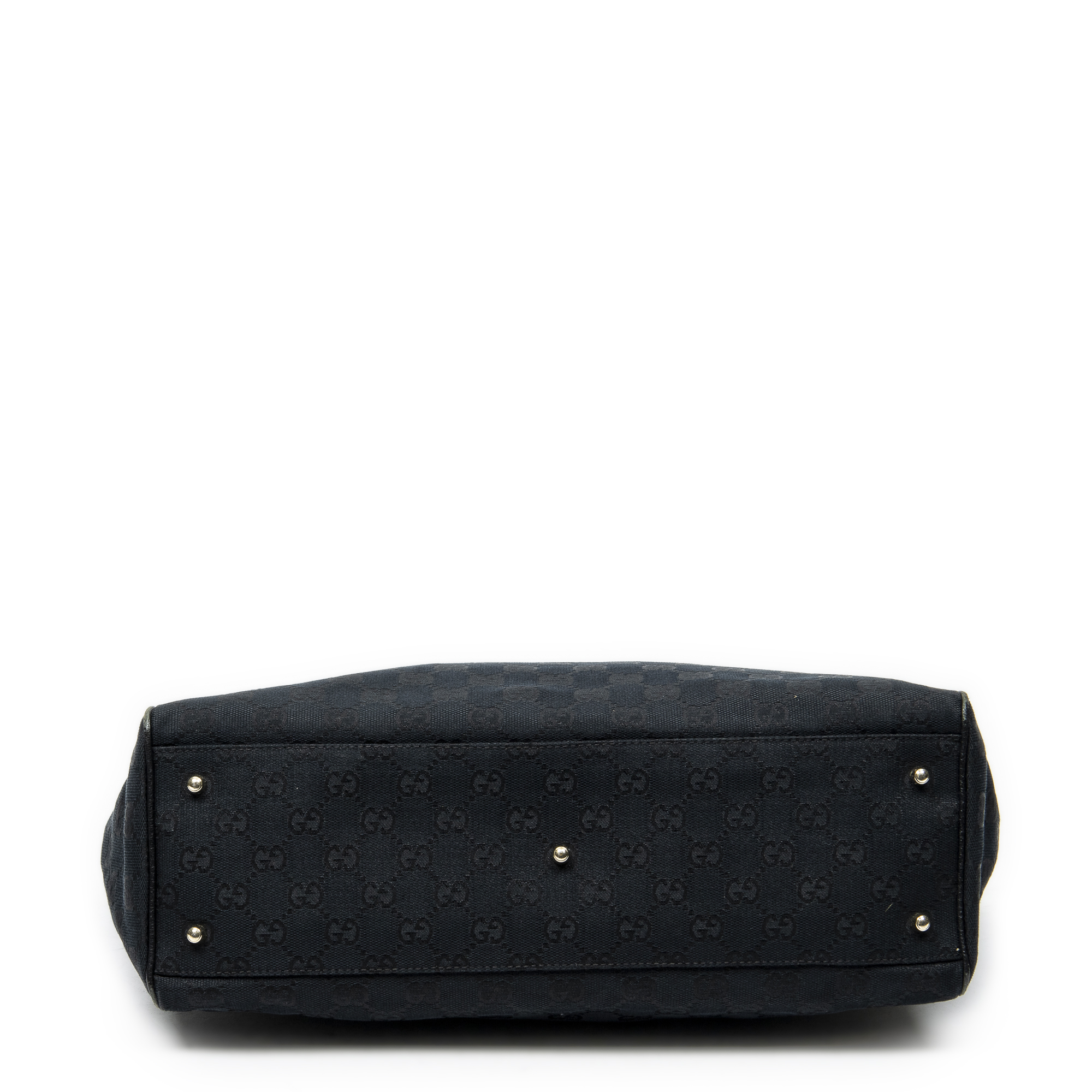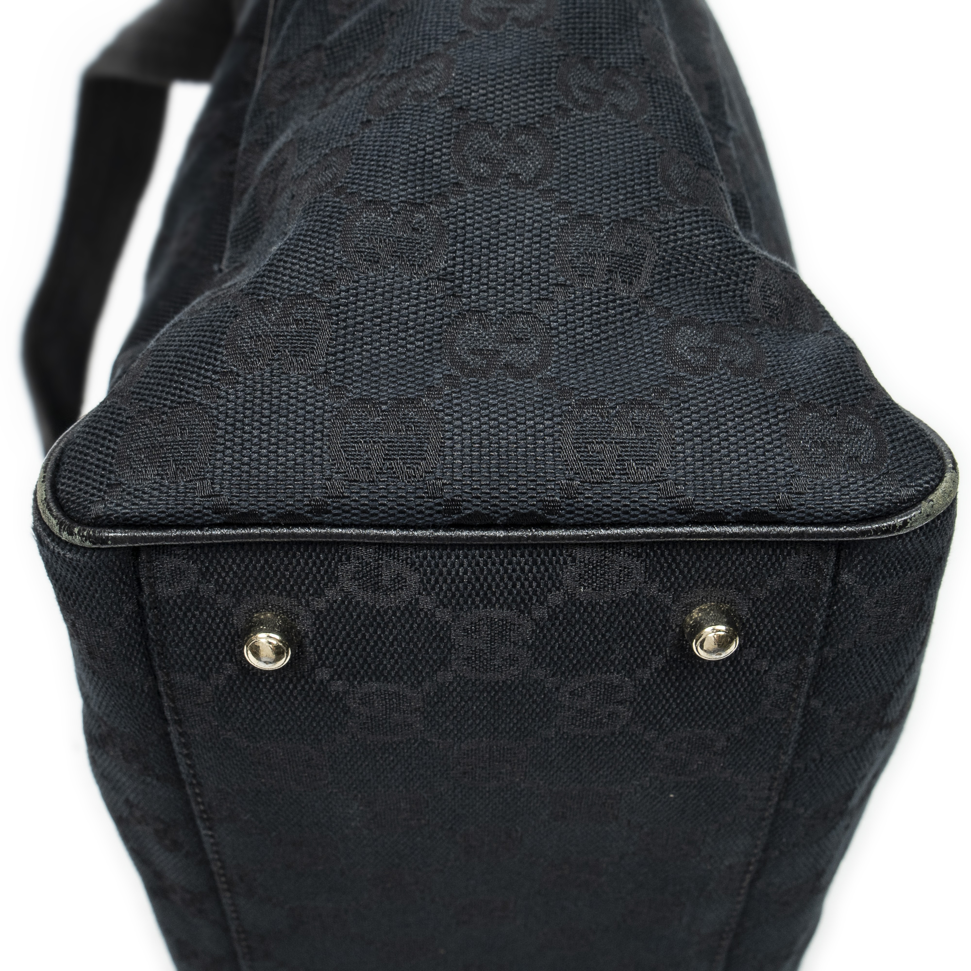 Gucci Handbag Medium Pop Tote in Black Monogrammed Canvas and Gold hardware. The product is in Very Good Condition (AB).