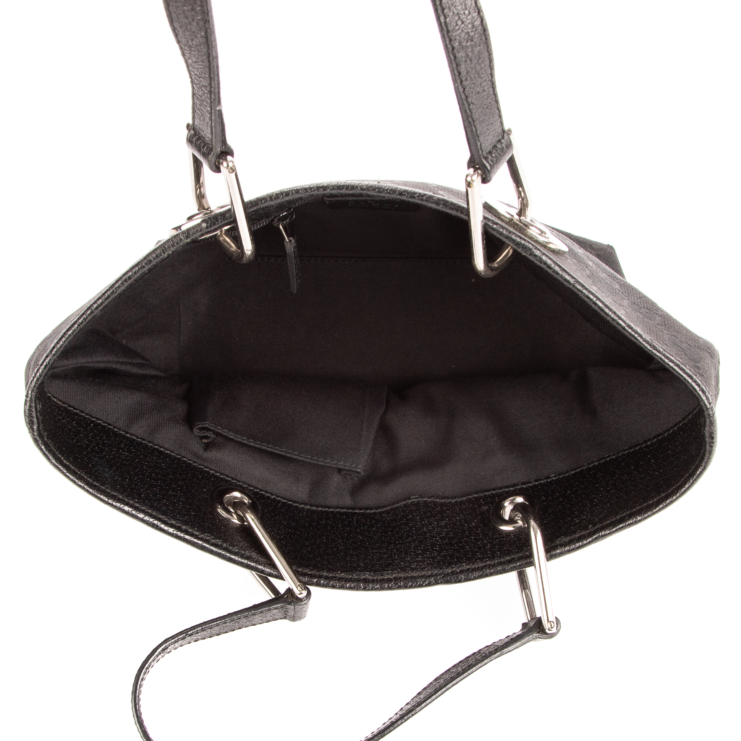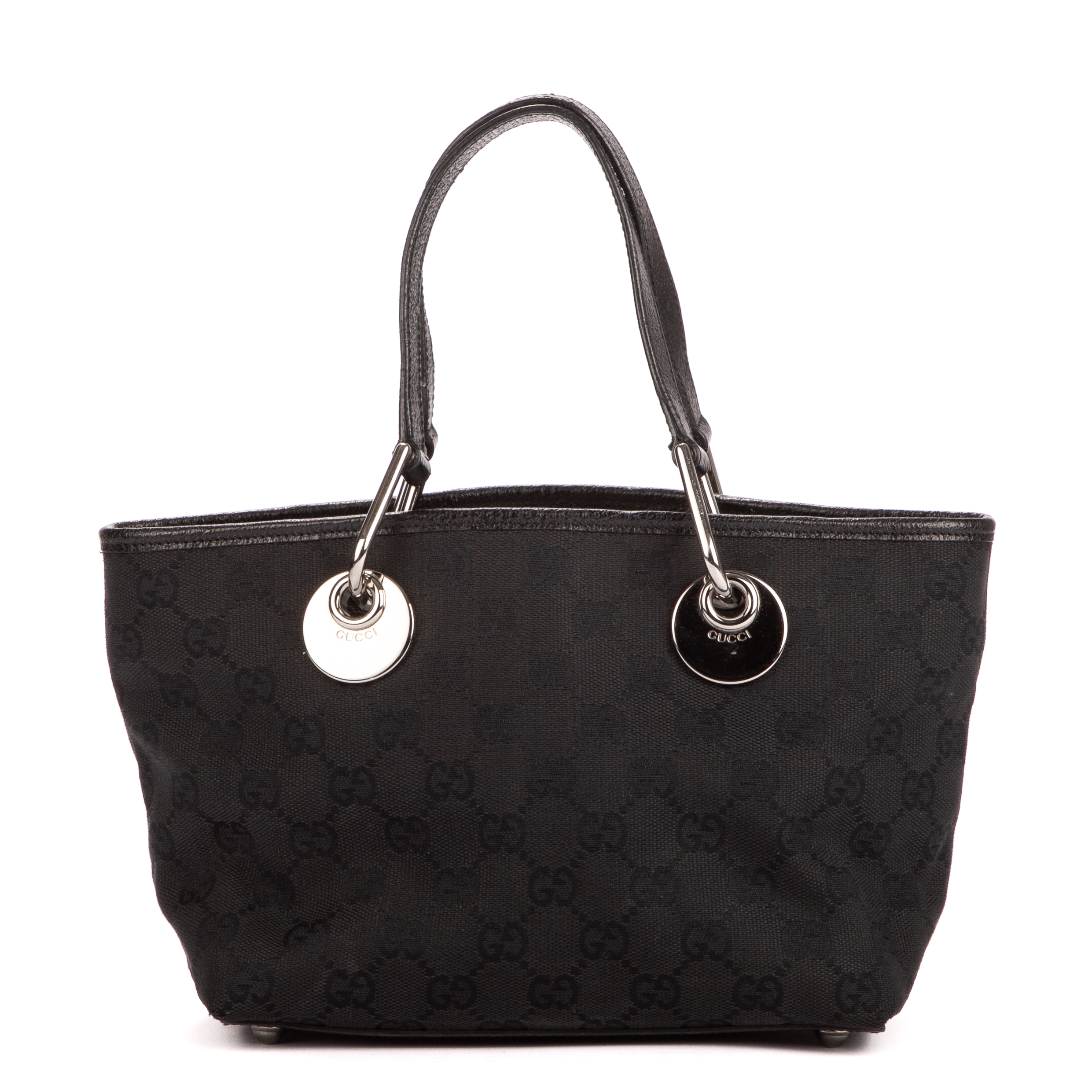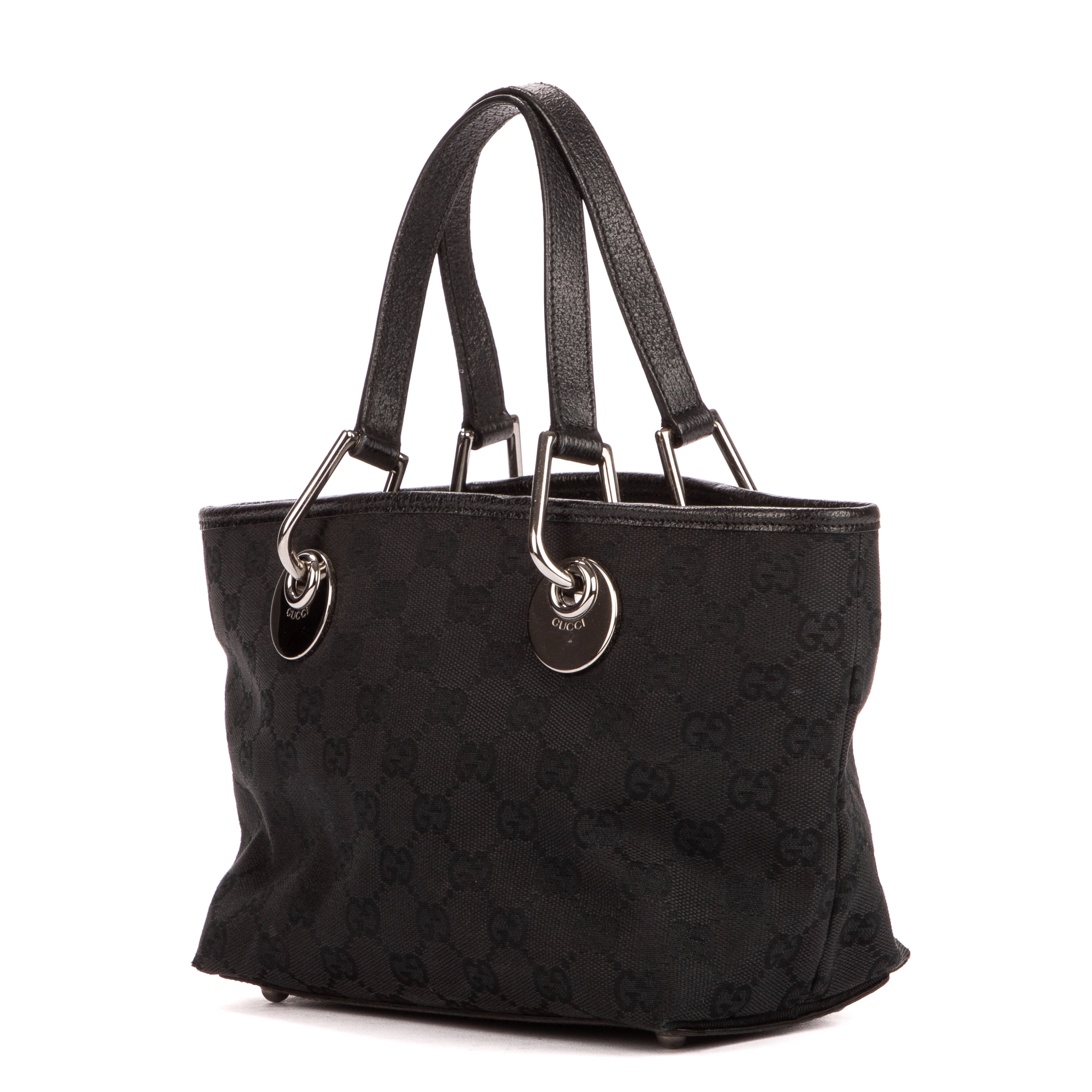 Gucci Handbag Mini Eclipse Tote in Black Monogrammed Canvas and Silver hardware. The product is in Excellent Condition (A).