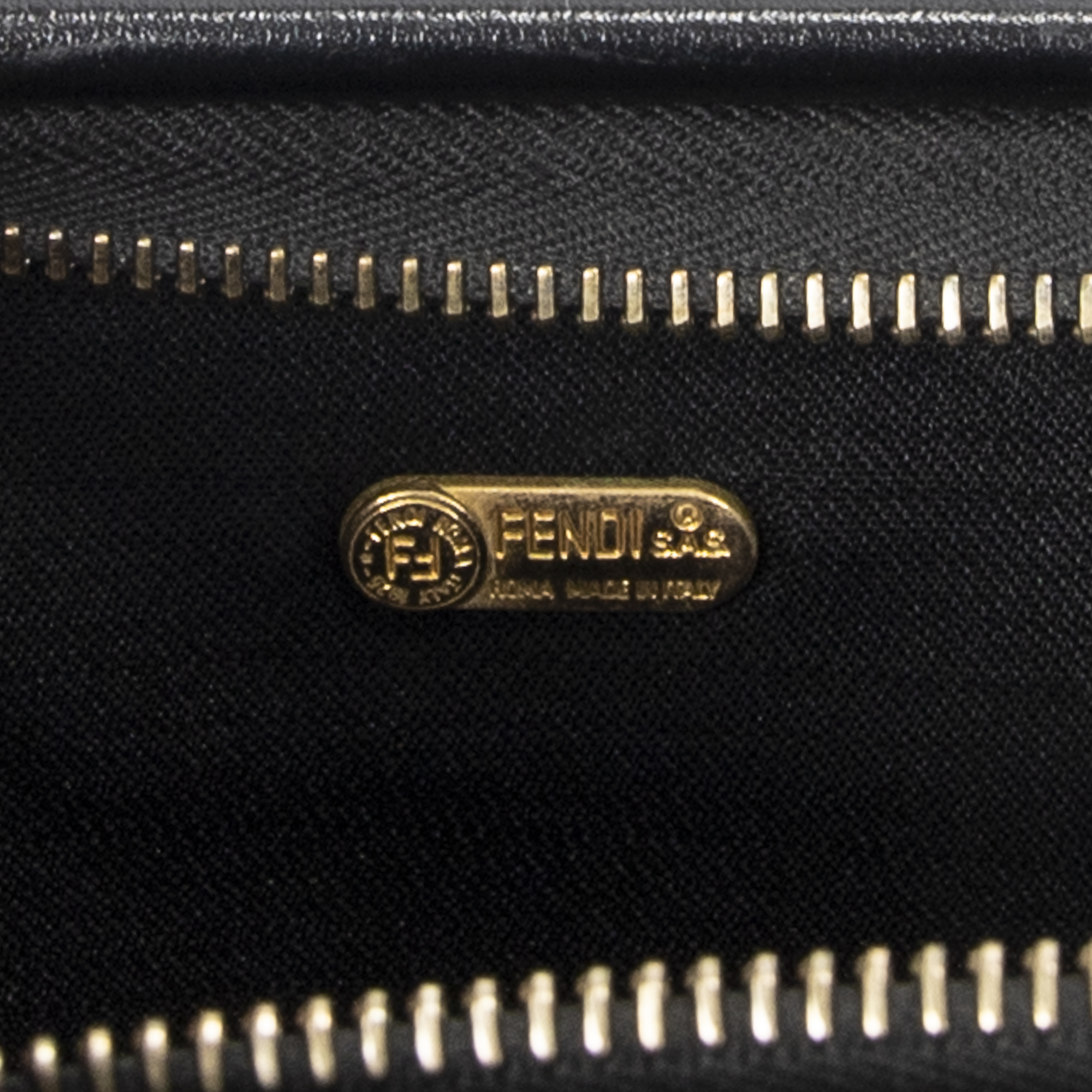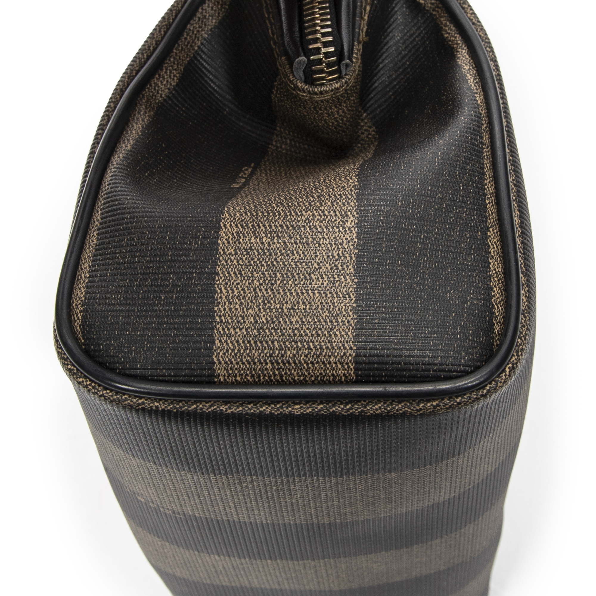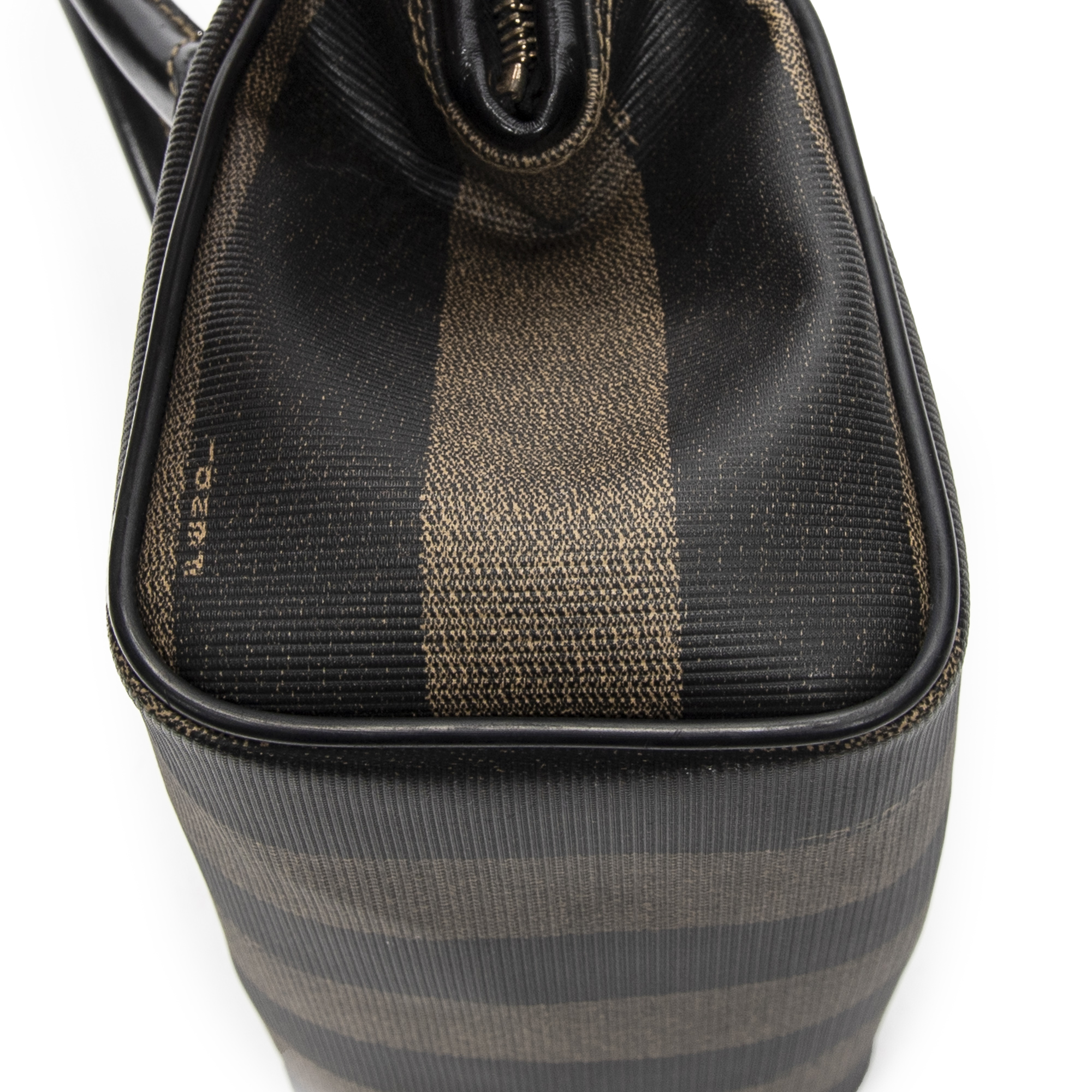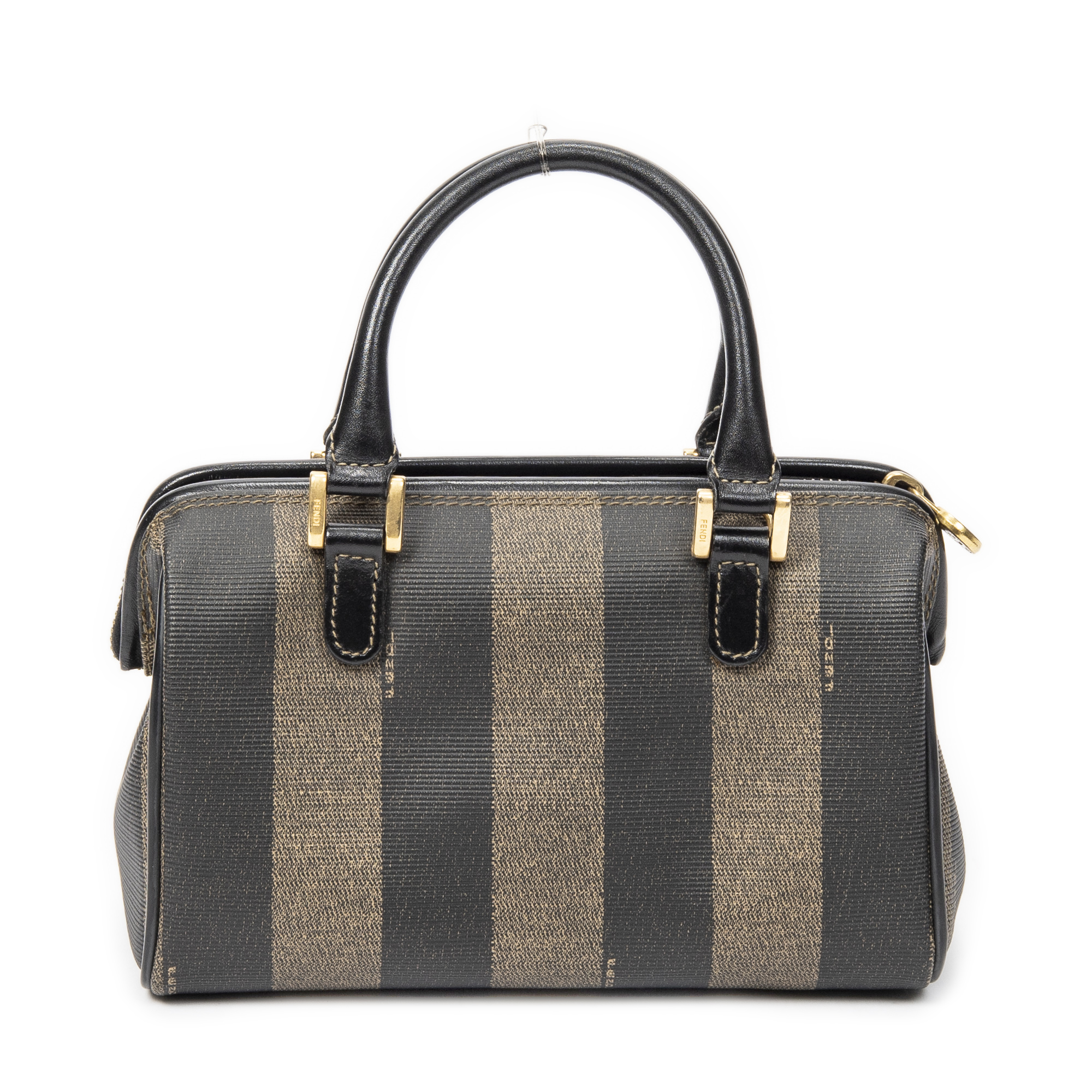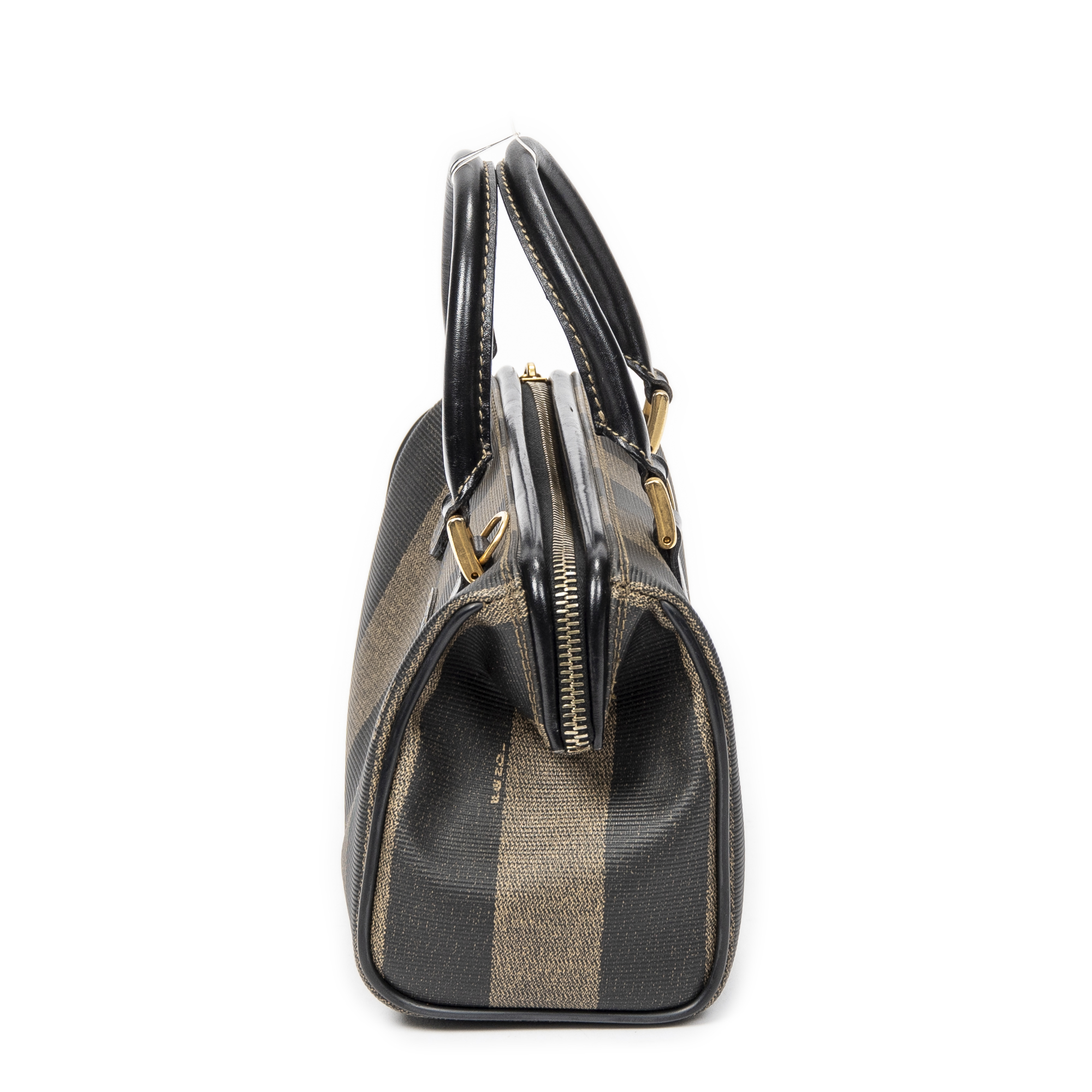 Fendi Handbag Mini Frame Boston in Black/Tan Pequin Stripe Coated Canvas and Gold hardware. The product is in Excellent Condition (A).