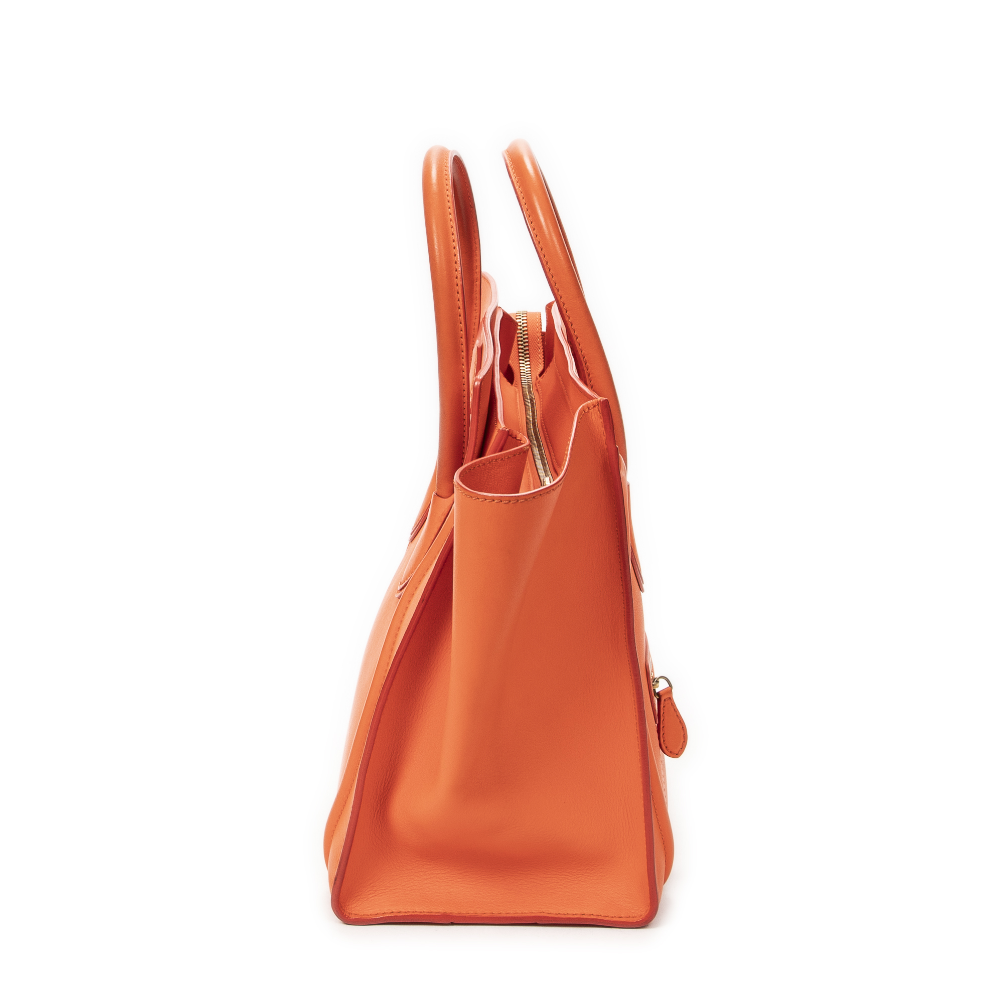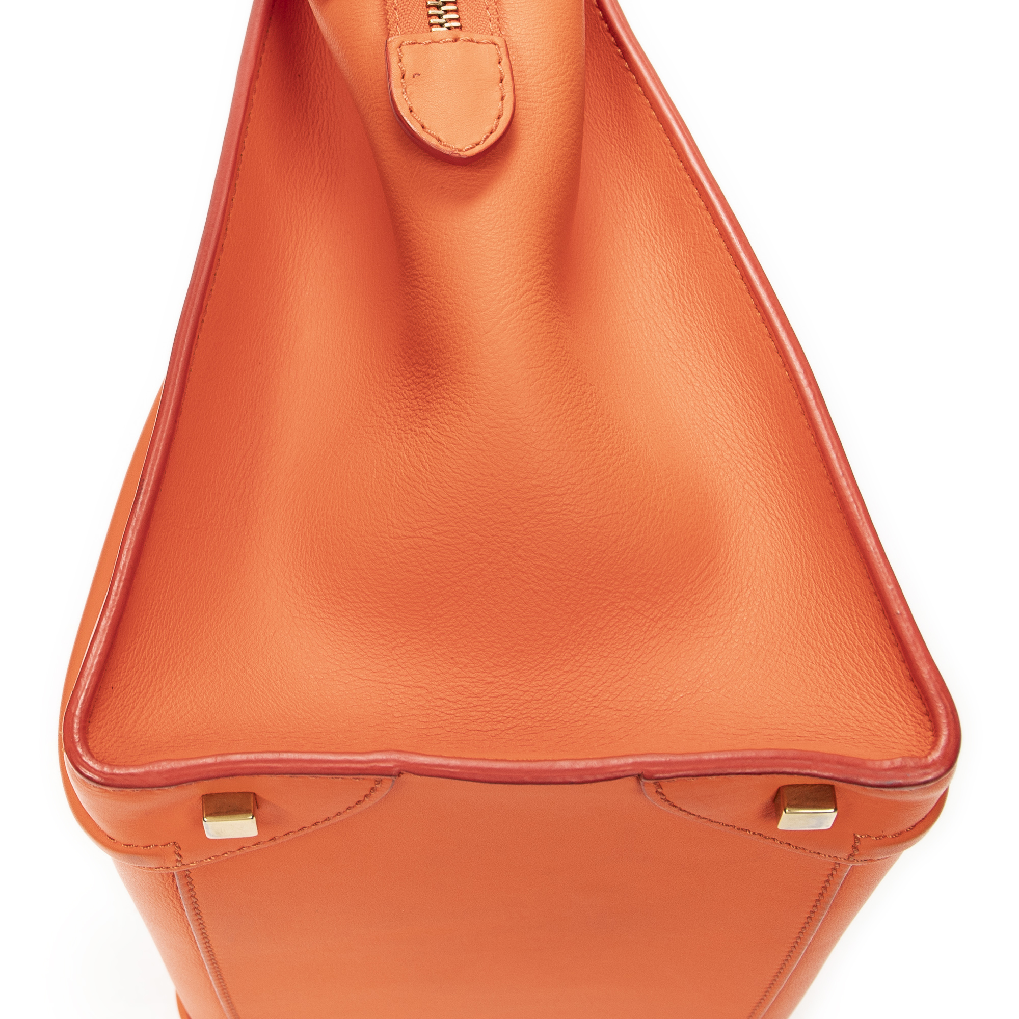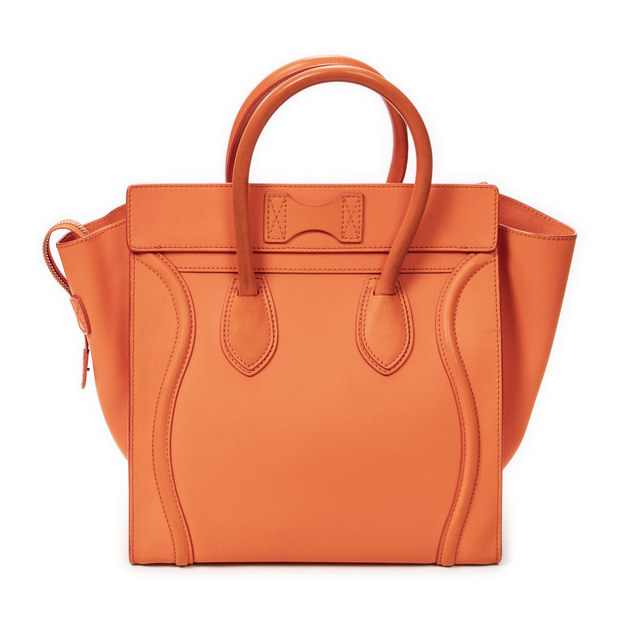 Celine Handbag Mini Luggage in Orange Calfskin Leather and Gold hardware. The product is in Very Good Condition (AB).