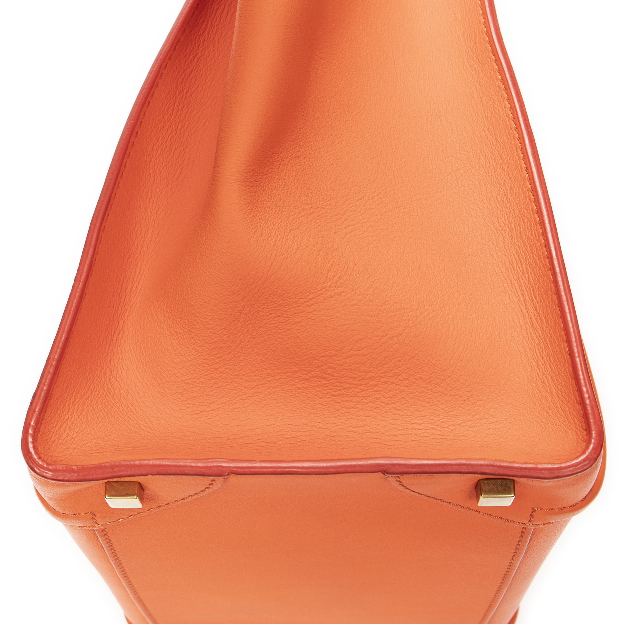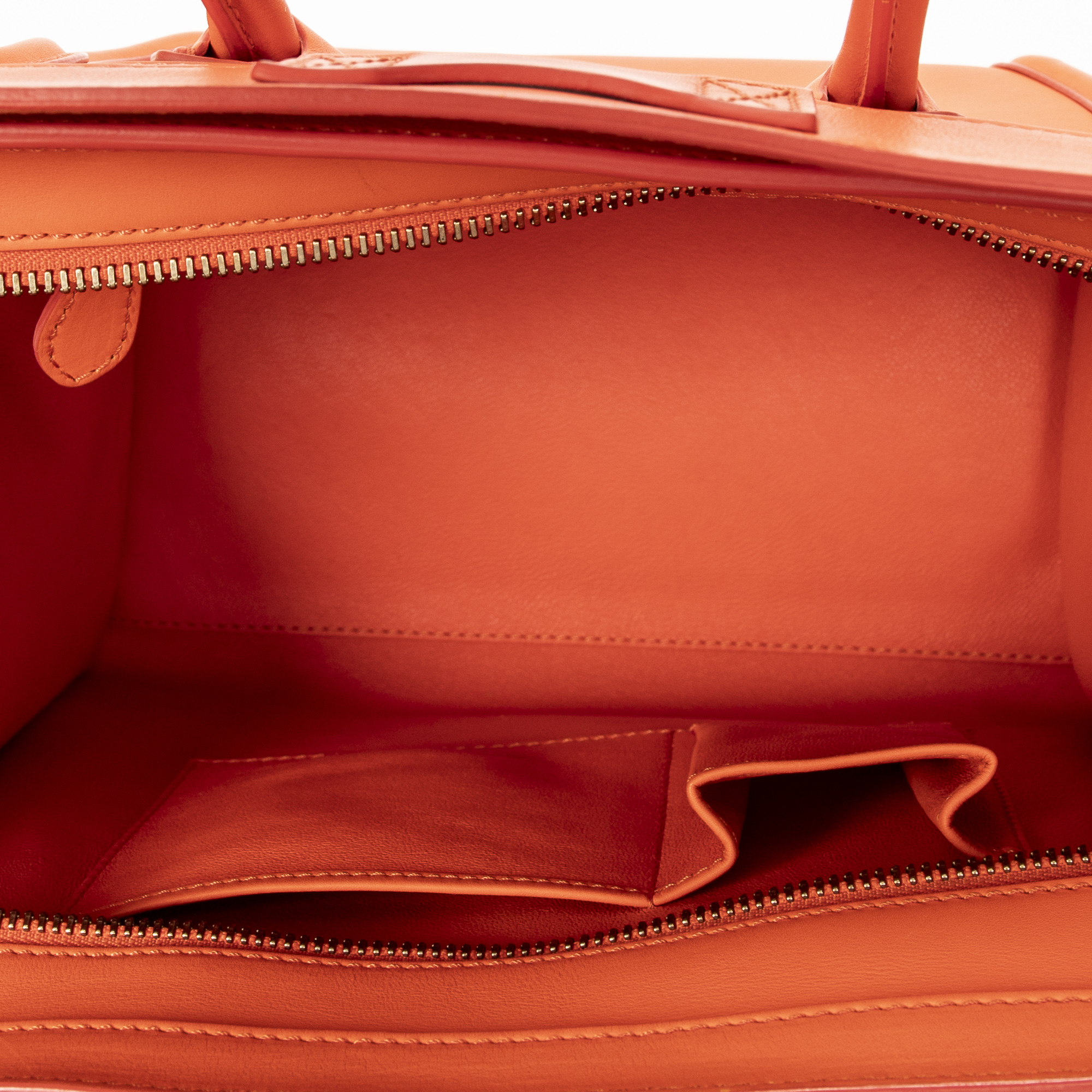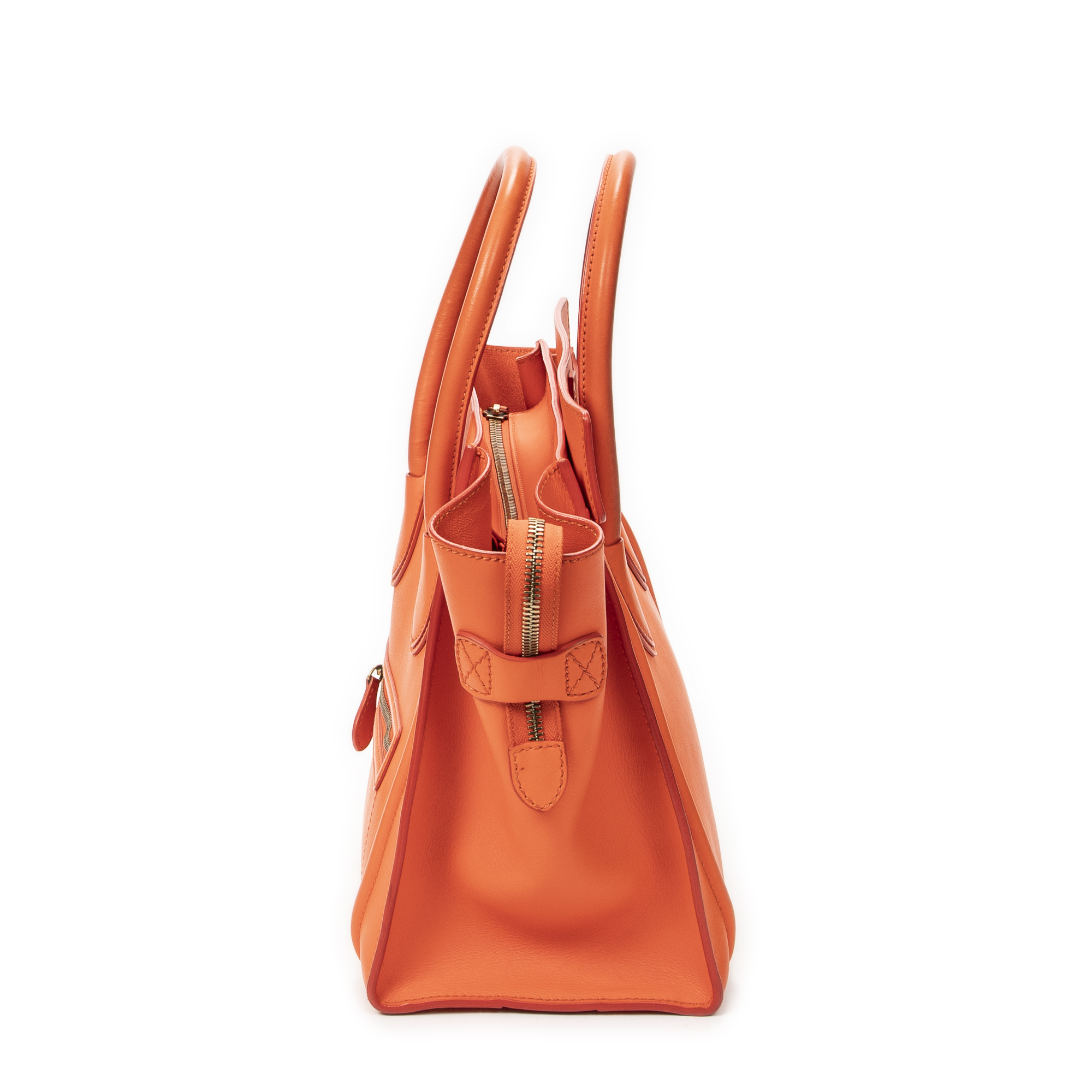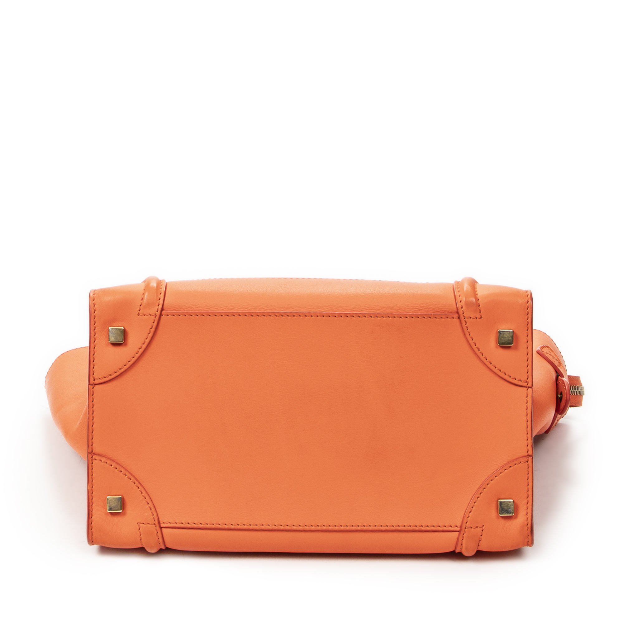 Celine Handbag Mini Luggage in Orange Calfskin Leather and Gold hardware. The product is in Very Good Condition (AB).