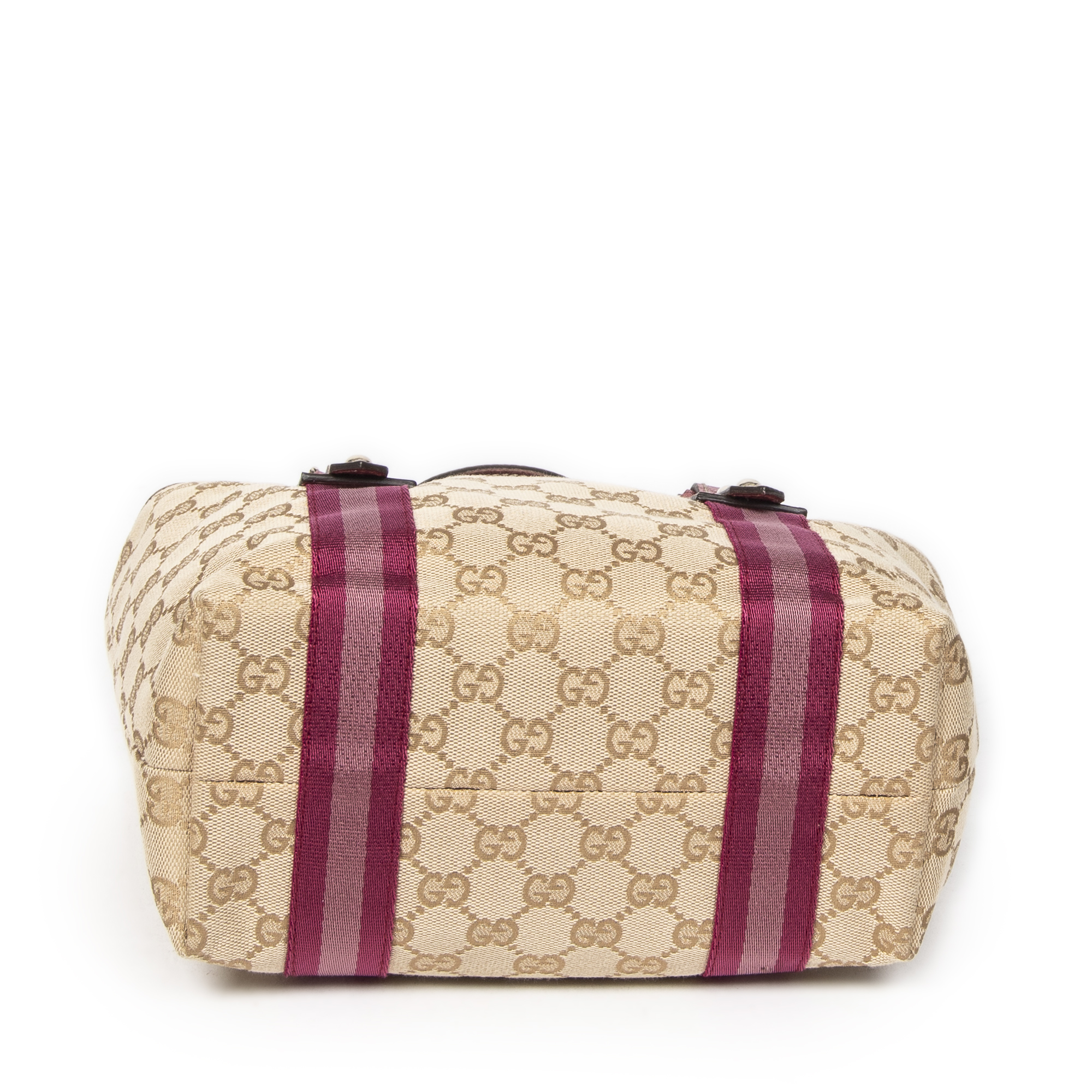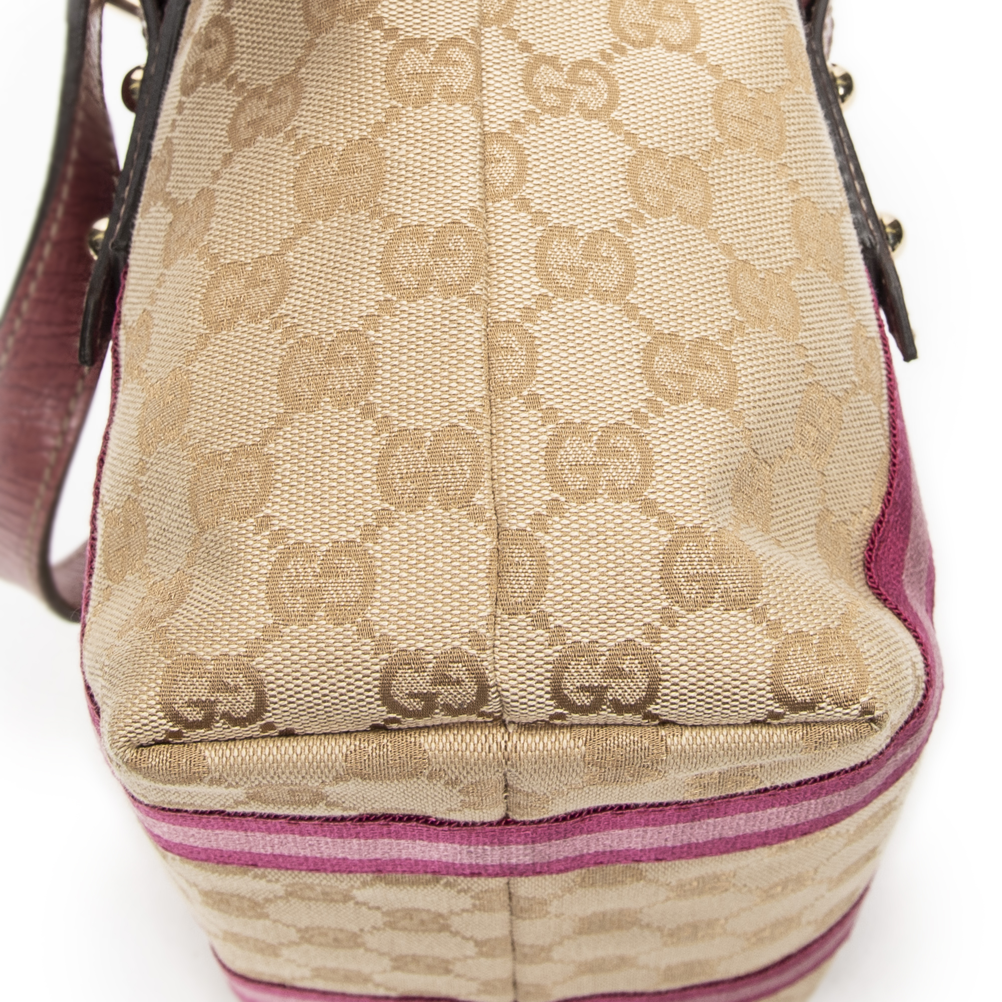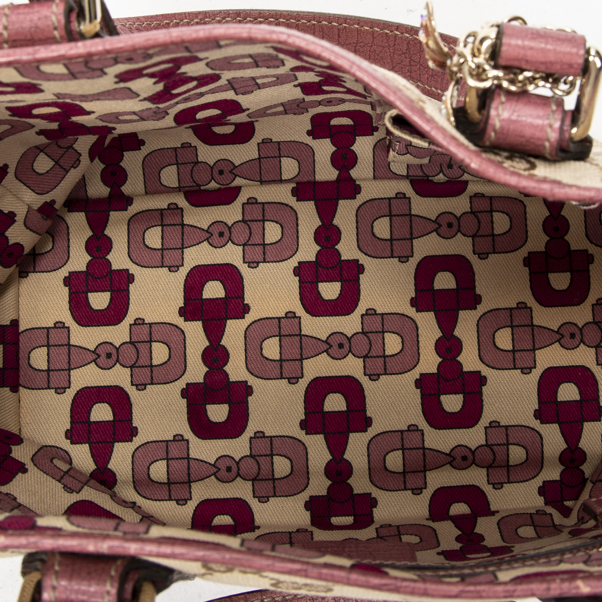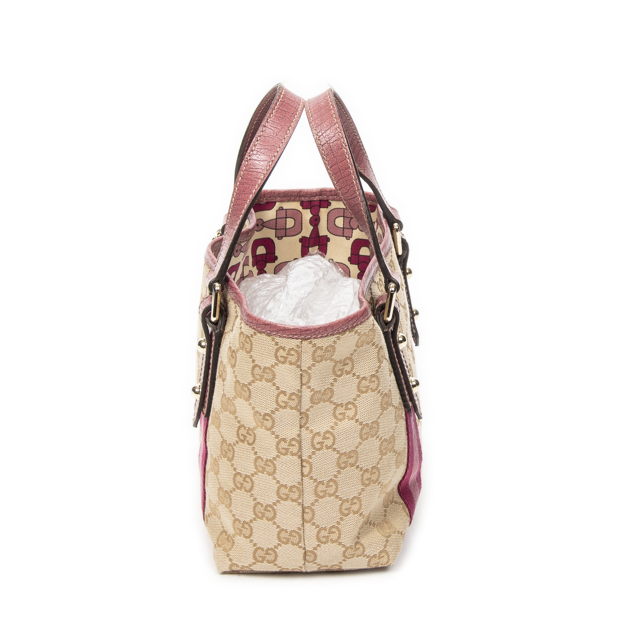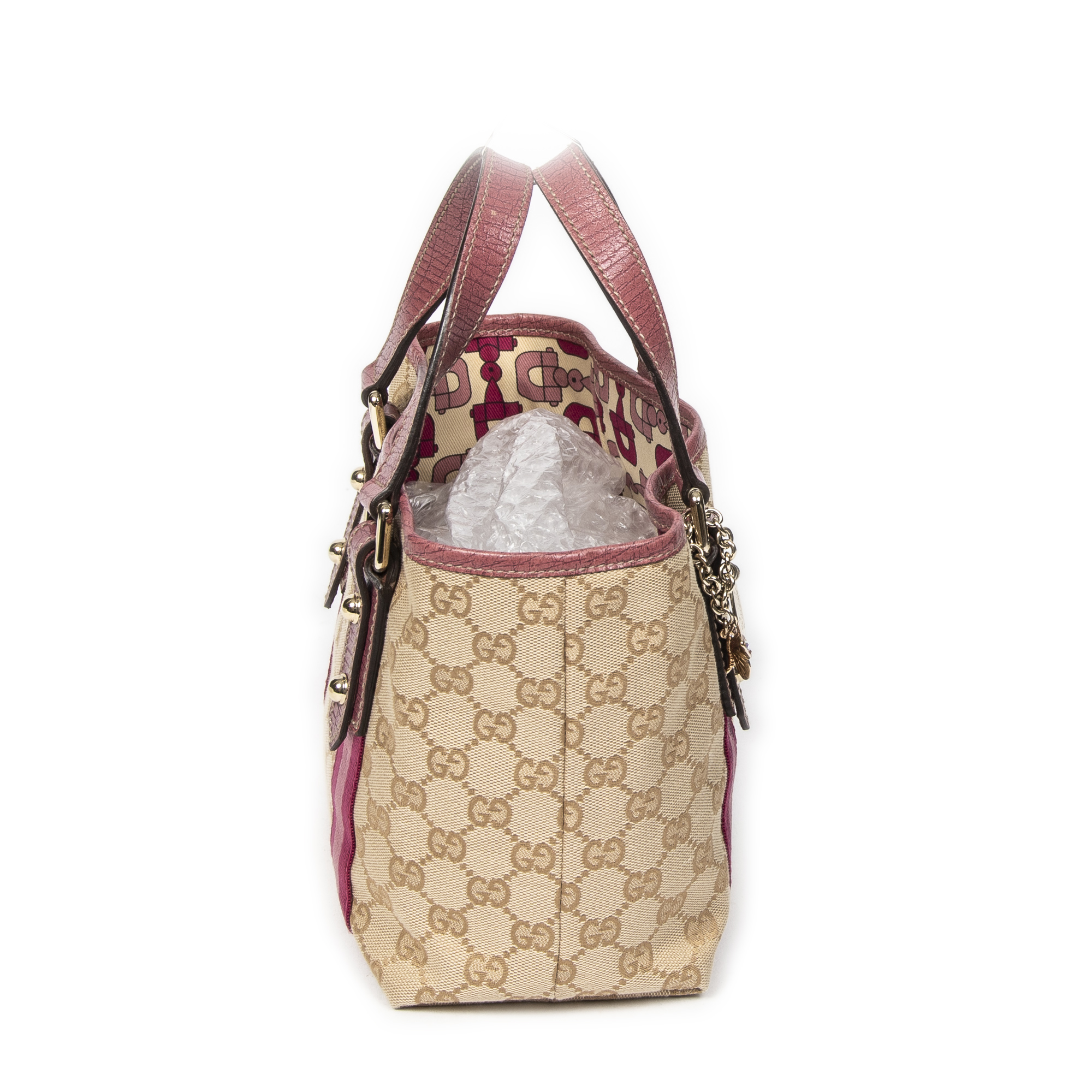 Gucci Handbag Mini Web Jolicoeur Tote in Brown/Pink Monogrammed Canvas and Gold hardware. The product is in Excellent Condition (A).