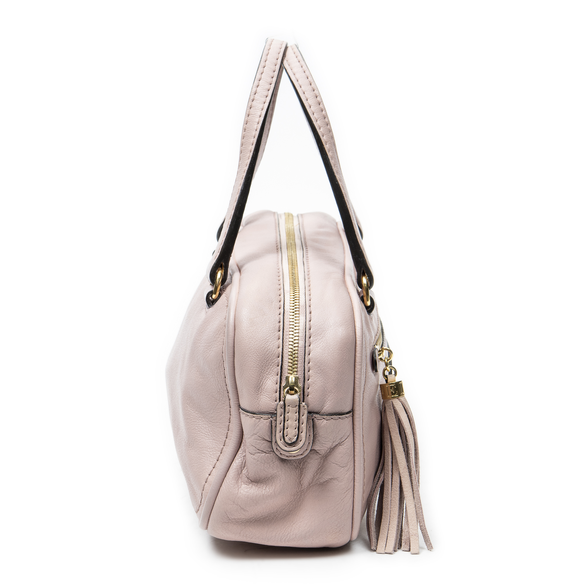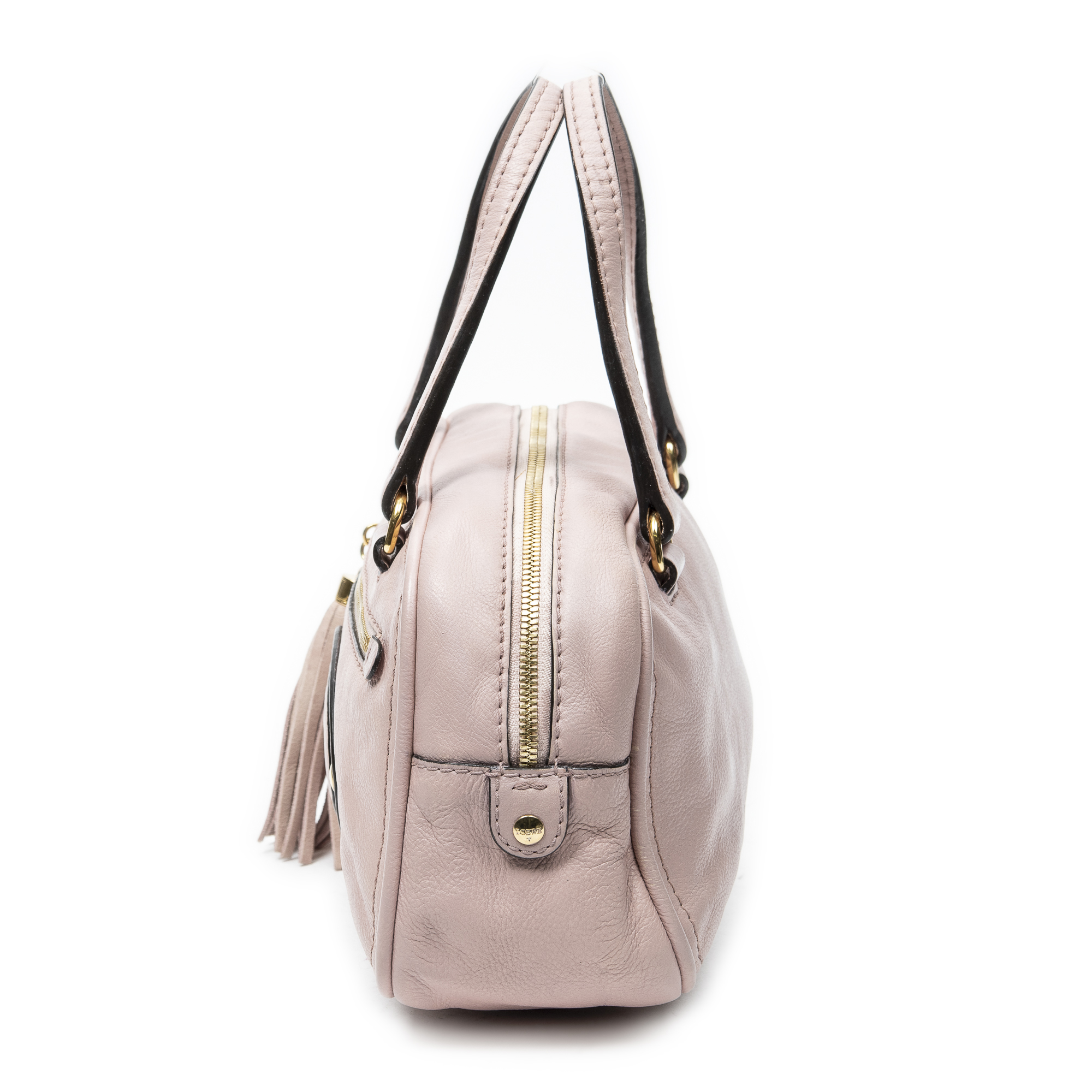 Loewe Handbag Small Anagram Tassel Boston in Pink Grained Calfskin Leather and Gold hardware. The product is in Excellent Condition (A).