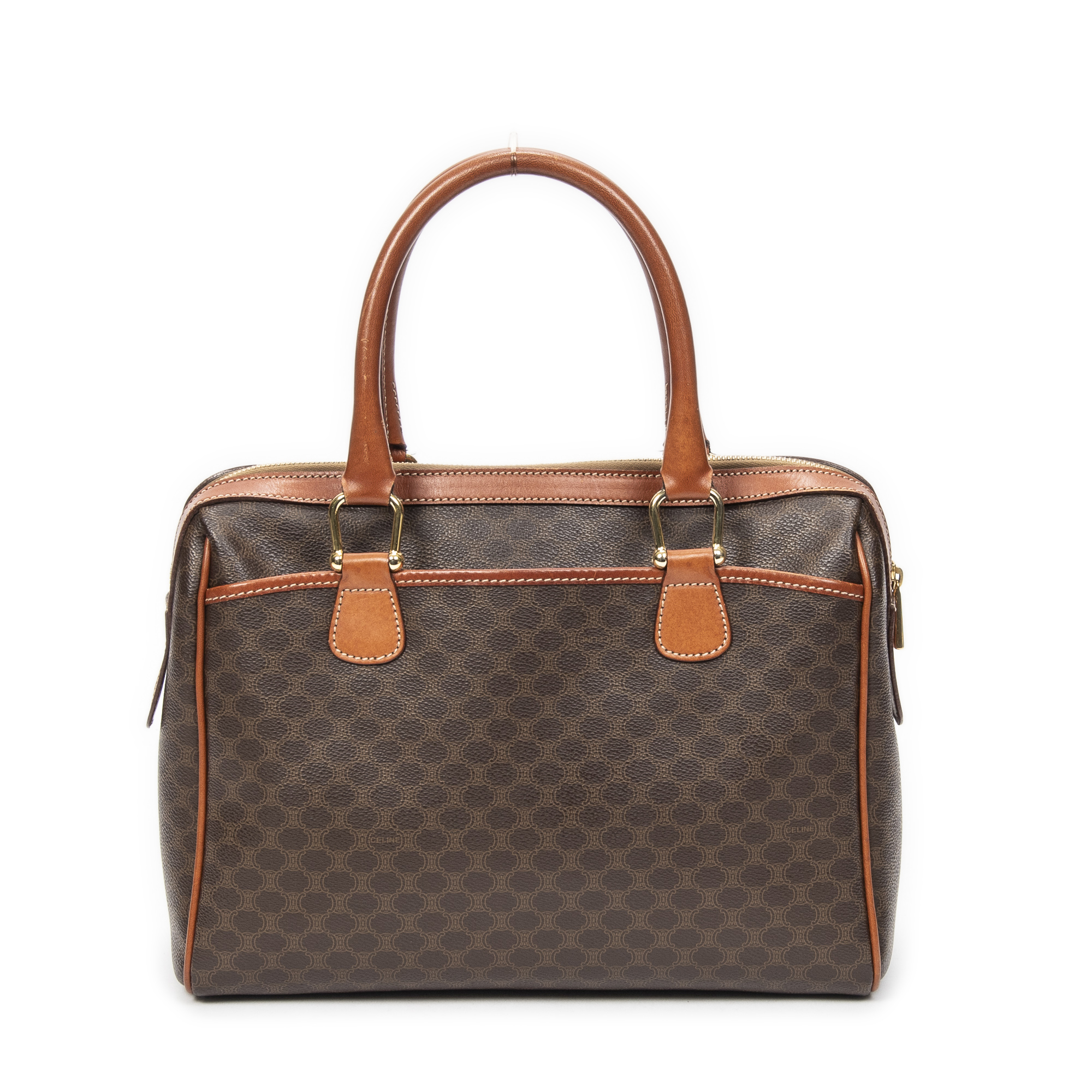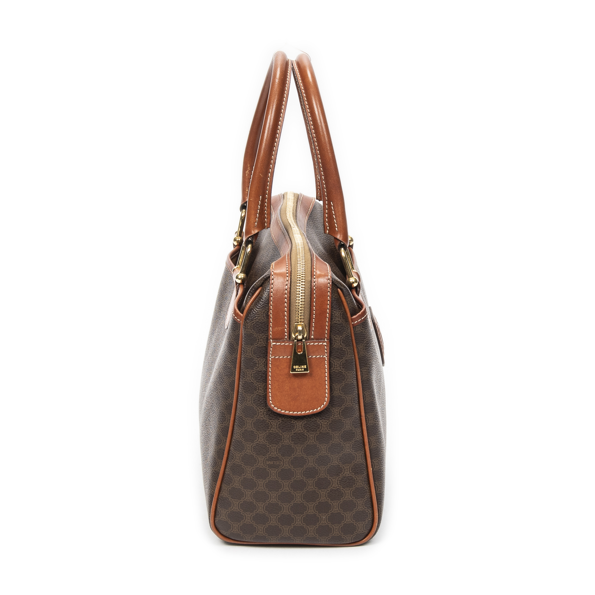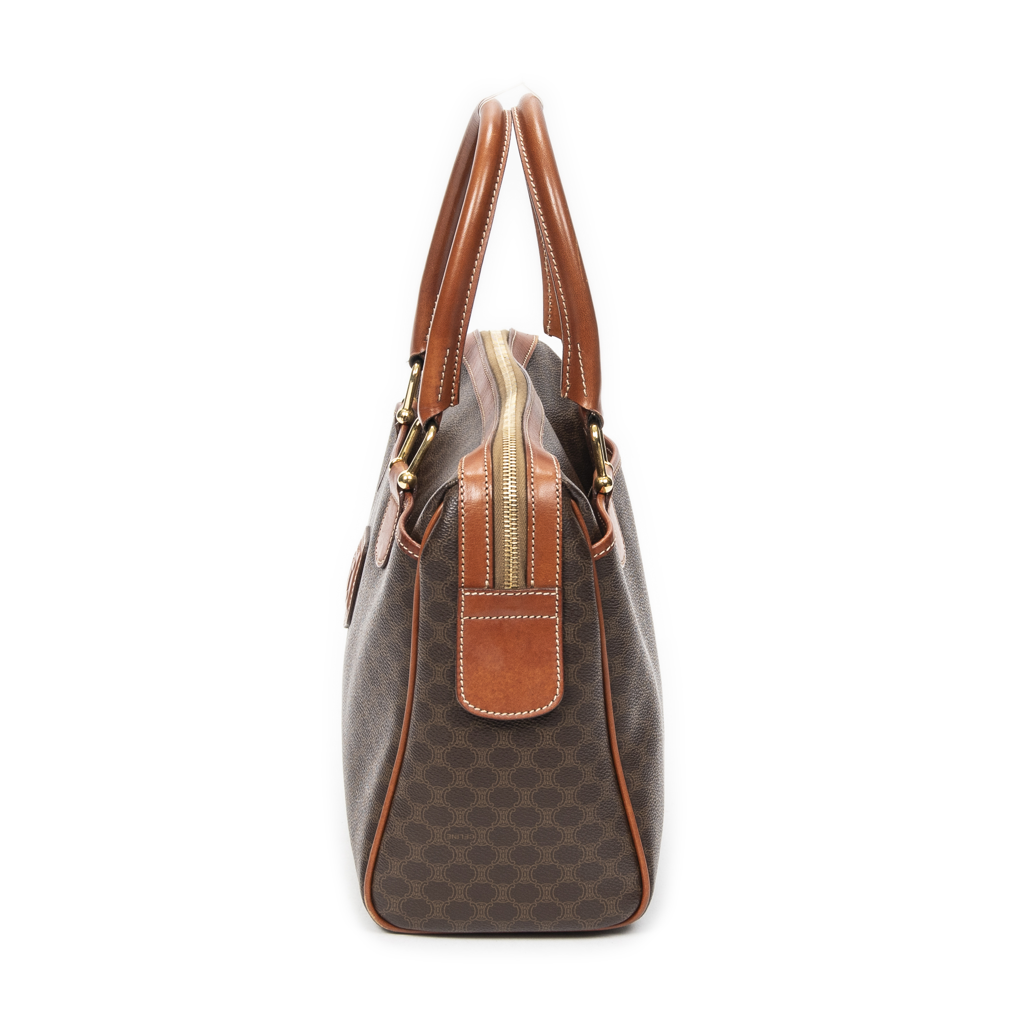 Celine Handbag Small Boston in Brown Macadam Coated Canvas and Gold hardware. The product is in Very Good Condition (AB).