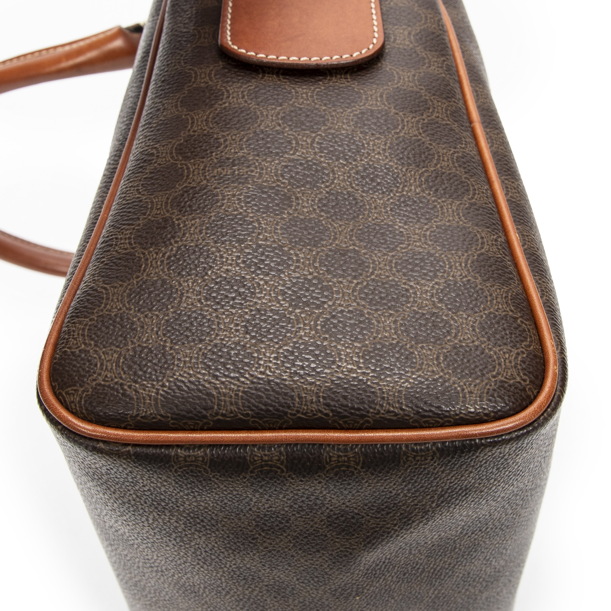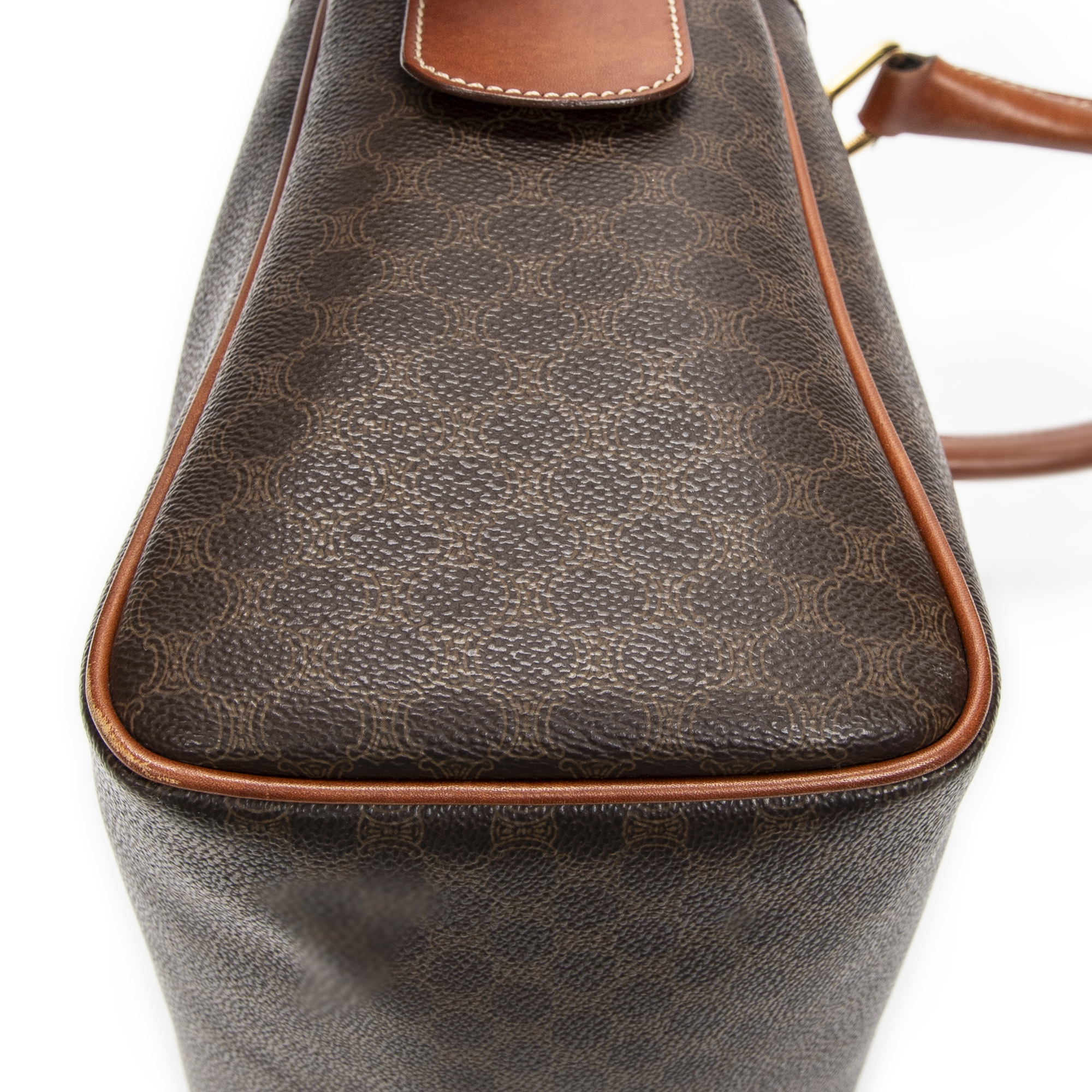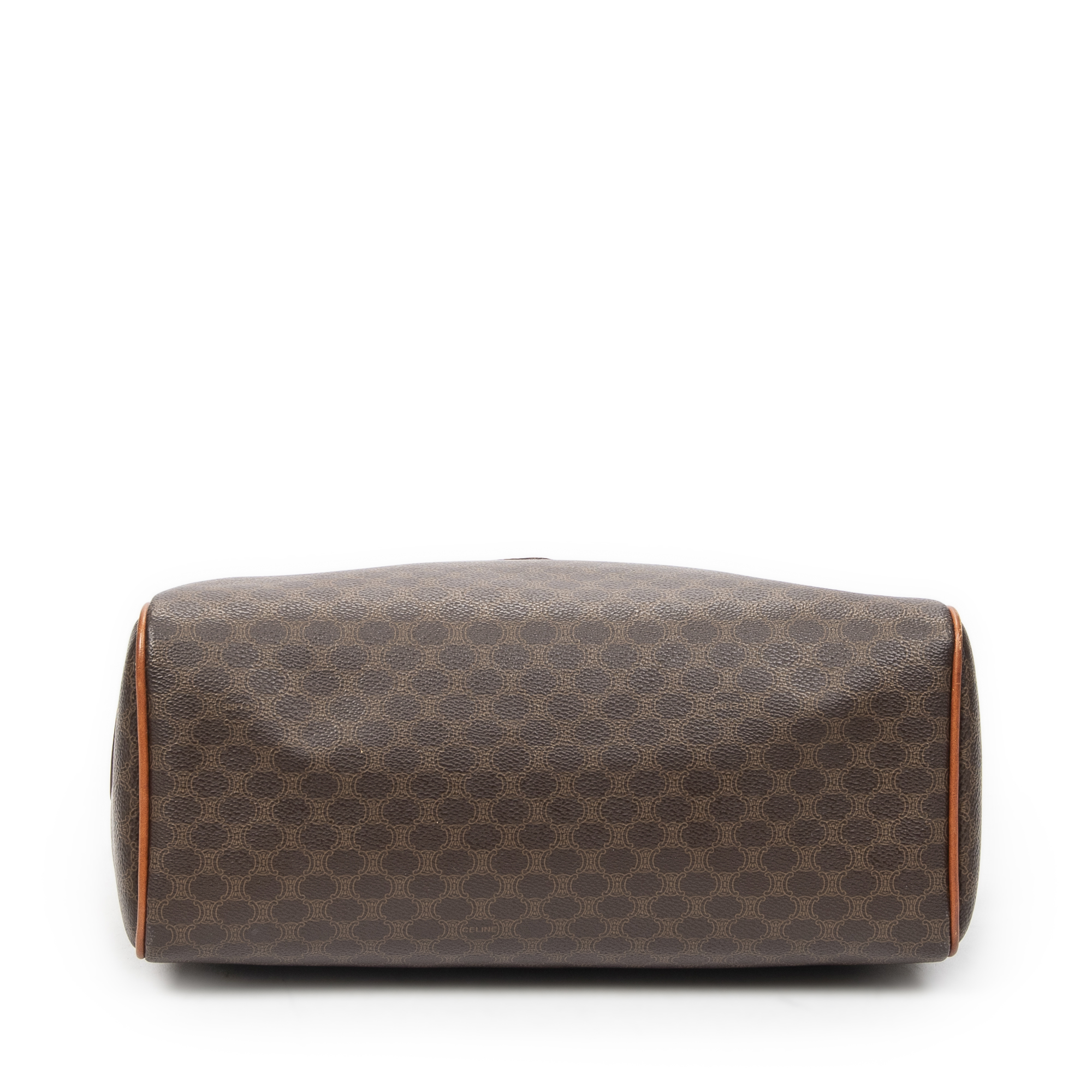 Celine Handbag Small Boston in Brown Macadam Coated Canvas and Gold hardware. The product is in Very Good Condition (AB).