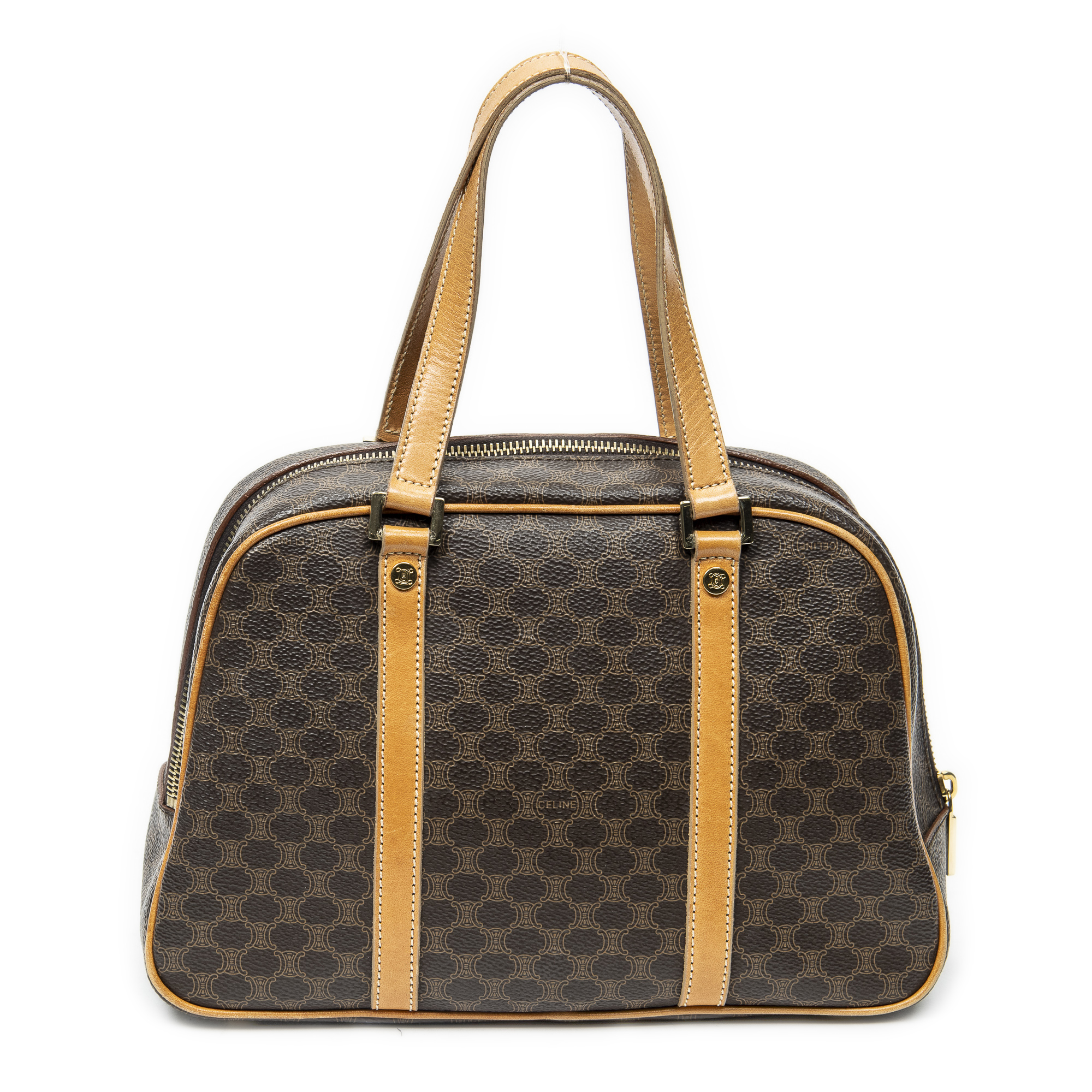 Celine Handbag Small Dome Top Handle in Beige/Brown Macadam Coated Canvas and Gold hardware. The product is in Very Good Condition (AB).