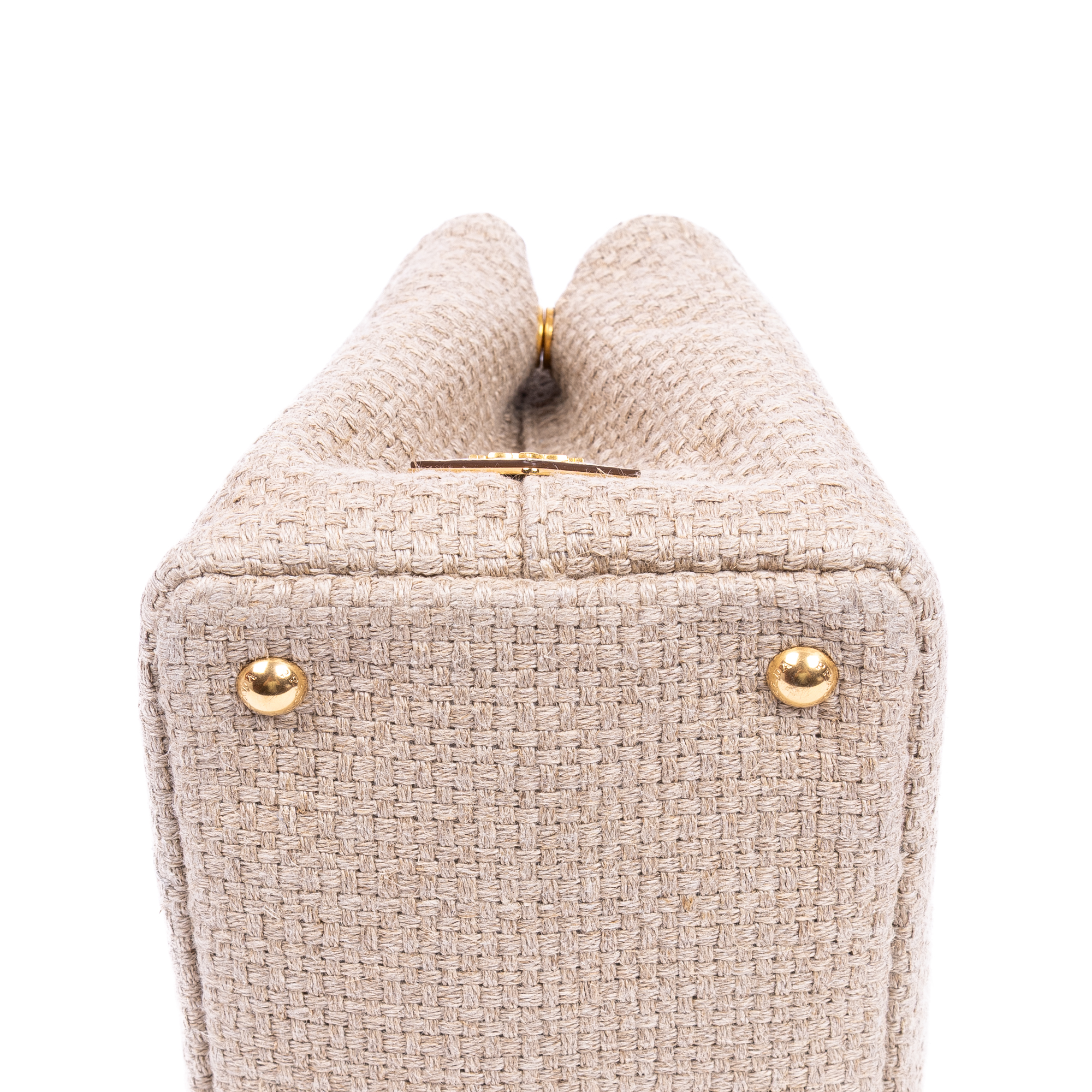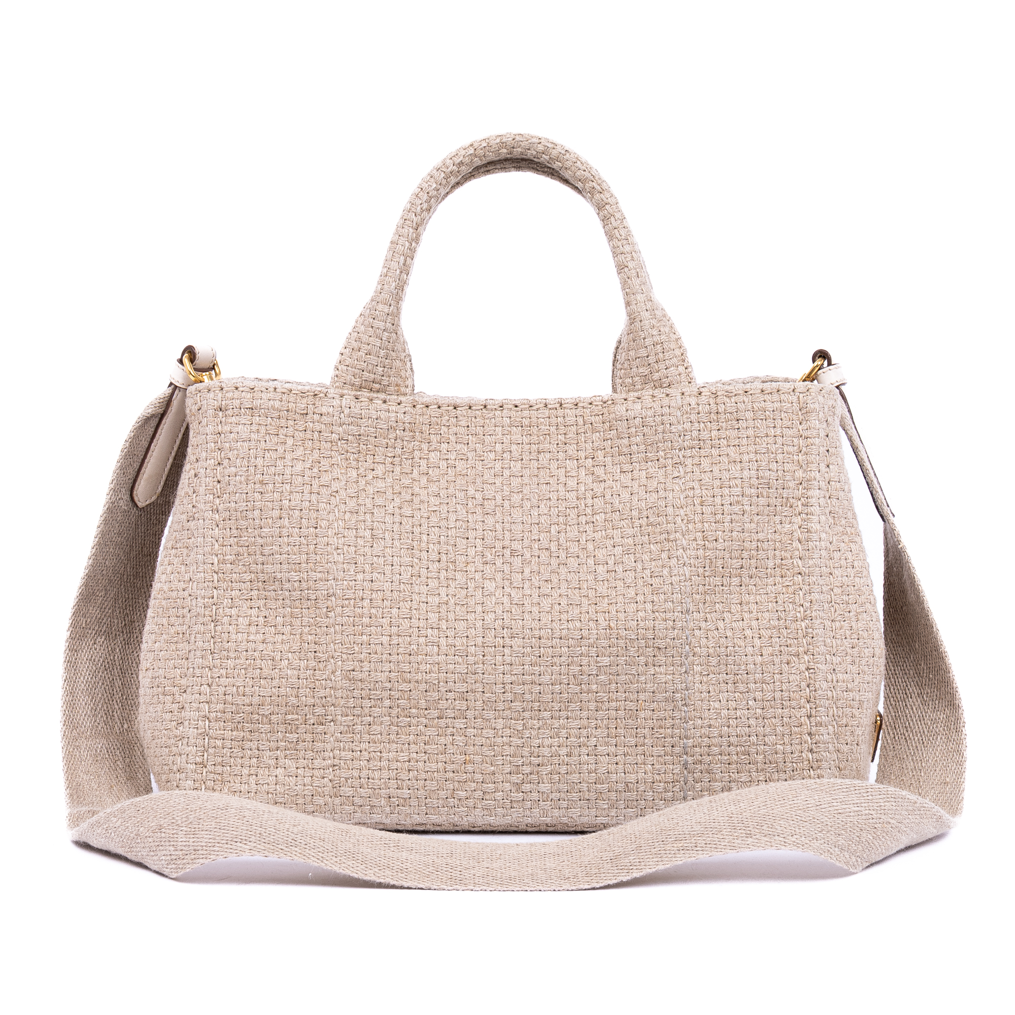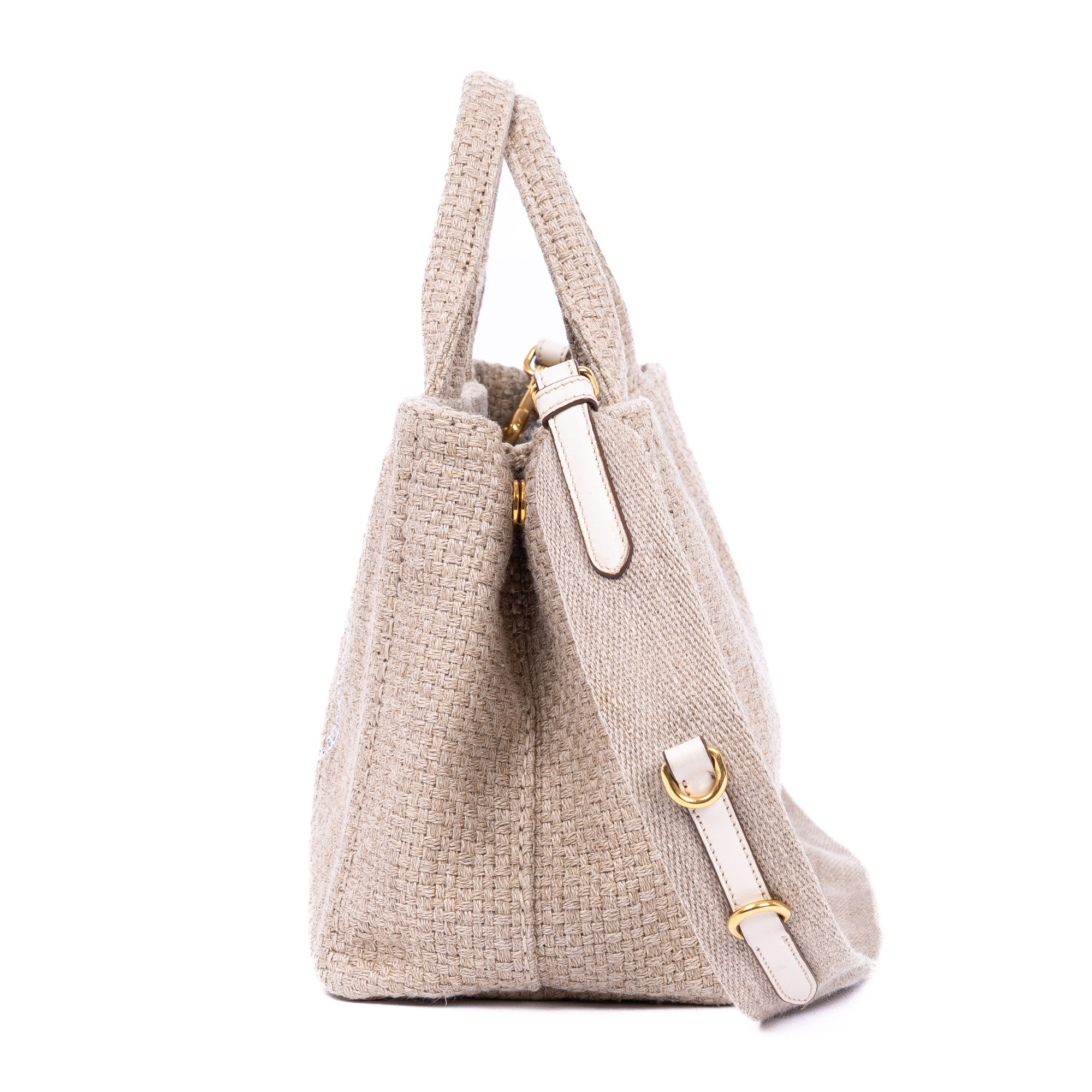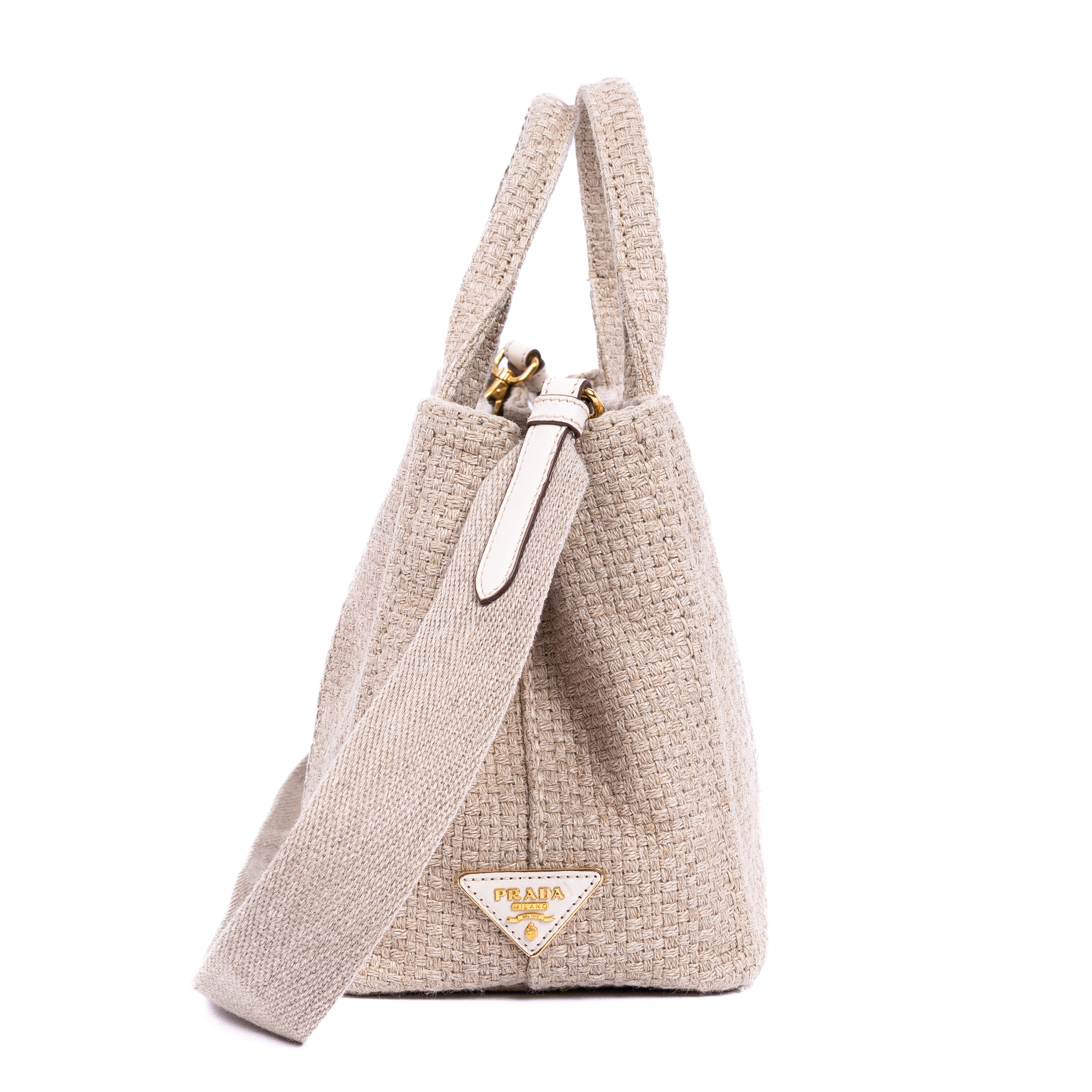 Prada Handbag Straw Linen Canapa Tote in Beige Straw Stampata Canvas and Gold hardware. The product is in Perfect Condition (AA).