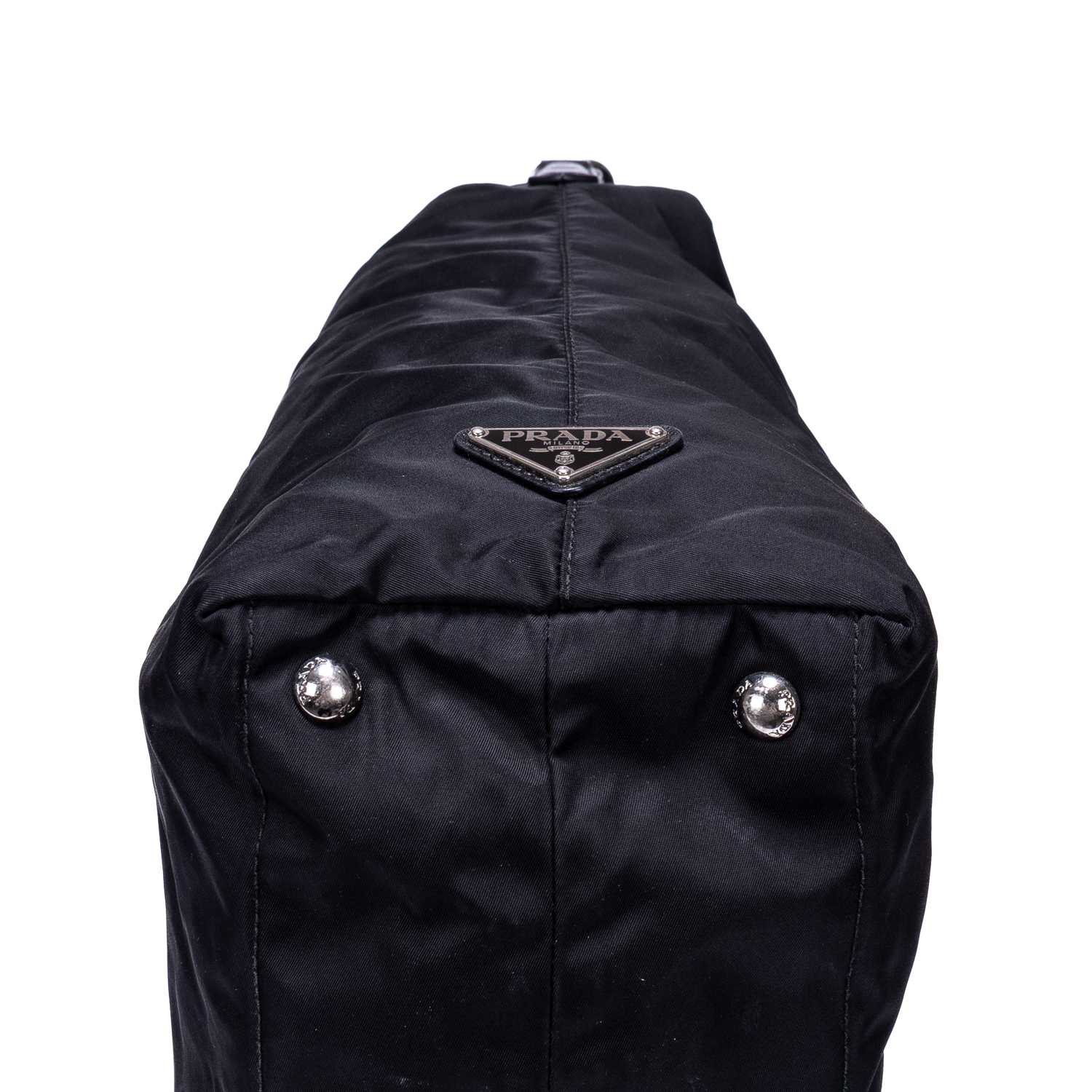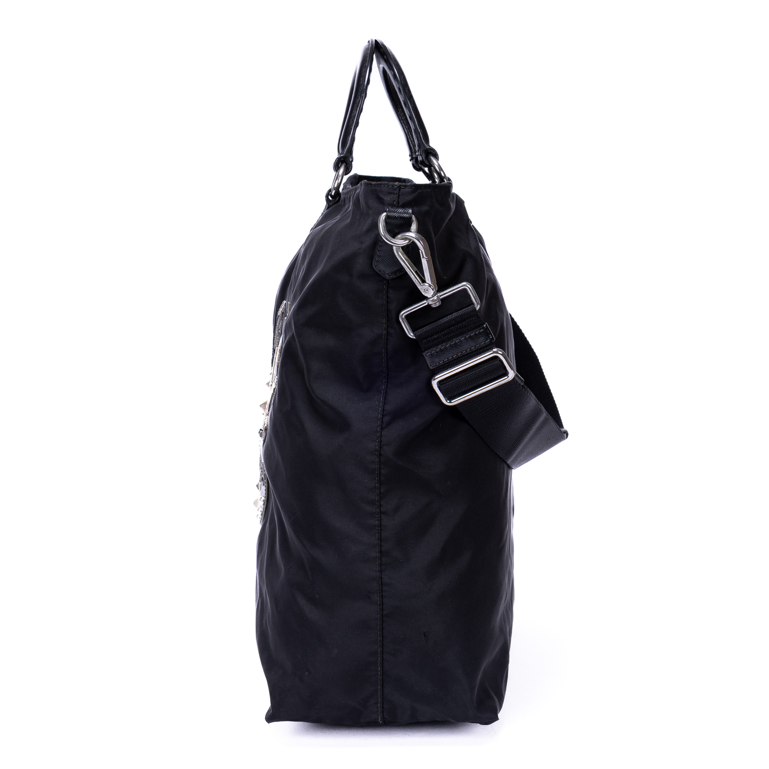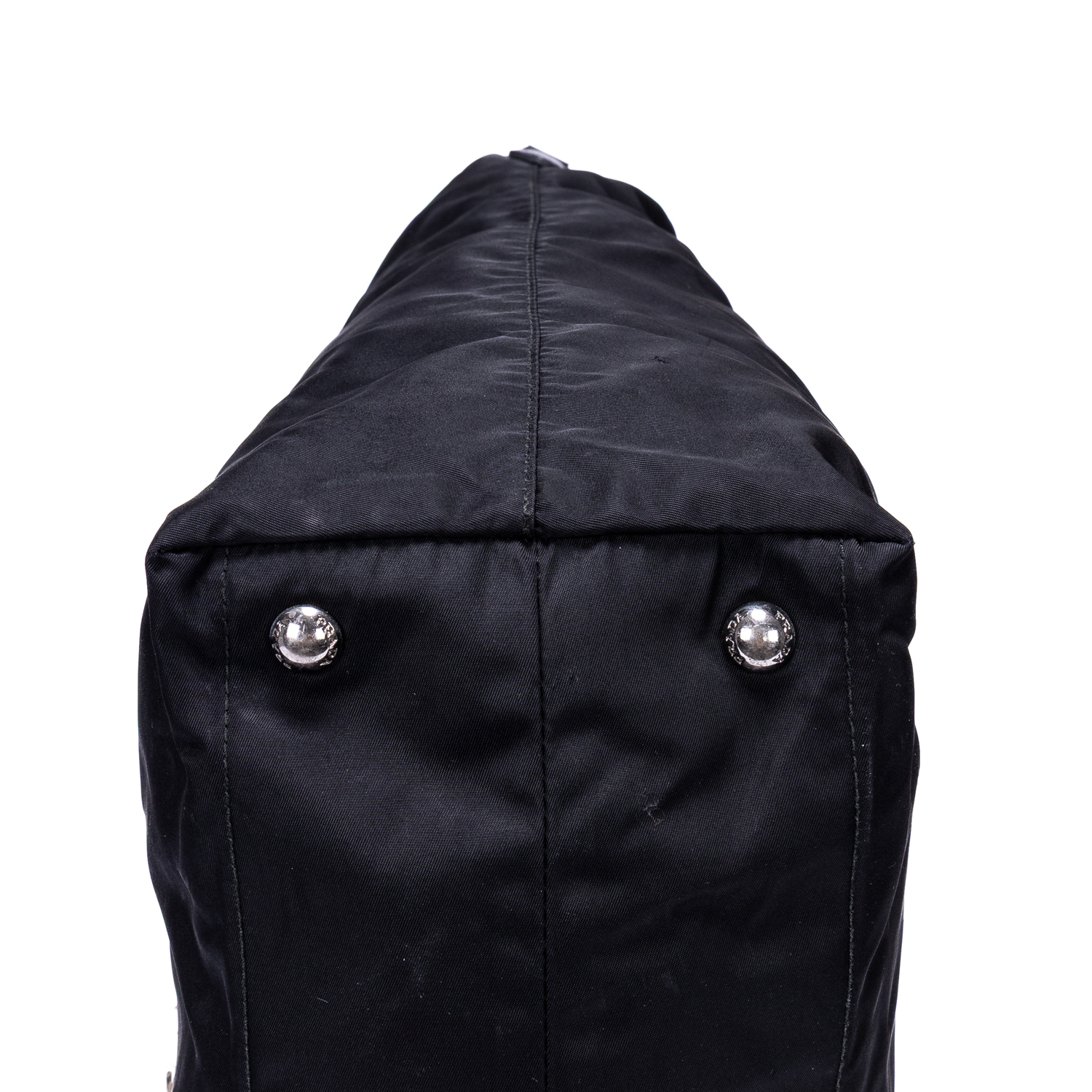 Prada Handbag Stud Skull Logo Tote in Black Nylon Canvas and Silver hardware. The product is in Very Good Condition (AB).