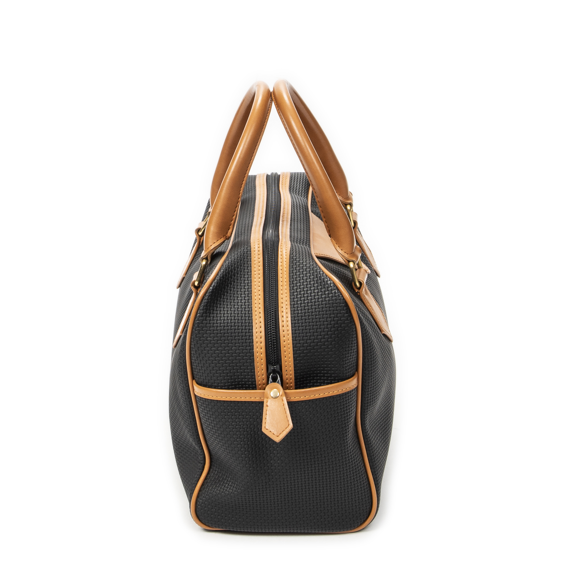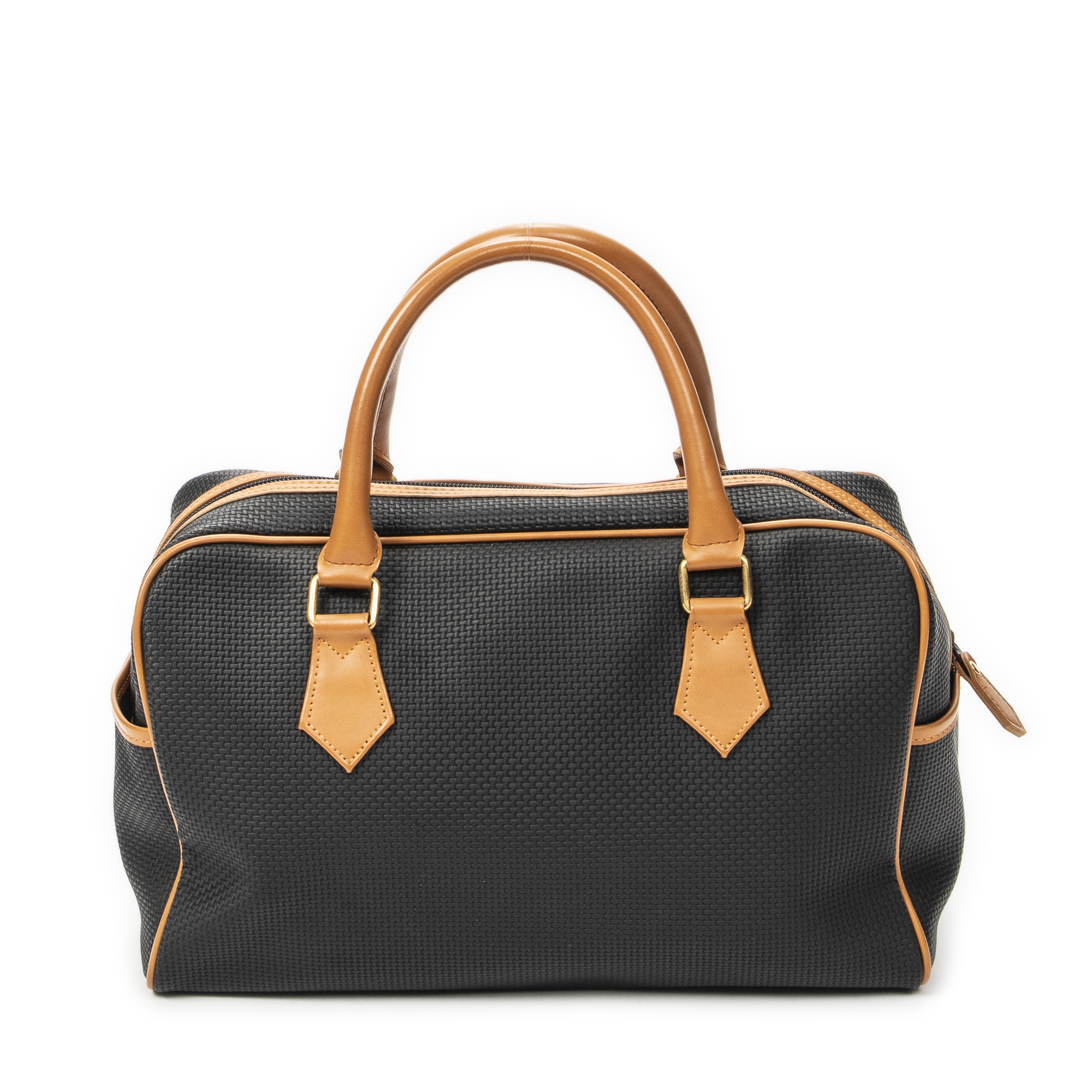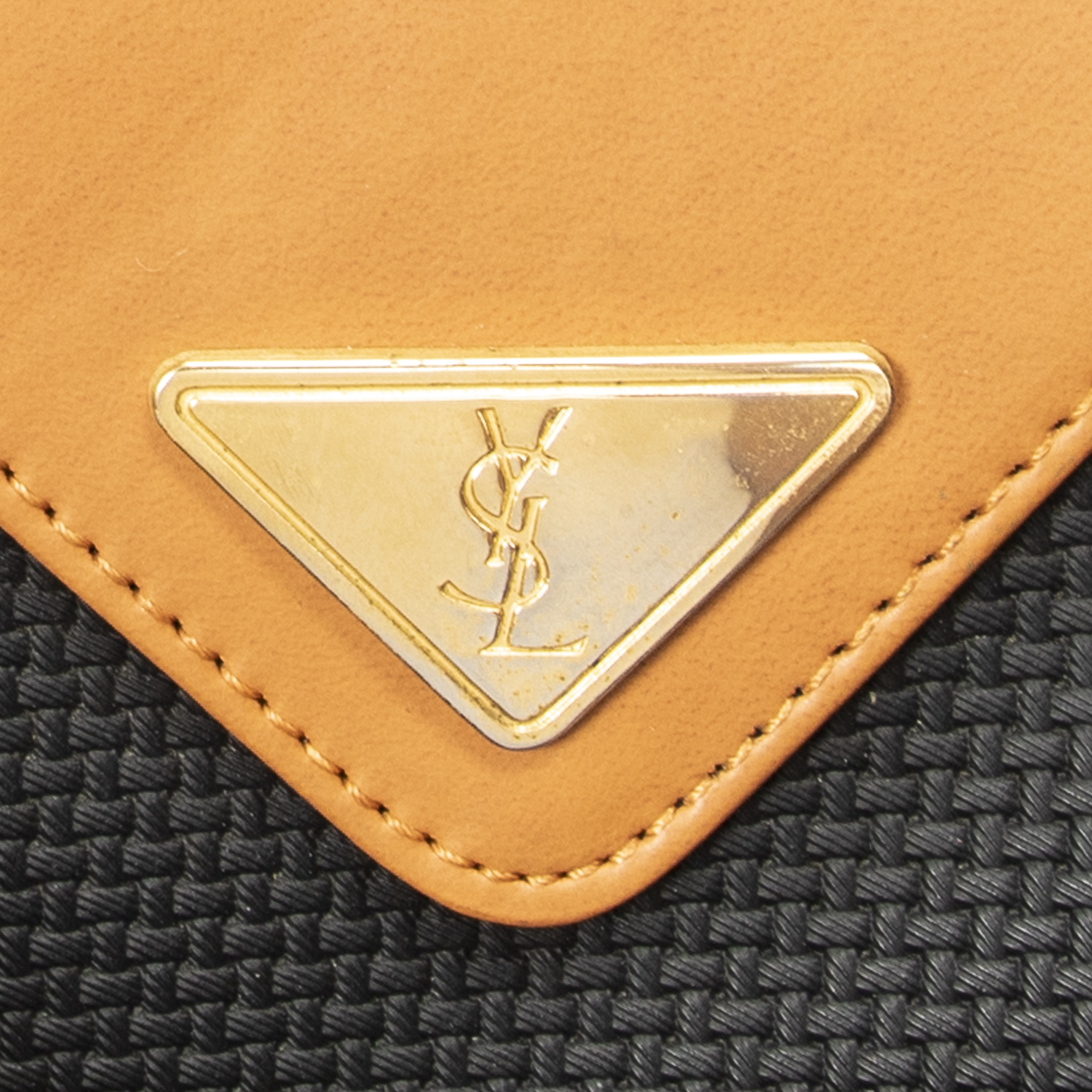 Yves Saint Laurent Handbag Vintage Side Pocket Boston in Black/Tan Woven Coated Canvas and Gold hardware. The product is in Excellent Condition (A).