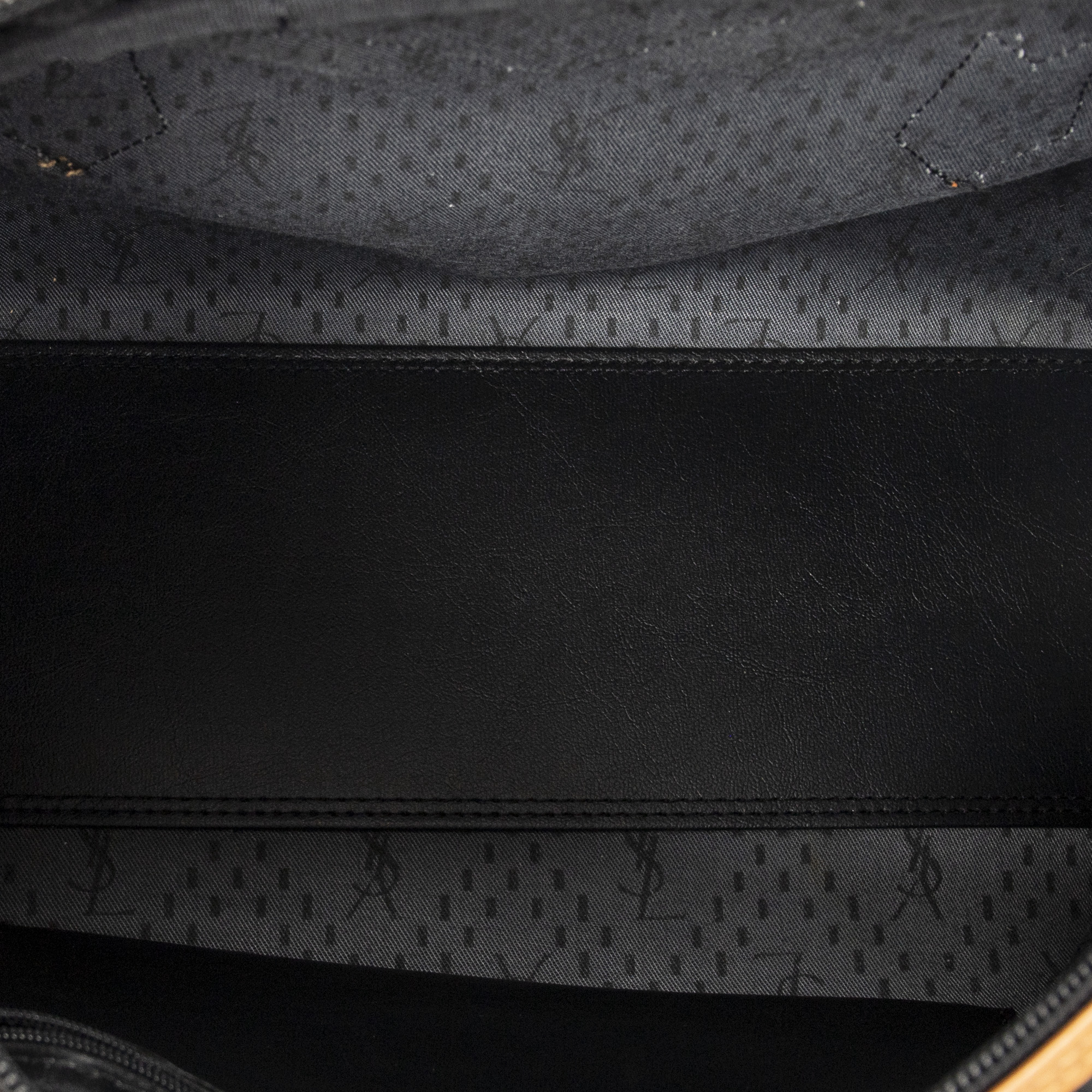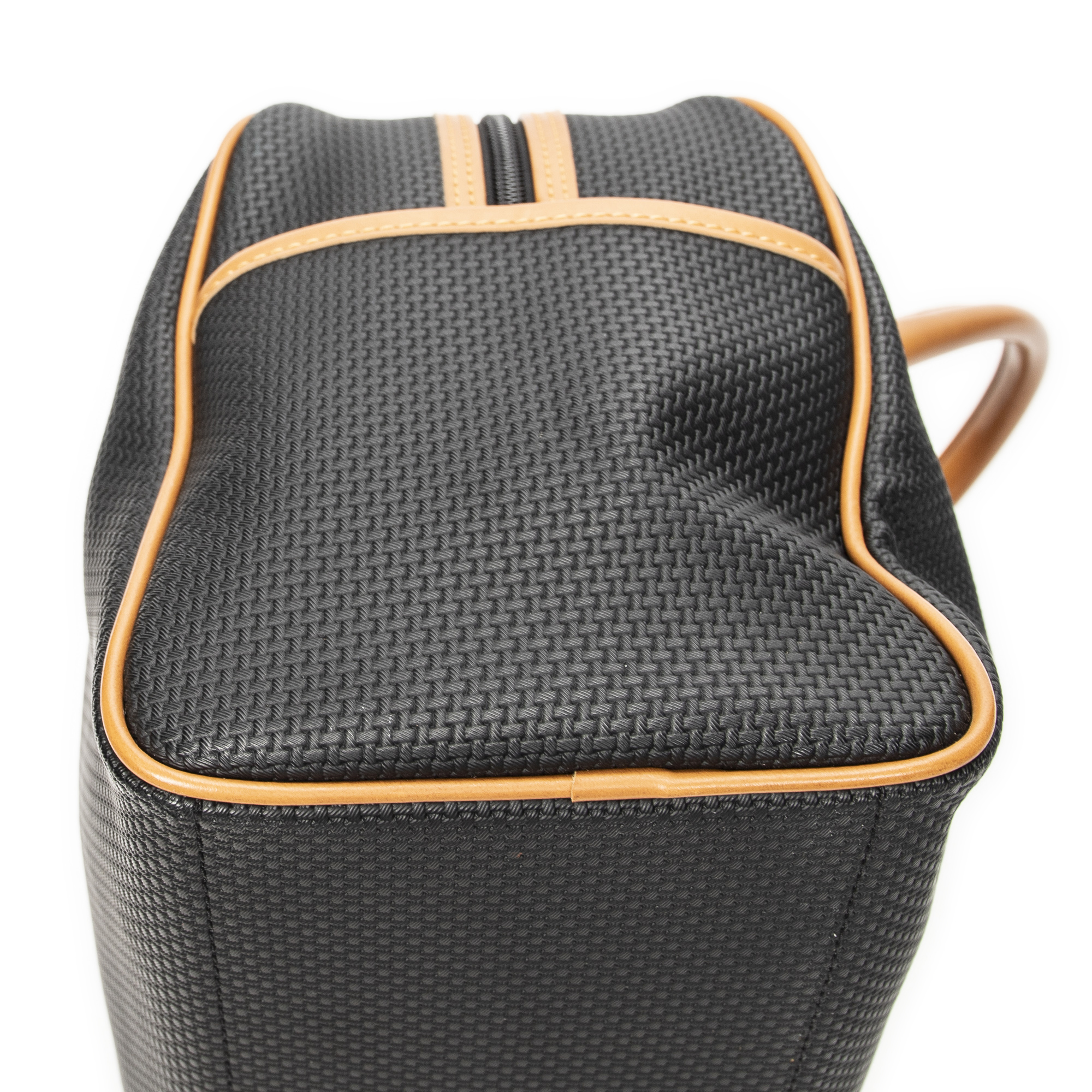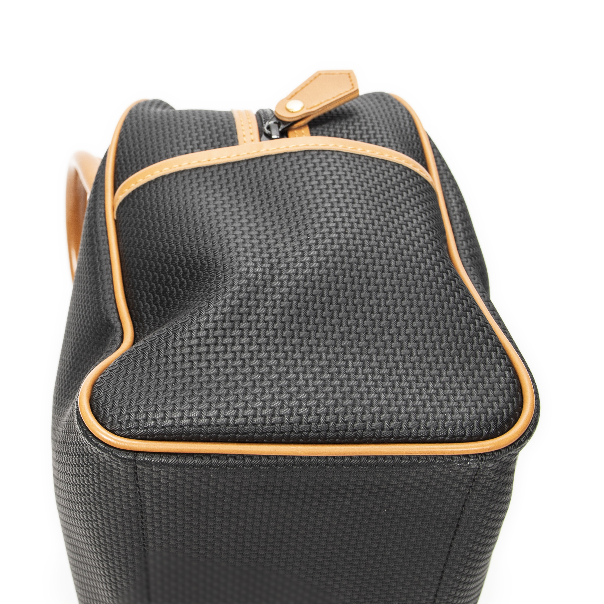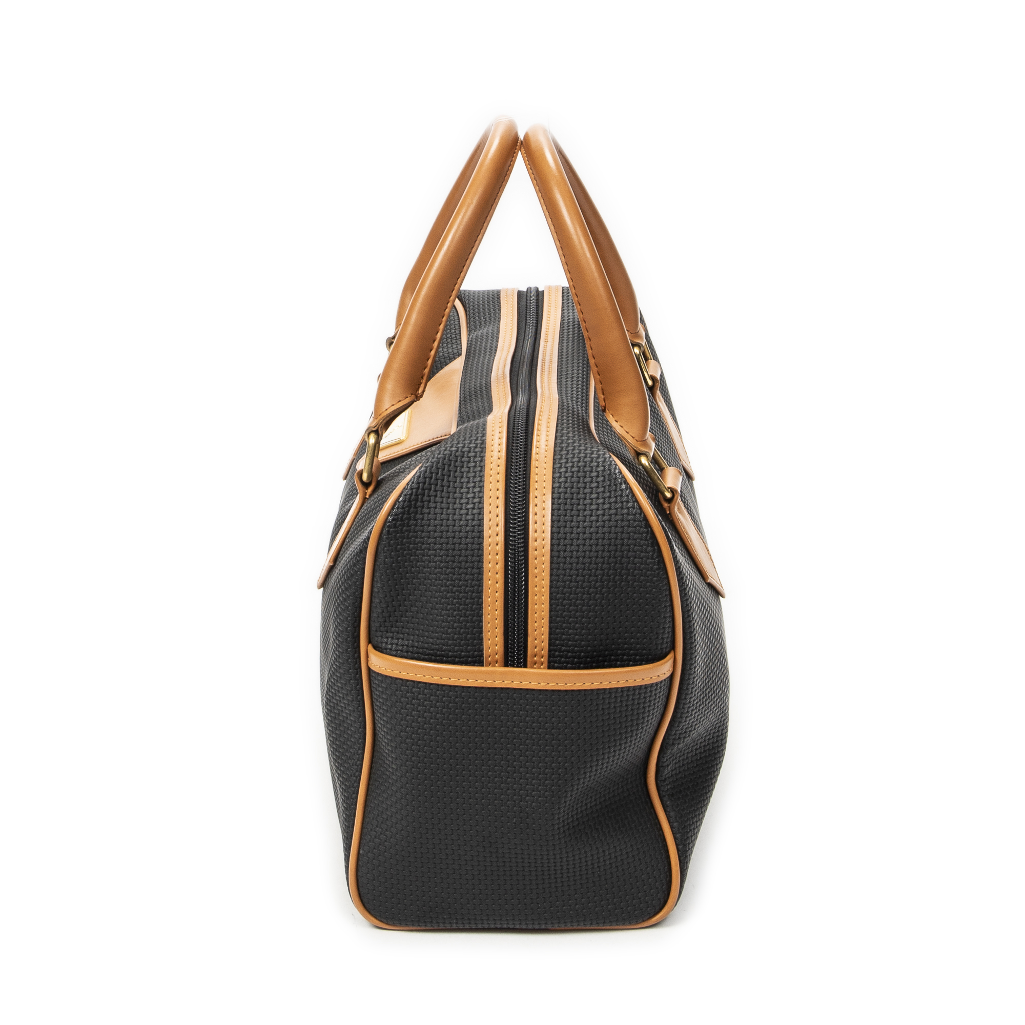 Yves Saint Laurent Handbag Vintage Side Pocket Boston in Black/Tan Woven Coated Canvas and Gold hardware. The product is in Excellent Condition (A).