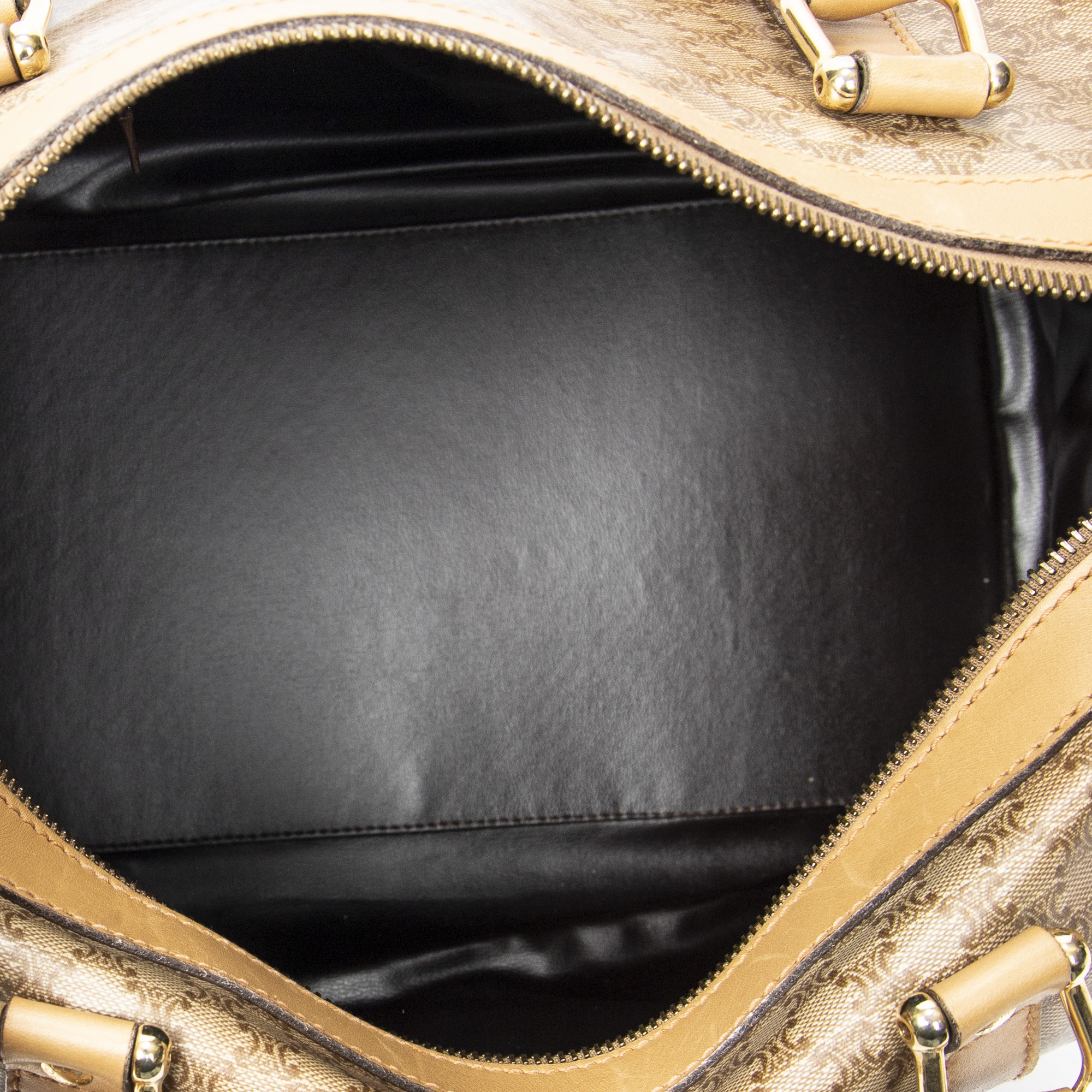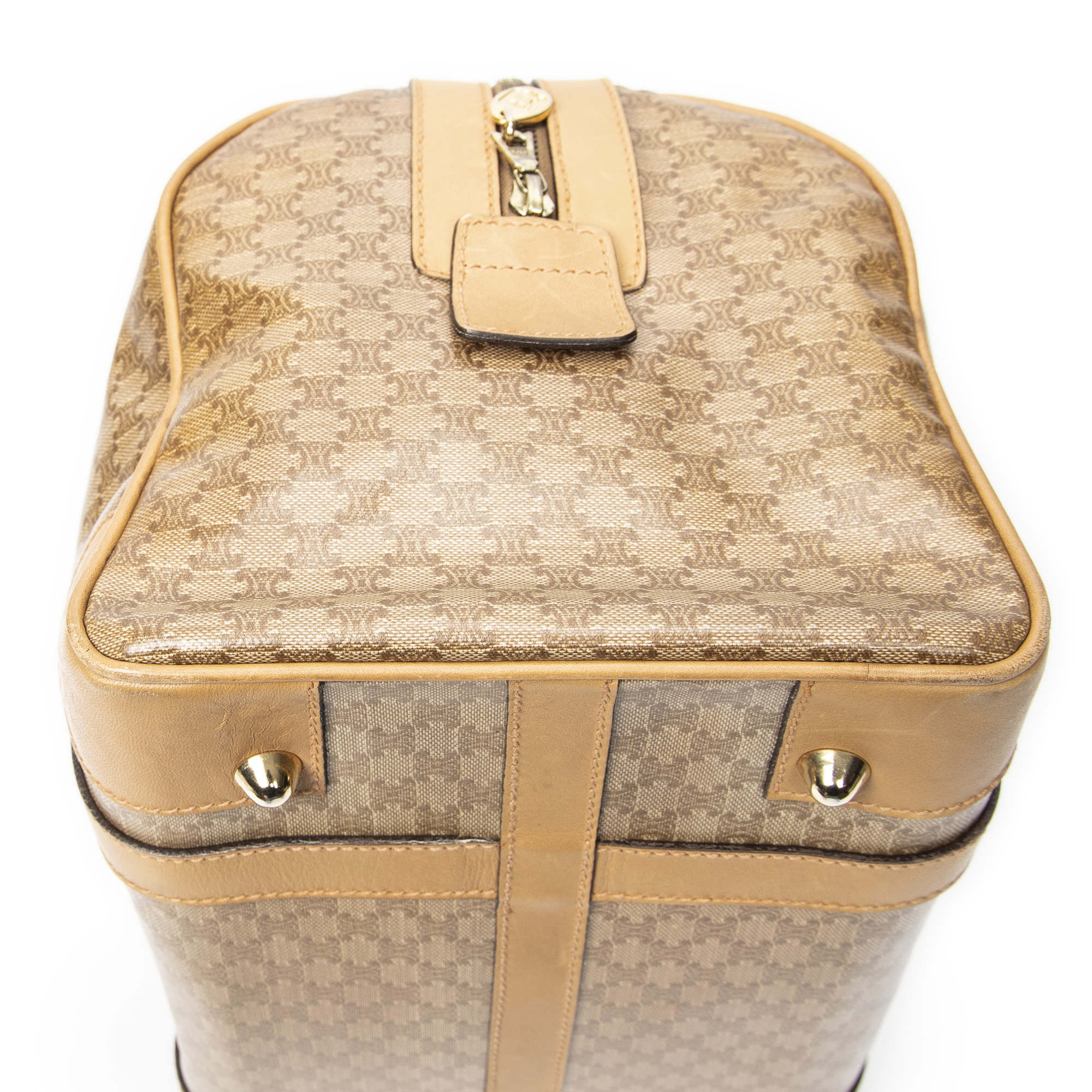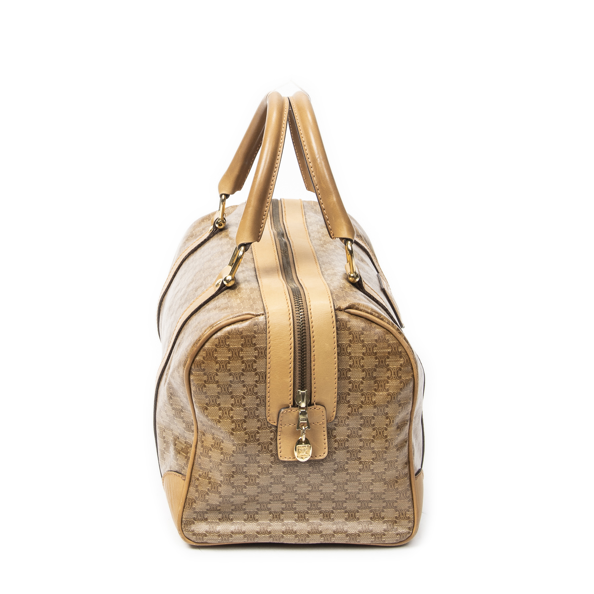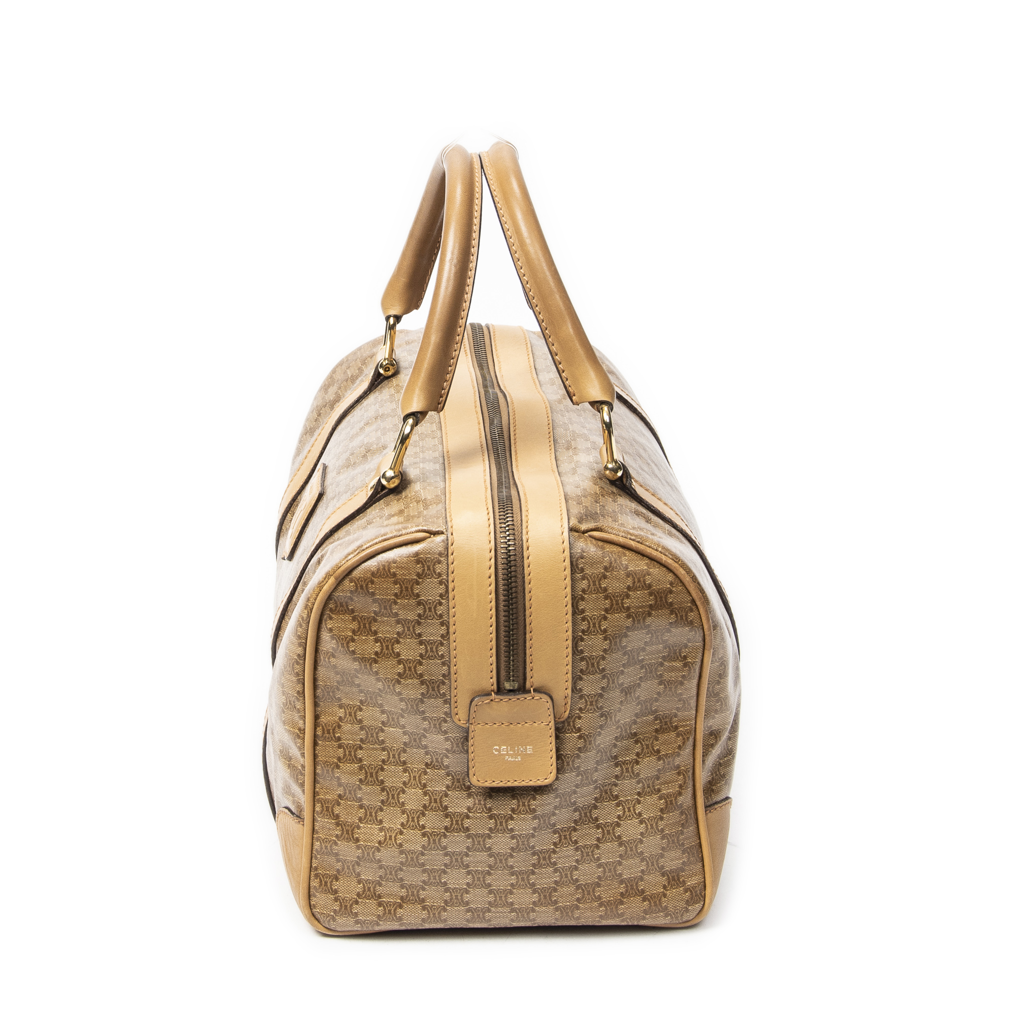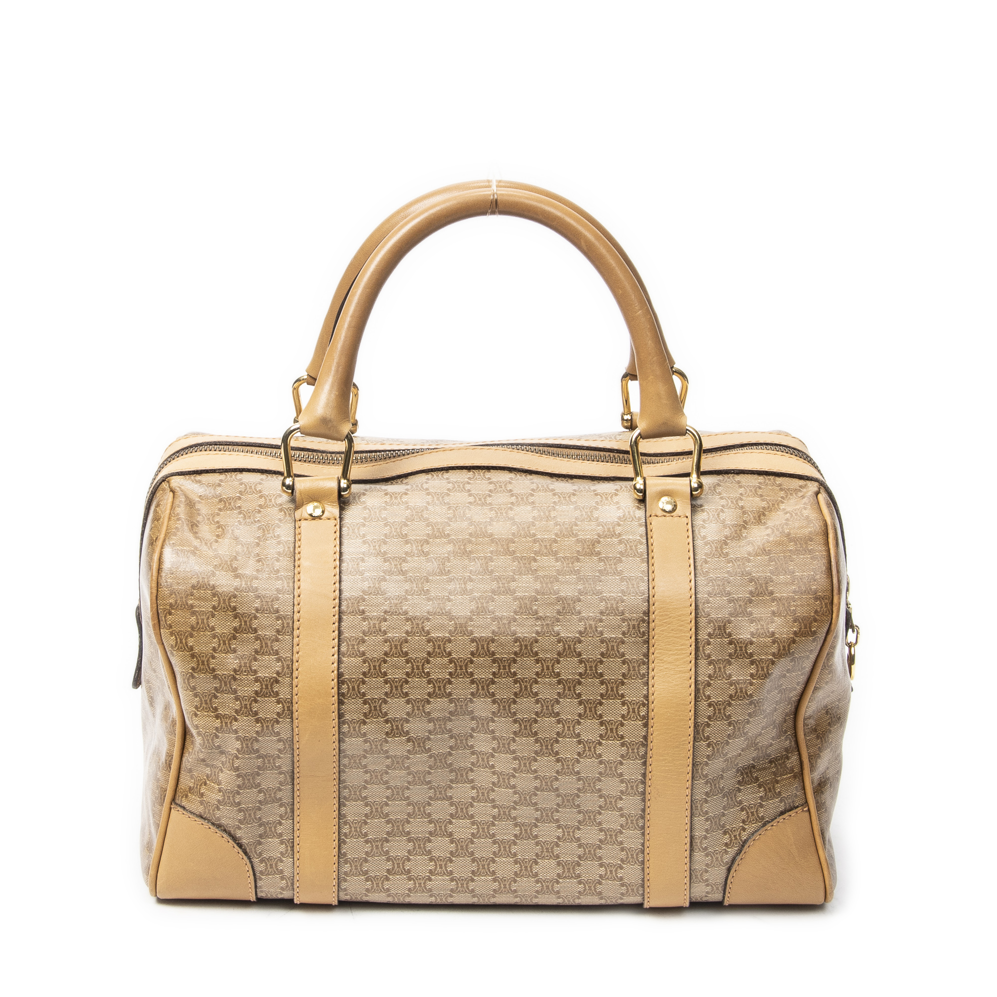 Celine Handbag Vintage Small Boston in Beige Macadam Coated Canvas and Gold hardware. The product is in Very Good Condition (AB).