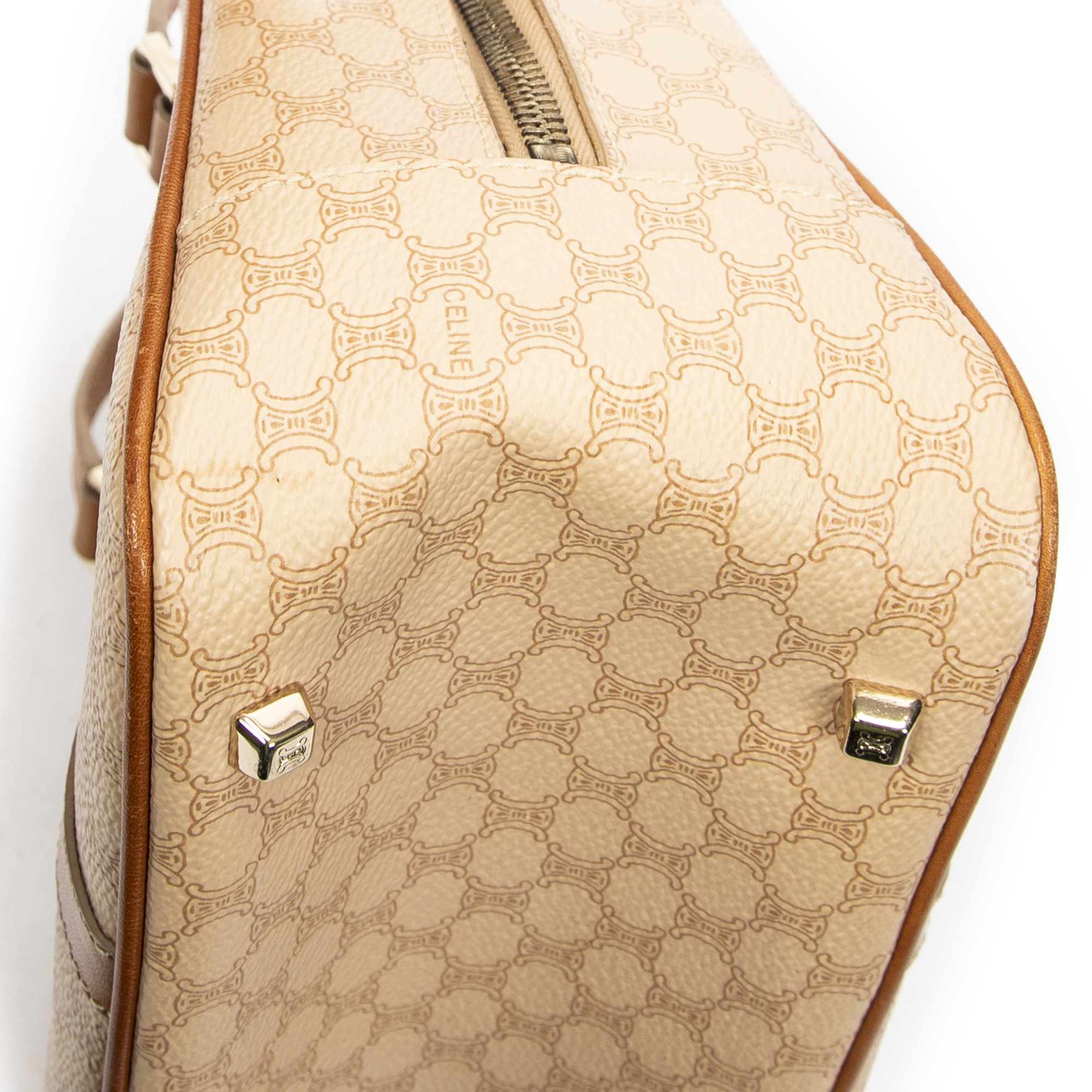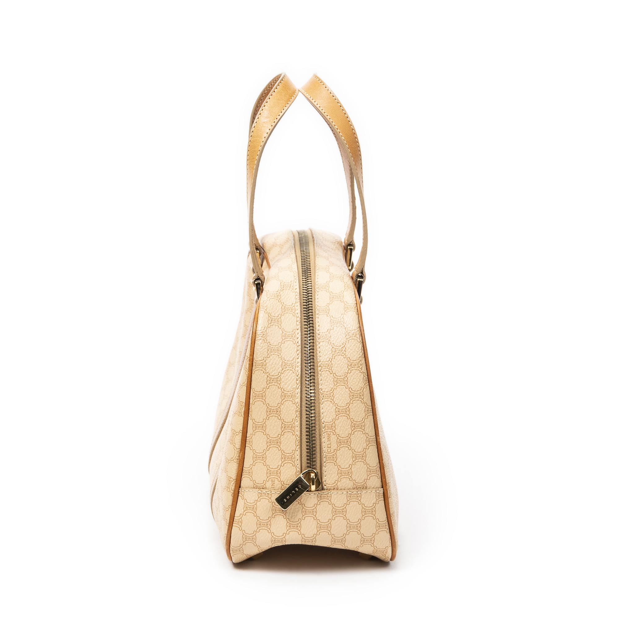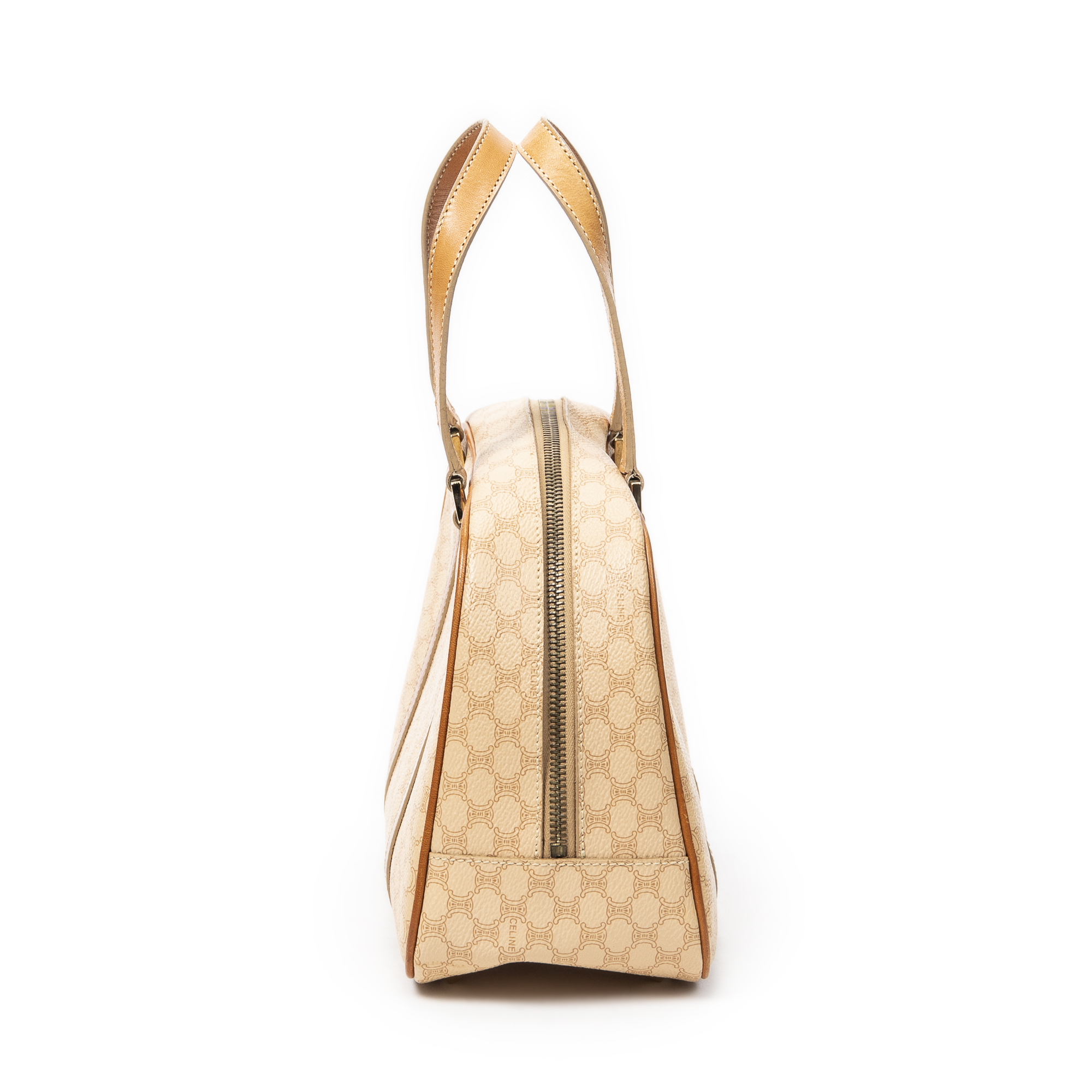 Celine Handbag Vintage Small Bowler Tote in Beige Macadam Coated Canvas and Gold hardware. The product is in Very Good Condition (AB).