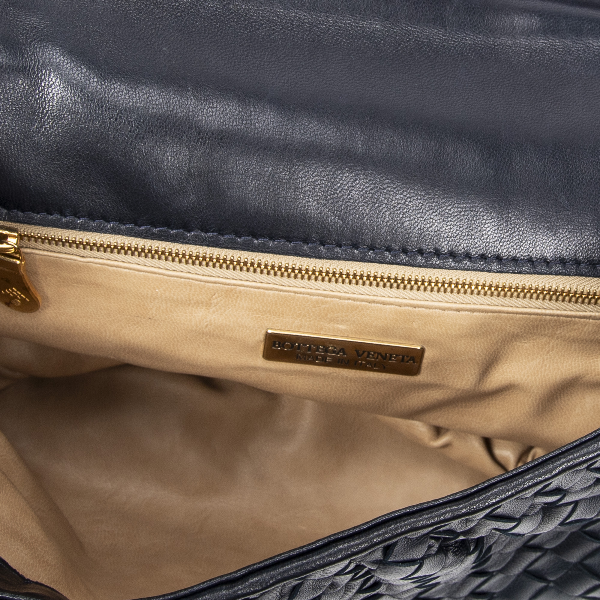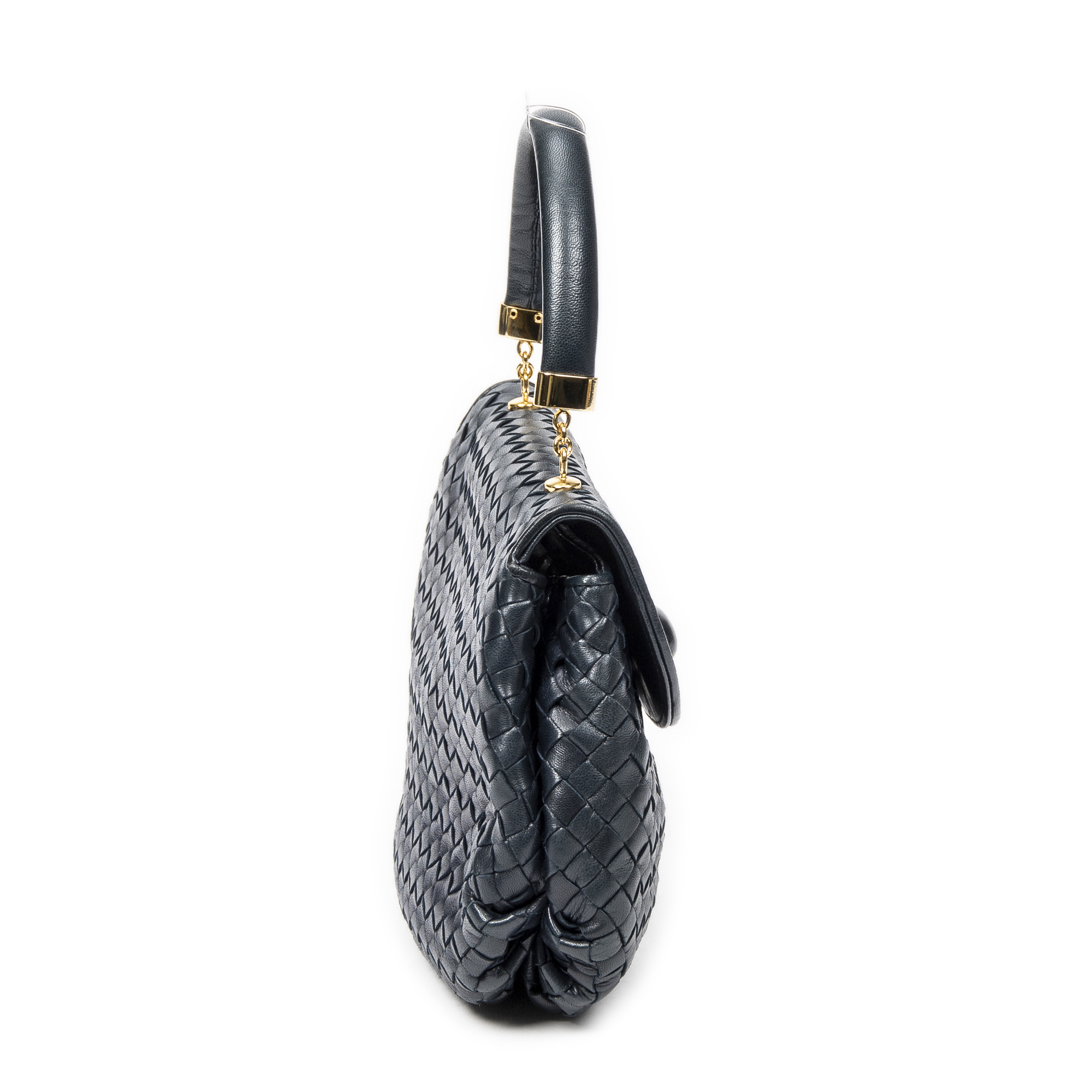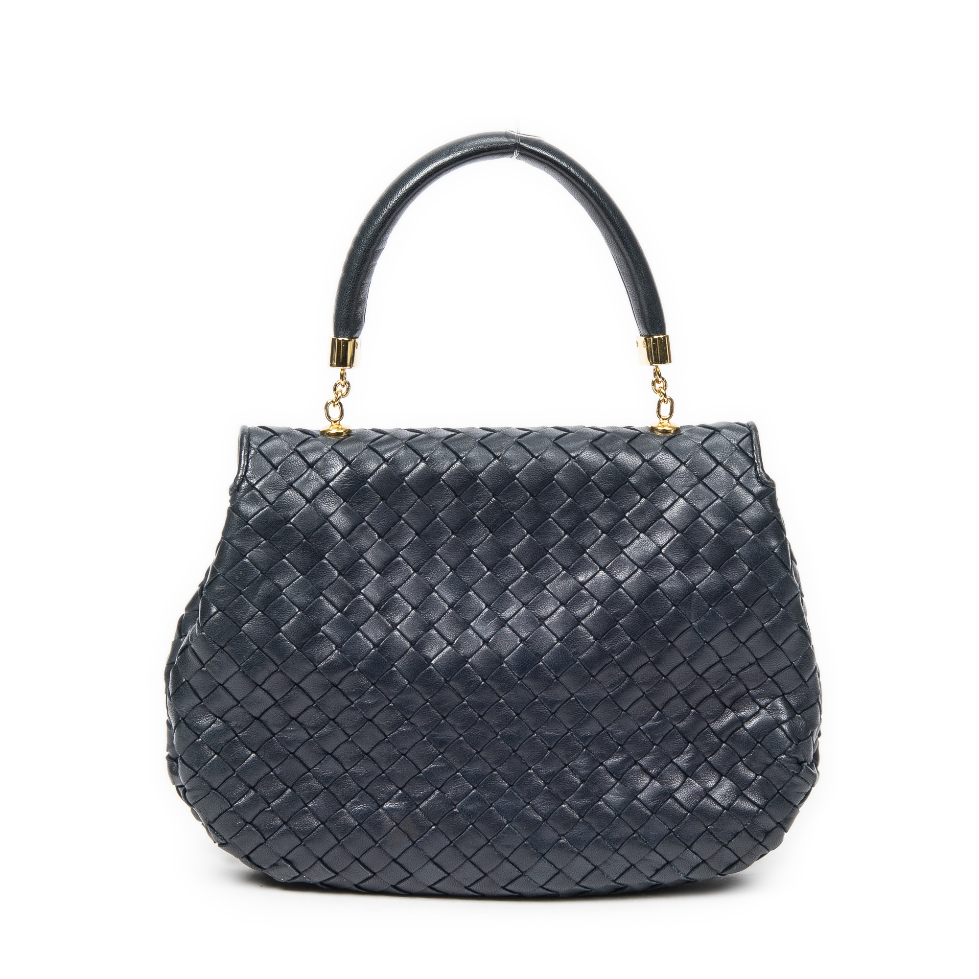 Bottega Veneta Handbag Vintage Turn Lock Flap Top Handle in Navy Intrecciato Leather and Gold hardware. The product is in Excellent Condition (A).