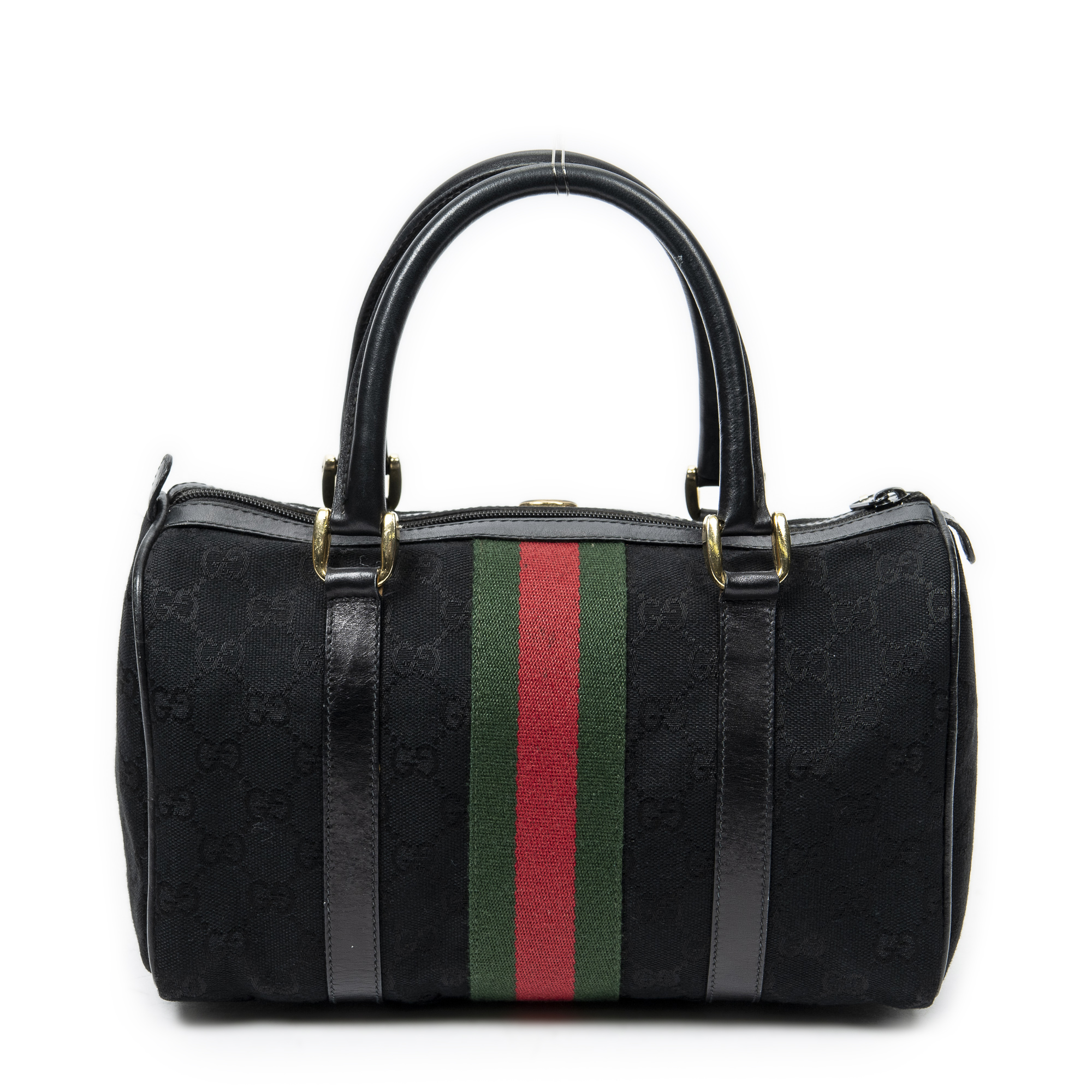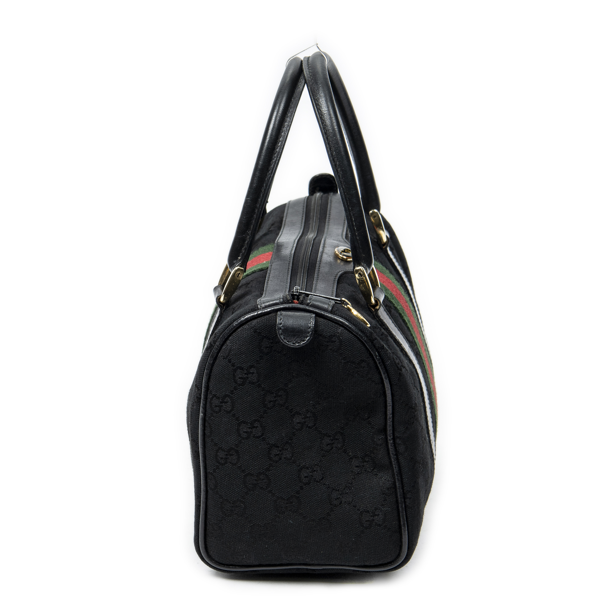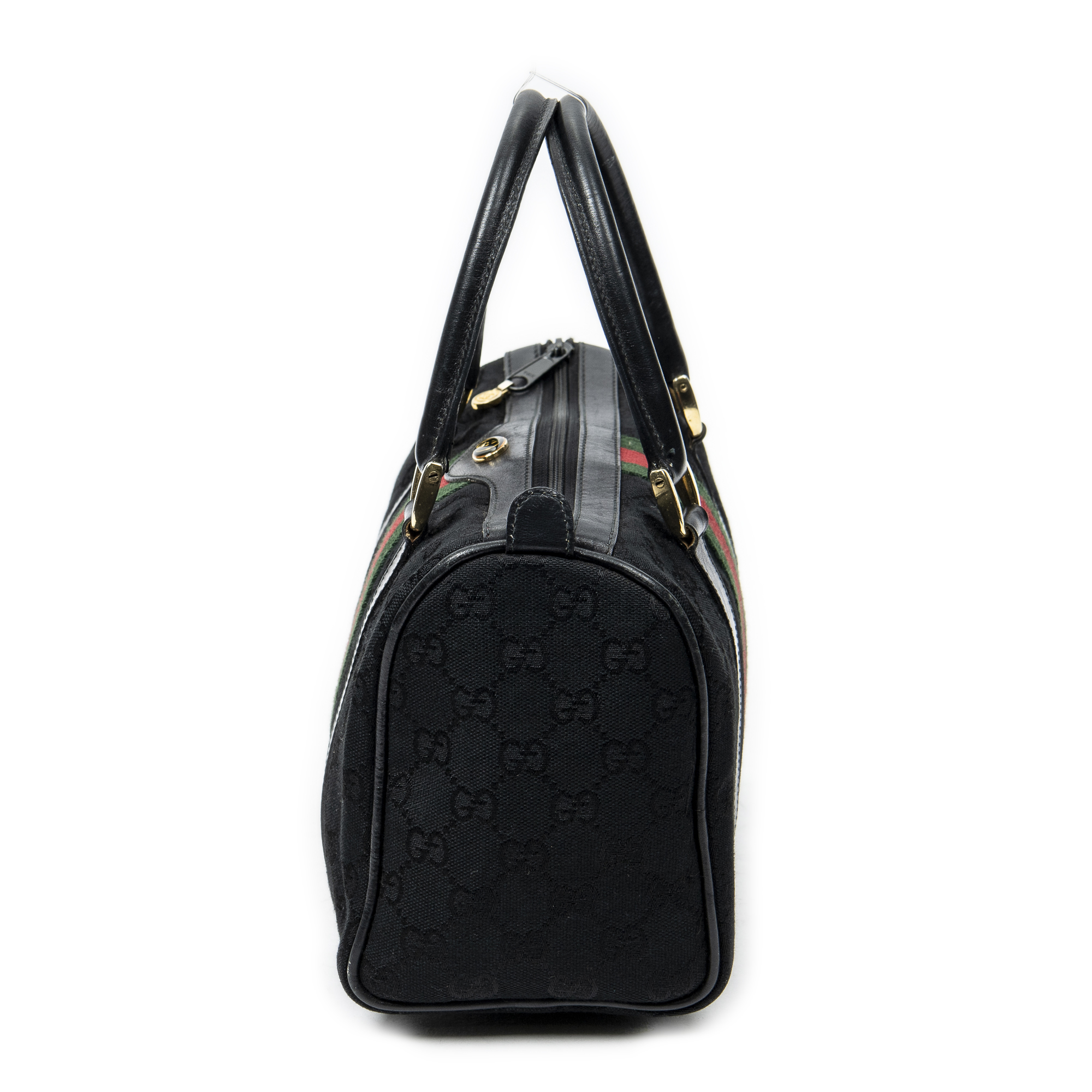 Gucci Handbag Web Accessory Collection Boston in Black Monogrammed Canvas and Gold hardware. The product is in Very Good Condition (AB).