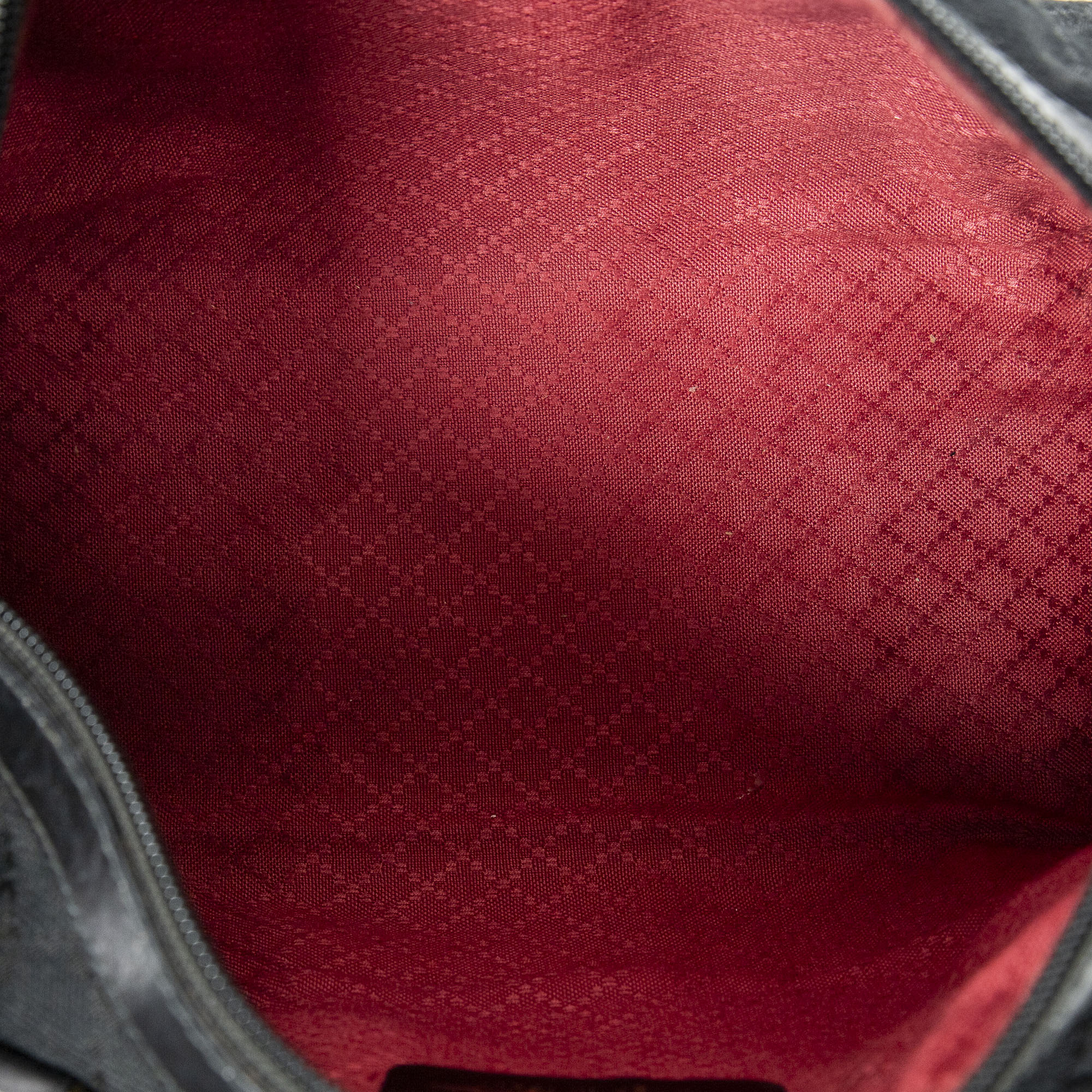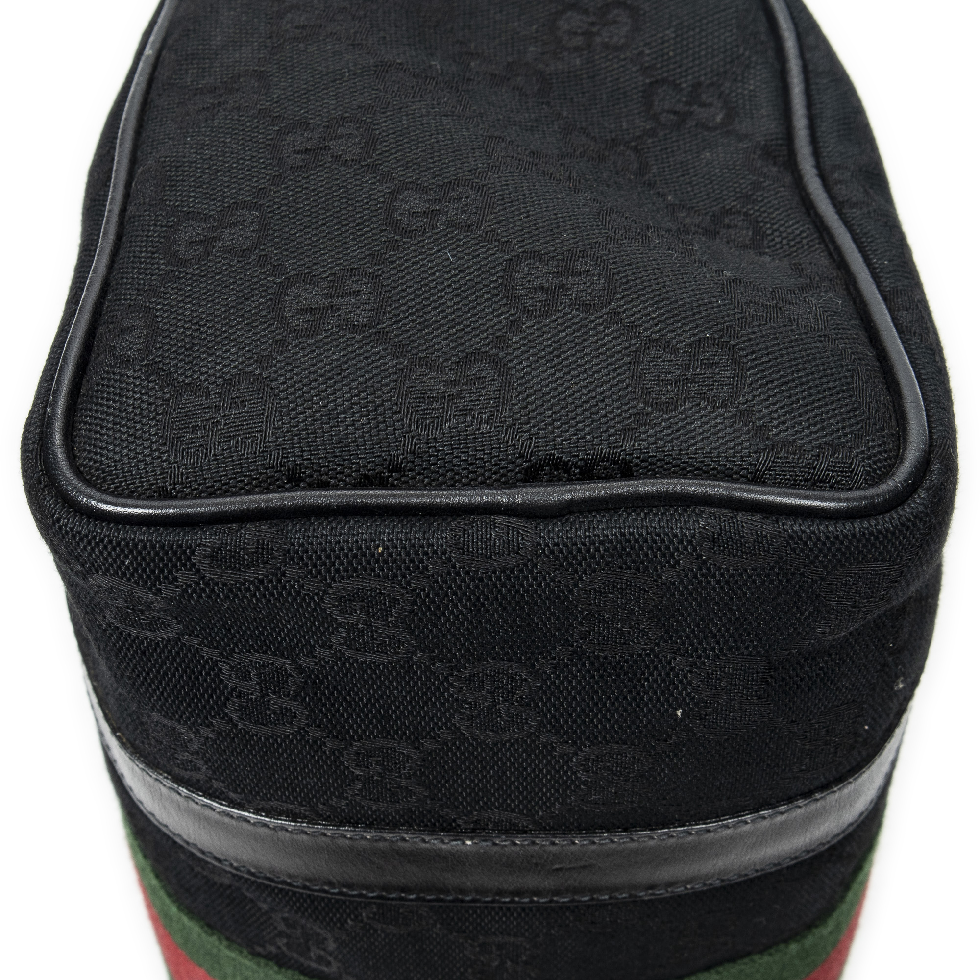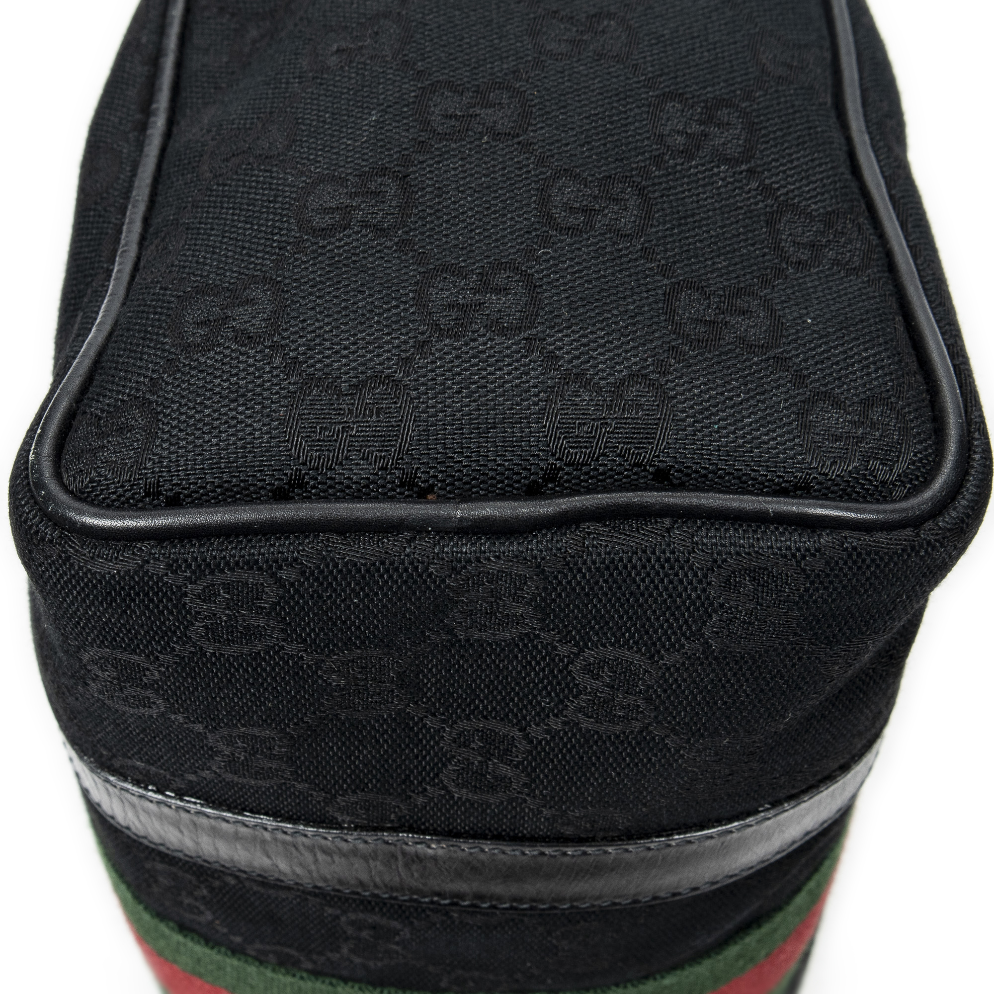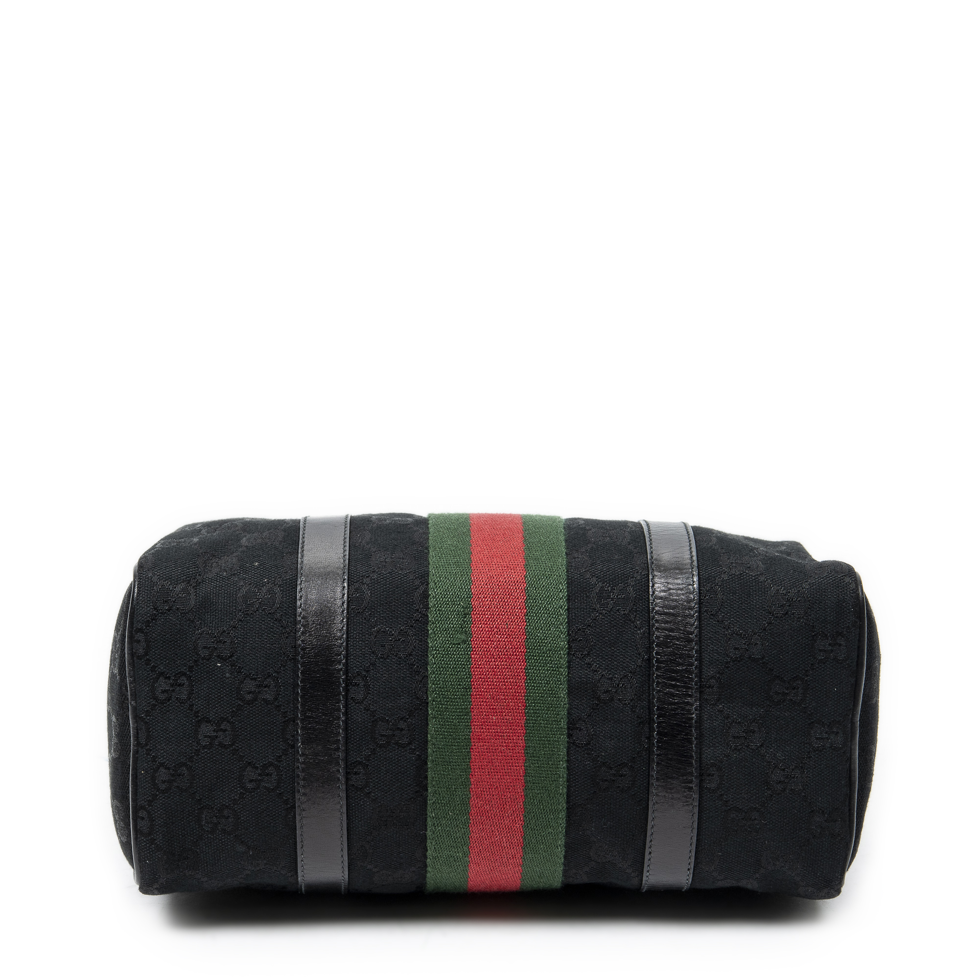 Gucci Handbag Web Accessory Collection Boston in Black Monogrammed Canvas and Gold hardware. The product is in Very Good Condition (AB).