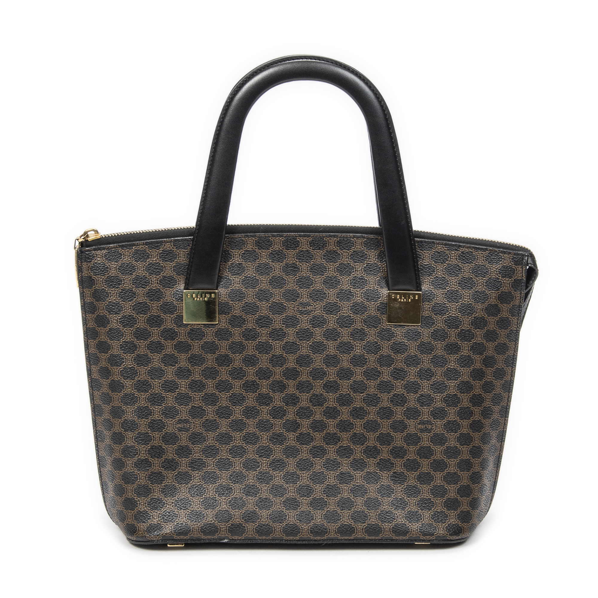 Celine Handbag Zip Top Handle in Black/Brown Macadam Coated Canvas and Gold hardware. The product is in Excellent Condition (A).