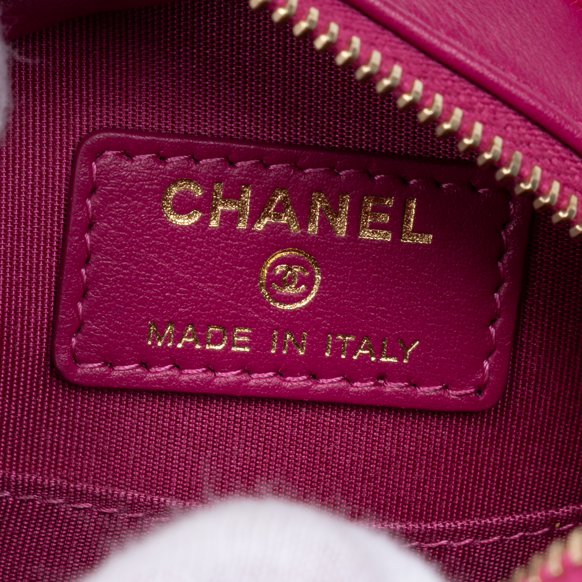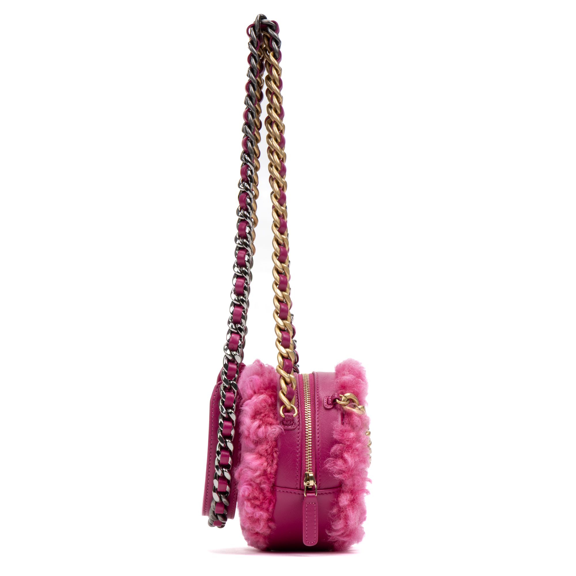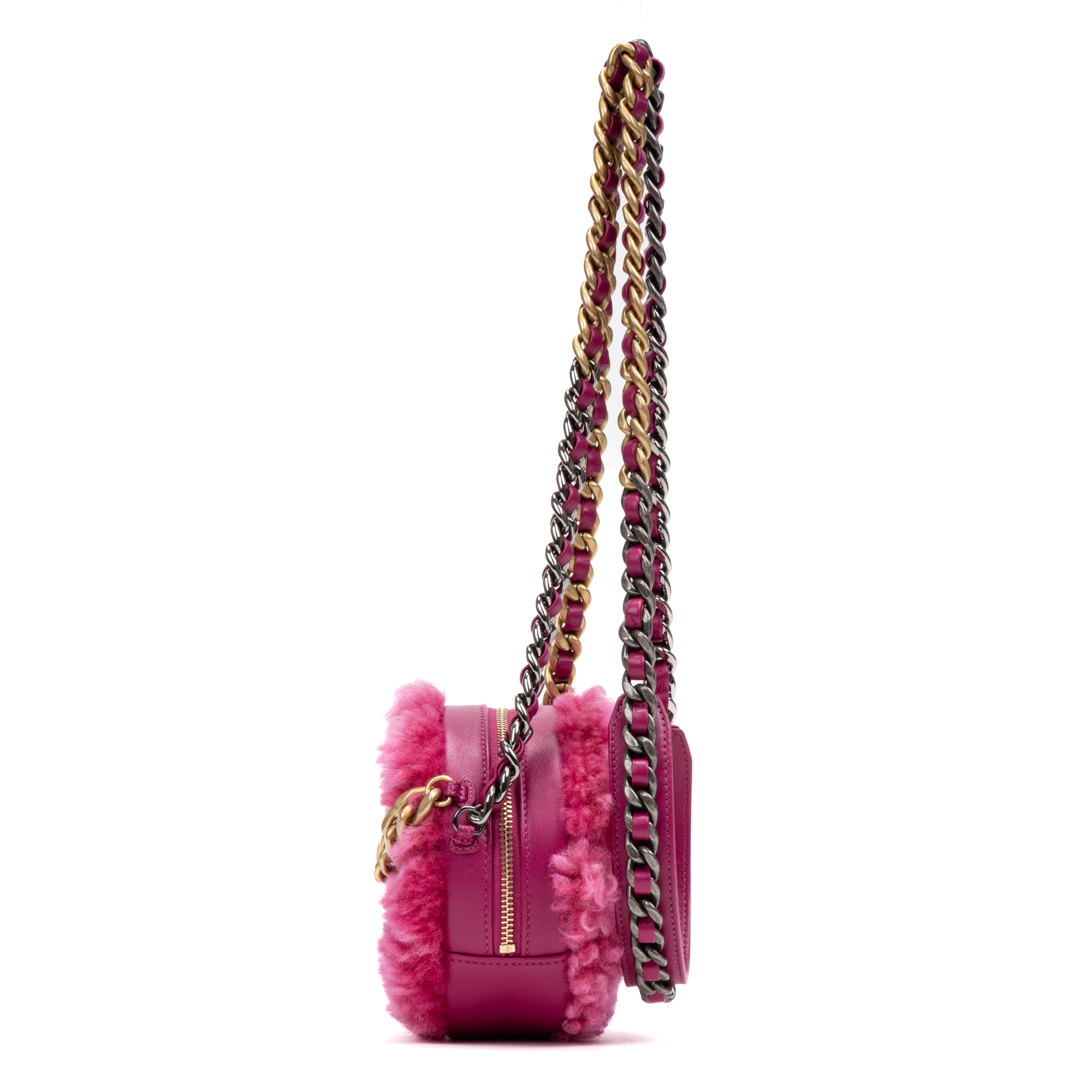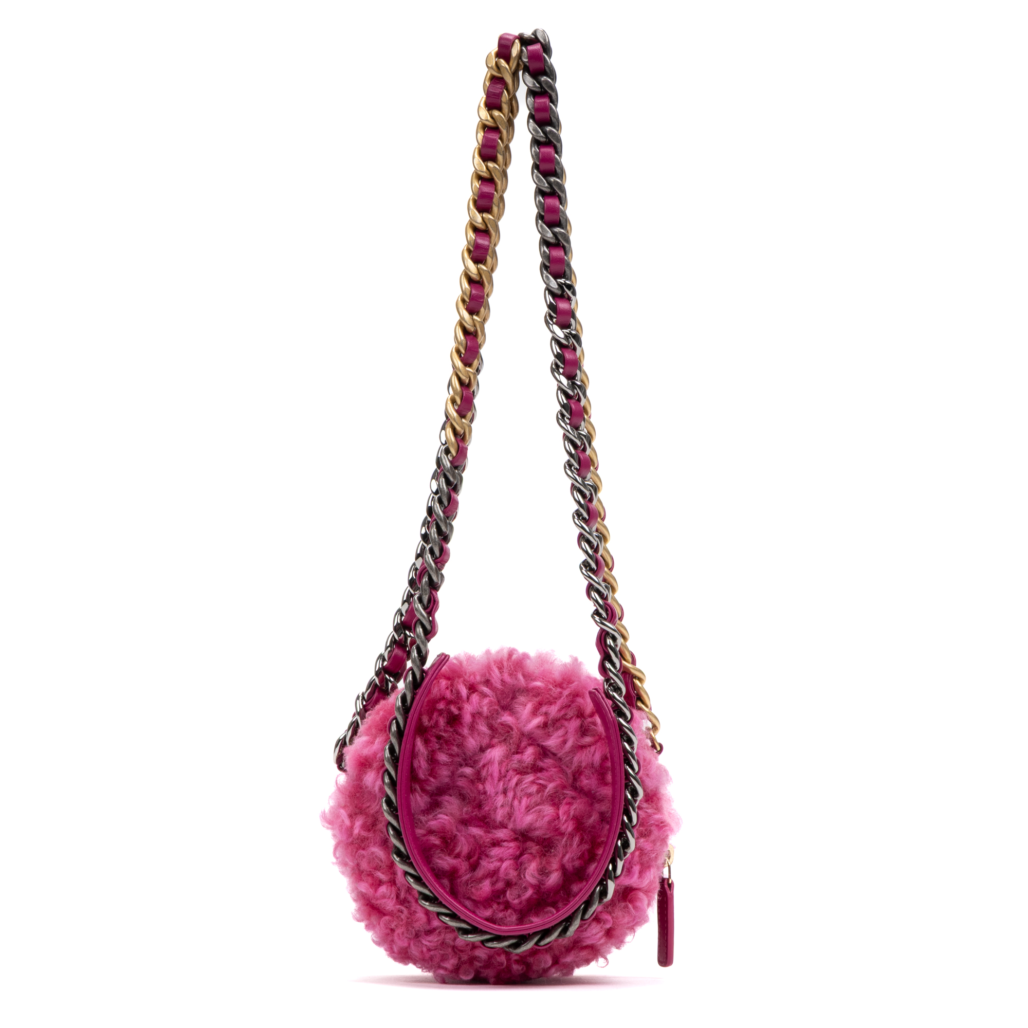 Chanel Shoulder Bag 19 Round Chain Clutch in Pink Shearling Quilted Canvas and Gold/Silver hardware. The product is in Perfect Condition (AA).