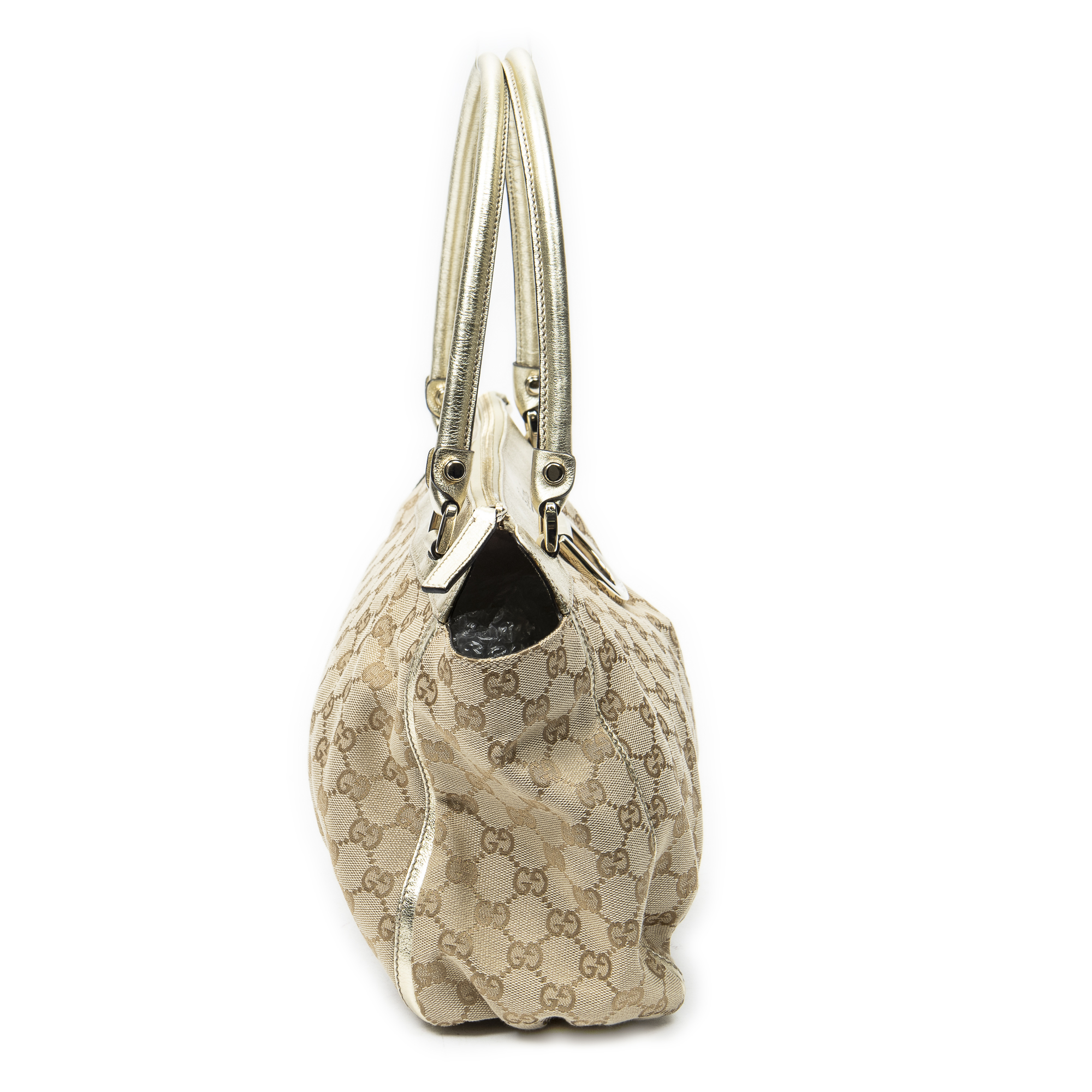 Gucci Shoulder Bag Abbey D-Ring Zip Tote in Beige/Gold Monogrammed Canvas and Gold hardware. The product is in Excellent Condition (A).