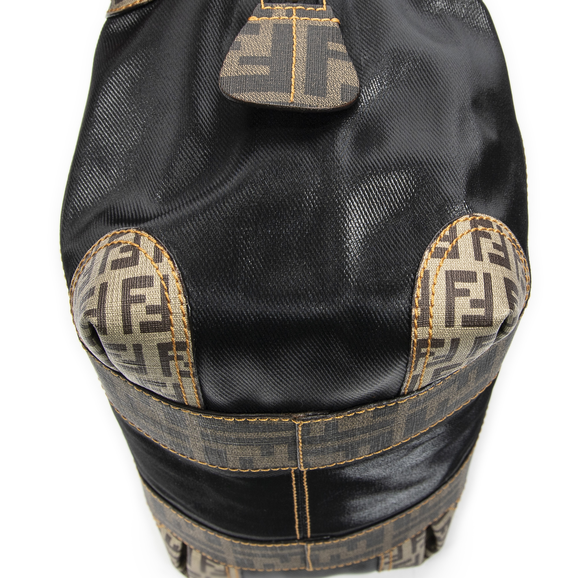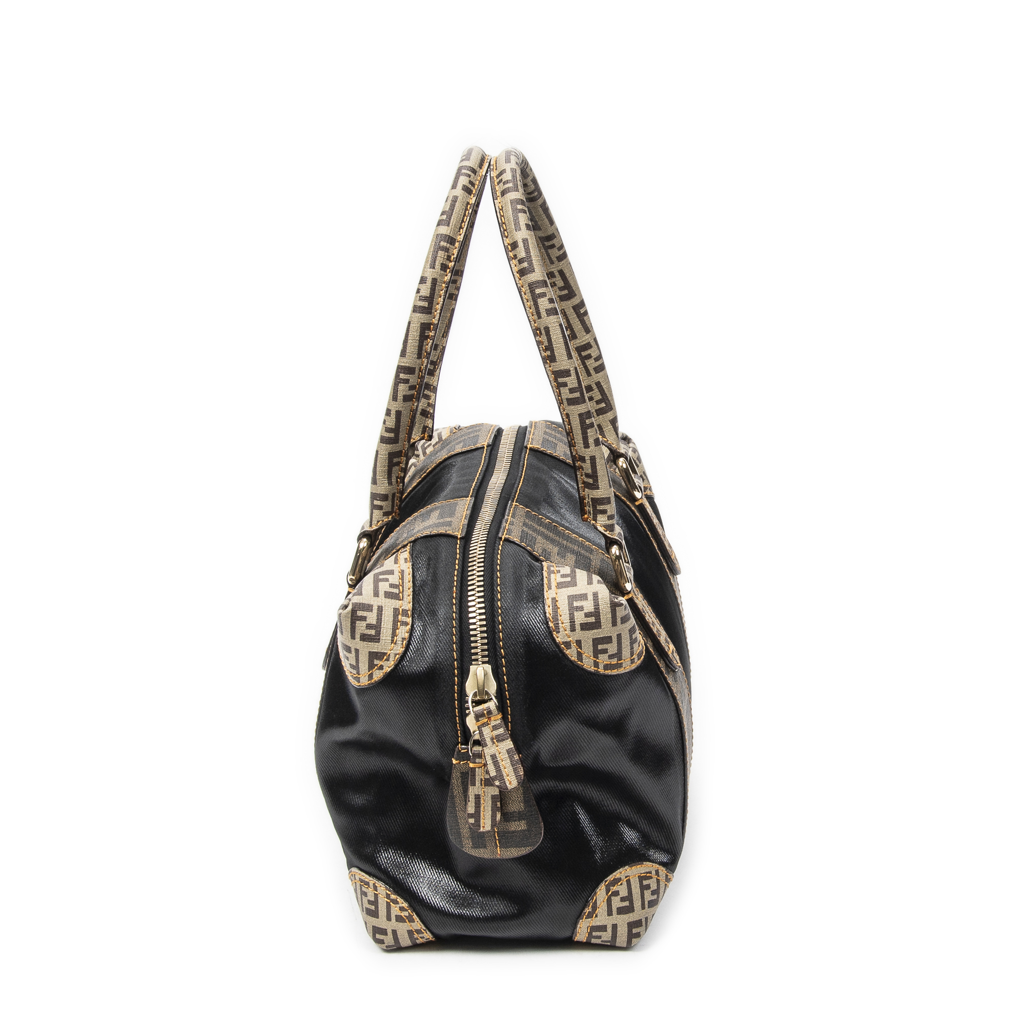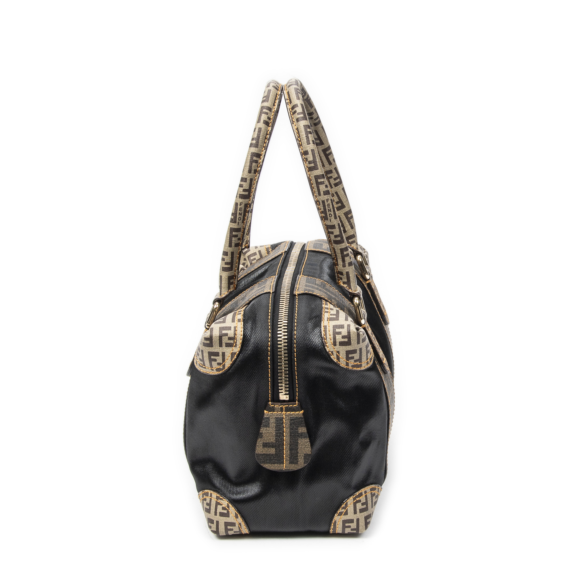 Fendi Shoulder Bag B Mix Boston in Brown/Black Zucca Mixed Media Coated Canvas and Gold hardware. The product is in Perfect Condition (AA).