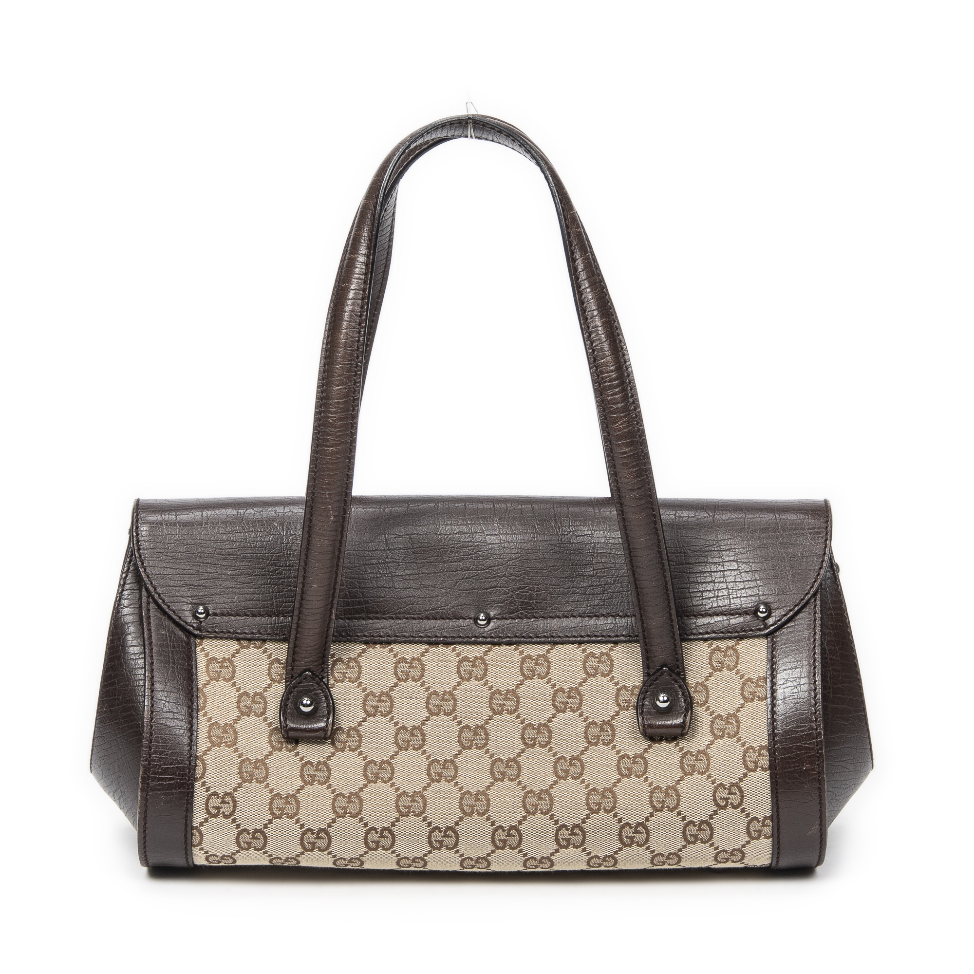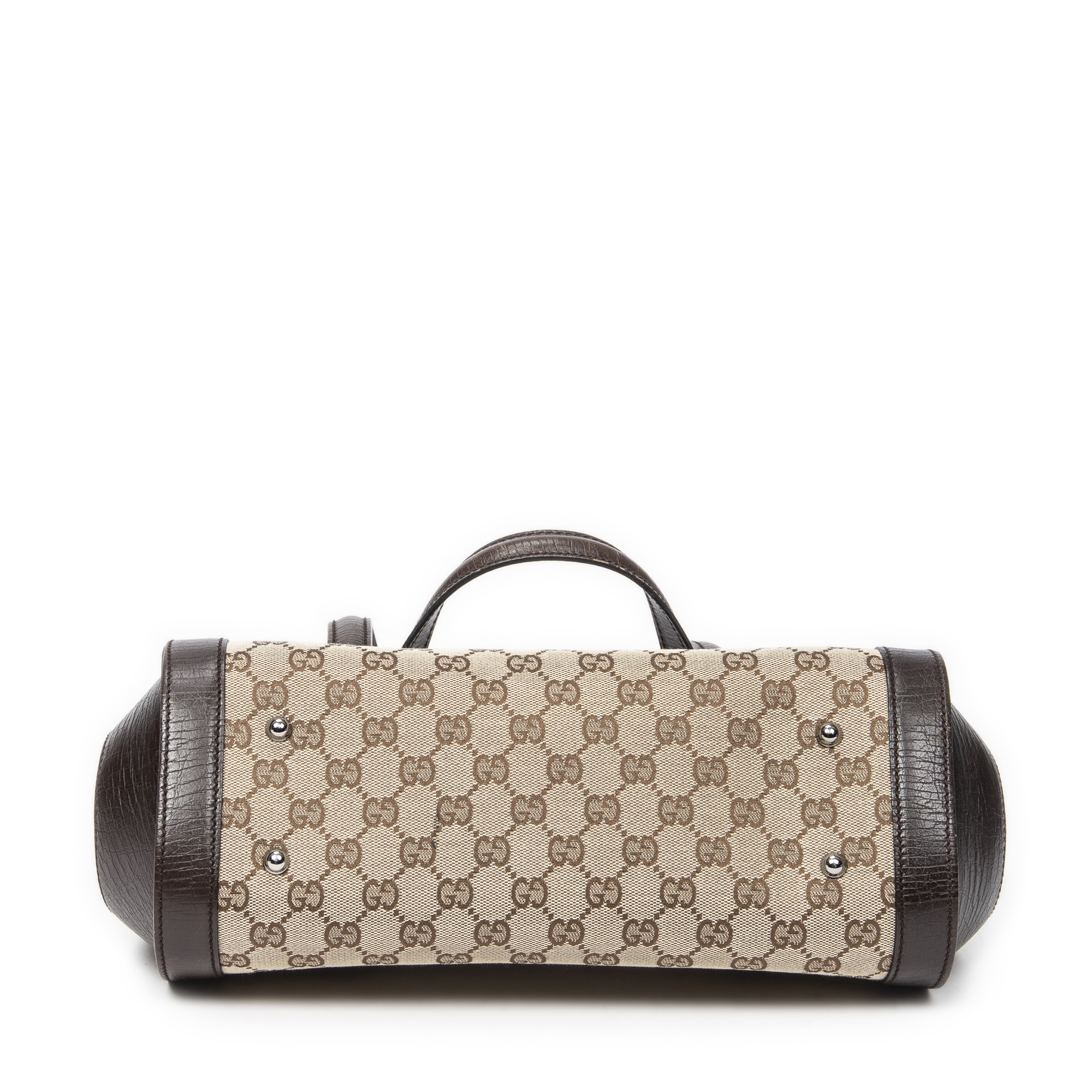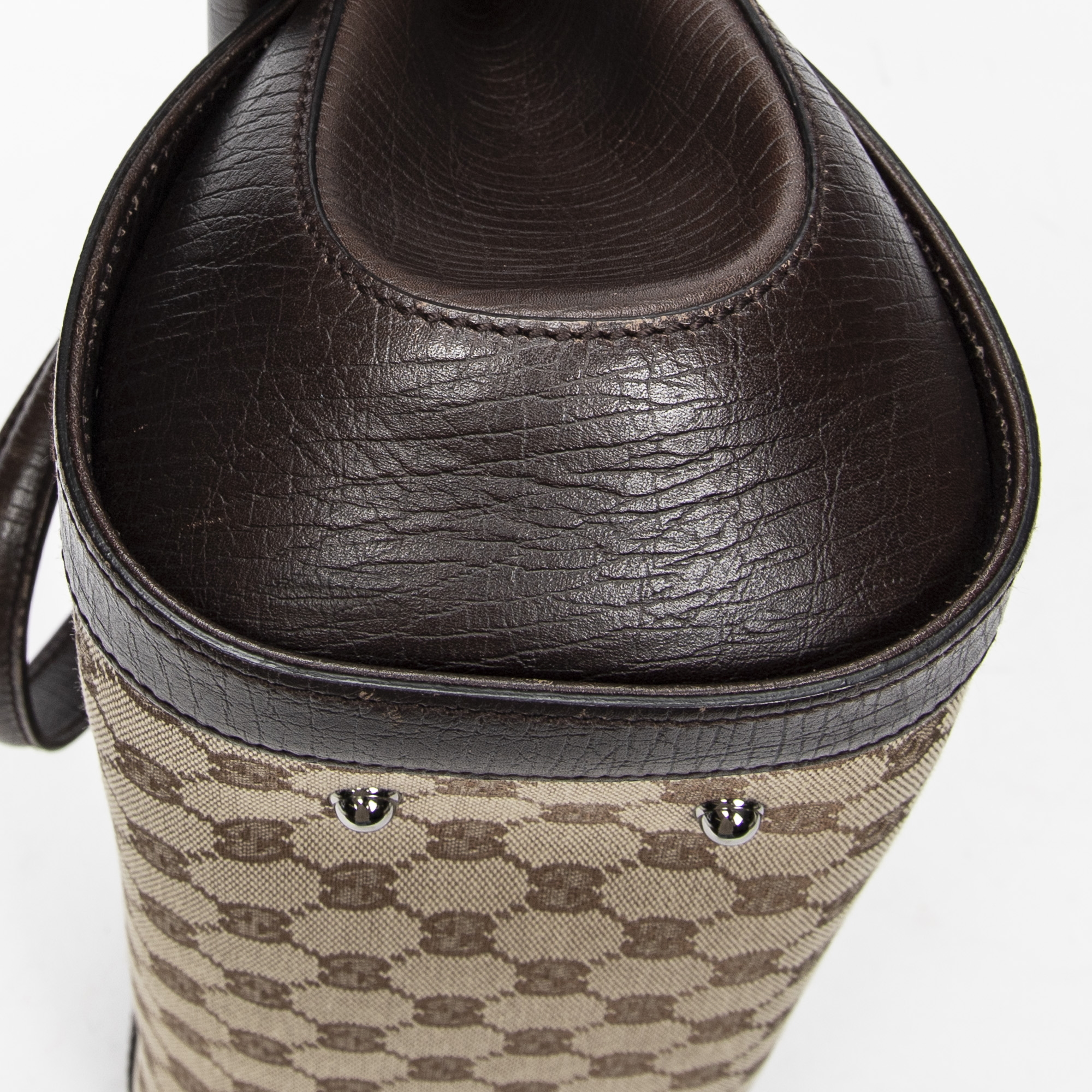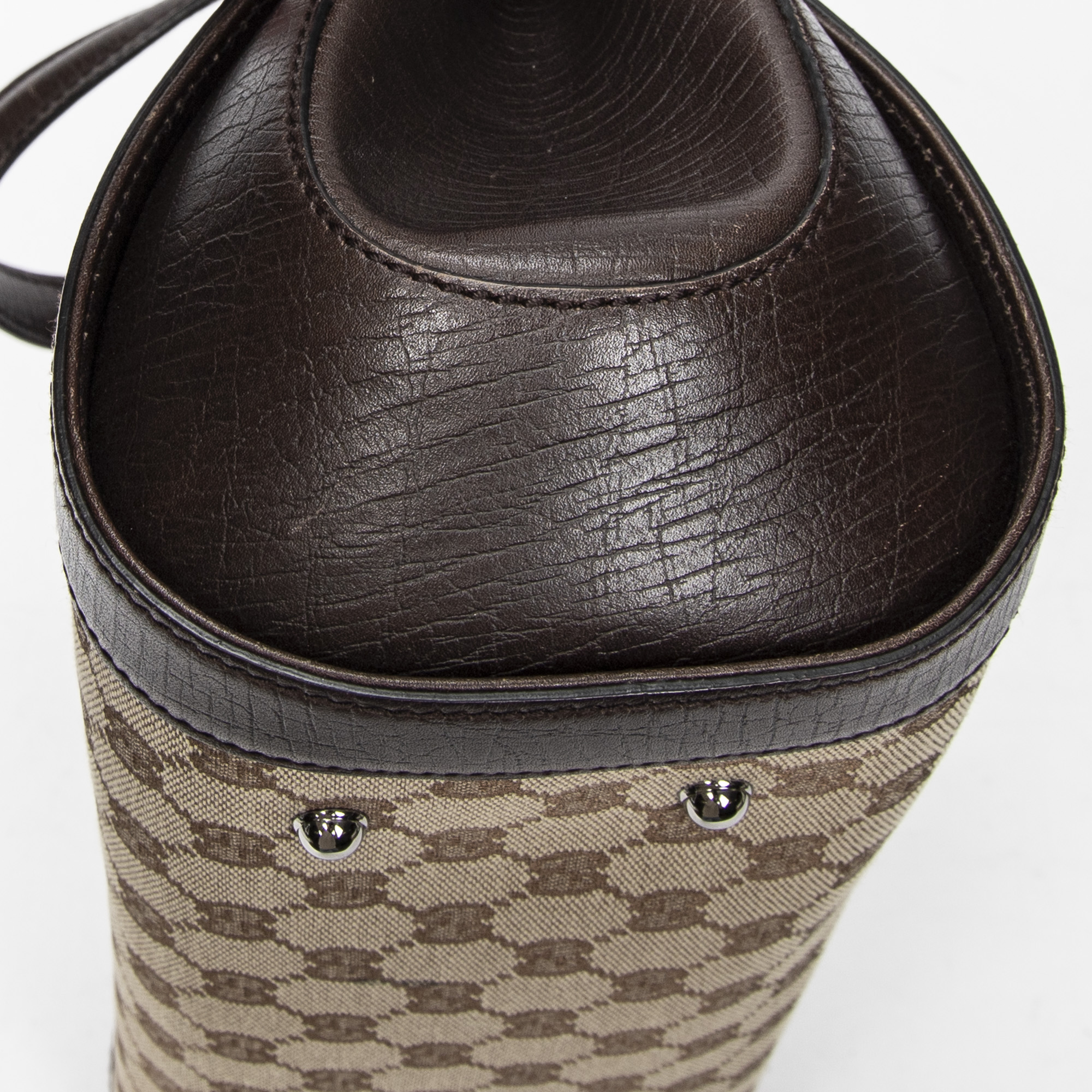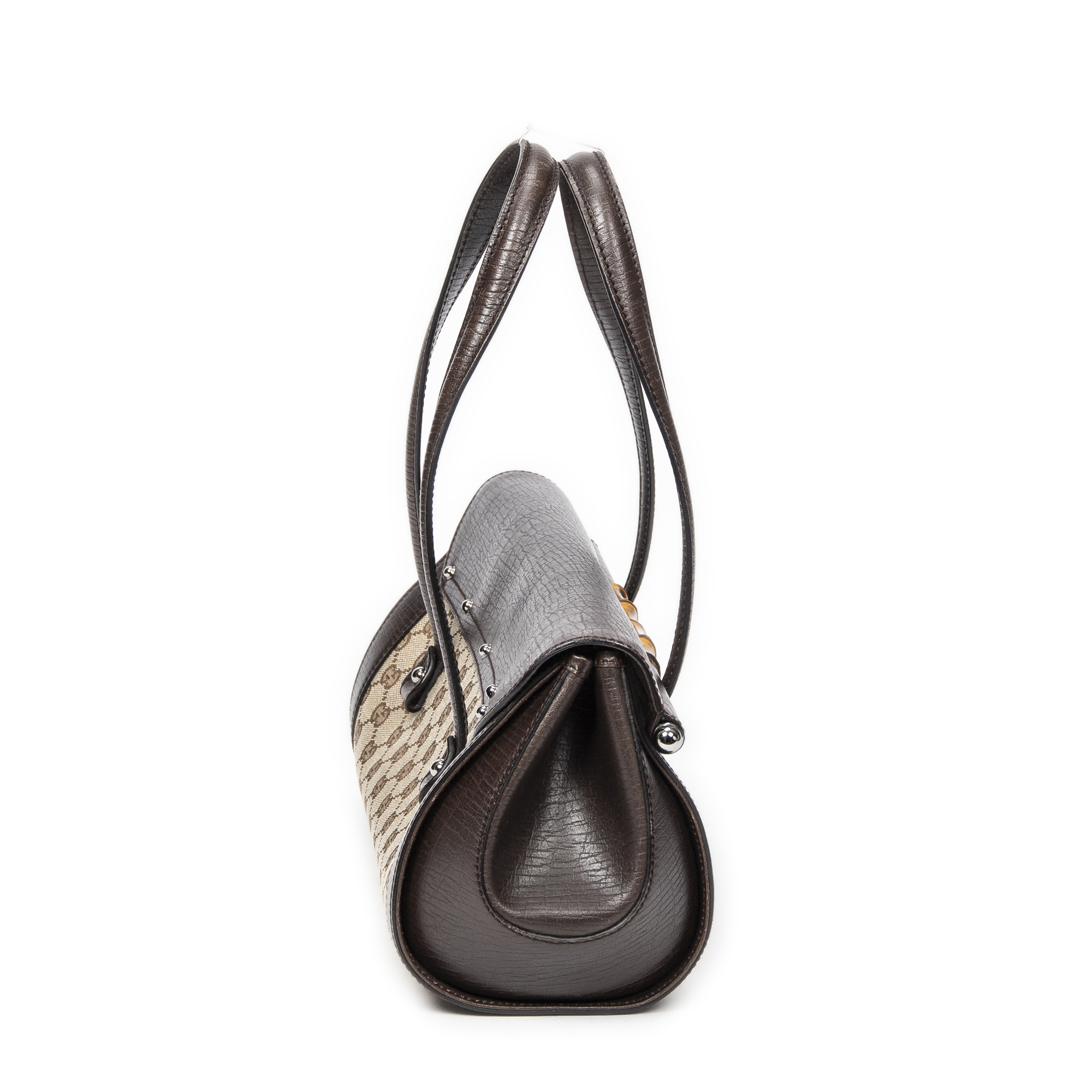 Gucci Shoulder Bag Bamboo Bullet Tote in Beige/Dark Brown Monogrammed Canvas and Silver hardware. The product is in Excellent Condition (A).