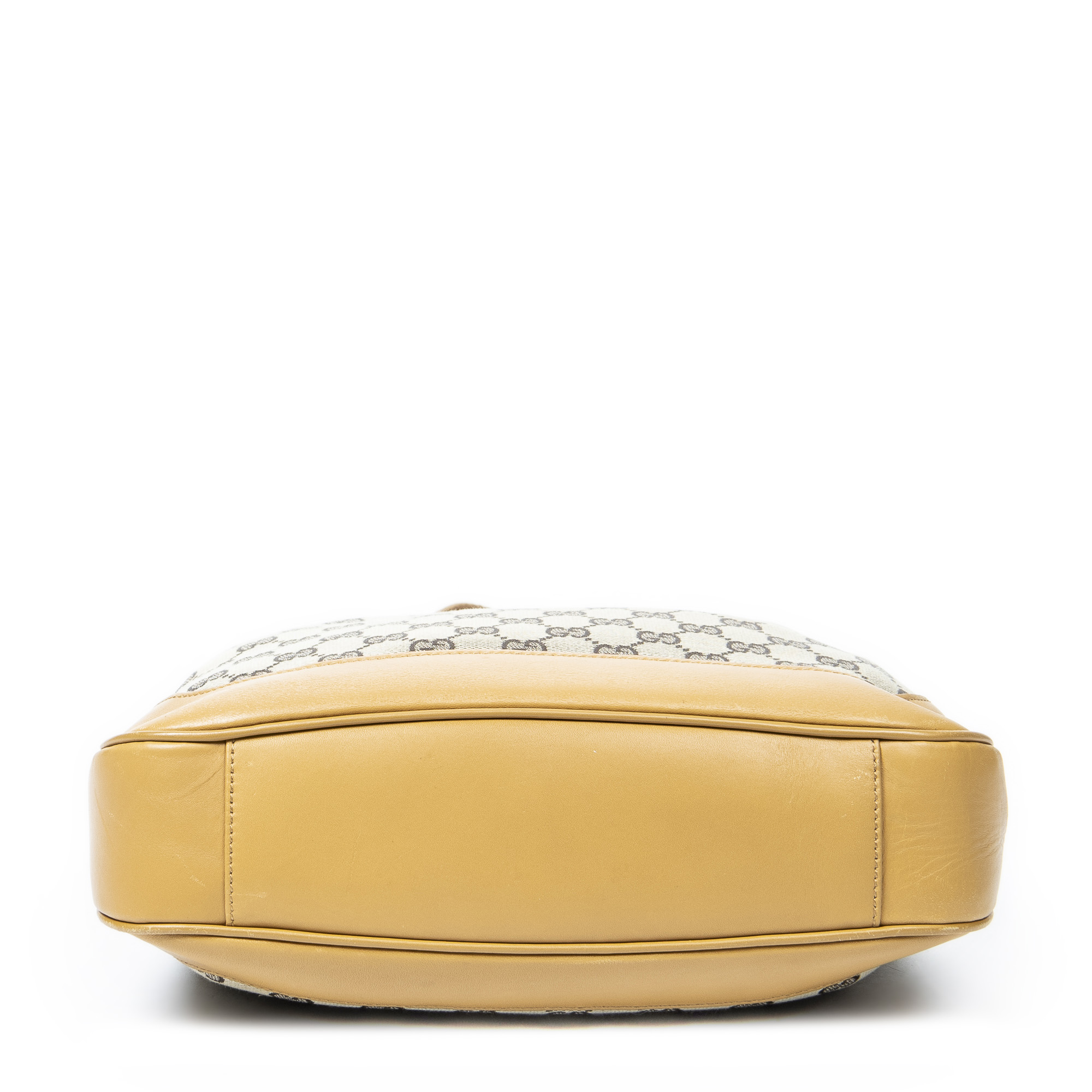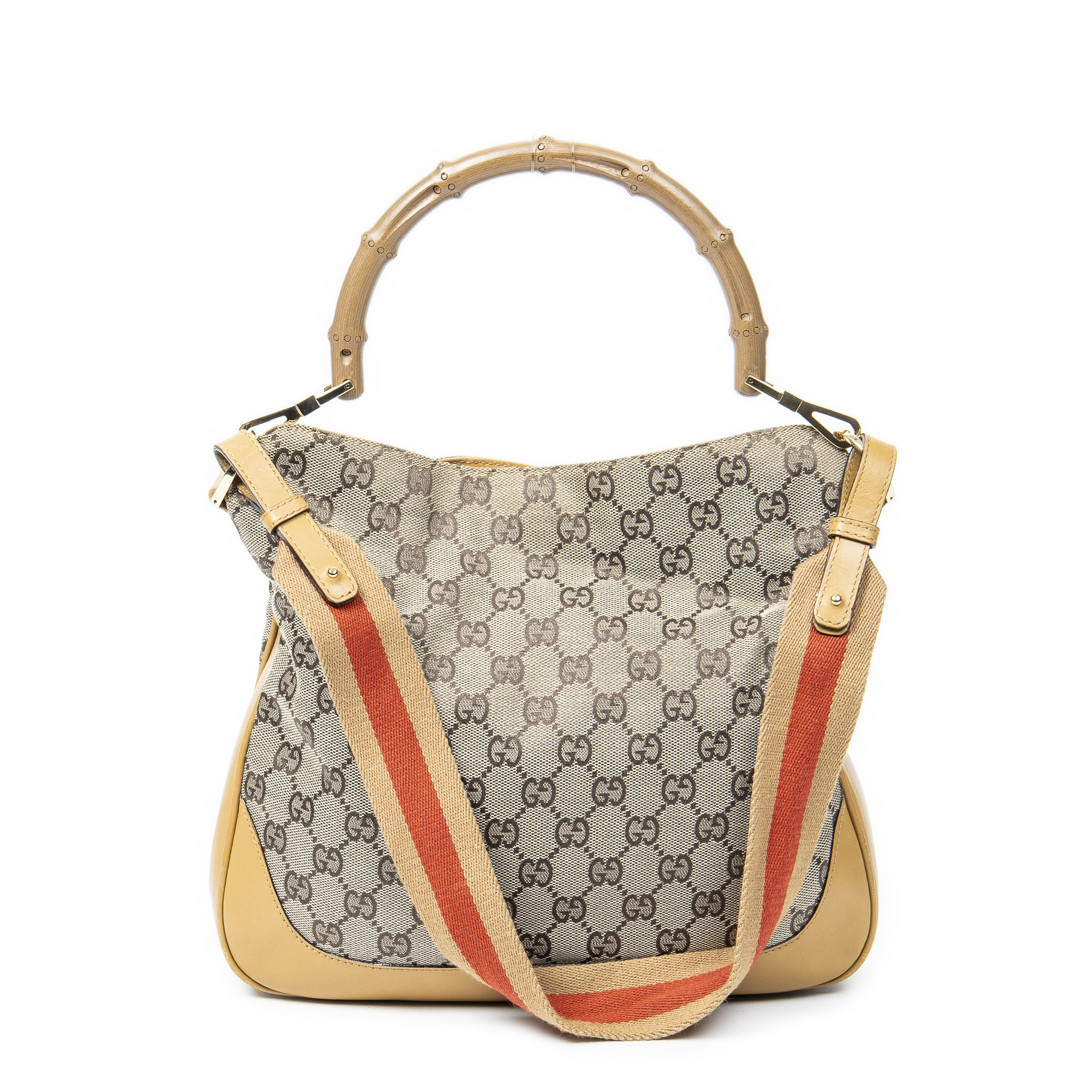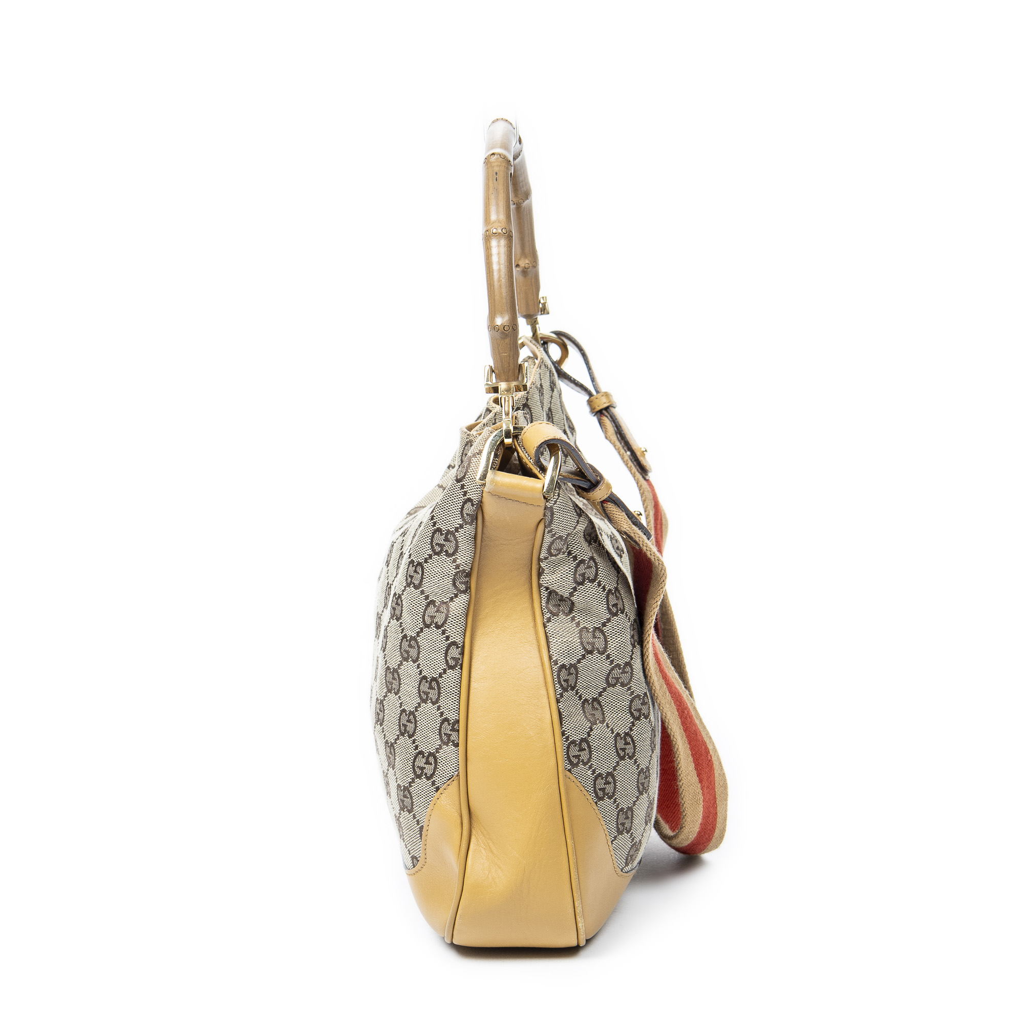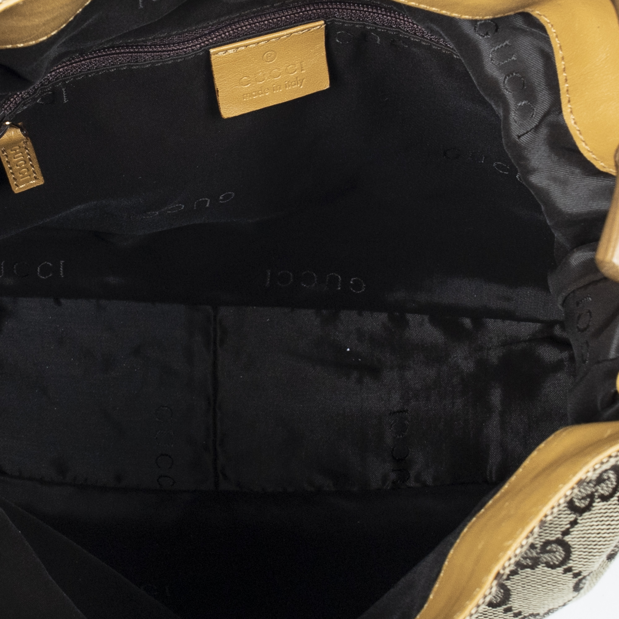 Gucci Shoulder Bag Bamboo Top Handle Hobo in Beige Monogrammed Canvas and Gold hardware. The product is in Excellent Condition (A).