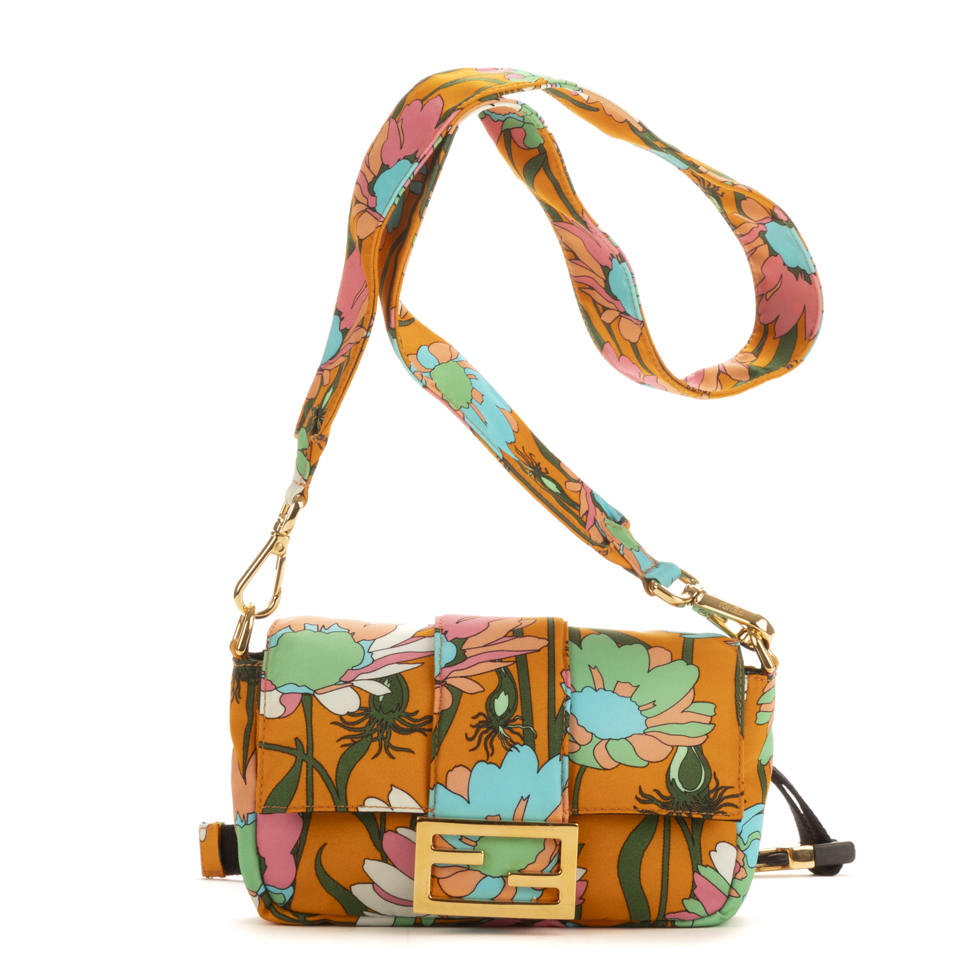 Fendi Shoulder Bag Belt Baguette in Multicolor Floral fabric and Gold hardware. The product is in Perfect Condition (AA).