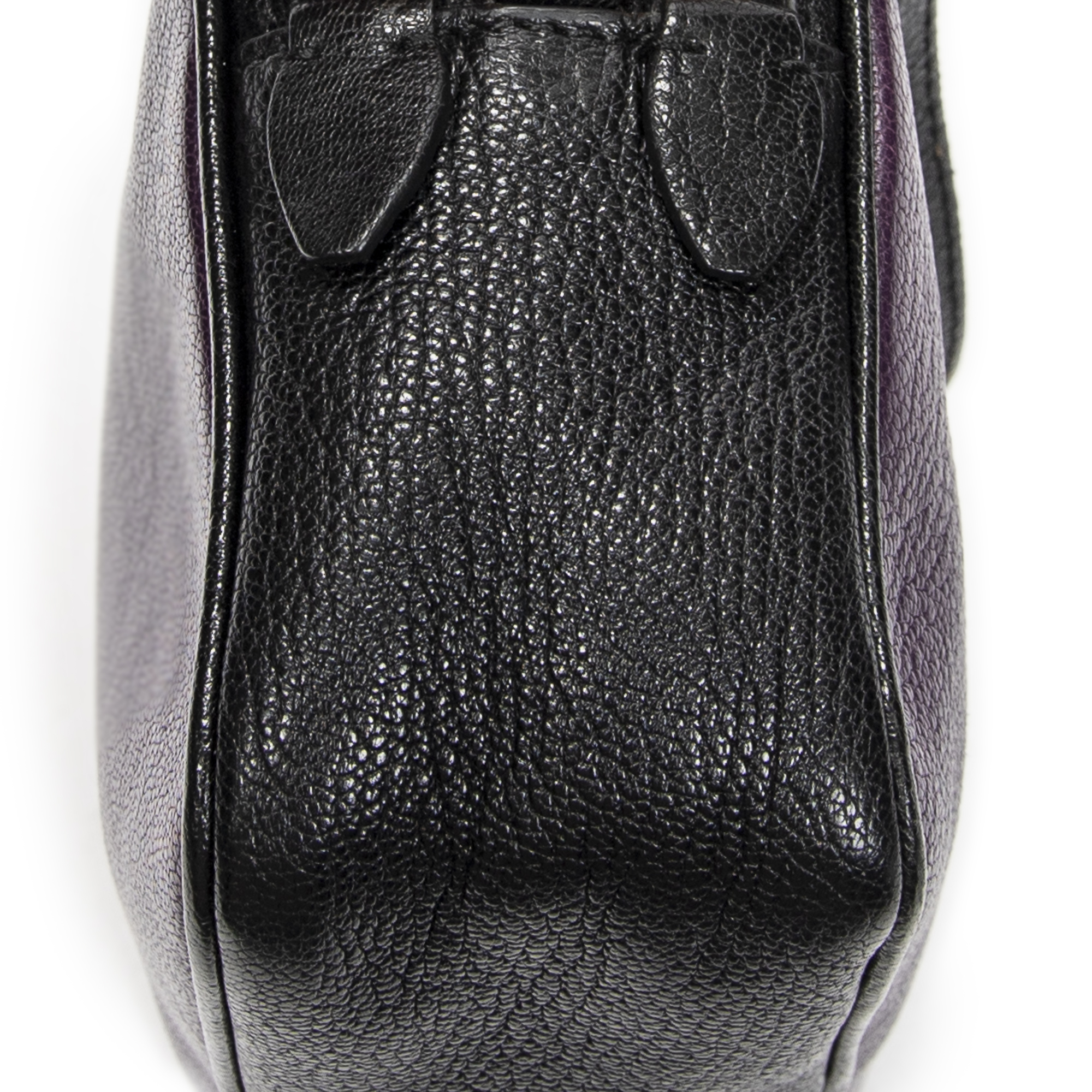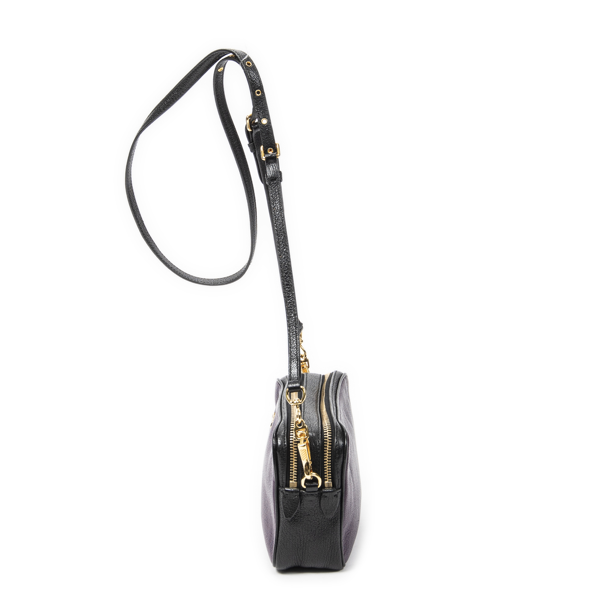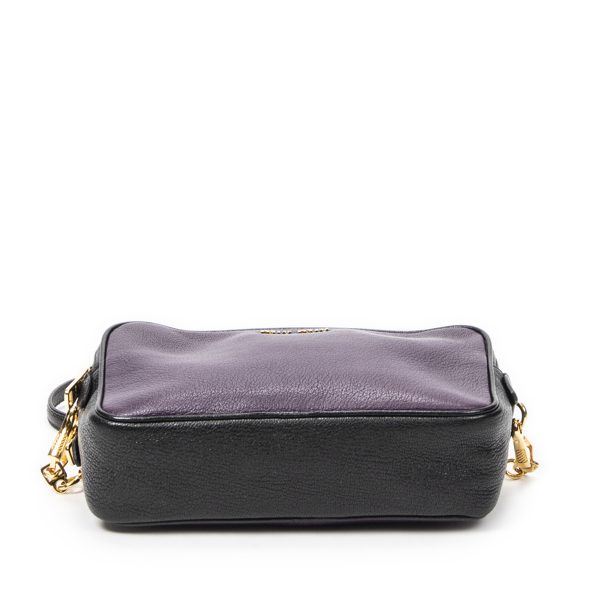 Miu Miu Shoulder Bag Bicolor Double Zip Camera Crossbody in Purple/Black Goatskin Leather and Gold hardware. The product is in Excellent Condition (A).