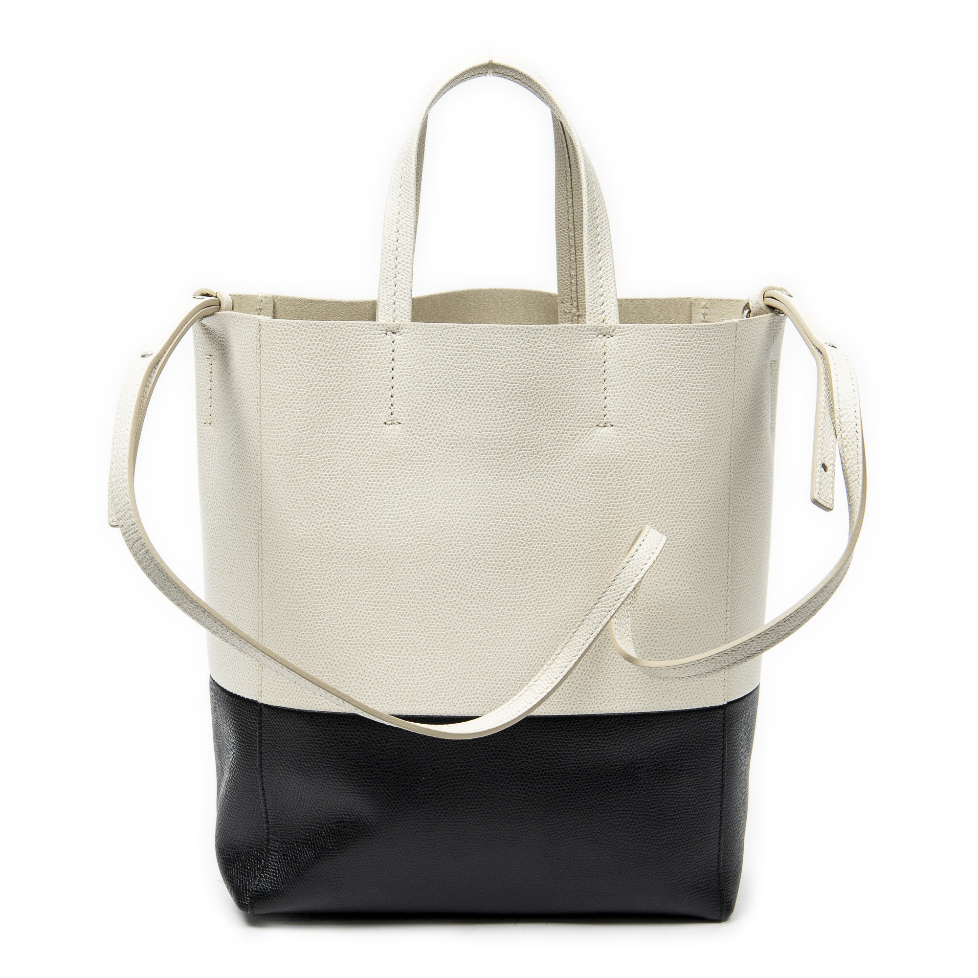 Celine Shoulder Bag Bicolor Vertical Cabas Tote in Black/White Grained Leather and Silver hardware. The product is in Excellent Condition (A).