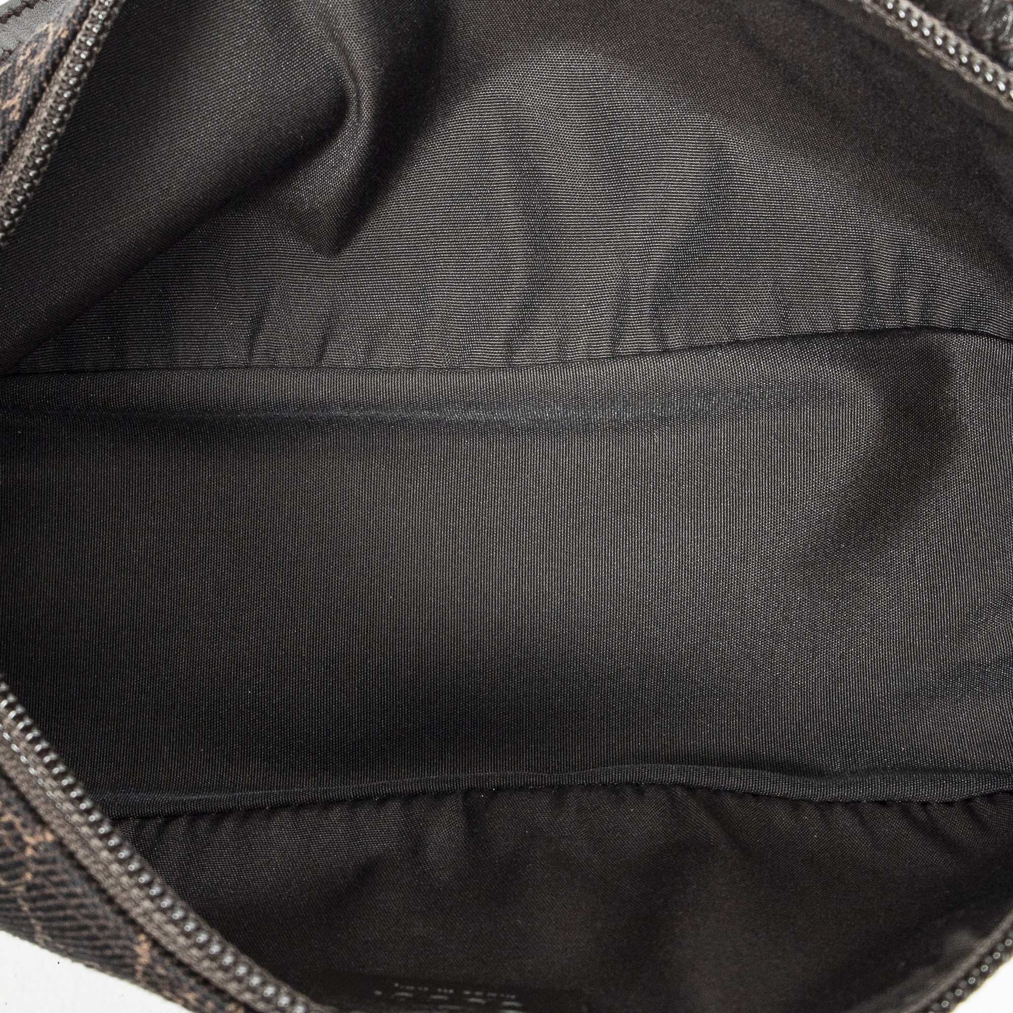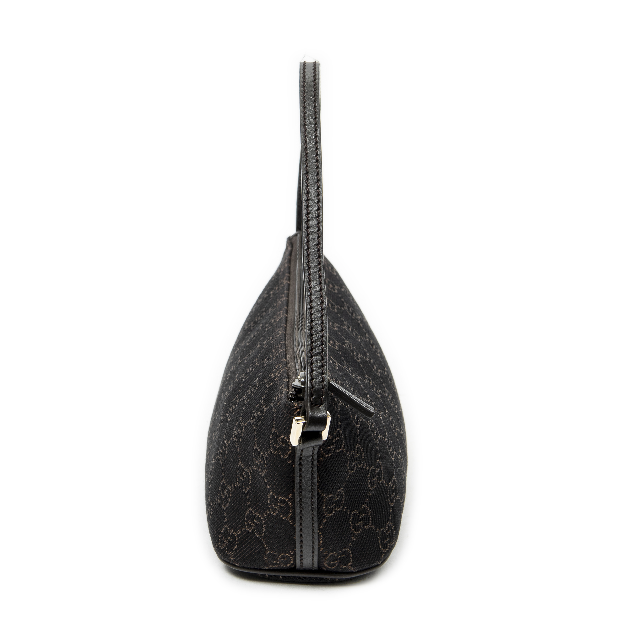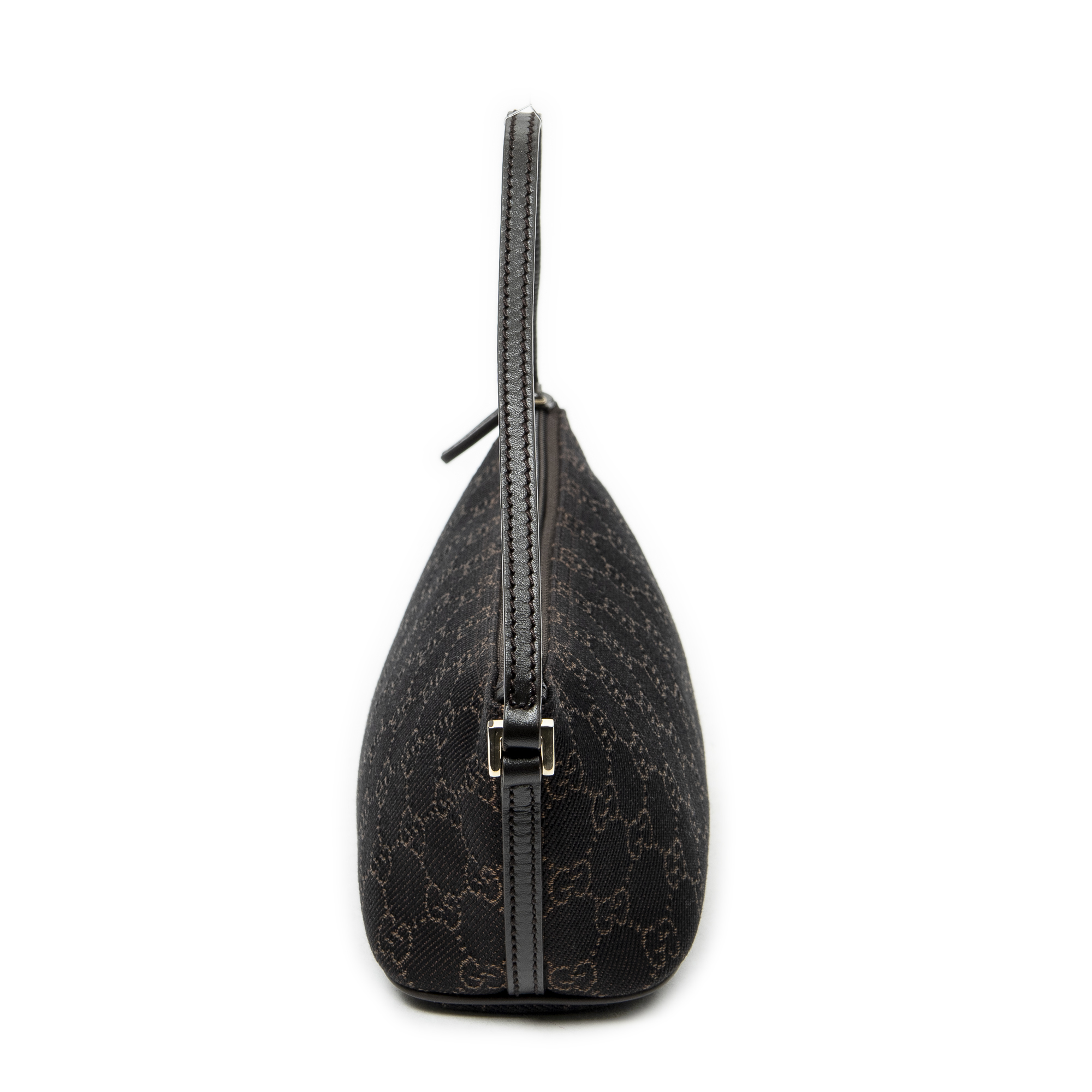 Gucci Shoulder Bag Boat Pochette in Dark Brown Monogrammed Denim Canvas and Gold hardware. The product is in Perfect Condition (AA).