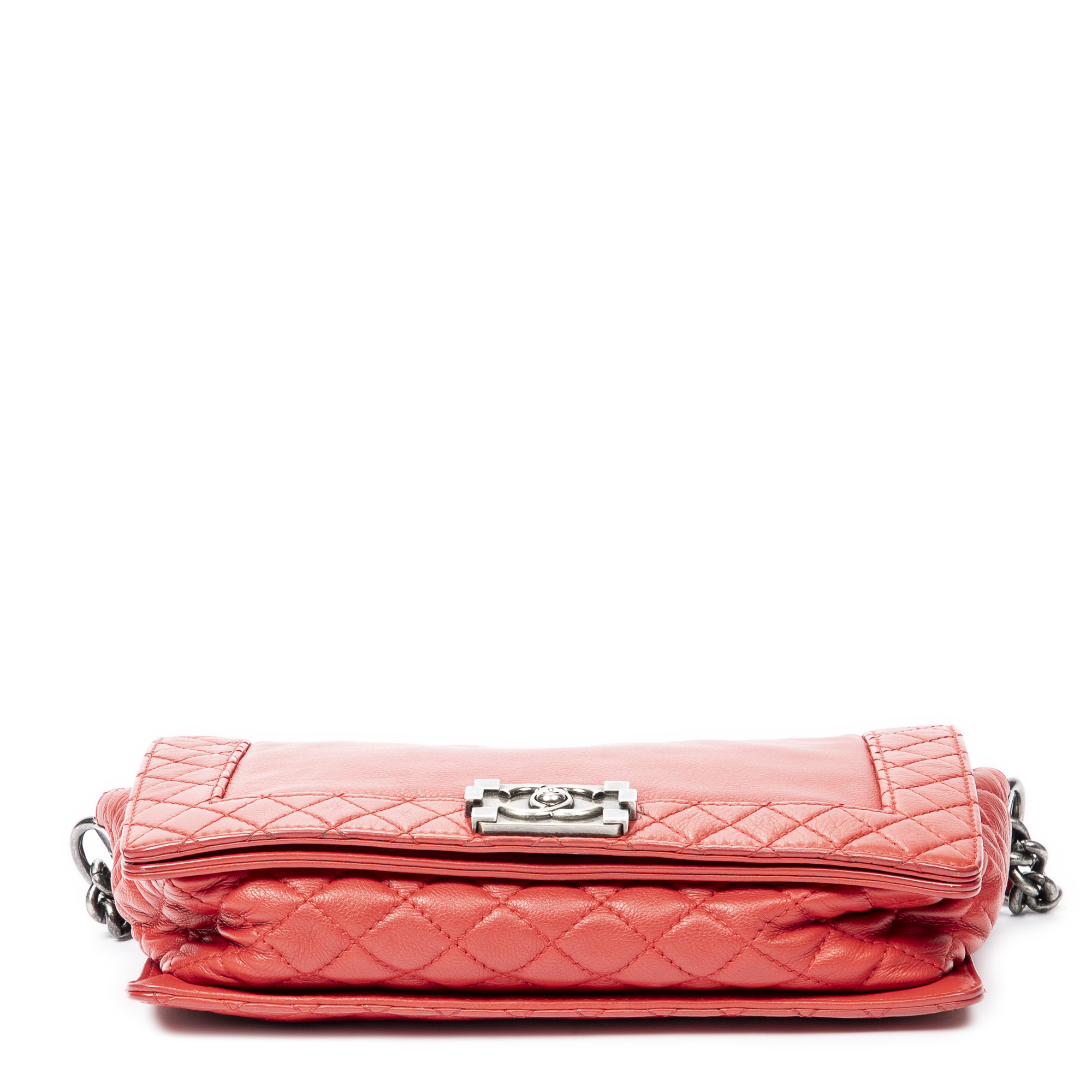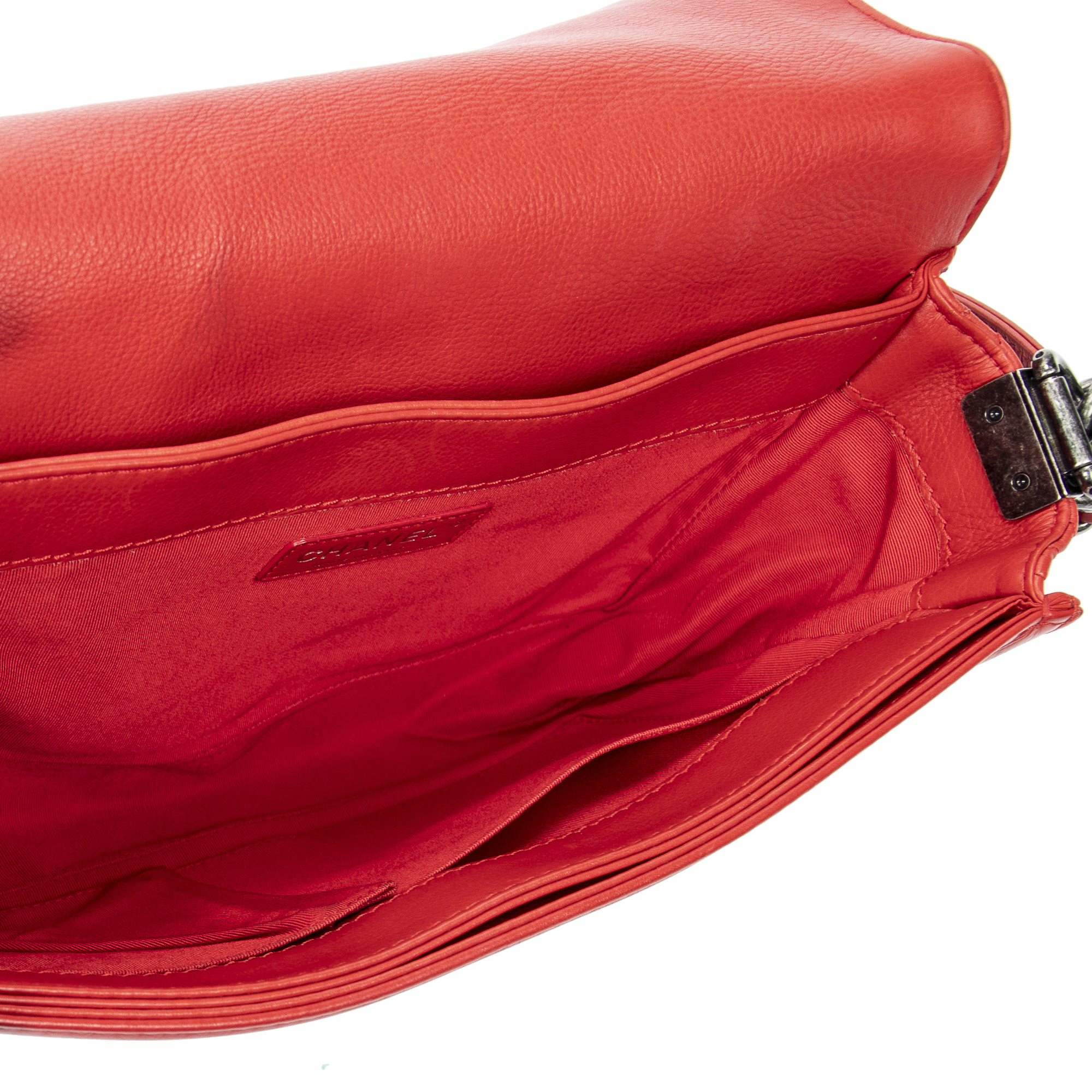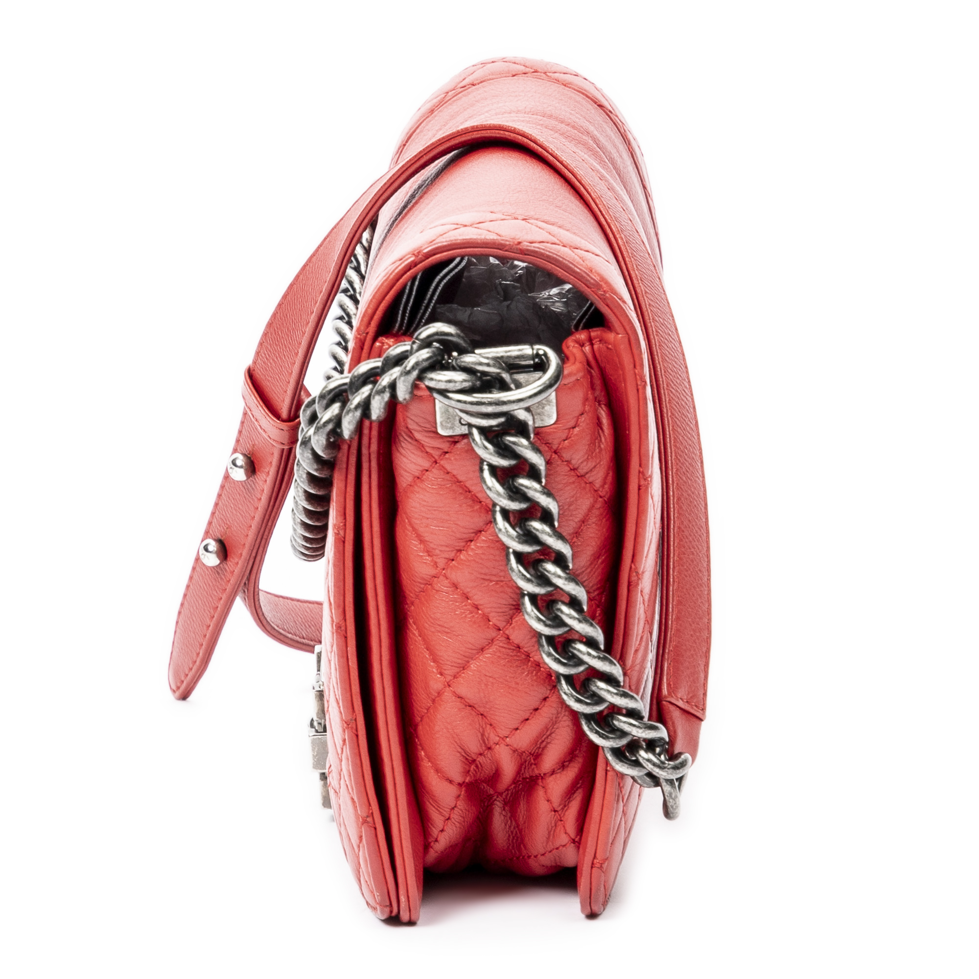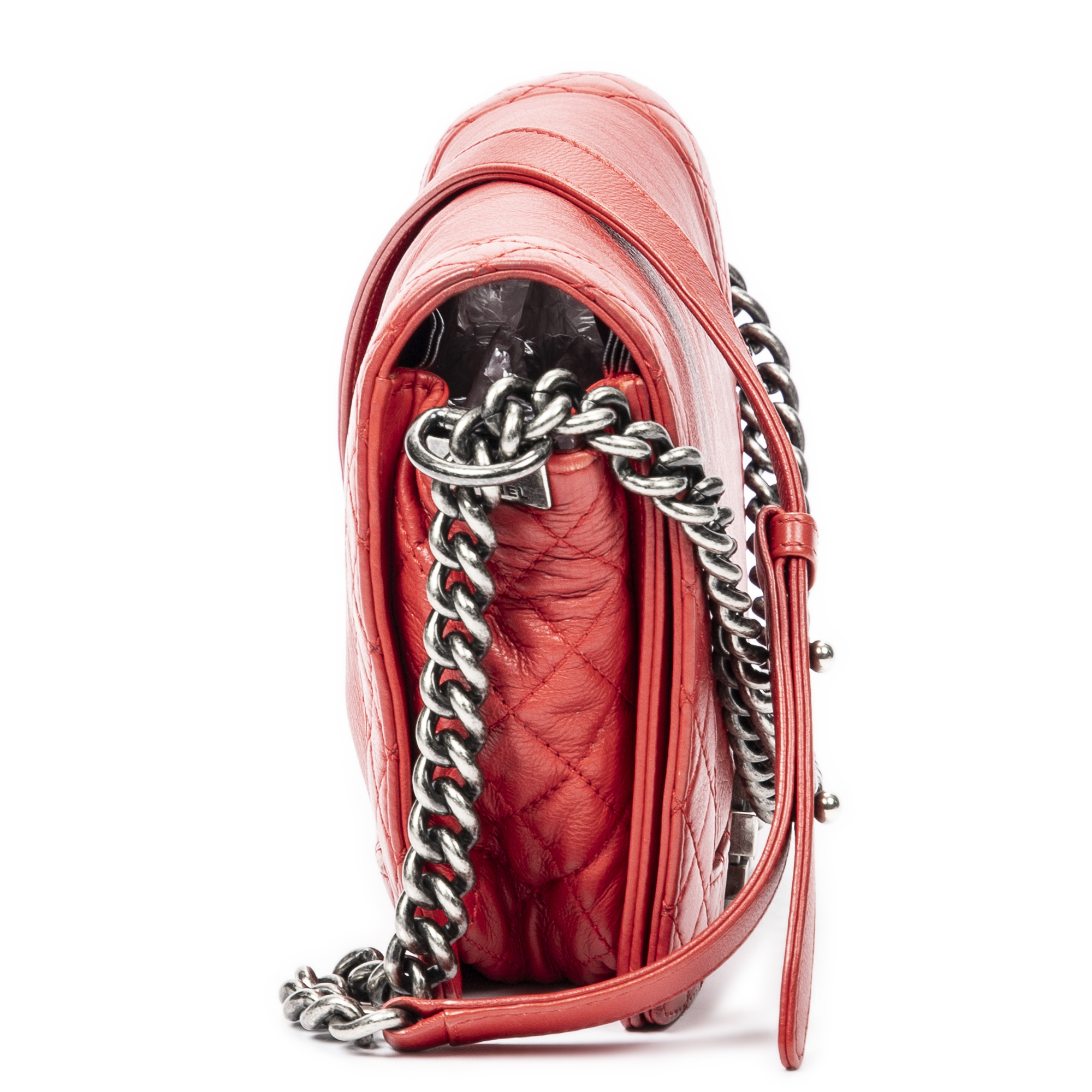 Chanel Shoulder Bag Boy in Red Quilted Lambskin Leather and Aged Brass hardware. The product is in Excellent Condition (A).