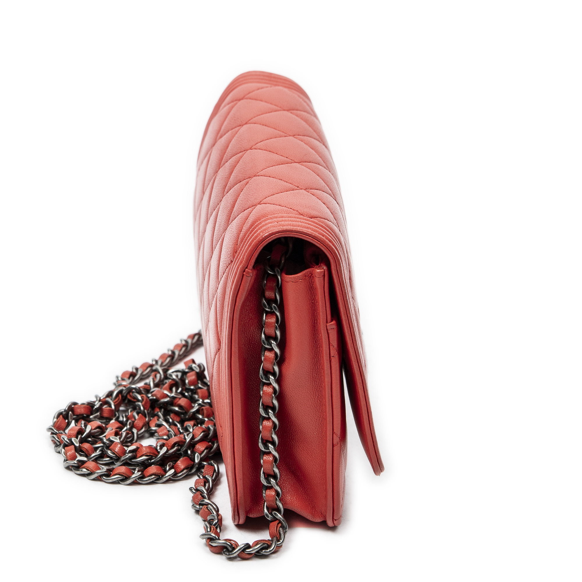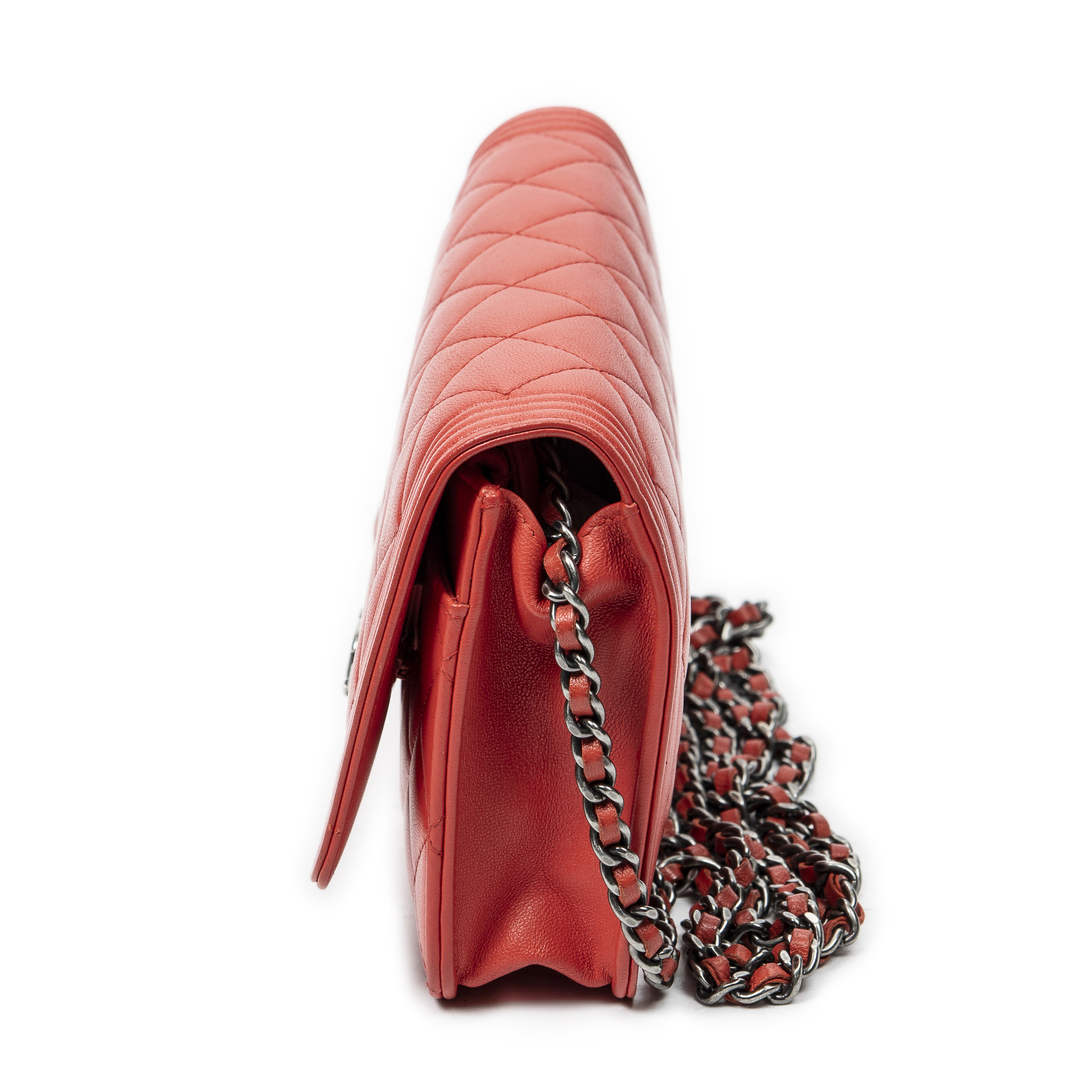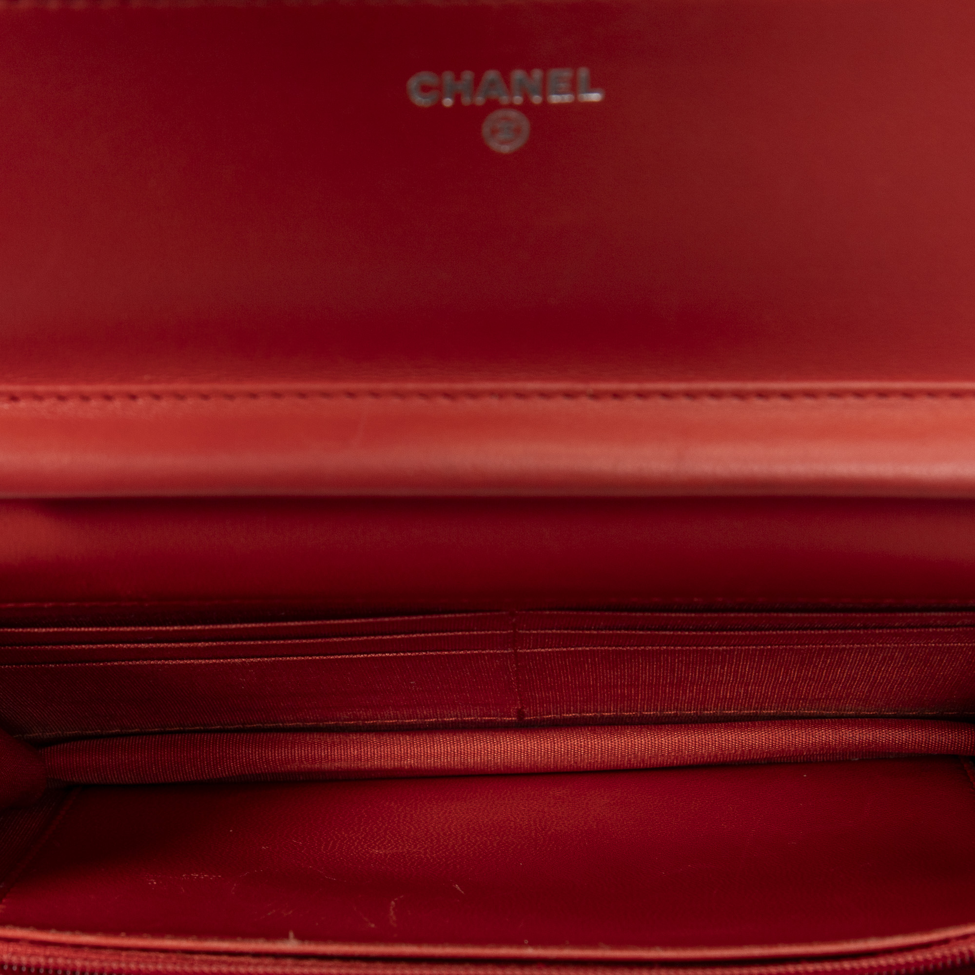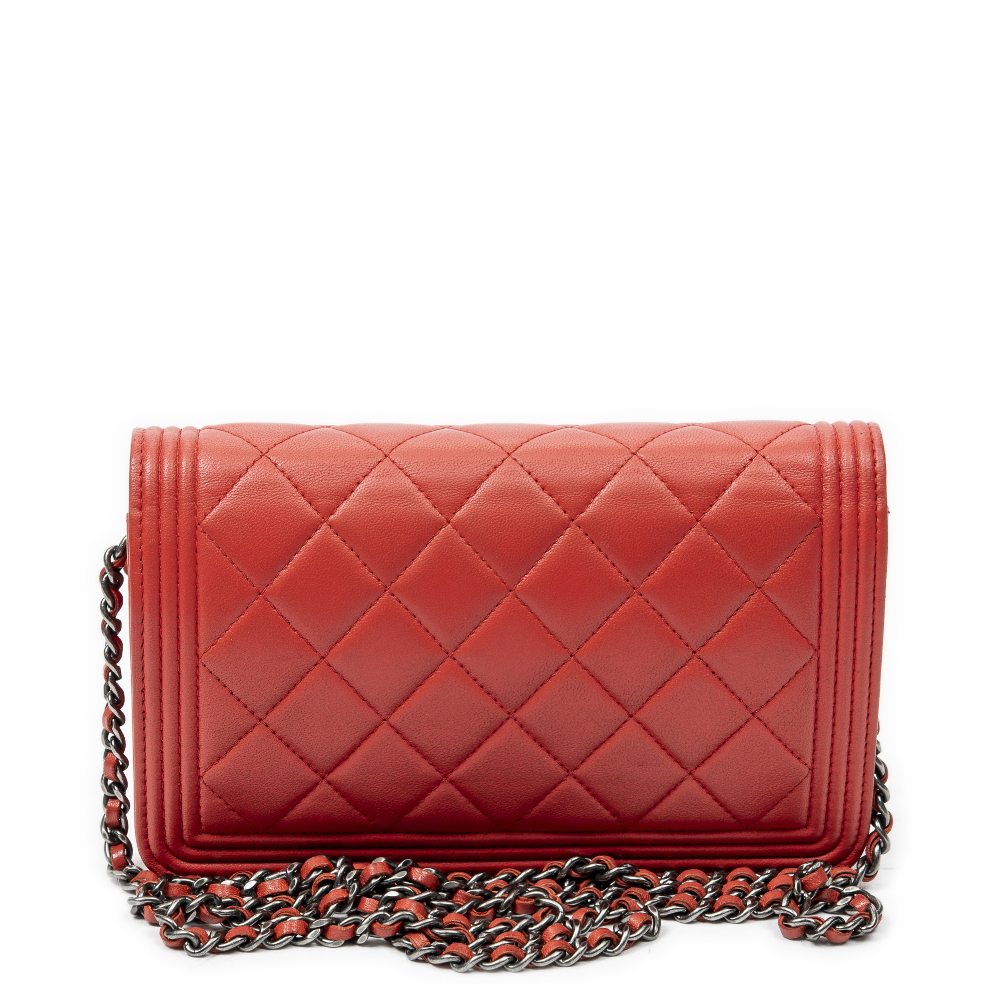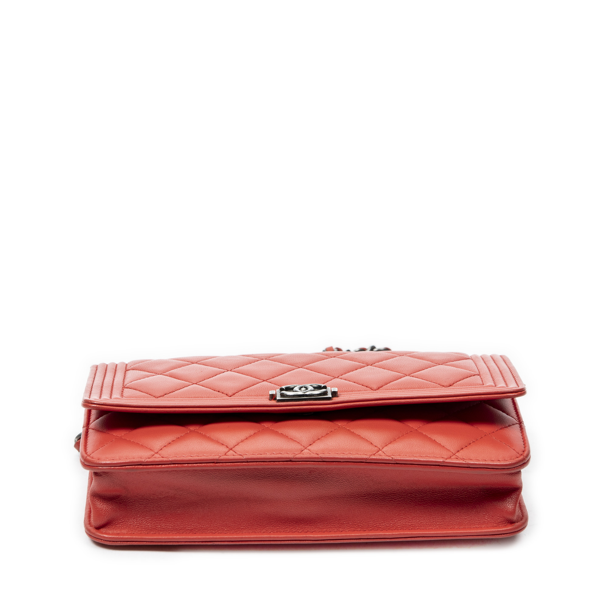 Chanel Shoulder Bag Boy Wallet on Chain in Red Quilted Lambskin Leather and Silver hardware. The product is in Excellent Condition (A).
