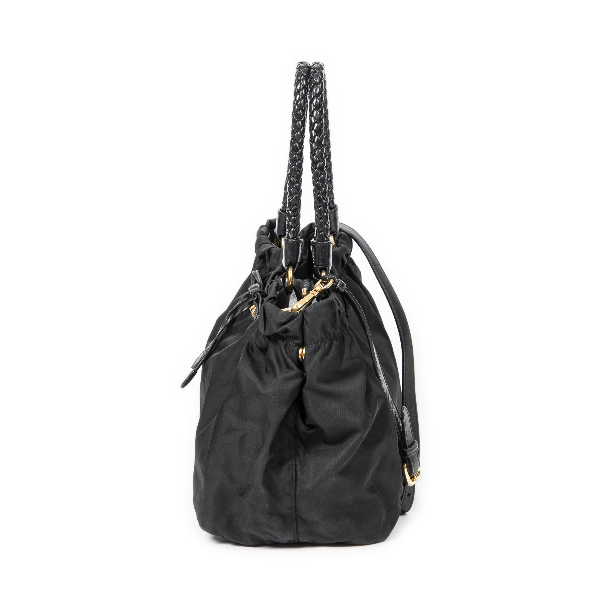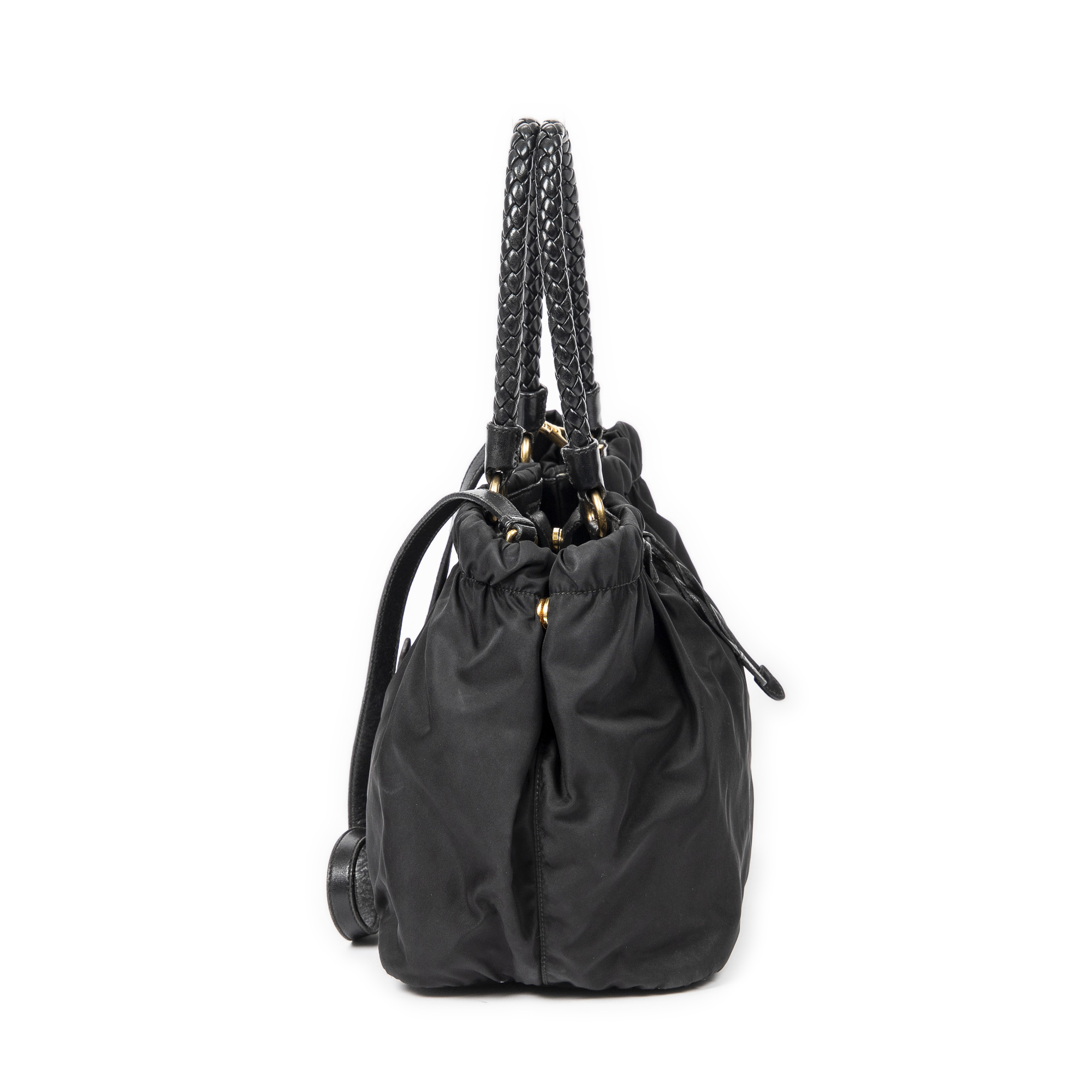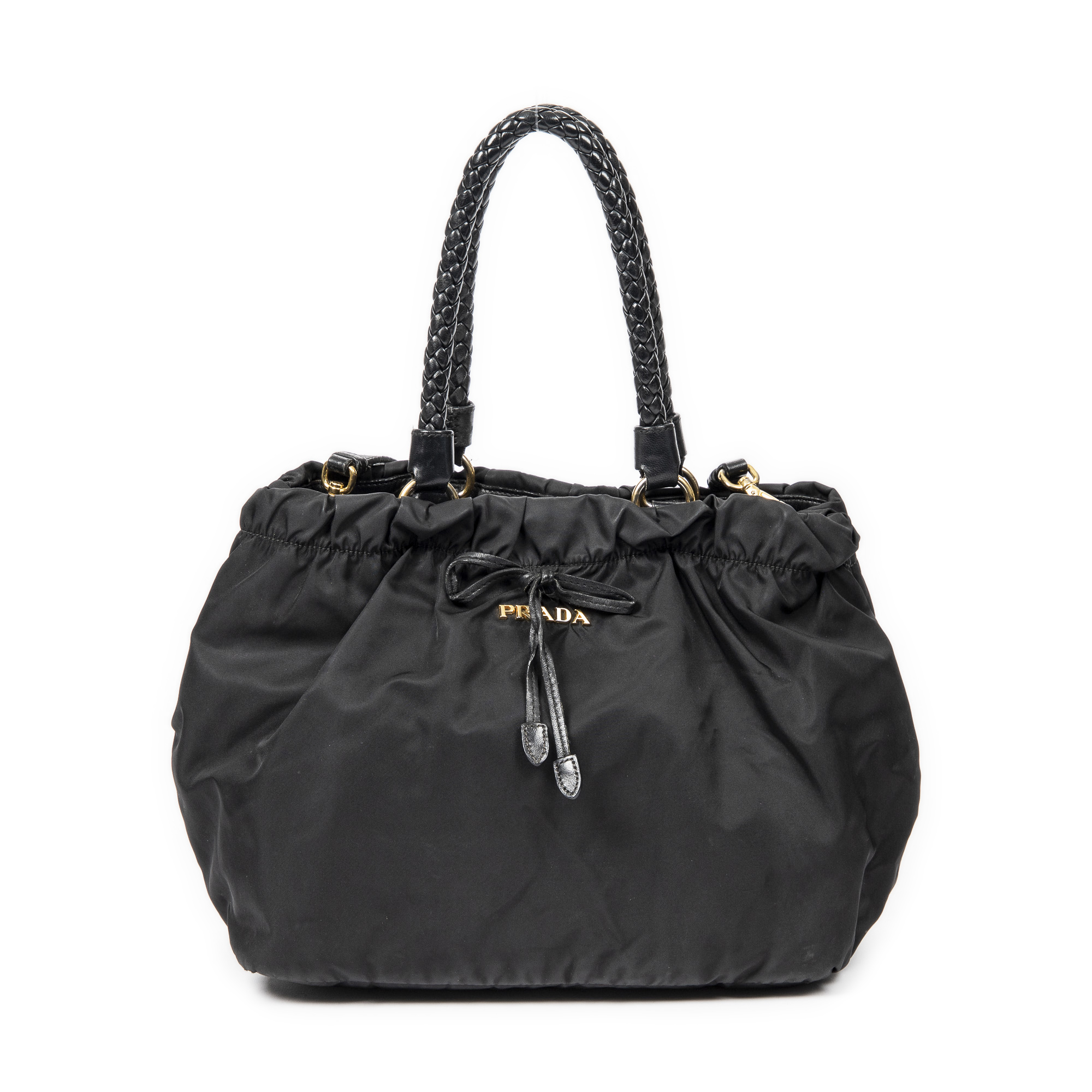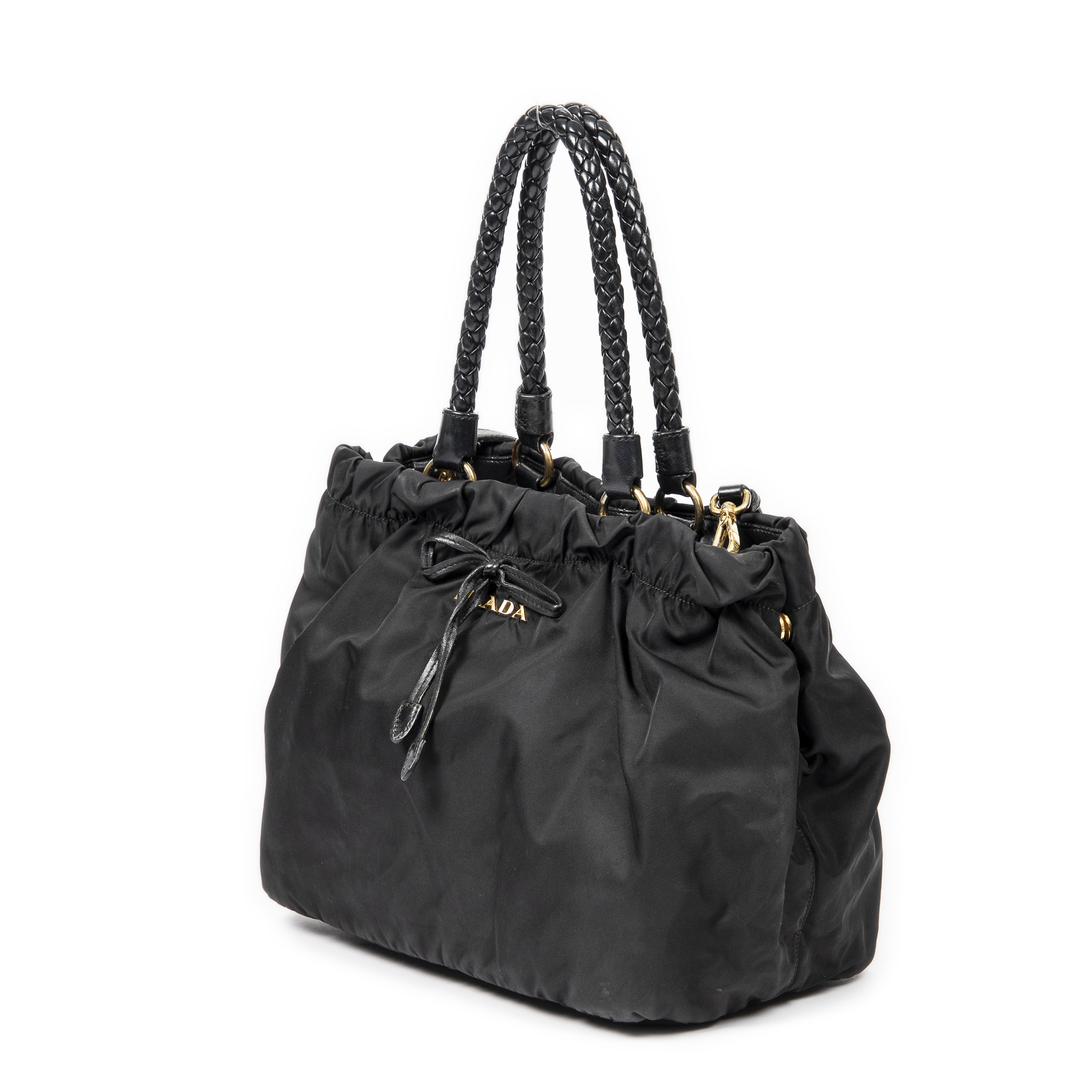 Prada Shoulder Bag Braided Bow Tote in Black Nylon Canvas and Gold hardware. The product is in Very Good Condition (AB).