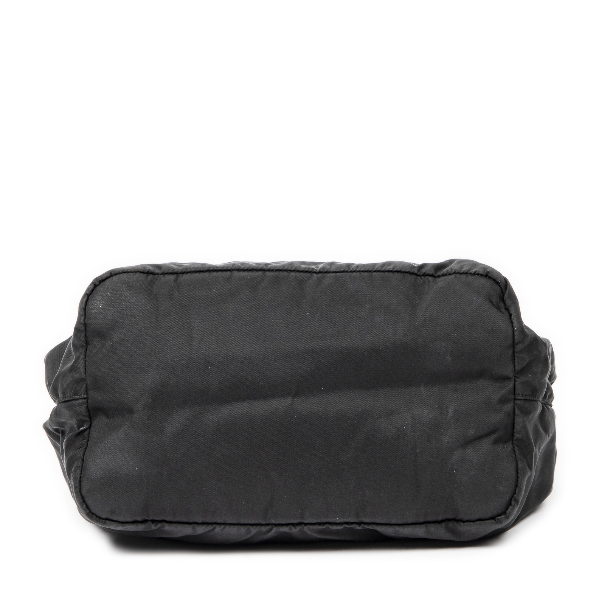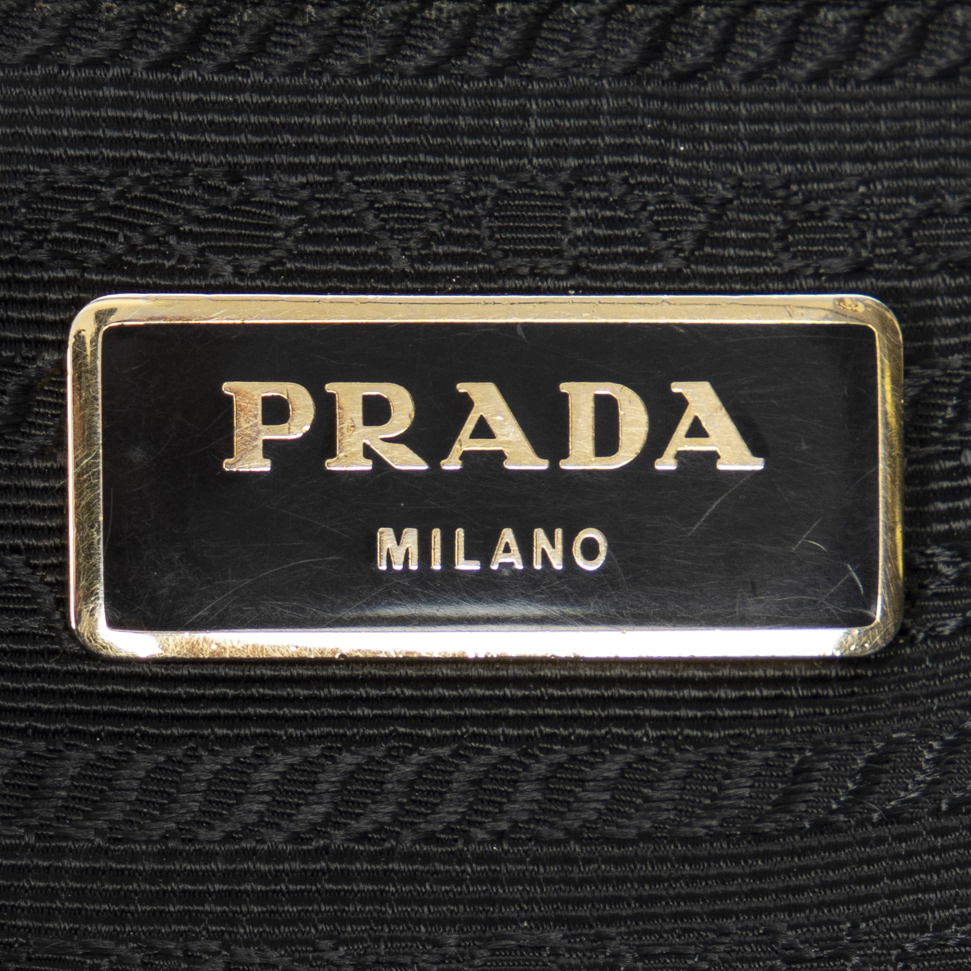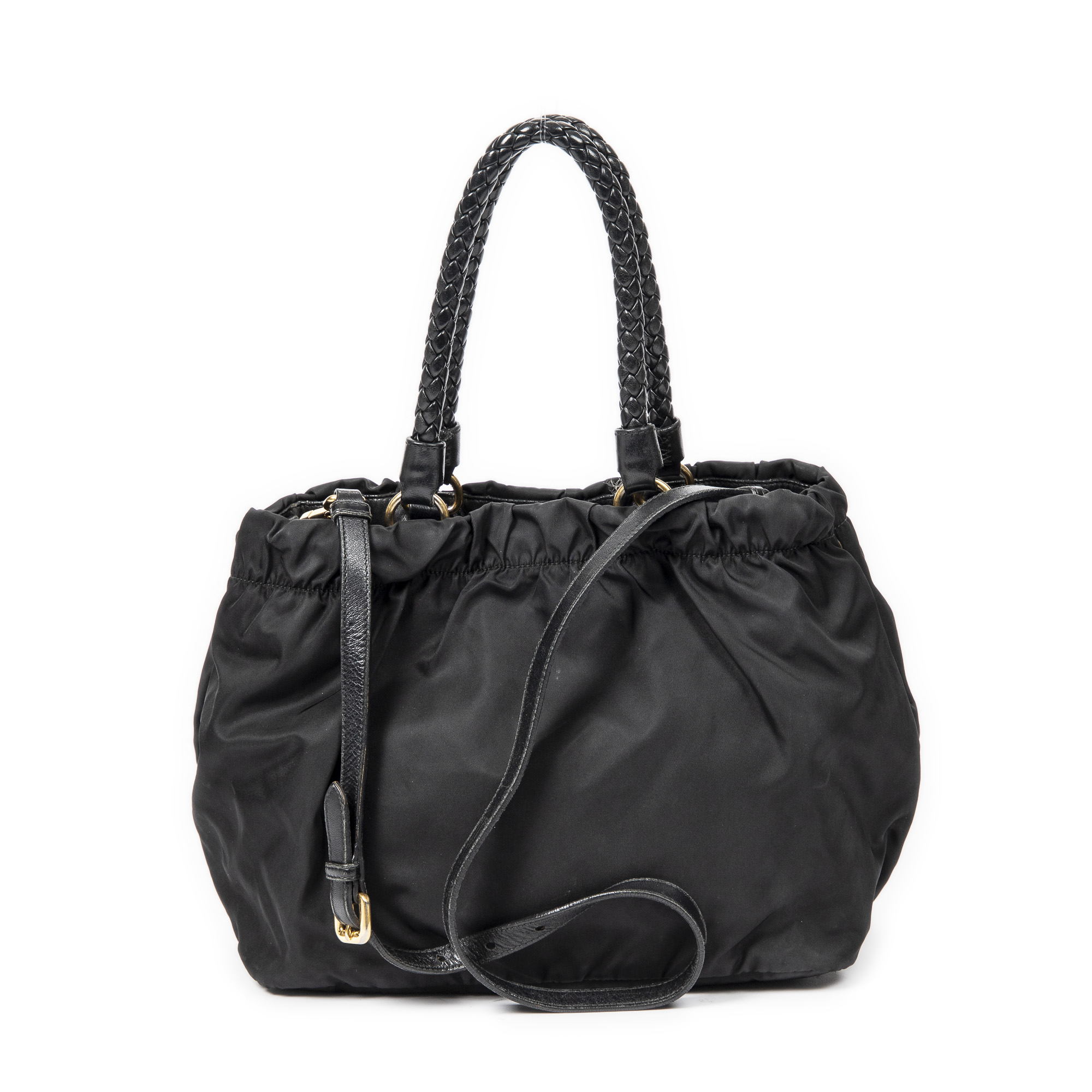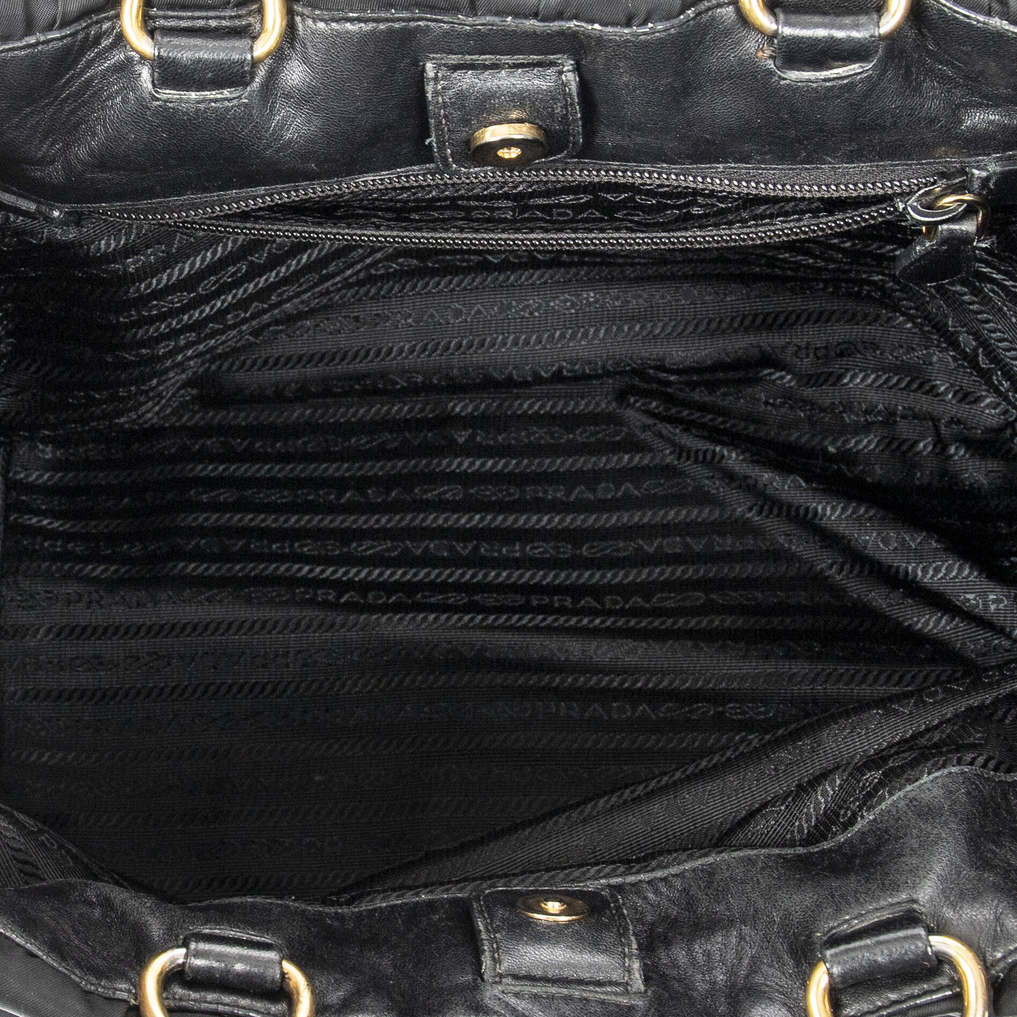 Prada Shoulder Bag Braided Bow Tote in Black Nylon Canvas and Gold hardware. The product is in Very Good Condition (AB).