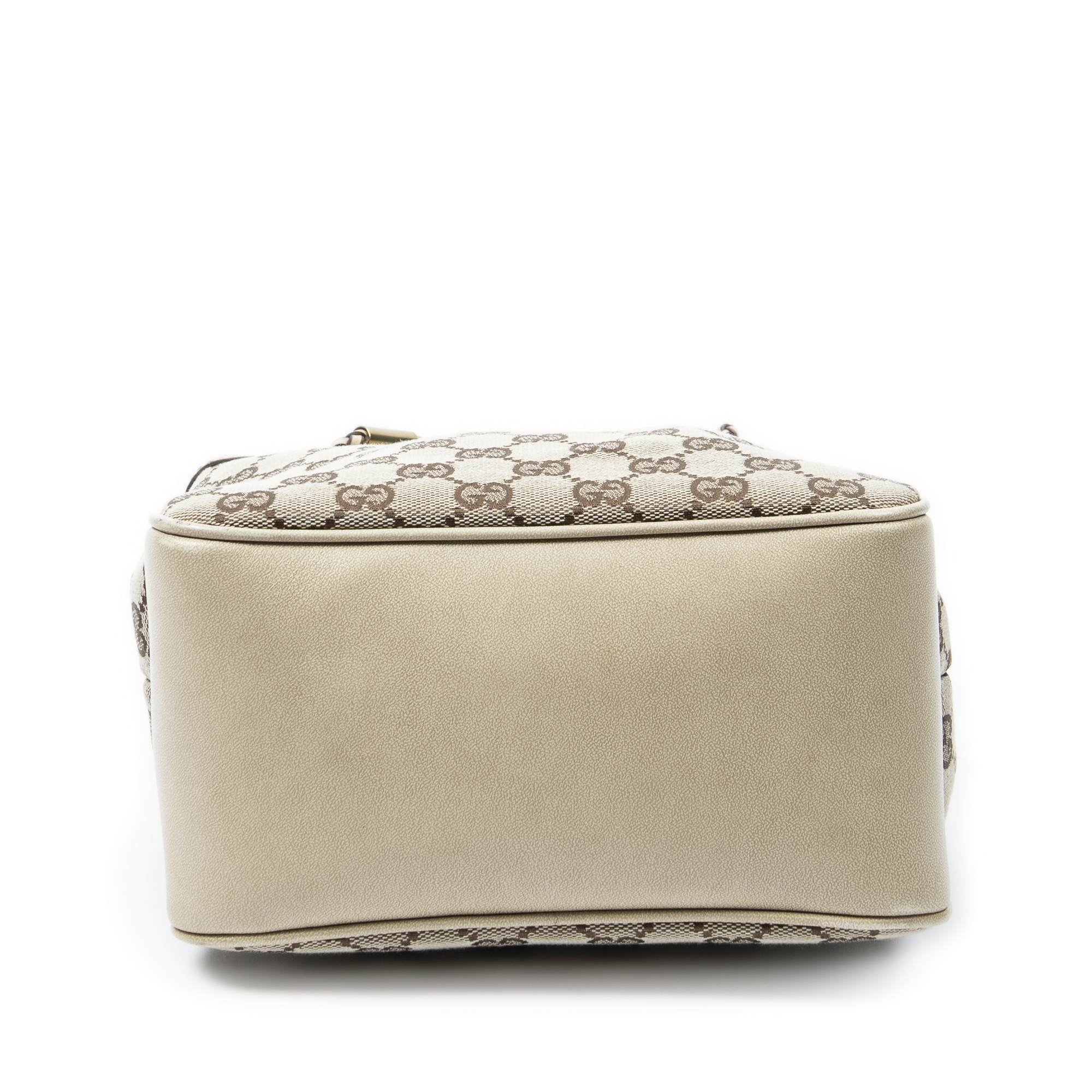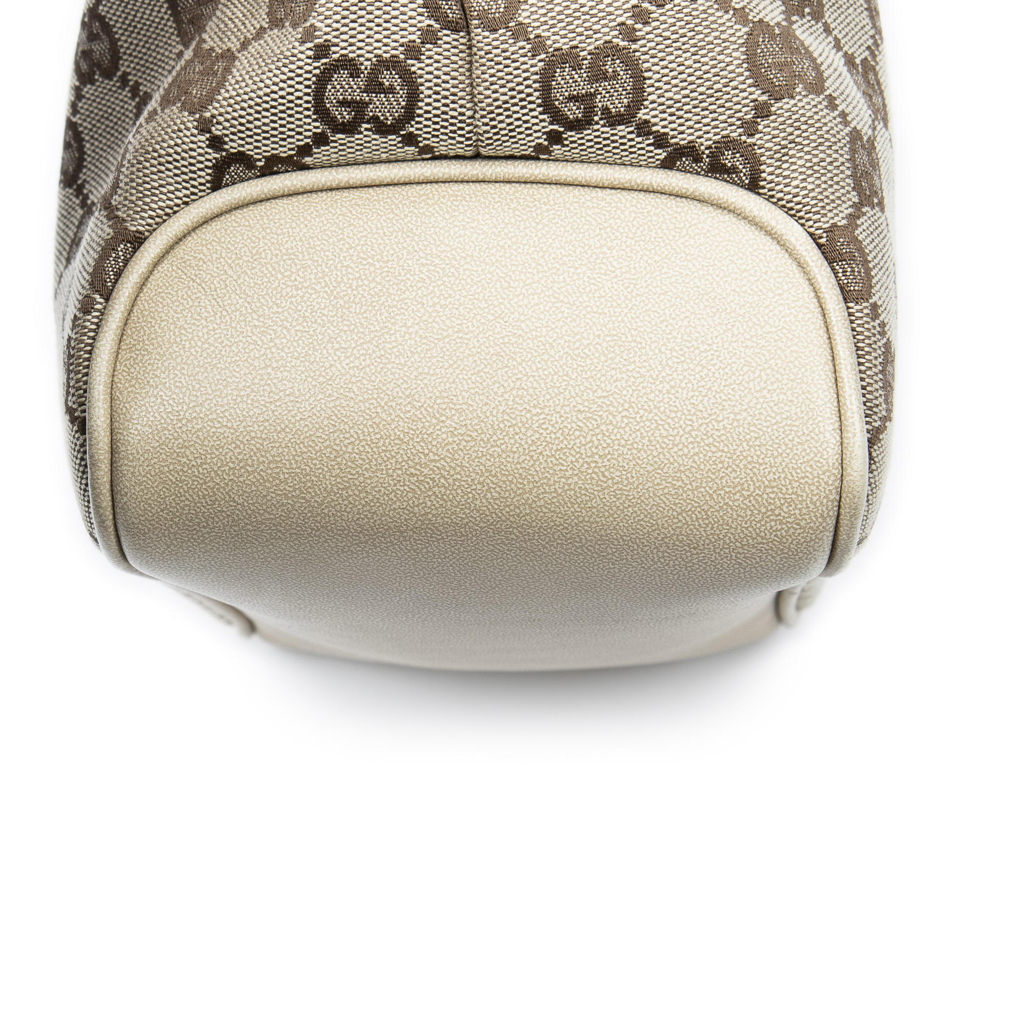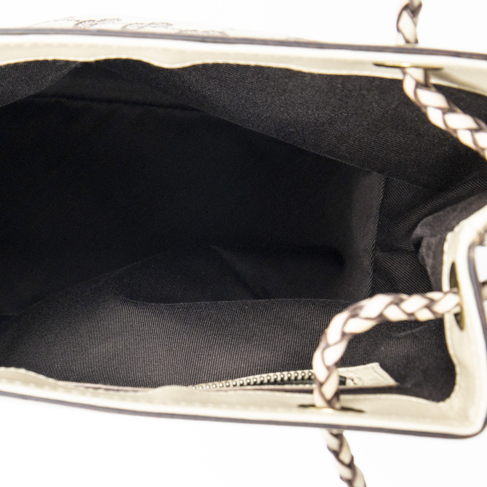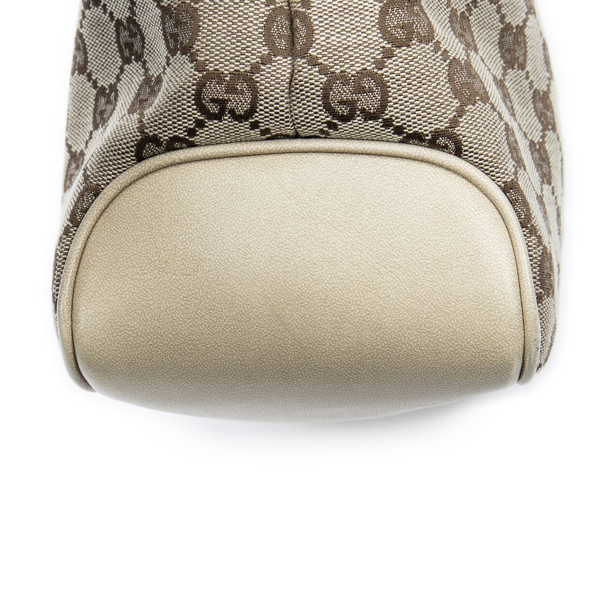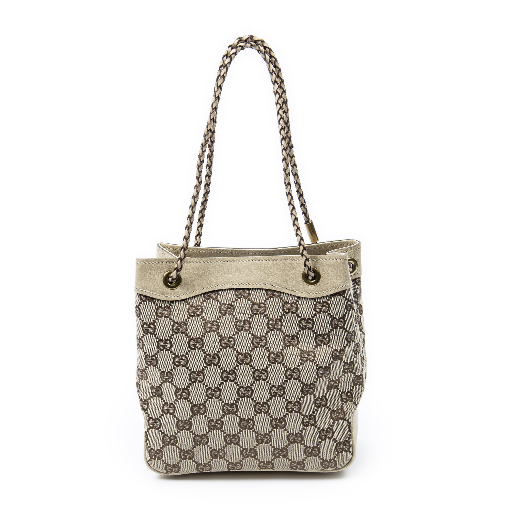 Gucci Shoulder Bag Braided Handle Open Tote in Beige Monogrammed Canvas and Gold hardware. The product is in Excellent Condition (A).