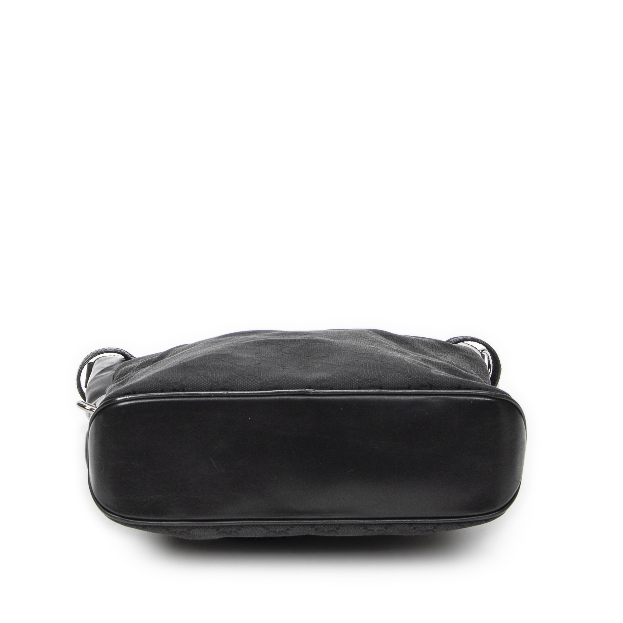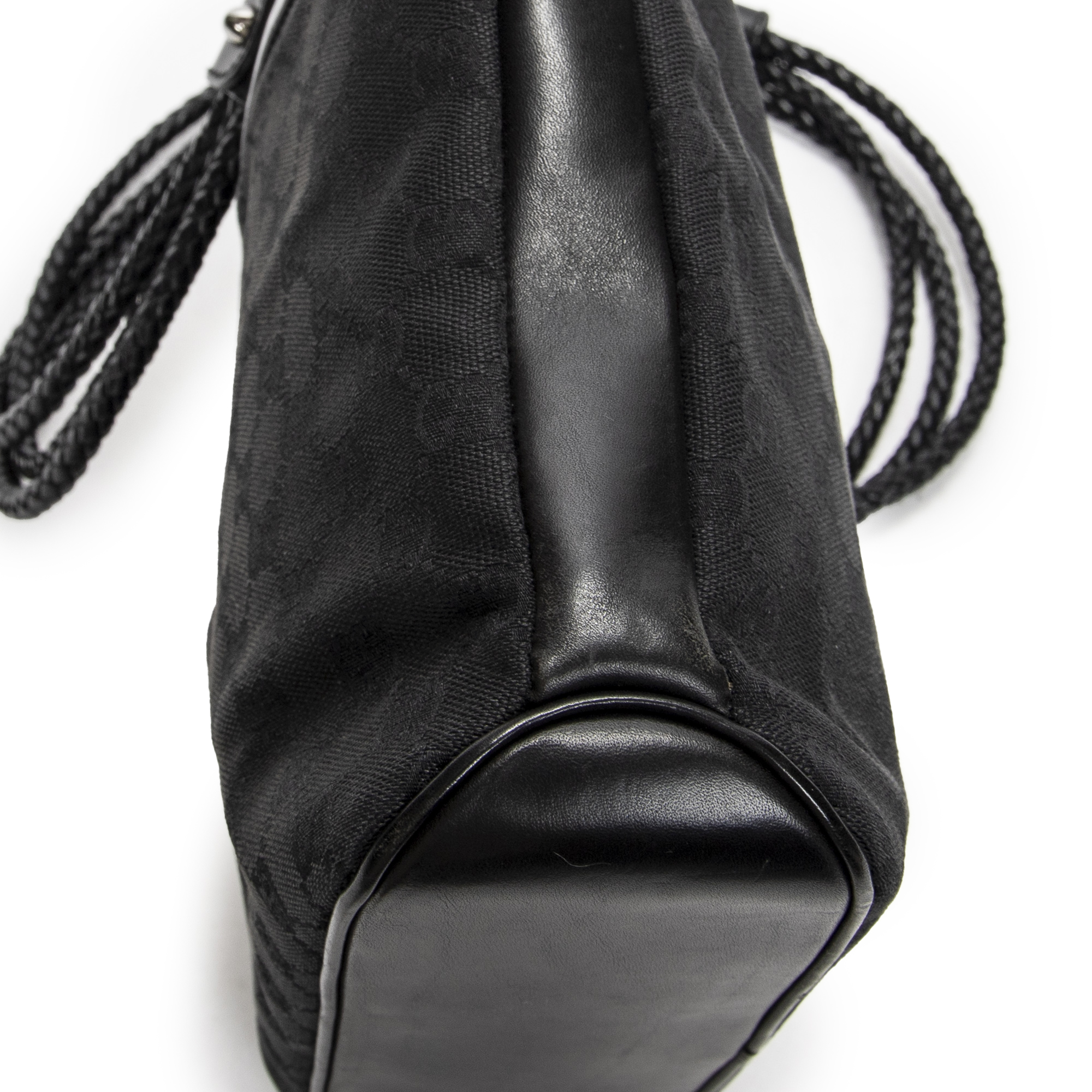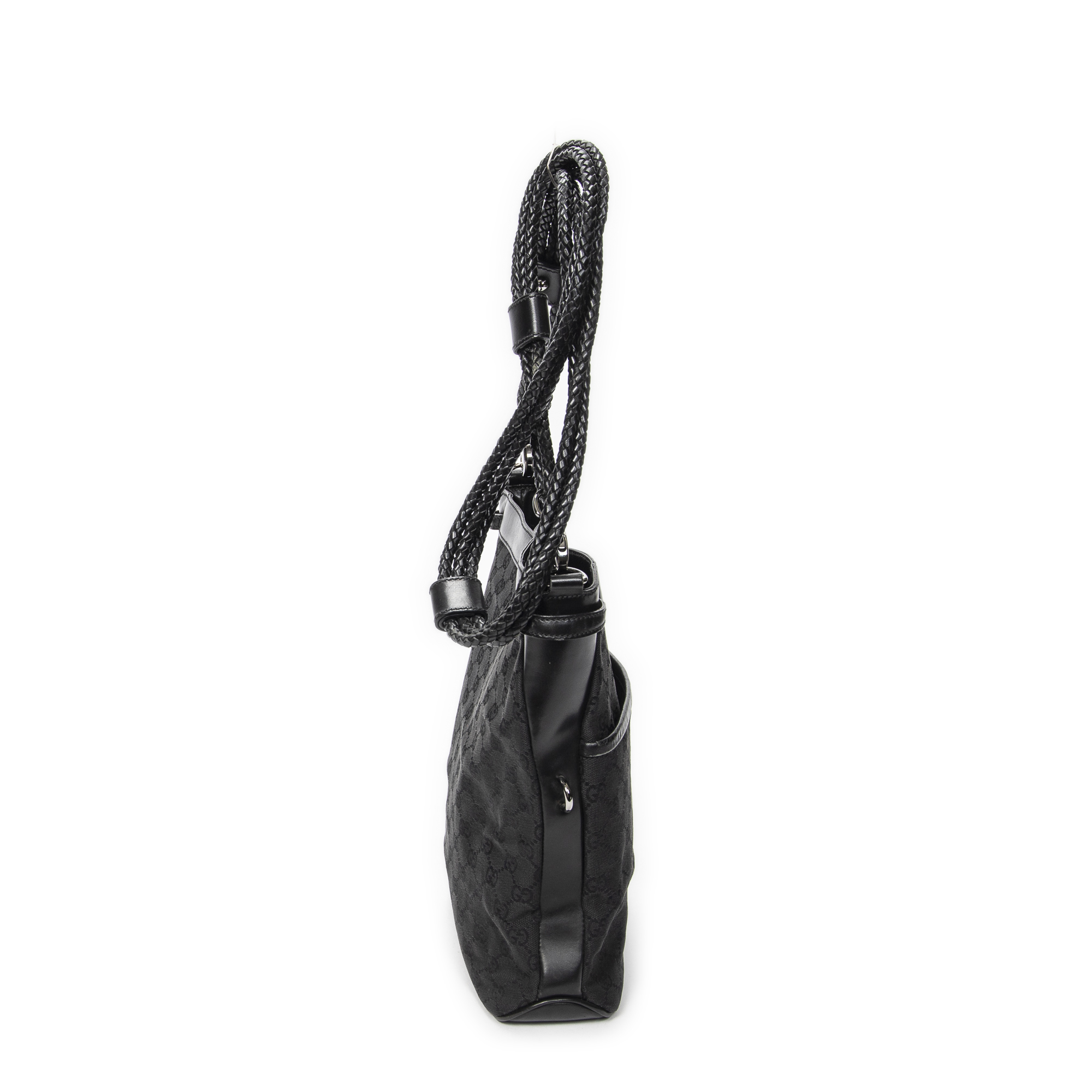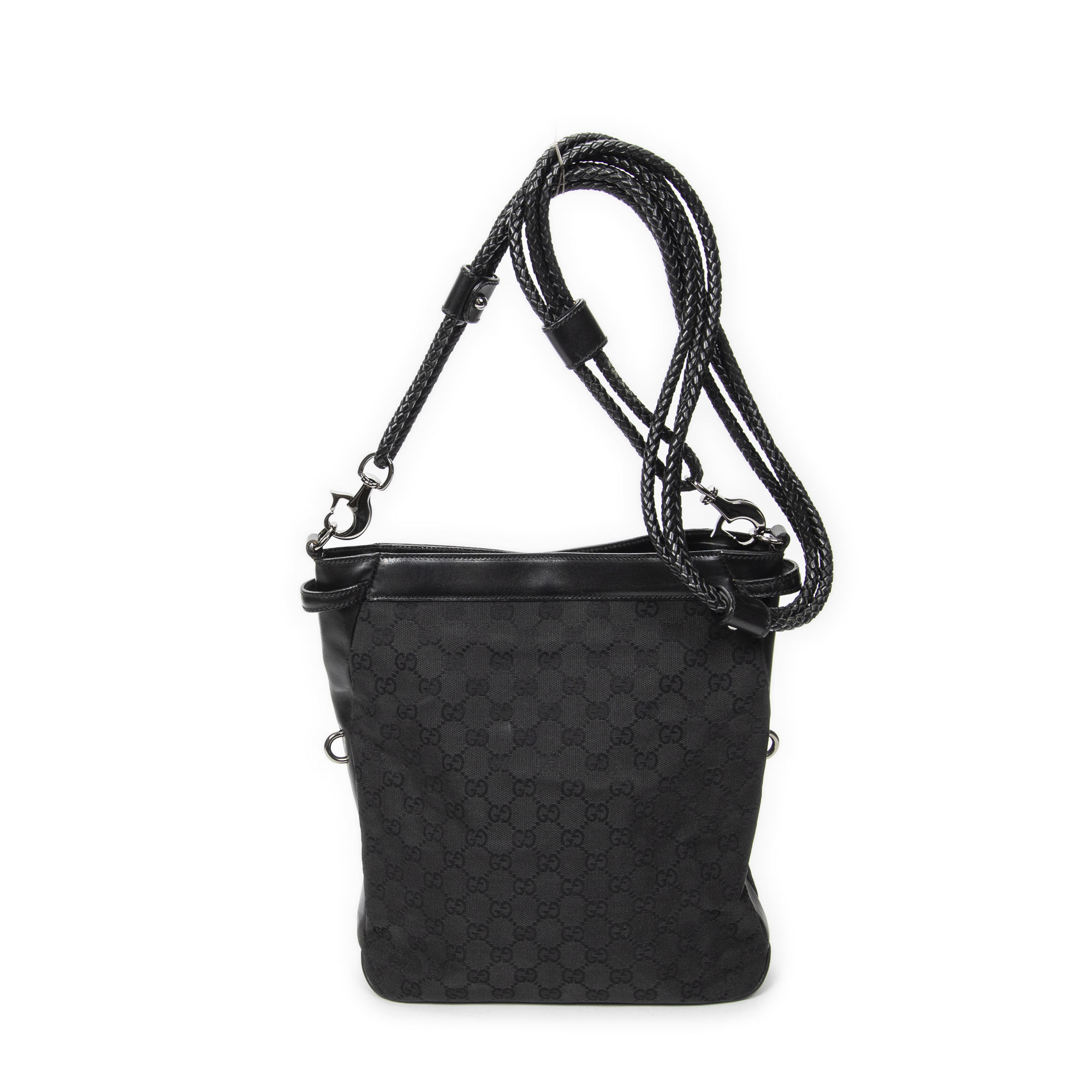 Gucci Shoulder Bag Braided Strap Crossbody in Black Monogrammed Canvas and Silver hardware. The product is in Excellent Condition (A).