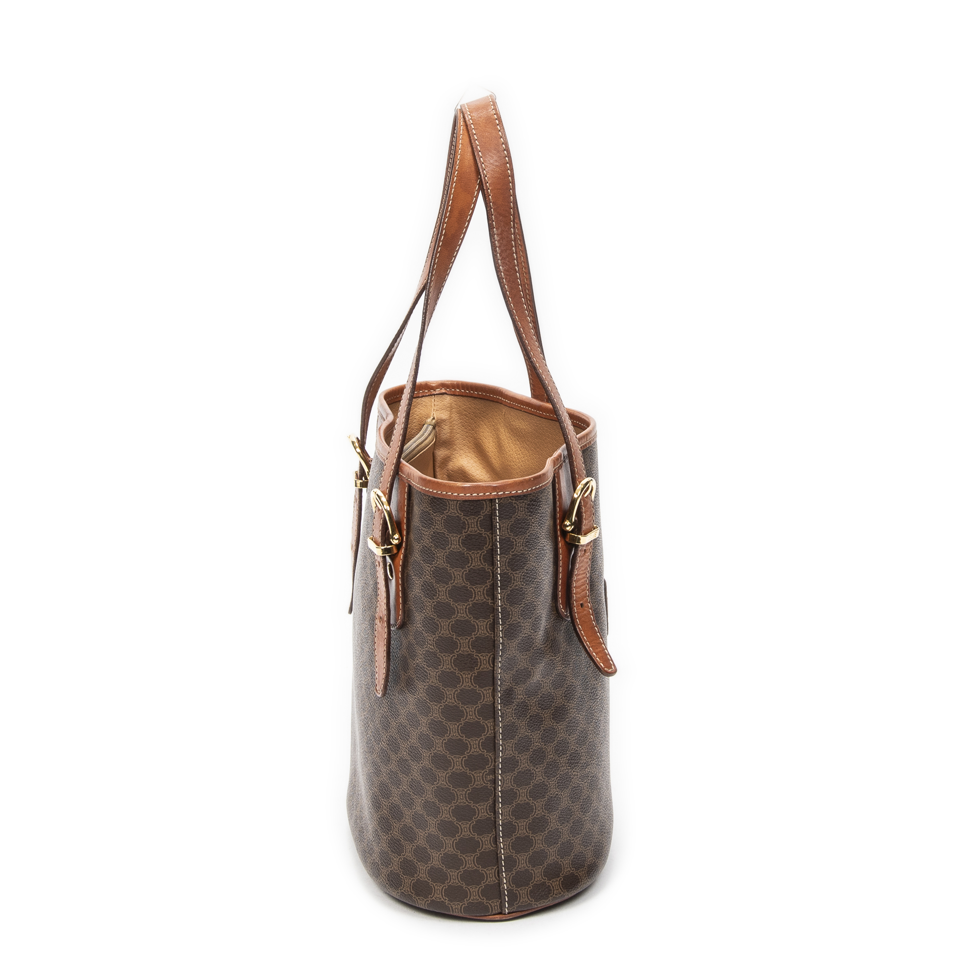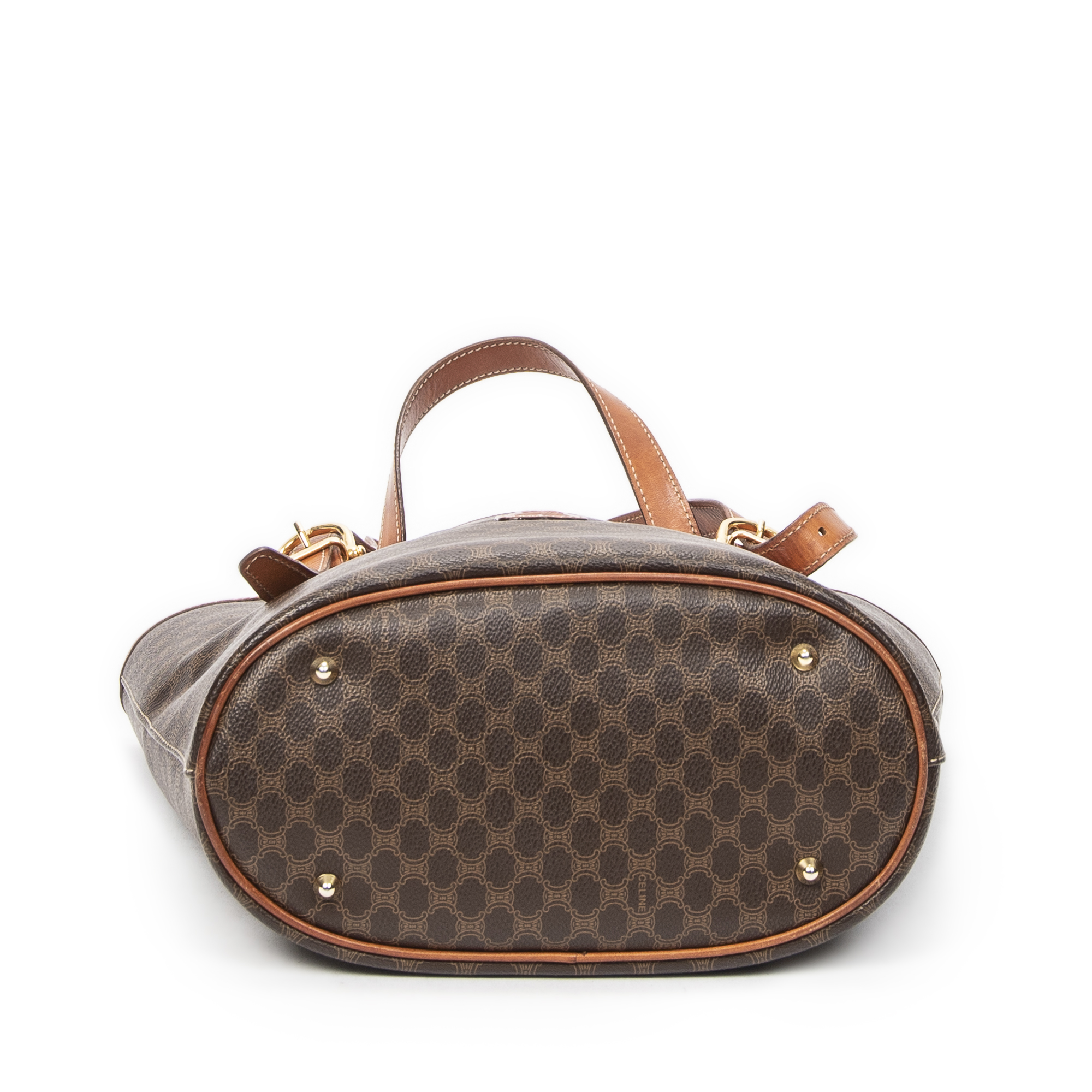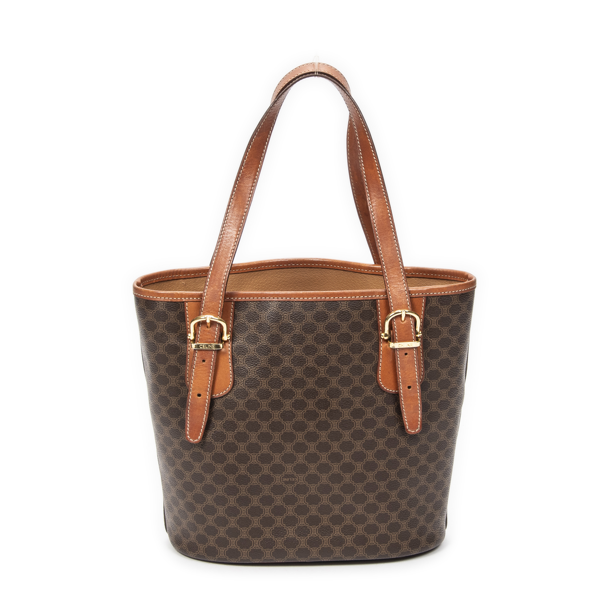 Celine Shoulder Bag Bucket Tote in Brown Macadam Coated Canvas and Gold hardware. The product is in Very Good Condition (AB).
