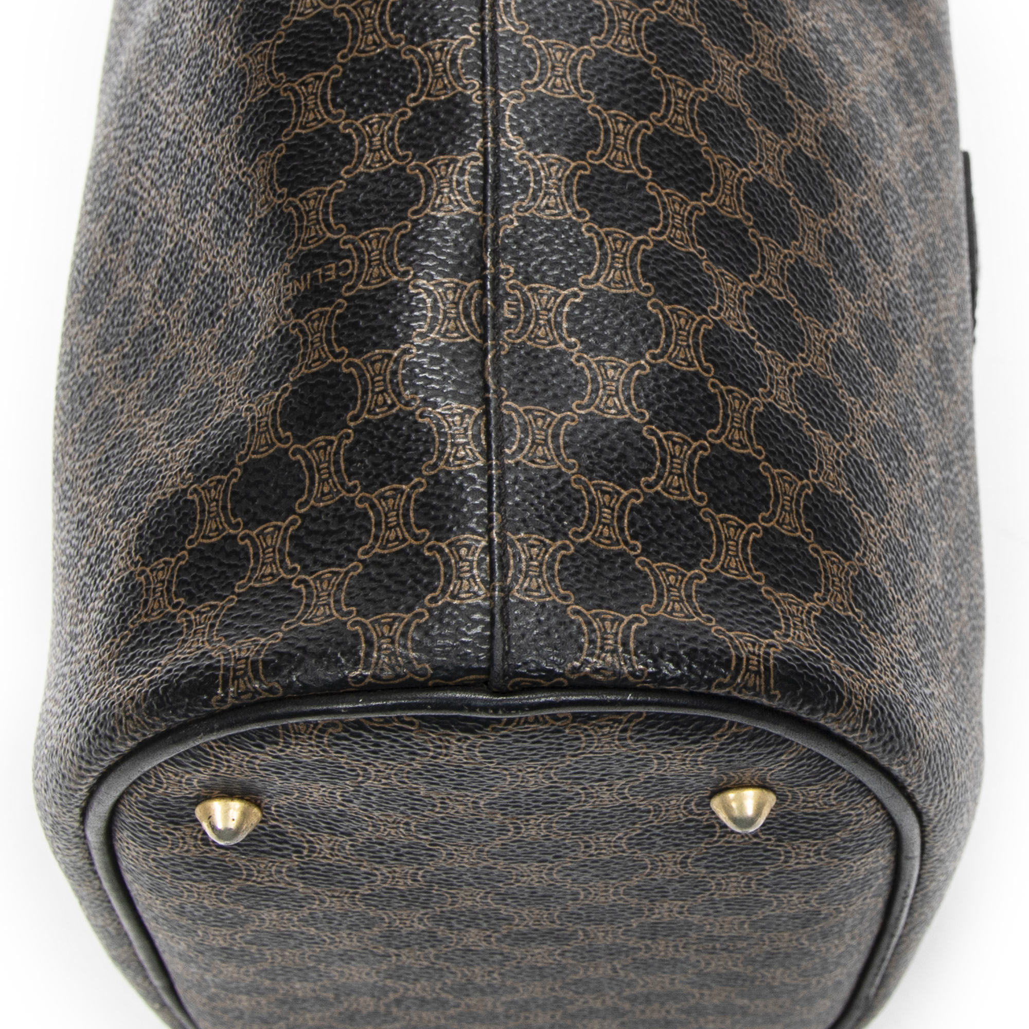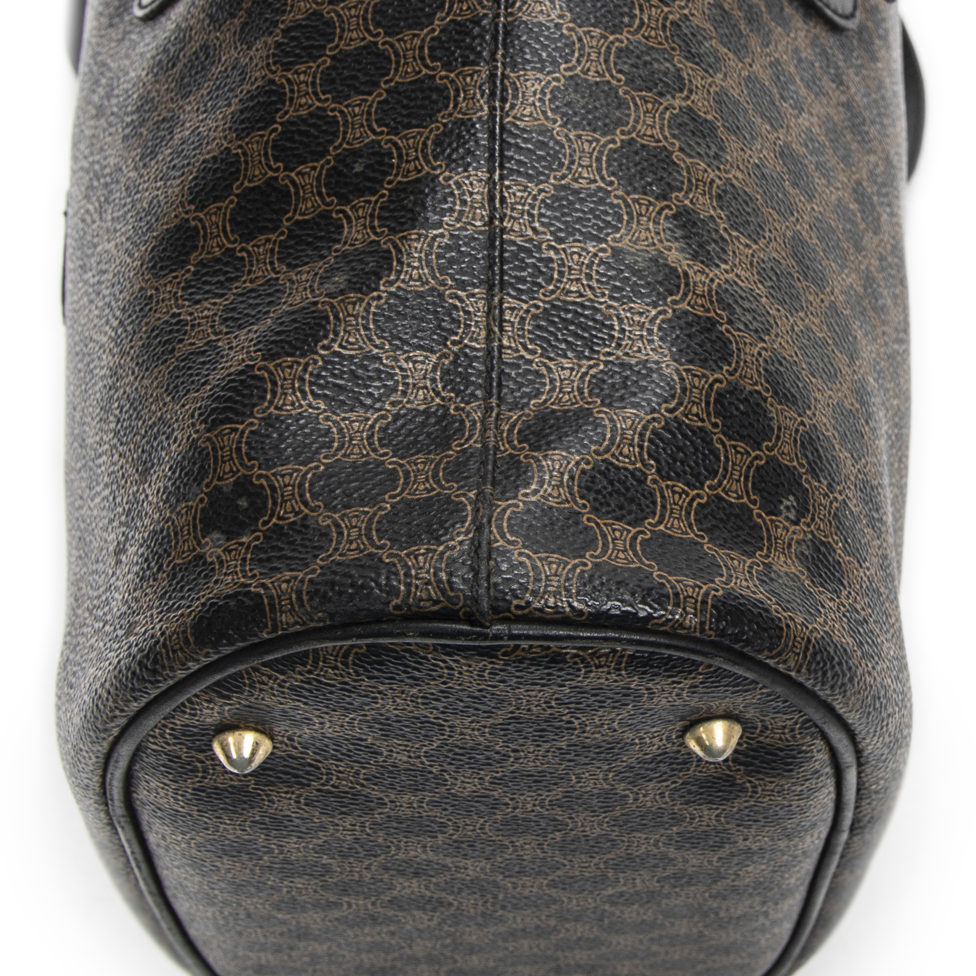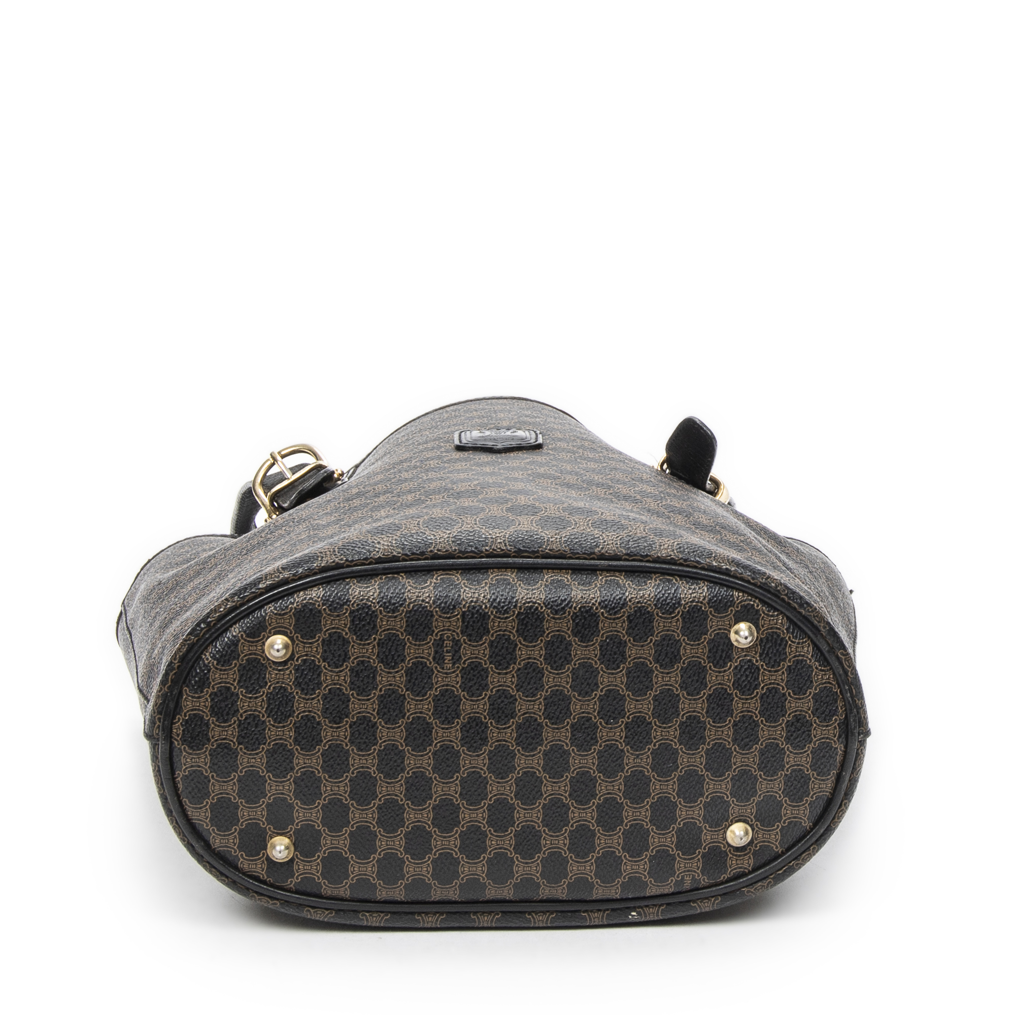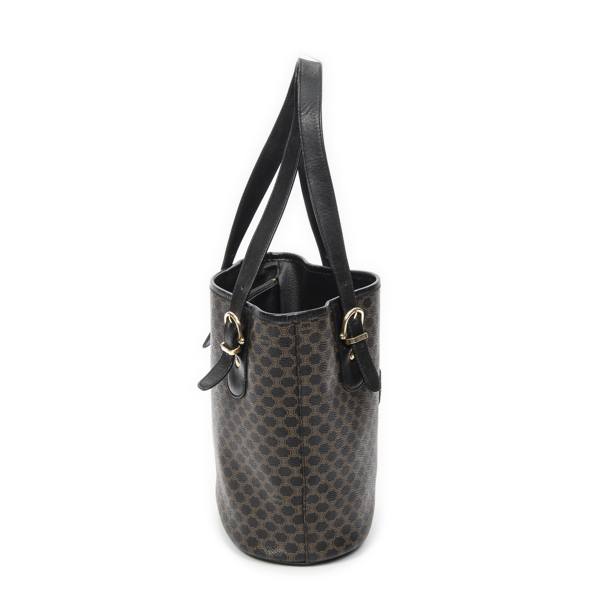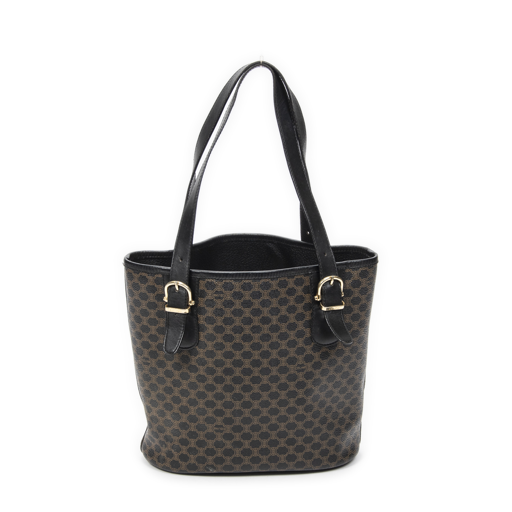Celine Shoulder Bag Bucket Tote in Black/Brown Macadam Coated Canvas and Gold hardware. The product is in Excellent Condition (A).