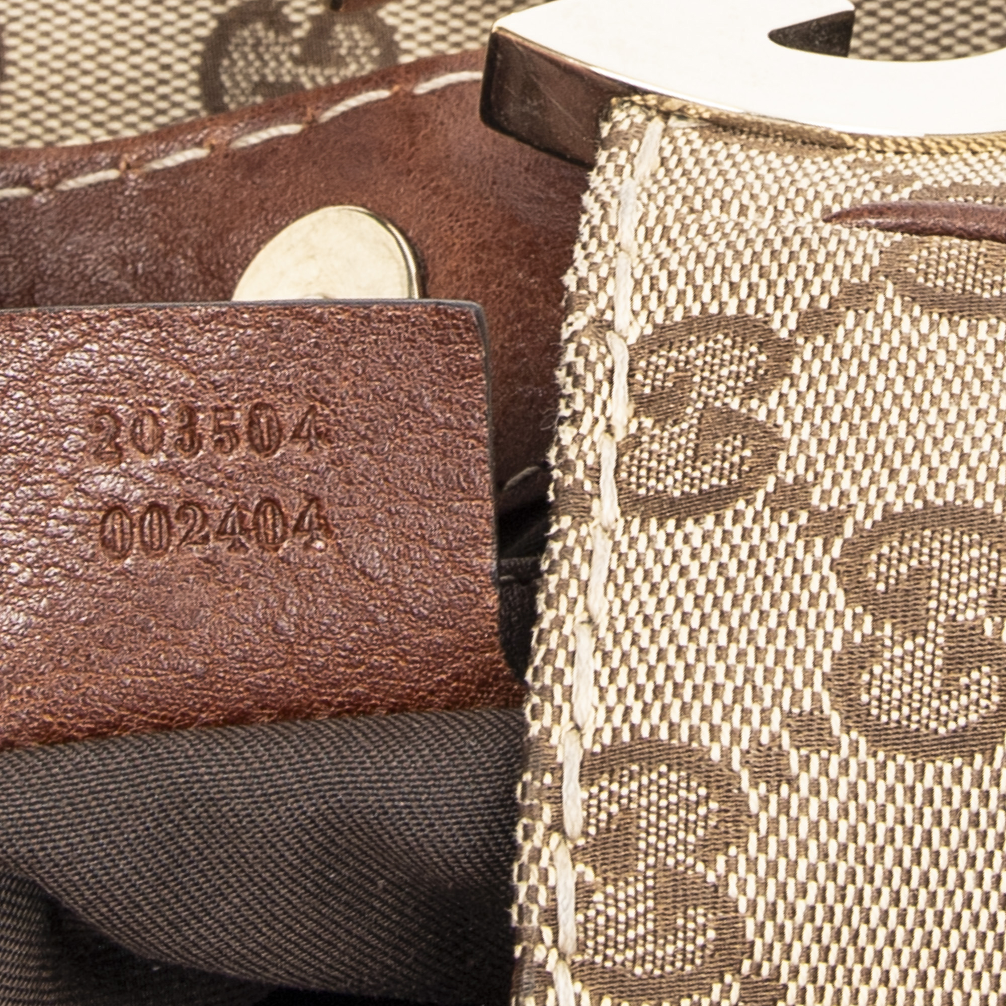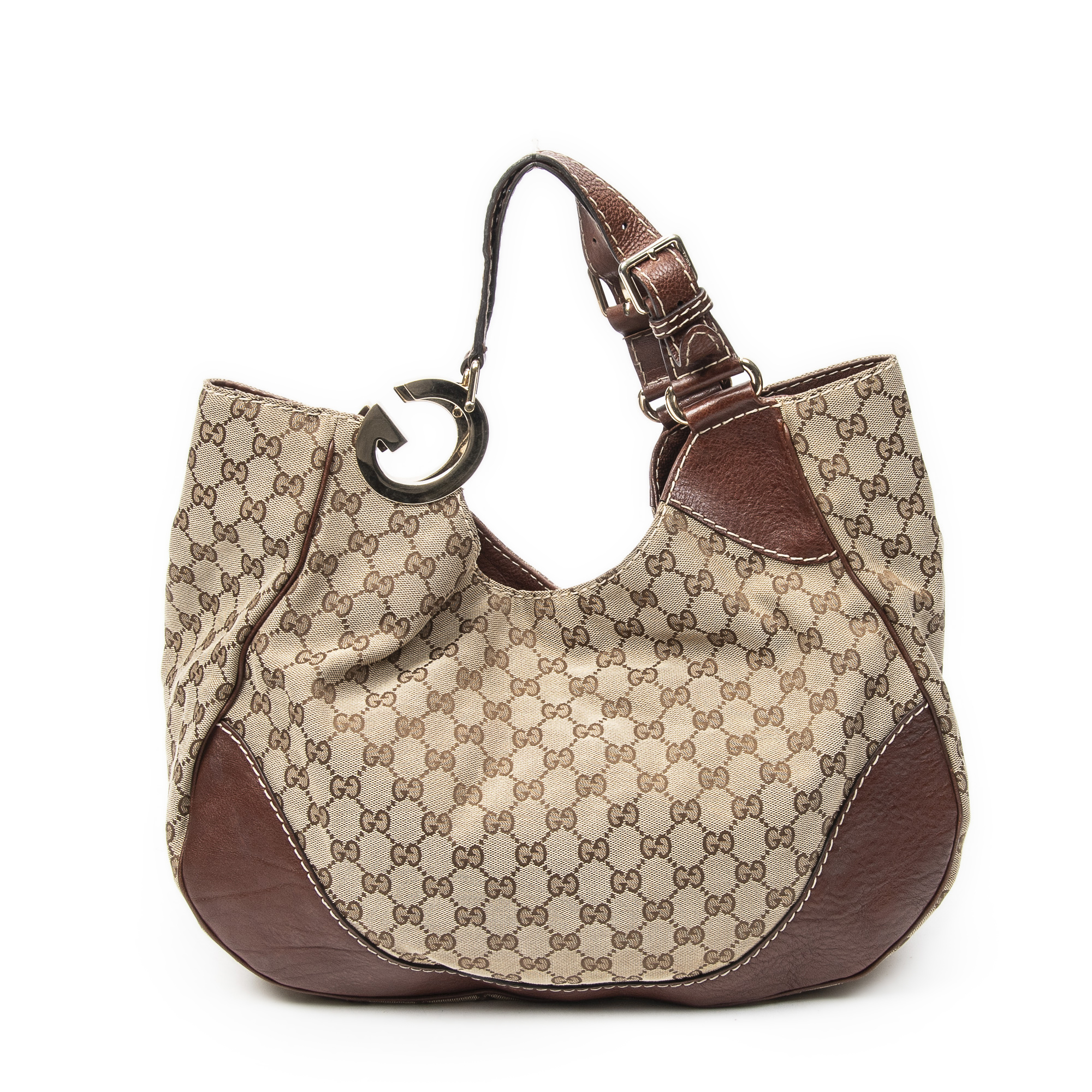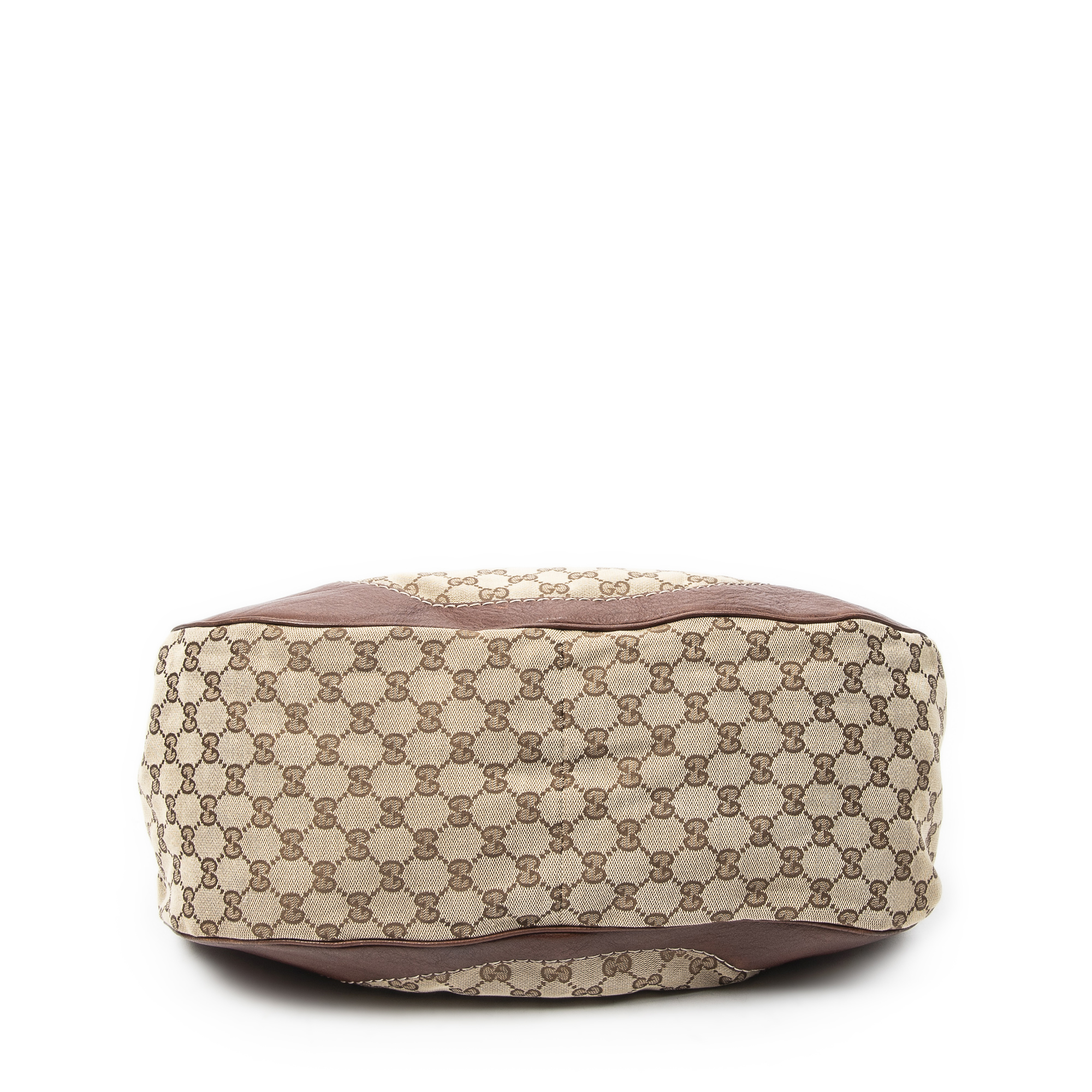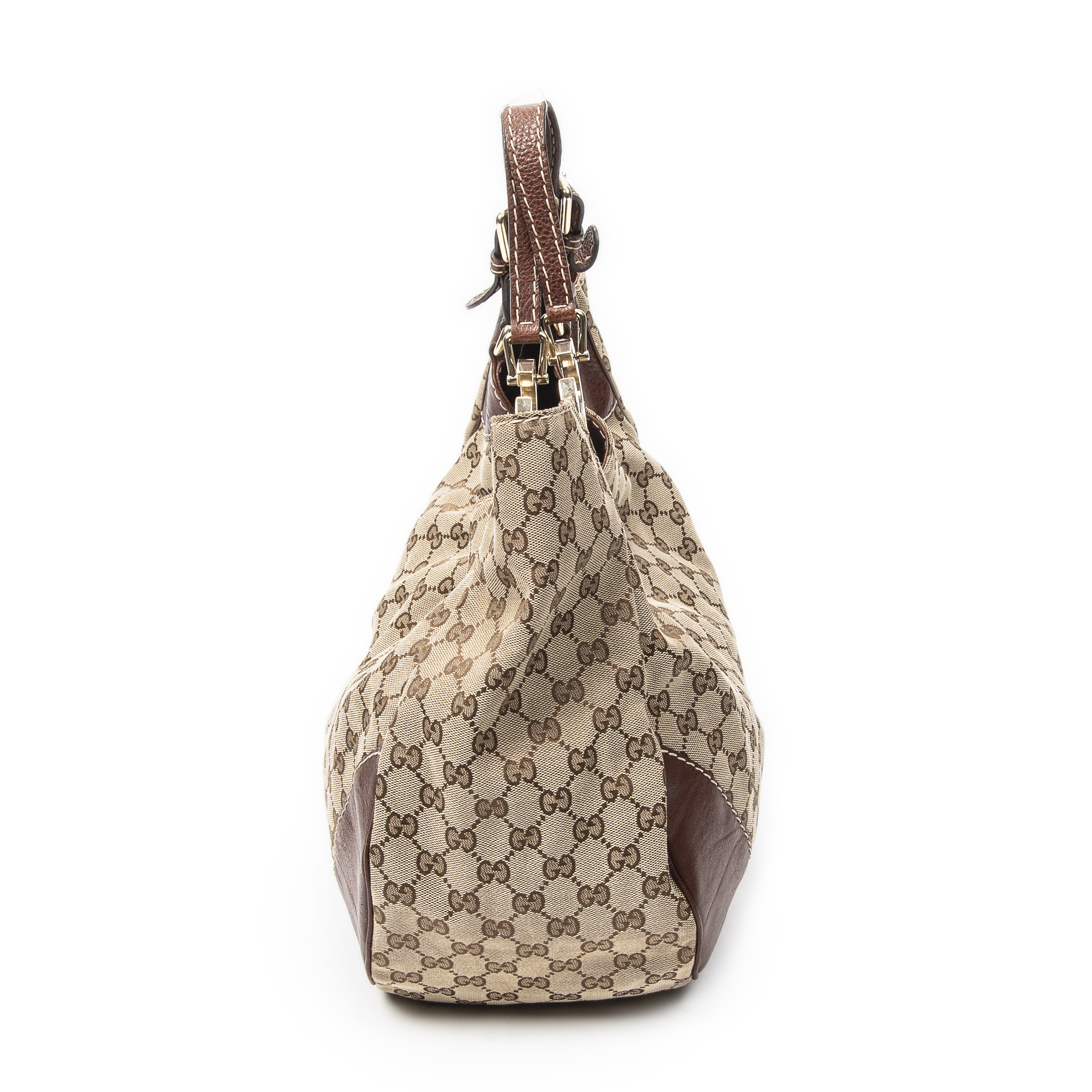 Gucci Shoulder Bag Charlotte Hobo in Beige/Brown Monogrammed Canvas and Gold hardware. The product is in Excellent Condition (A).