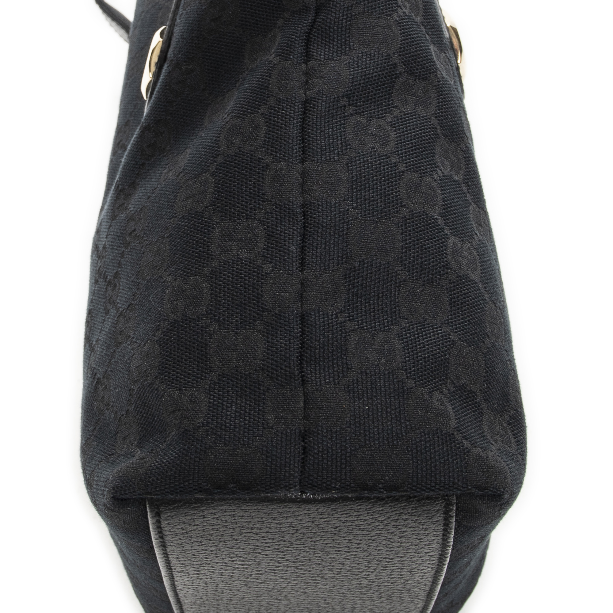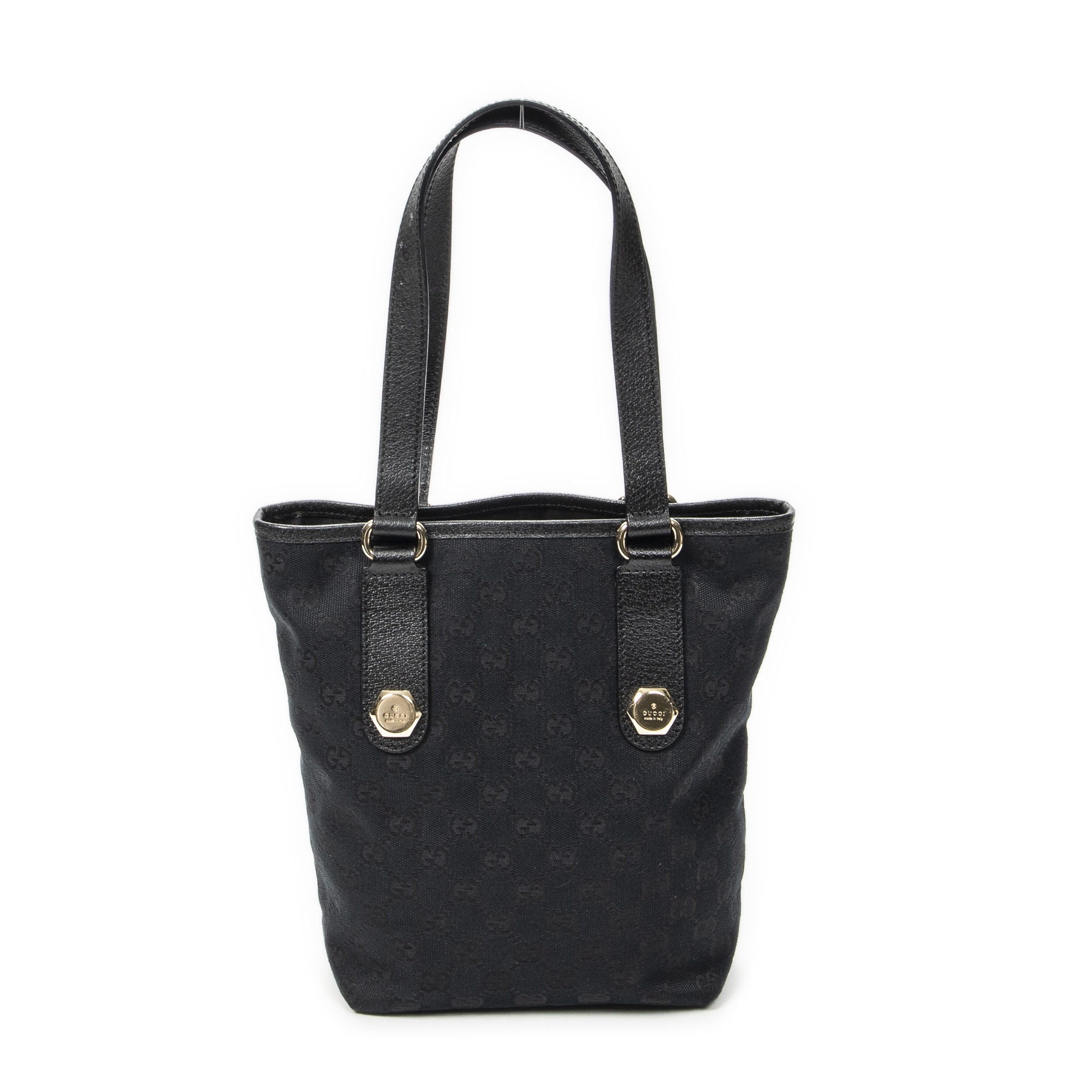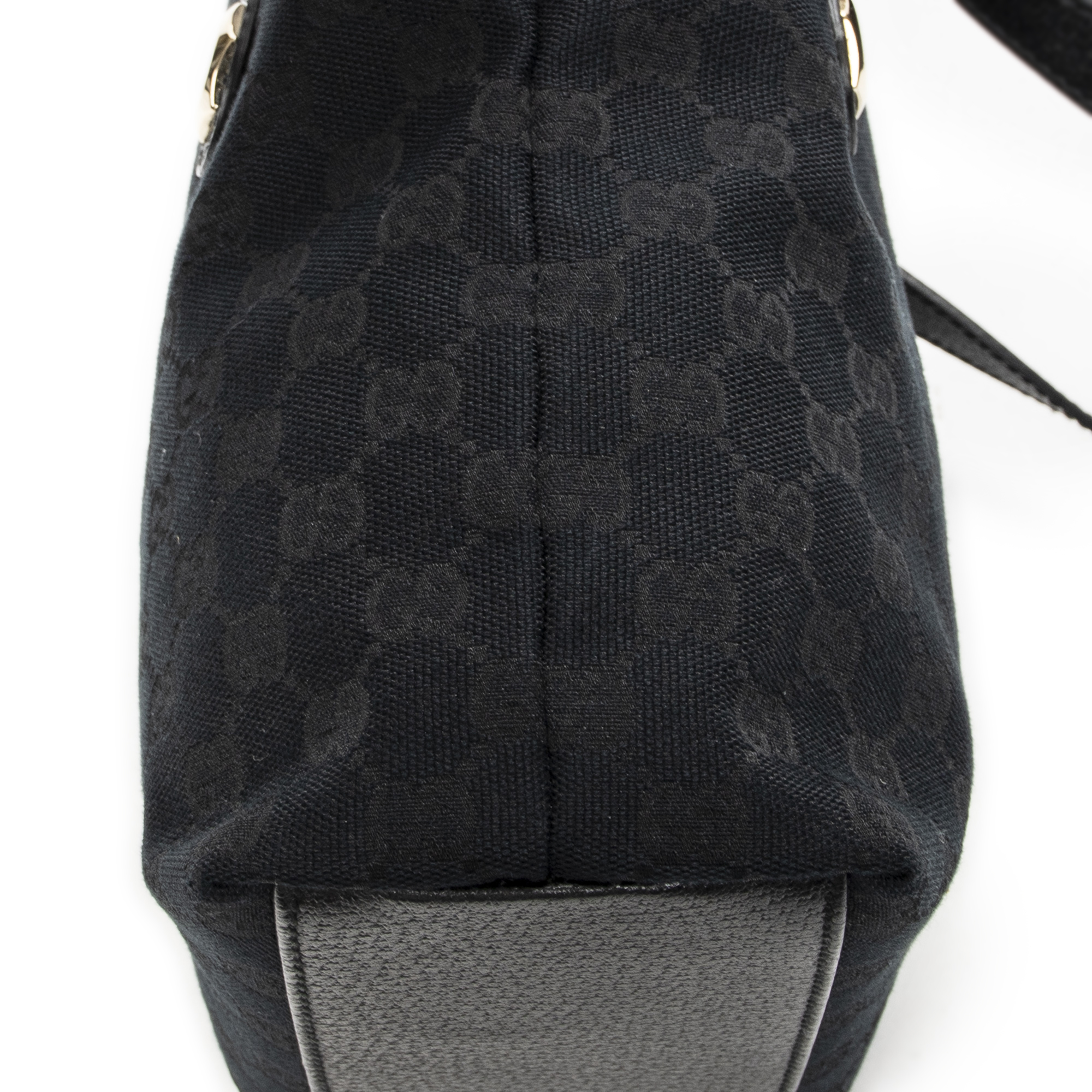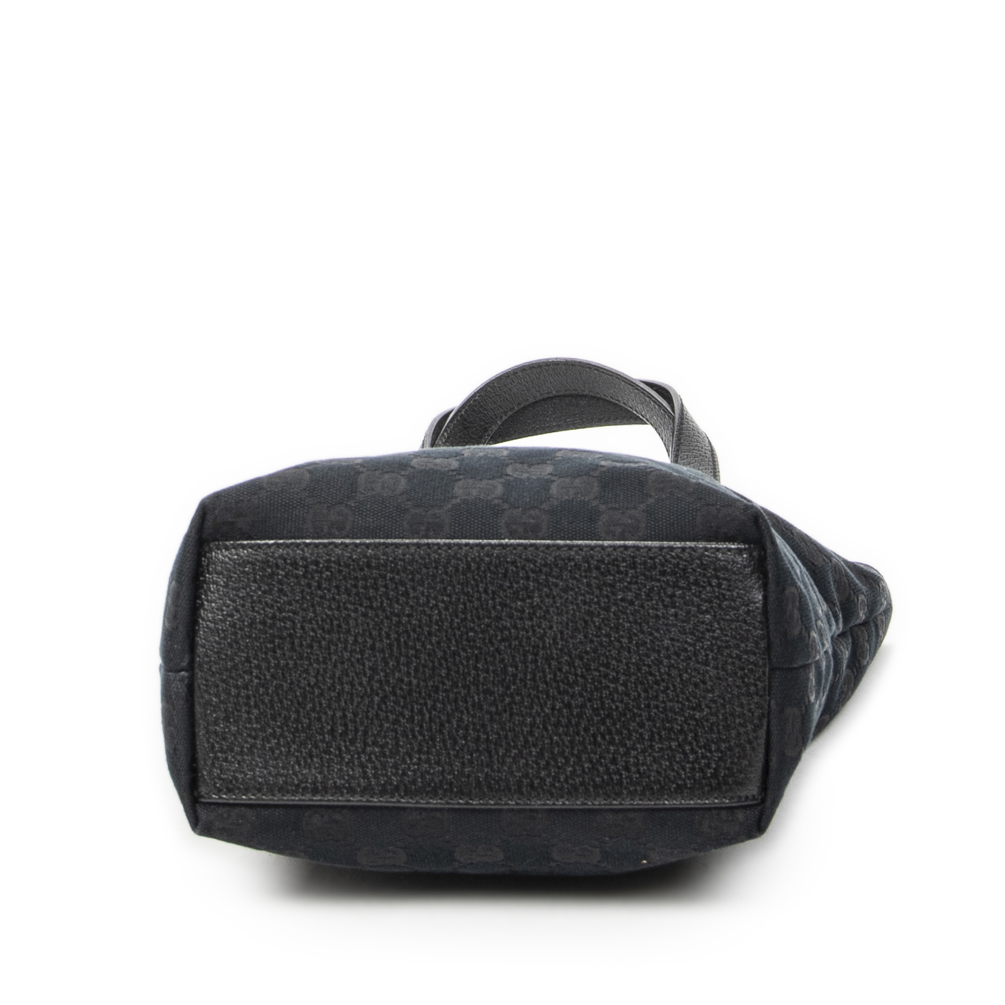 Gucci Shoulder Bag Charmy Bucket Tote in Black Monogrammed Canvas and Gold hardware. The product is in Excellent Condition (A).