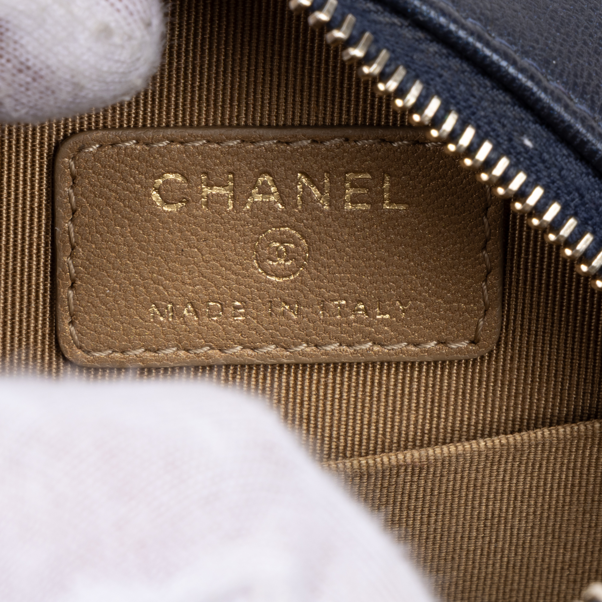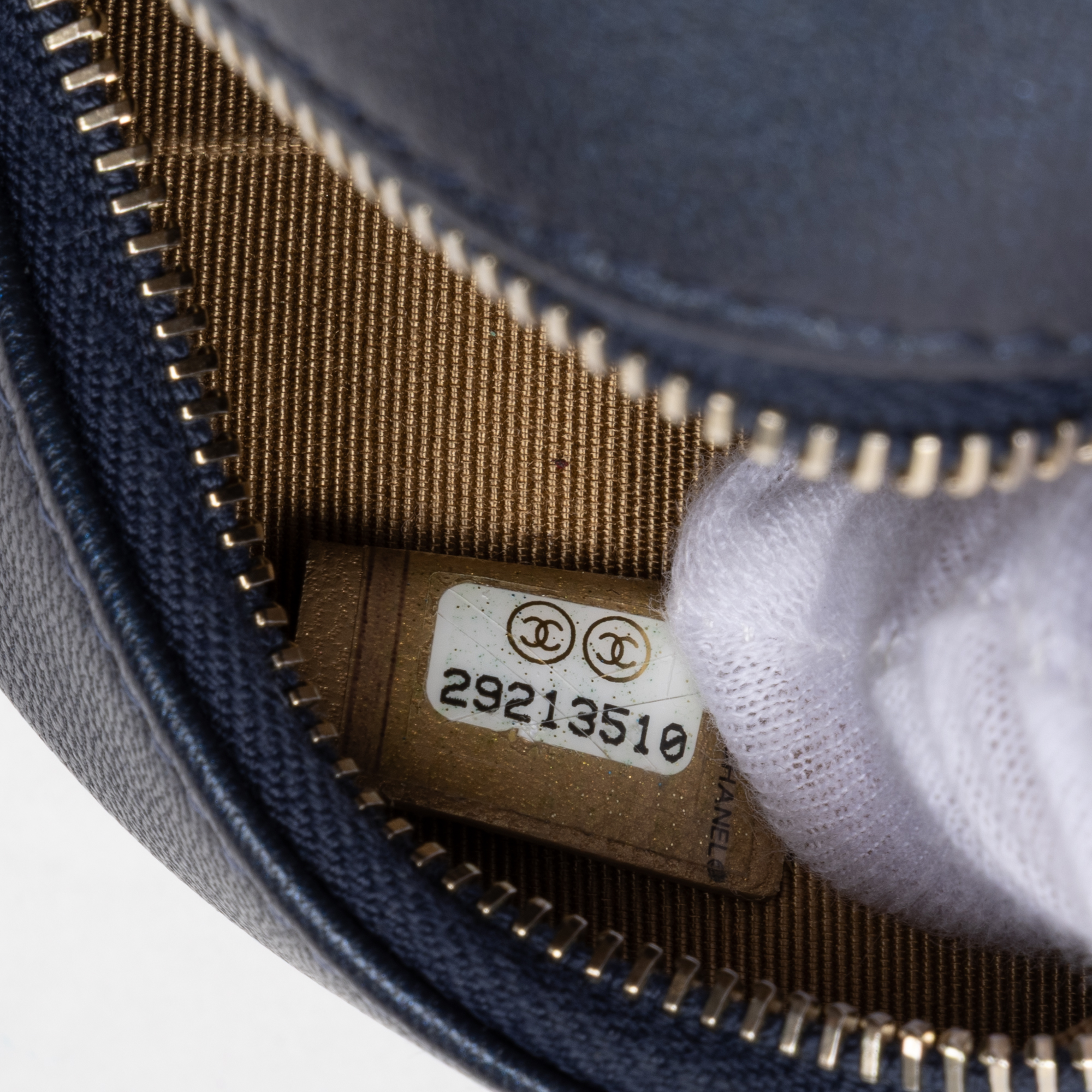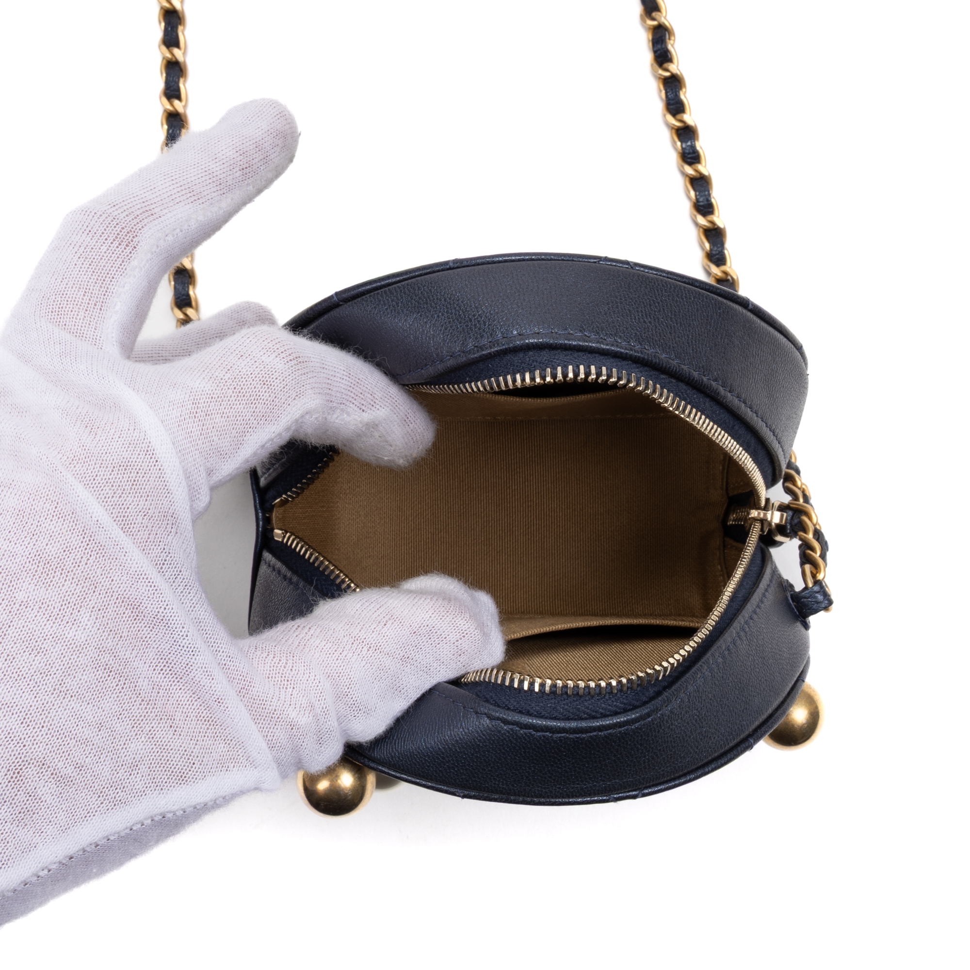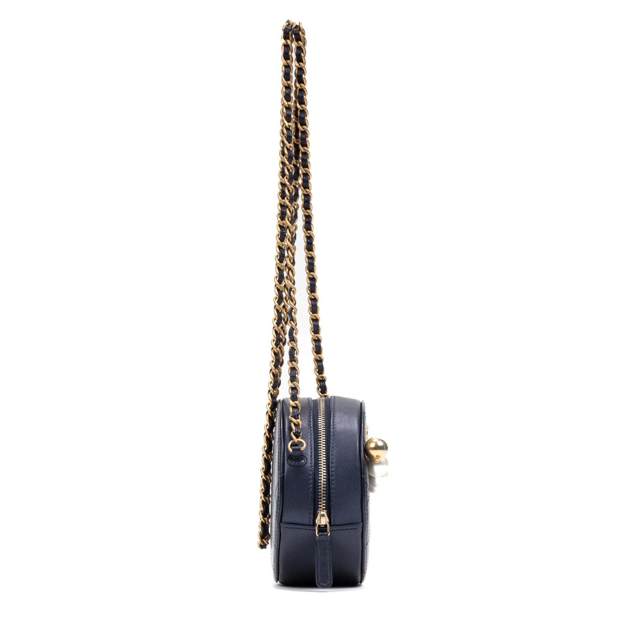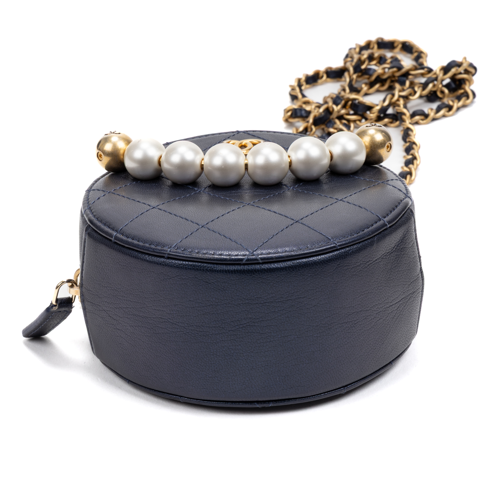 Chanel Shoulder Bag Chic Pearls Round Chain Clutch Mini in Blue Lambskin Quilted Leather and Gold hardware. The product is in Excellent Condition (A).