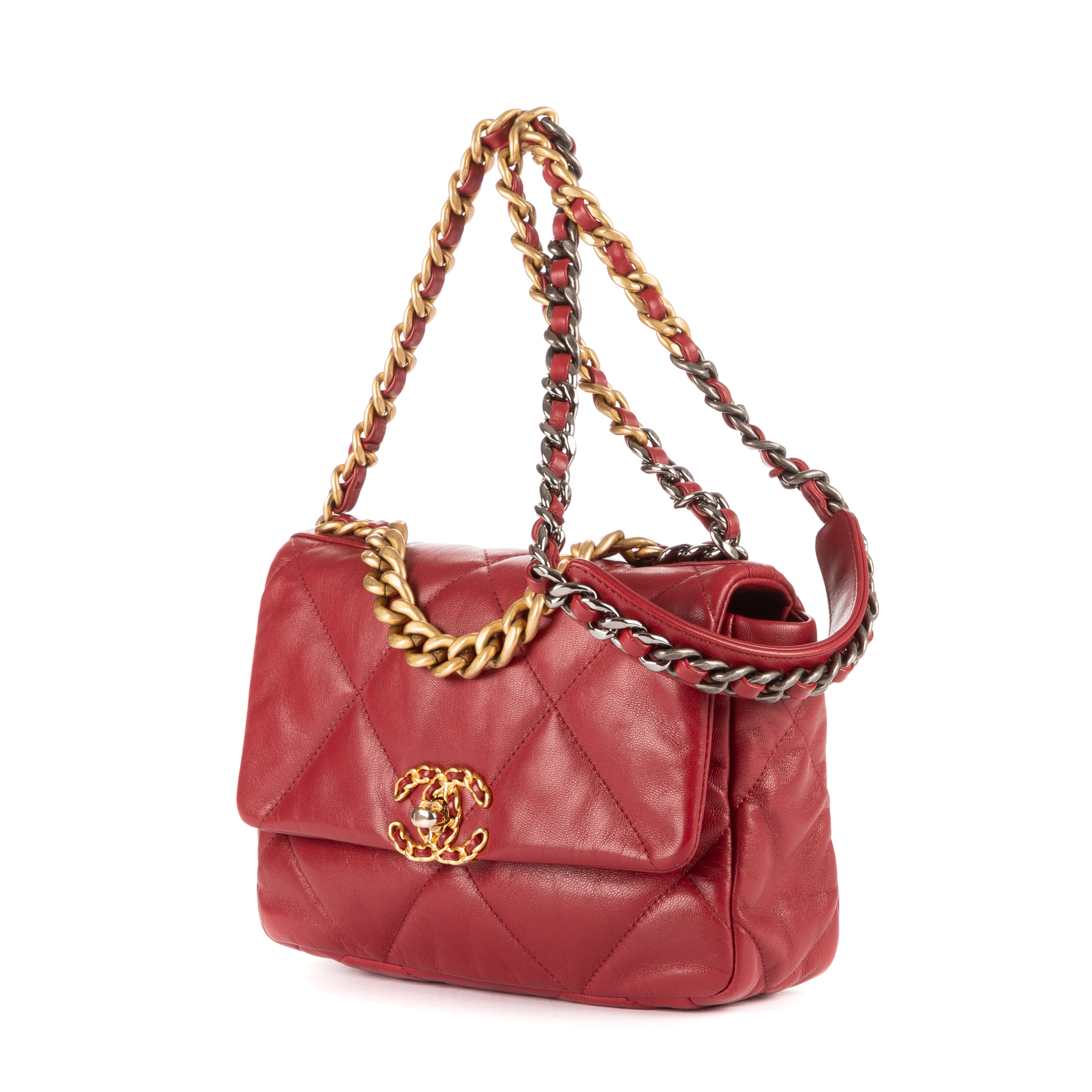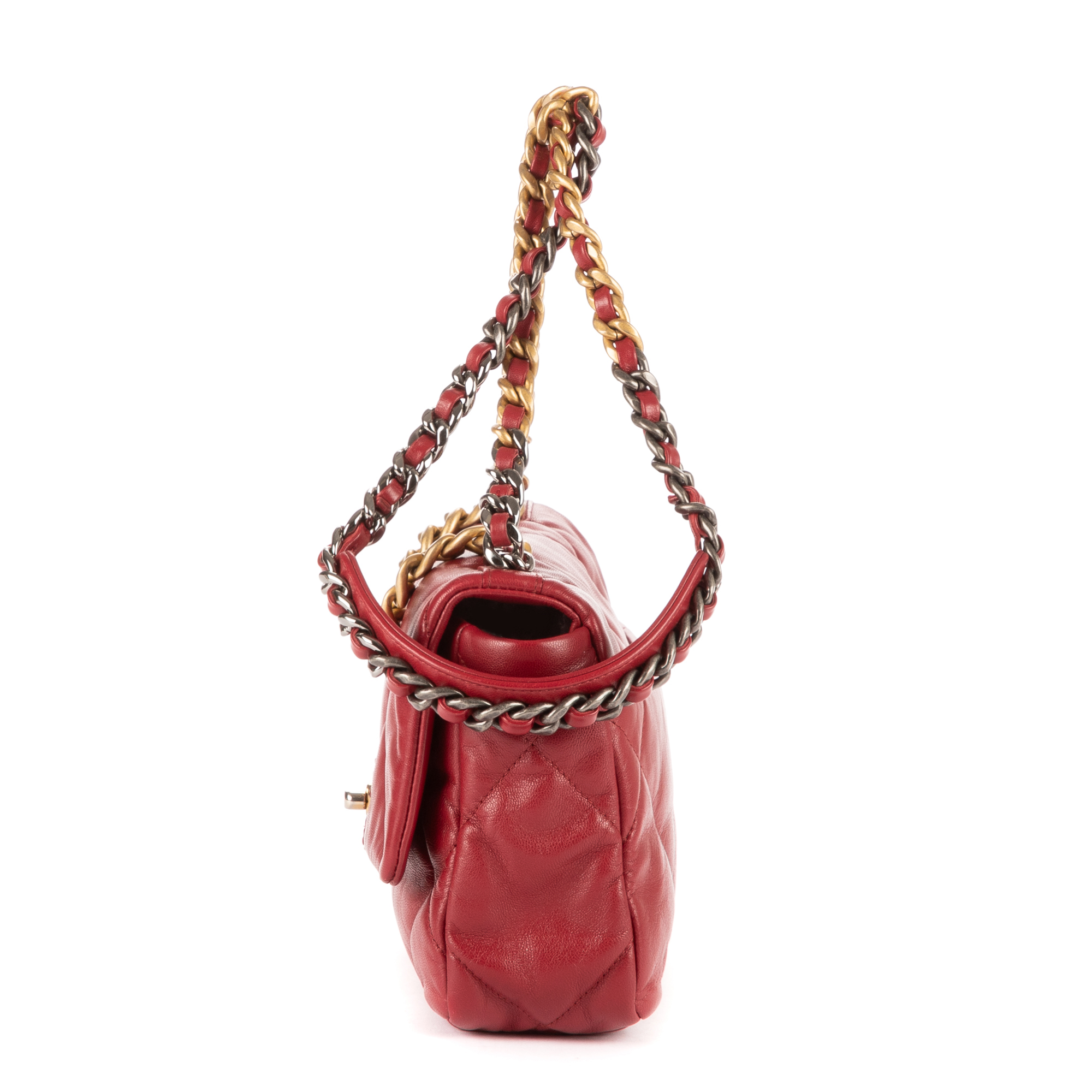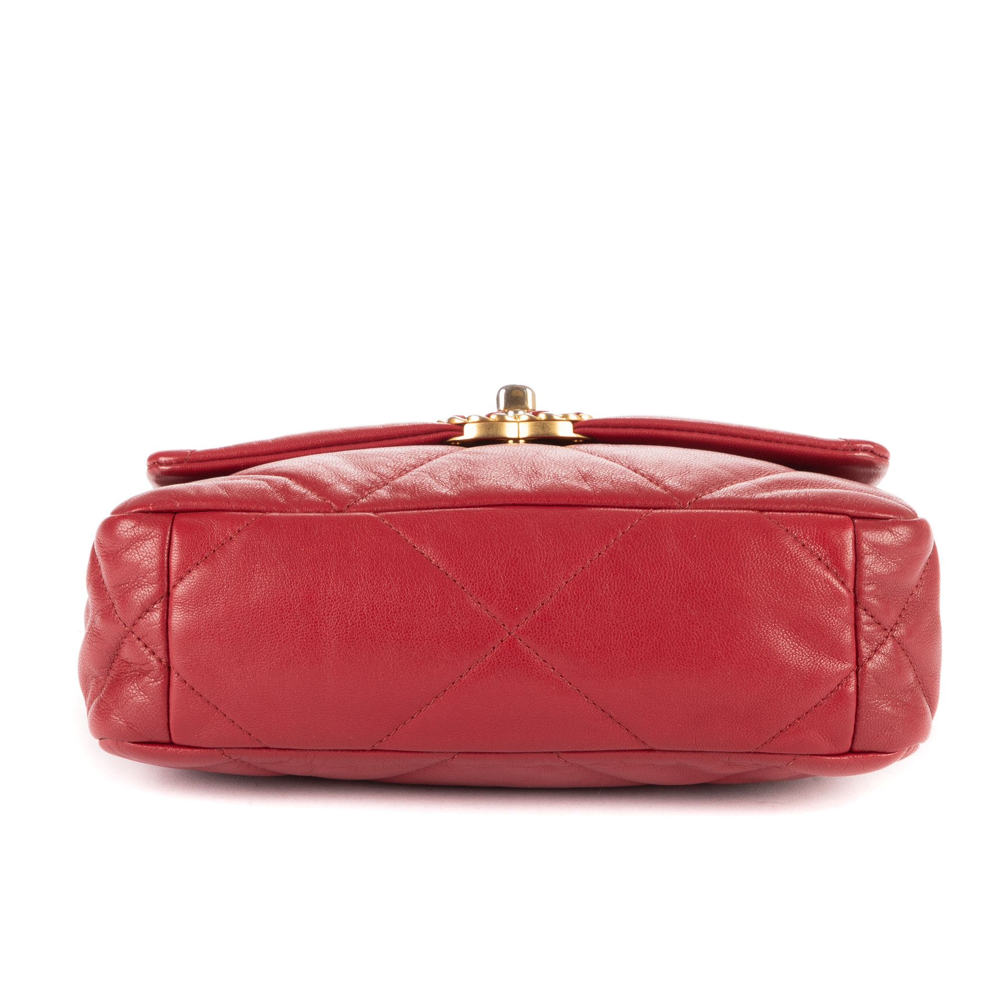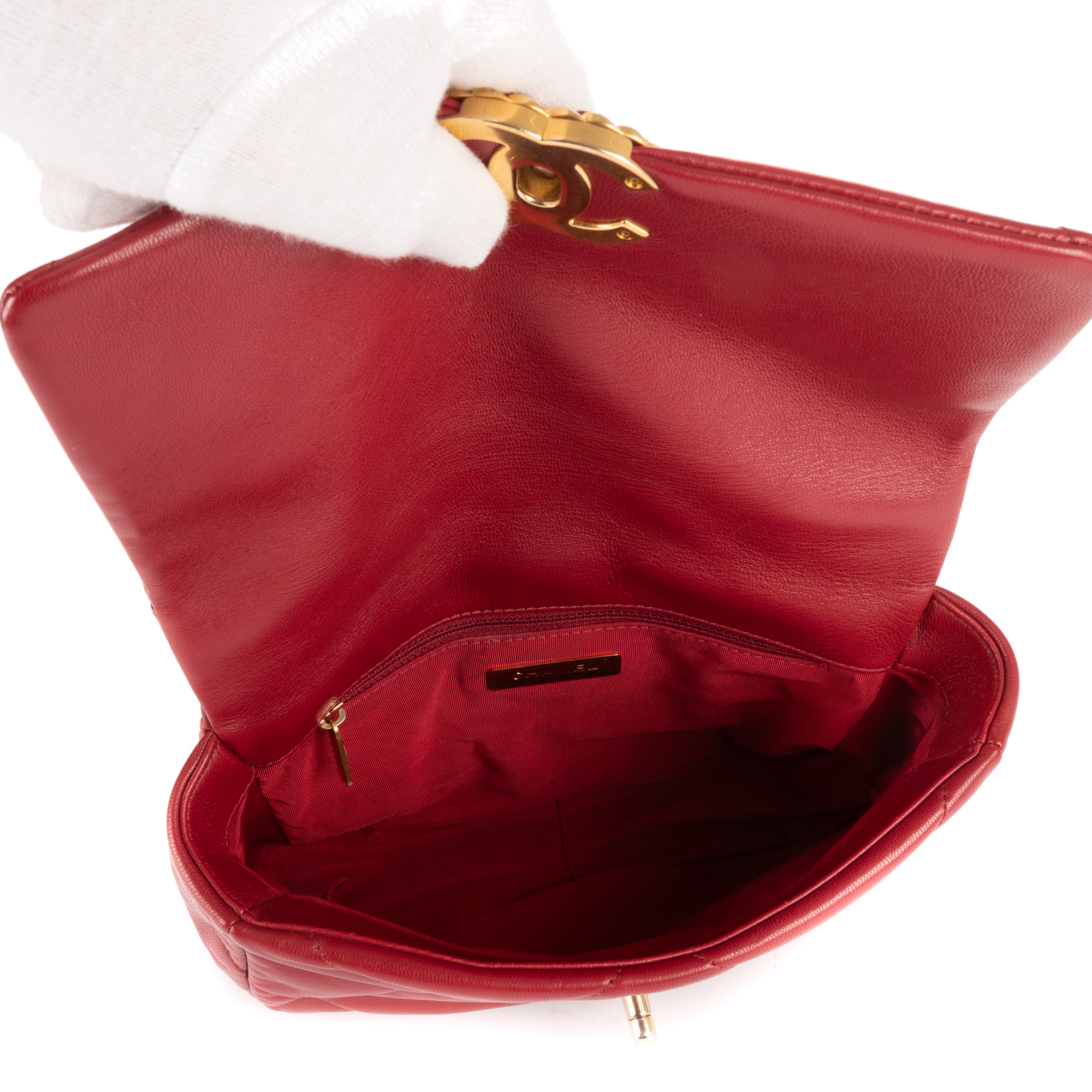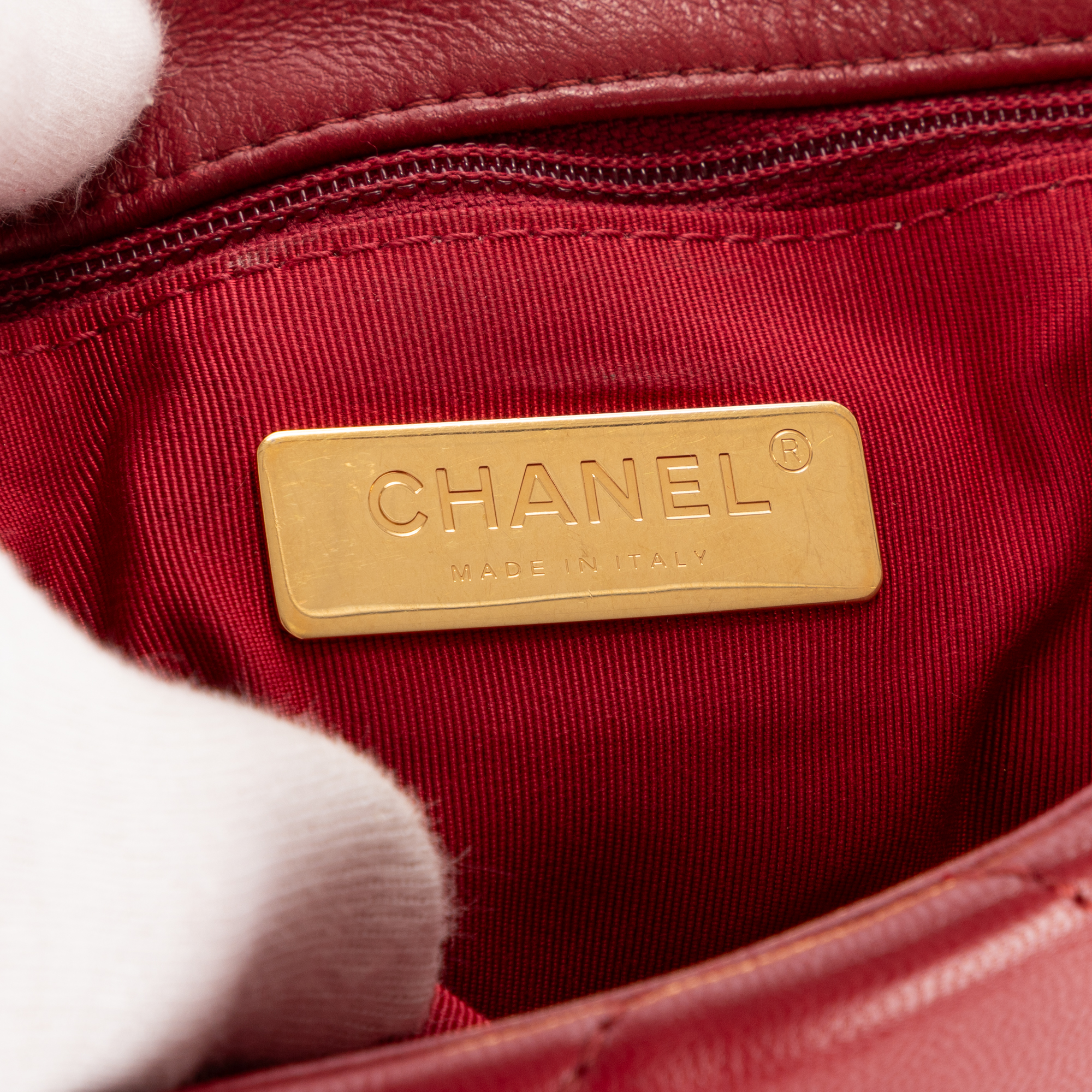 Chanel Shoulder Bag Classic 19 Flap Small in Burgundy Calfskin leather and Gold hardware. The product is in Excellent Condition (A).