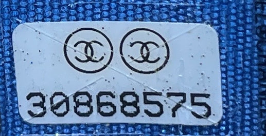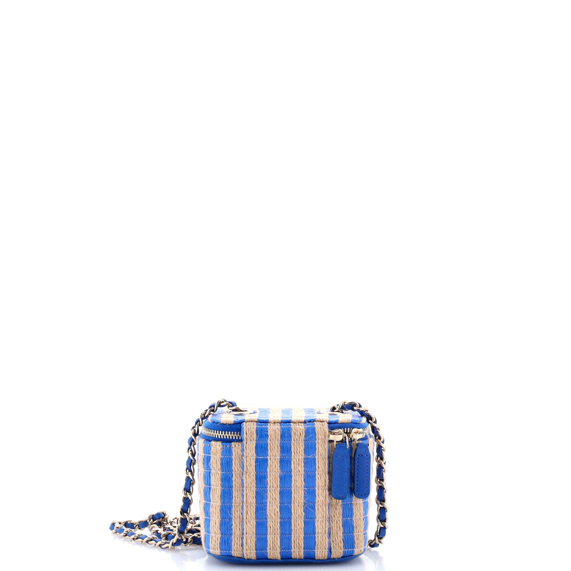 Chanel Shoulder Bag Classic Chain Vanity Case Mini in Blue/Beige Raffia/Jute Canvas and Gold hardware. The product is in Perfect Condition (AA).