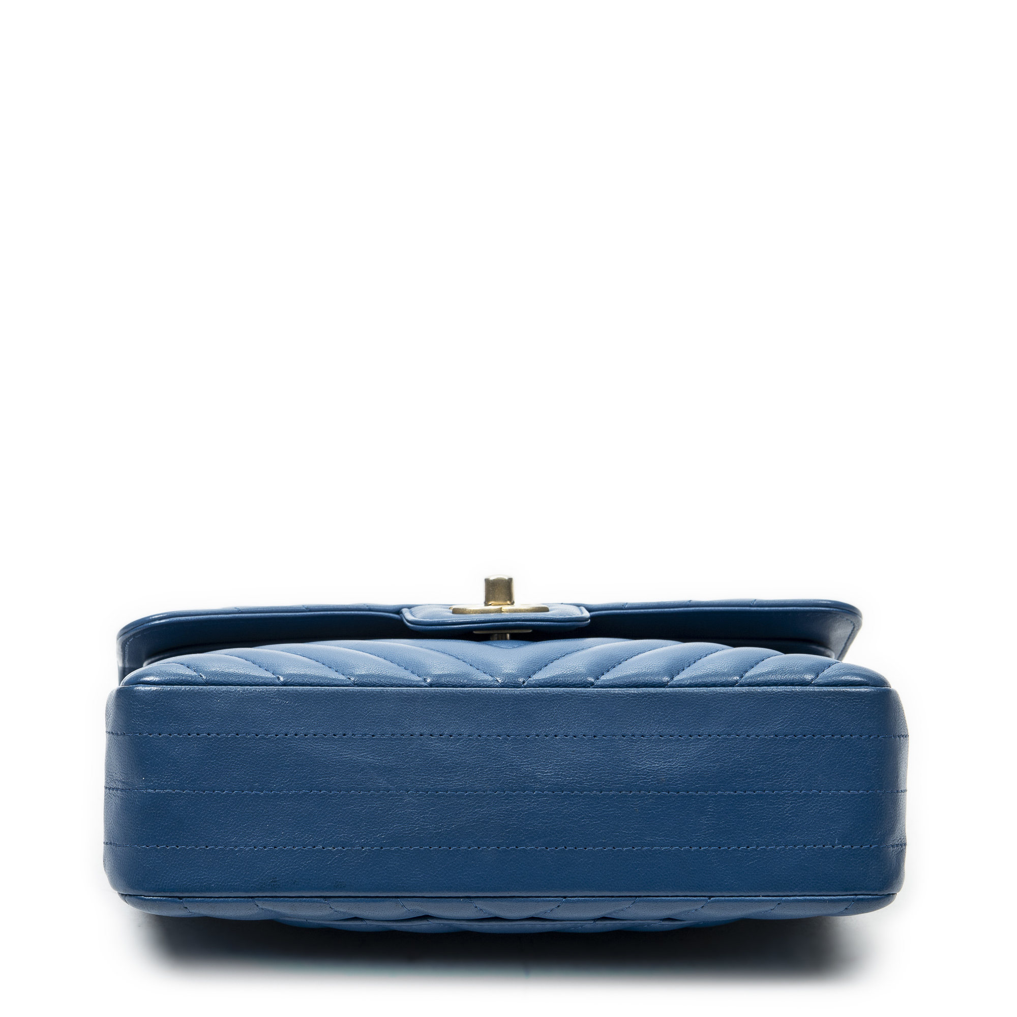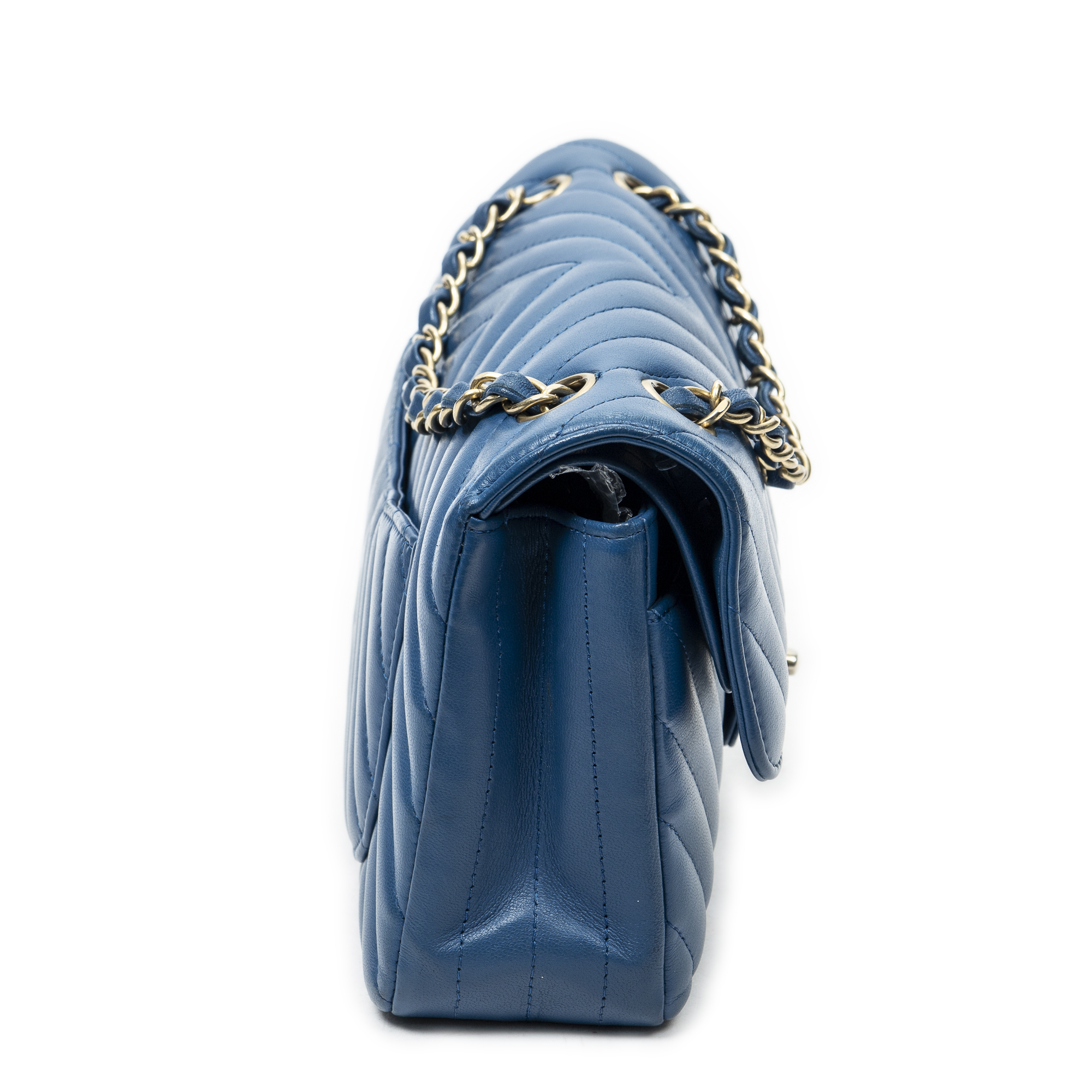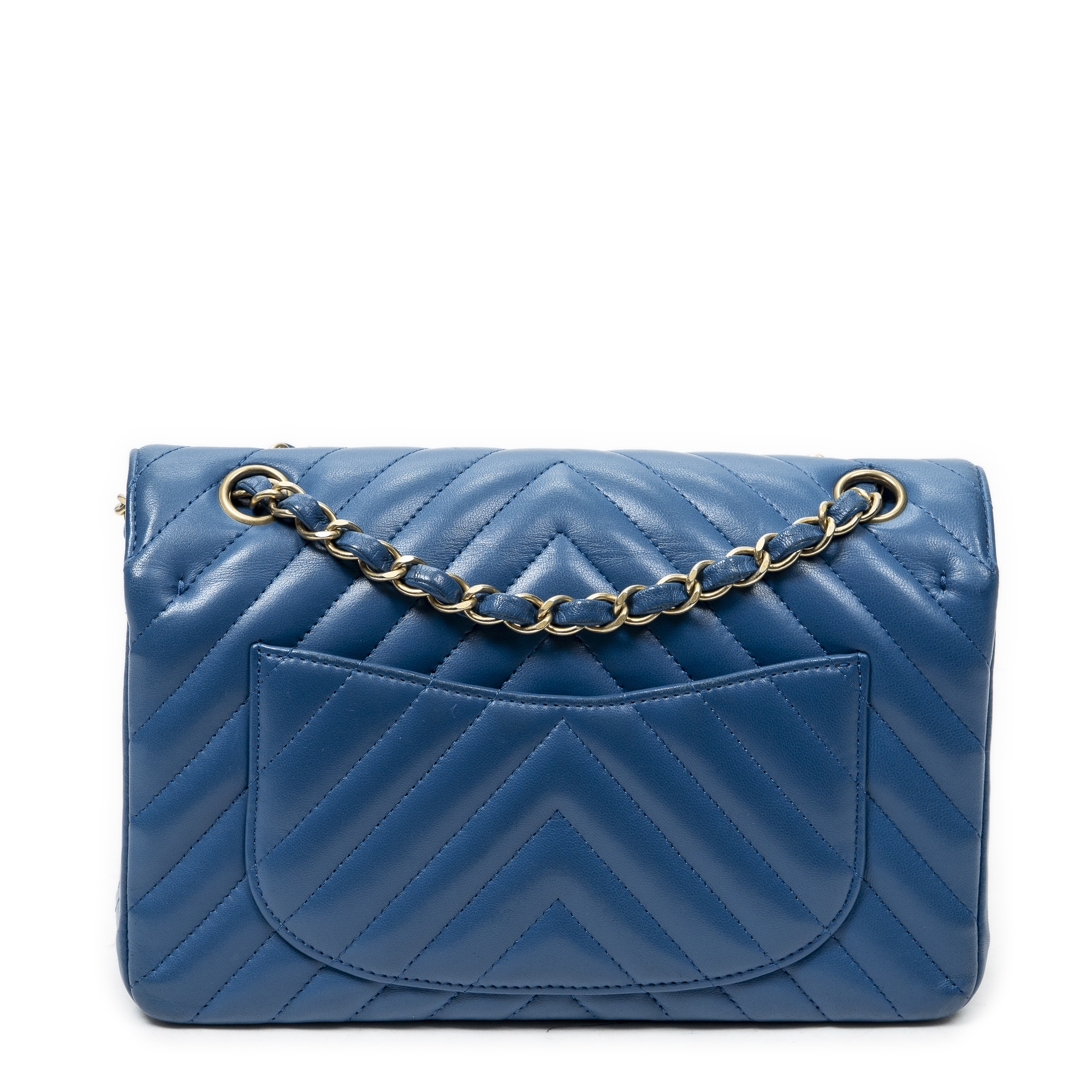 Chanel Shoulder Bag Classic Double Flap 23 in Blue Quilted Chevron Lambskin Leather and Gold hardware. The product is in Perfect Condition (AA).
