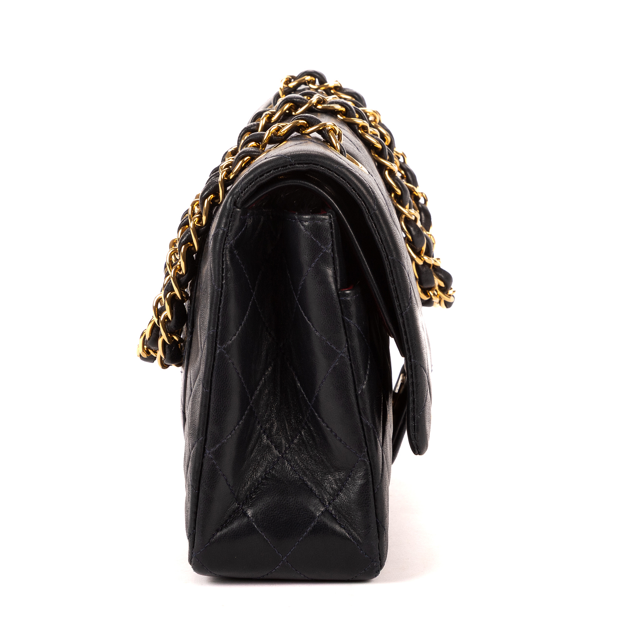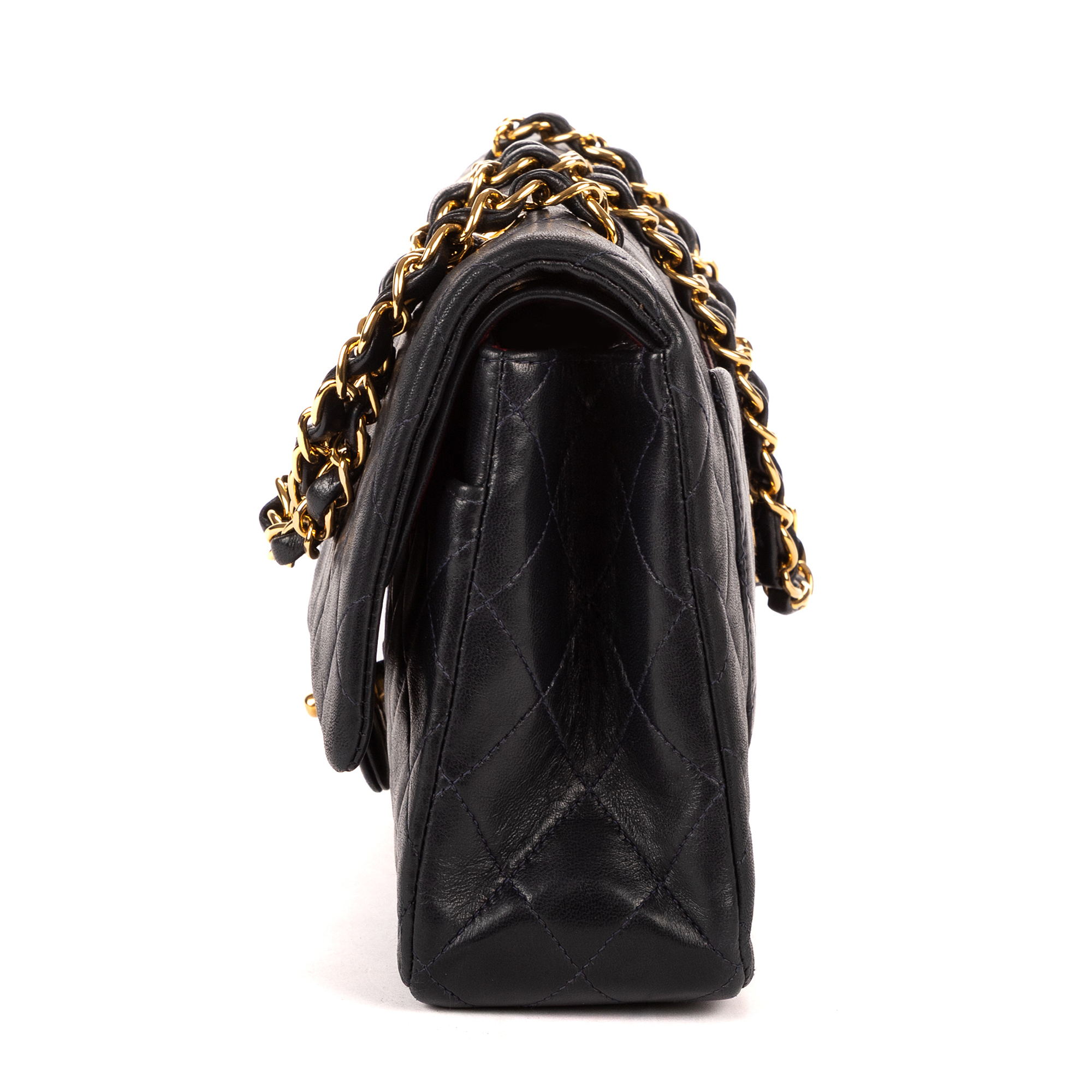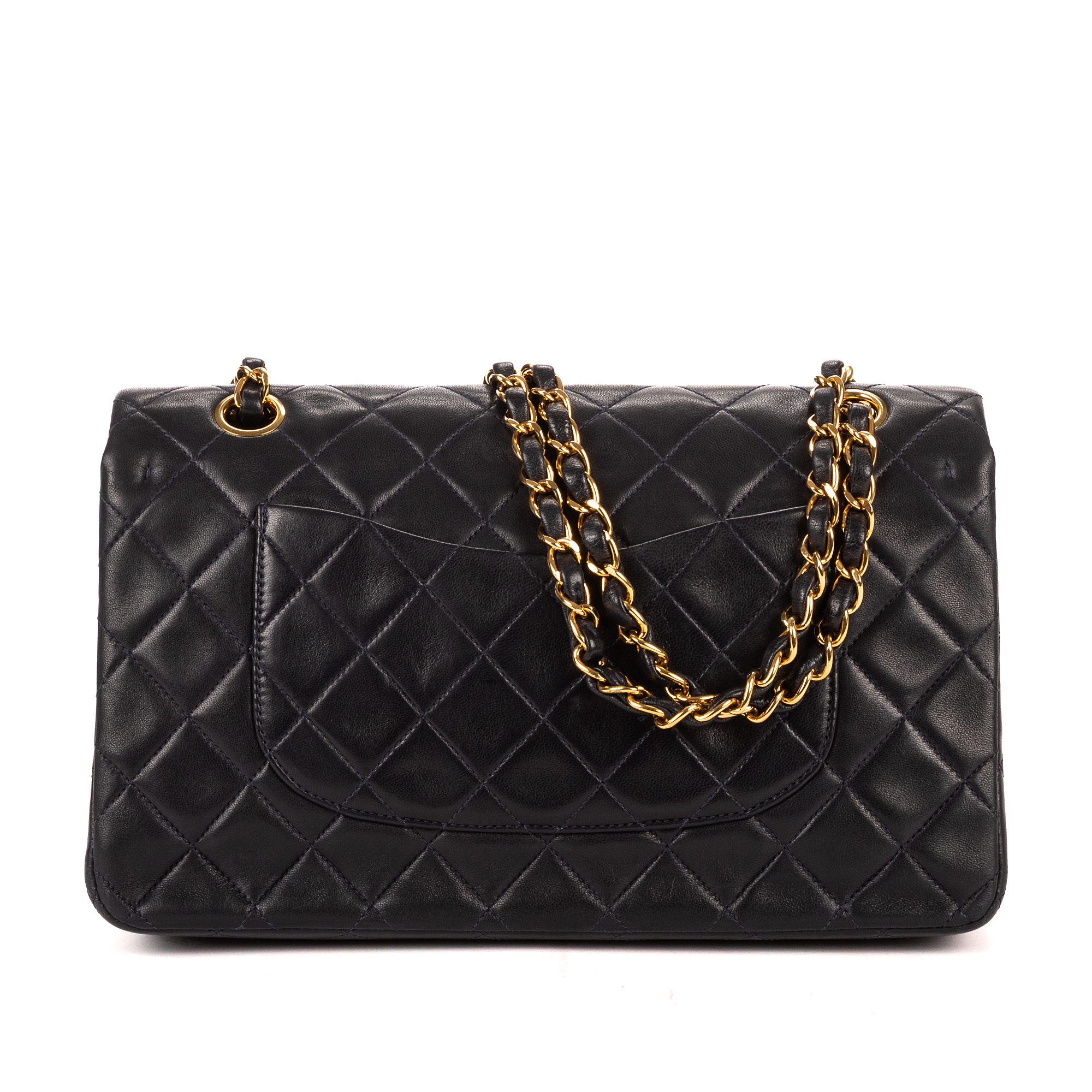 Chanel Shoulder Bag Classic Double Flap 26 in Navy Quilted Lambskin Leather and Gold hardware. The product is in Excellent Condition (A).